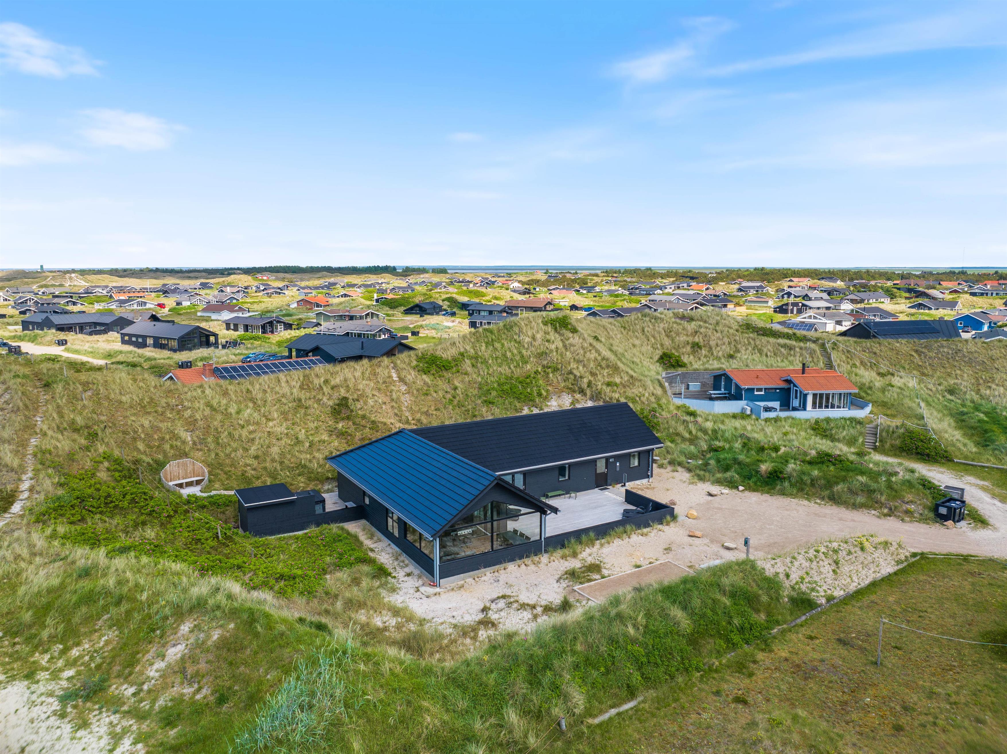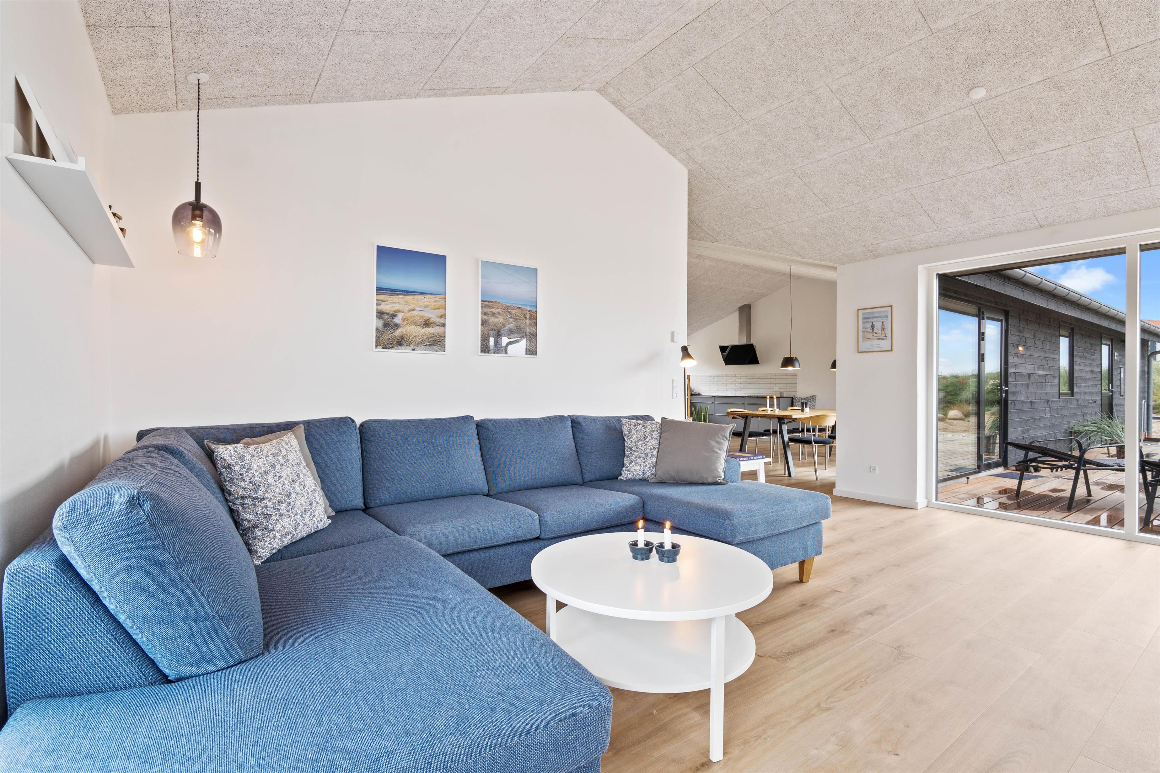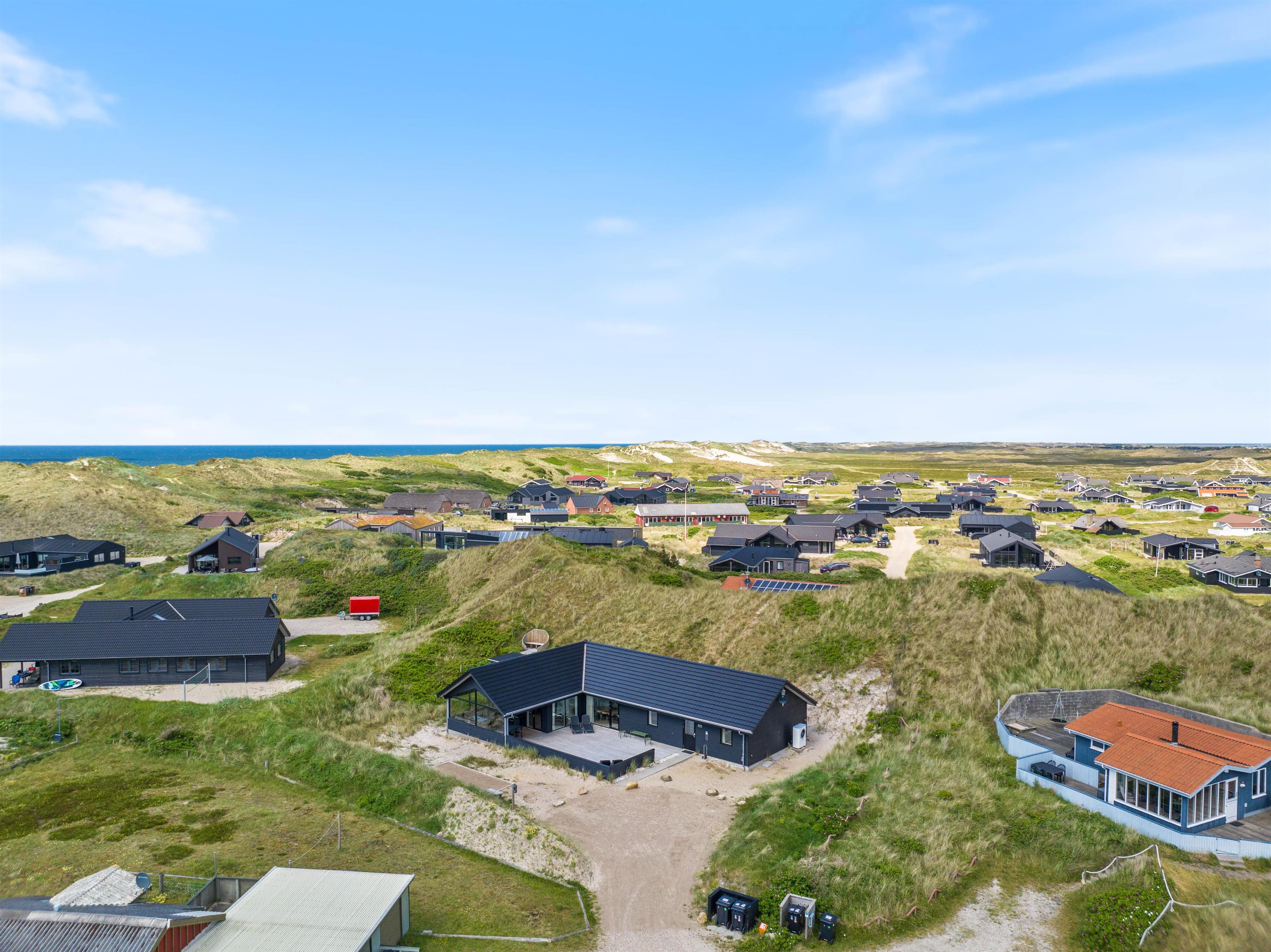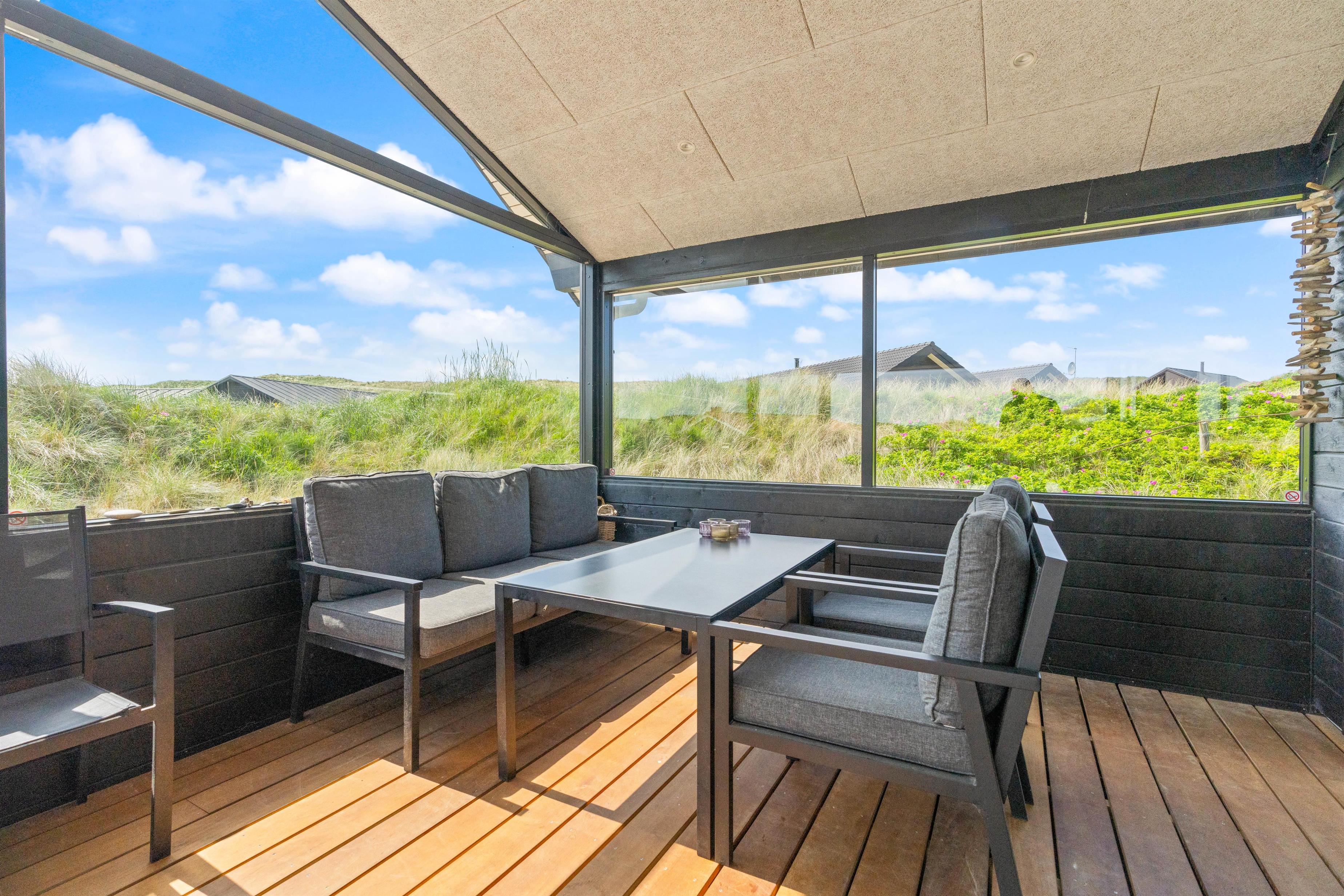 Feriehuset er beliggende på en dejlig stor, læfyldt og ugeneret grund. Nyd en sommerdag på den skønne, ca. 20 kvm. overdækkede terrasse med glasafskræmning på 3 sider. Sæt jer i de behagelige havemøbler eller læg jer i solvognen med en god bog og lyt til Vesterhavets brusen i læ for vinden.