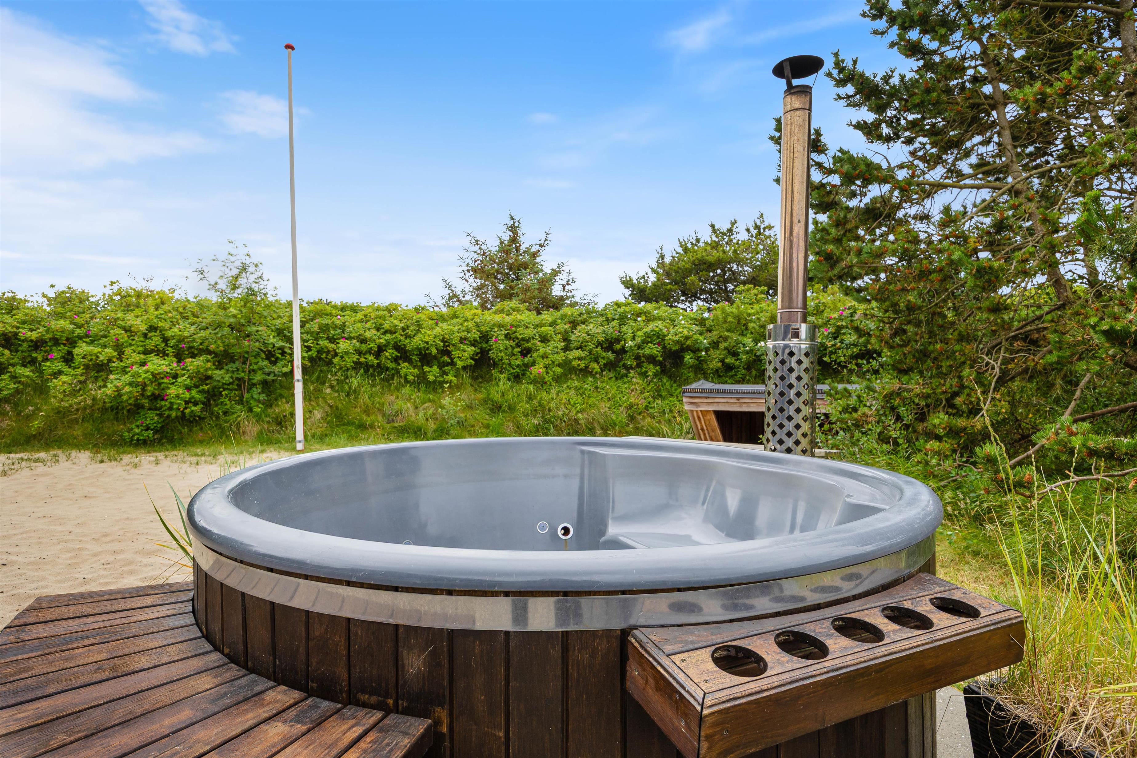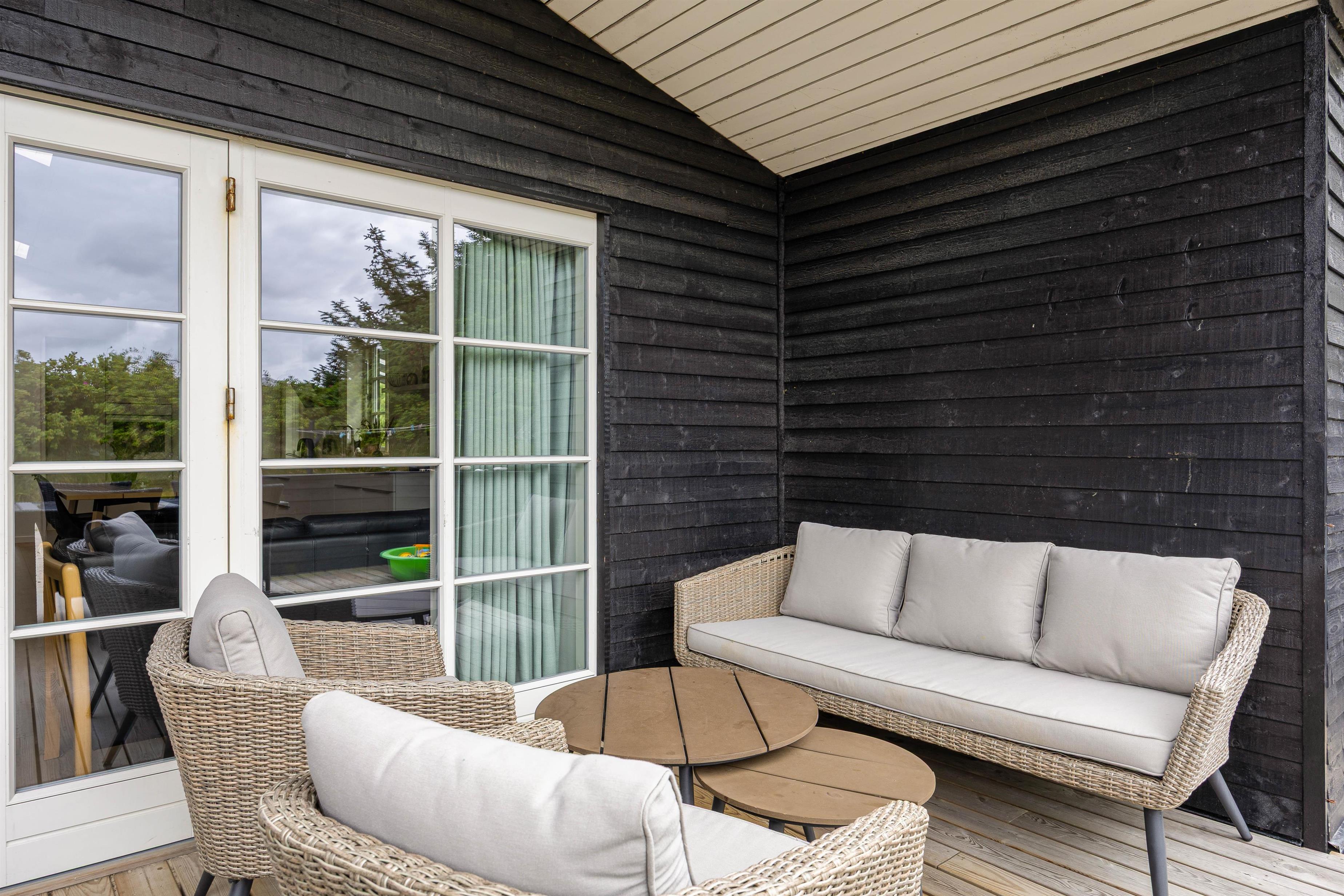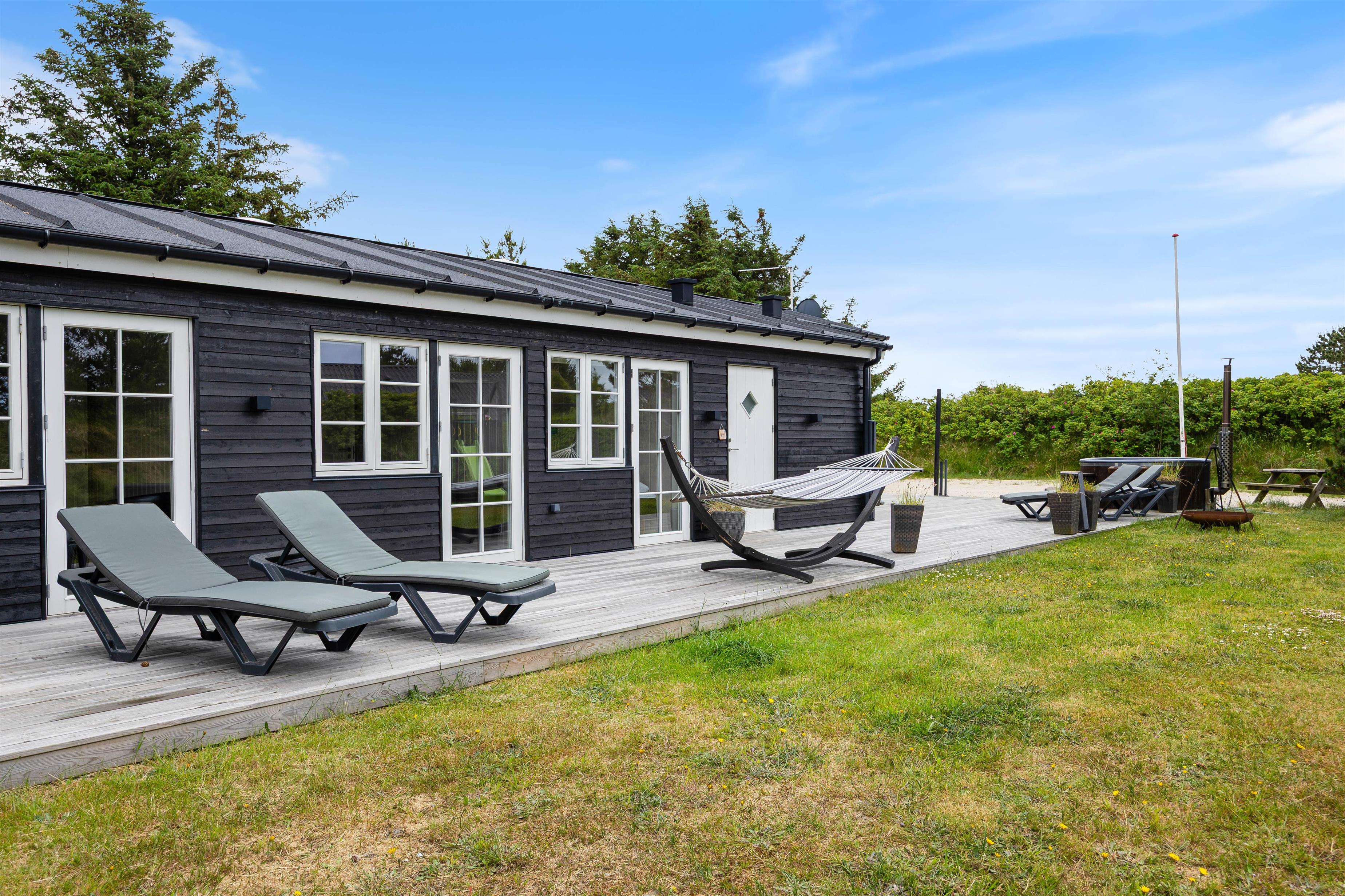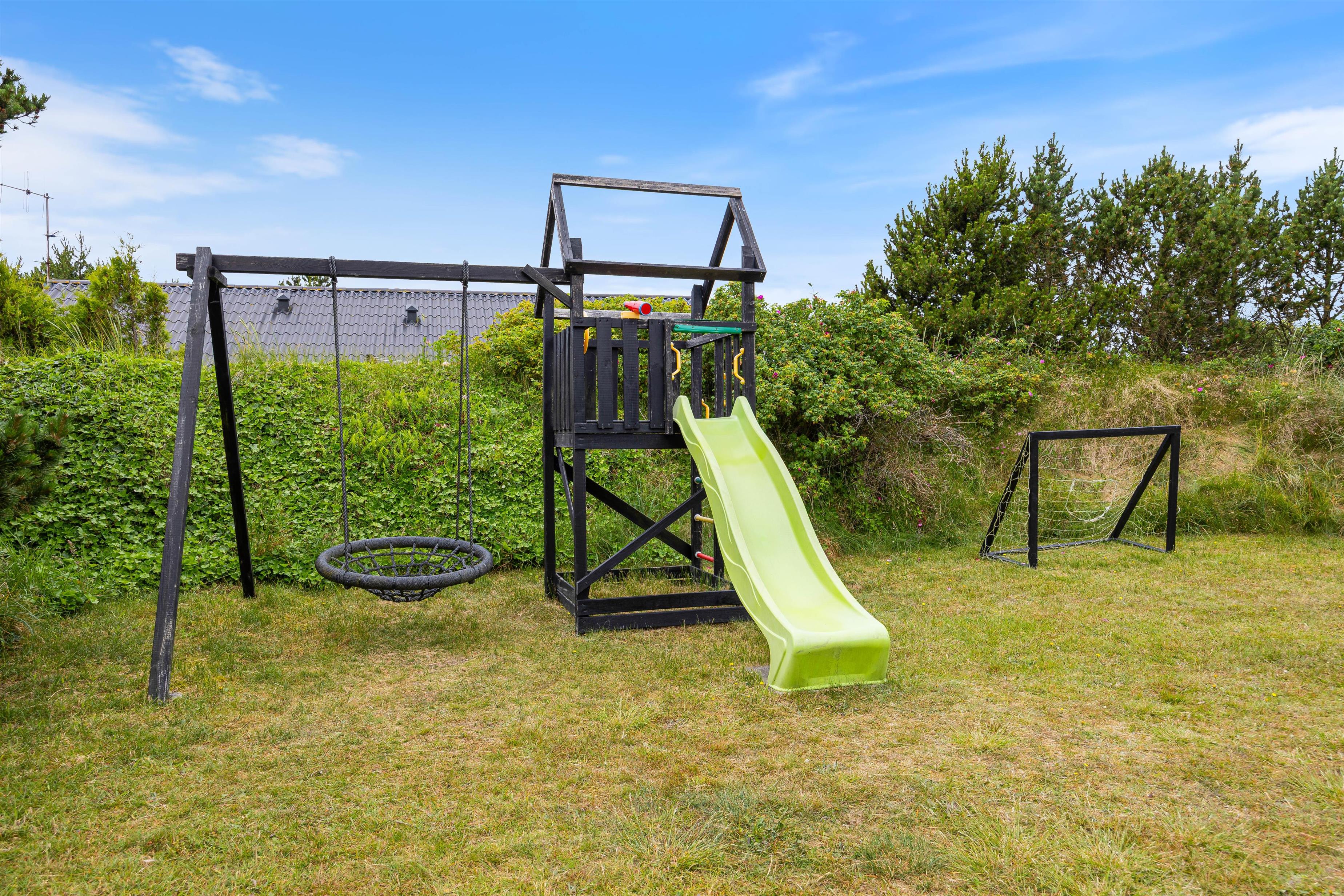 Sommerhusets udendørsområde strækker sig over 1200 kvadratmeter græsplæne. Et legetårn, en shelter, mål og en beachvolleybane giver masser af udendørs underholdning og mulighed for sjove aktiviteter. Slap af på den delvist overdækkede terrasse med komfortable havemøbler samt liggestole og lav lækre grillmåltider på gasgrillen, imens skyggerne bliver lange.