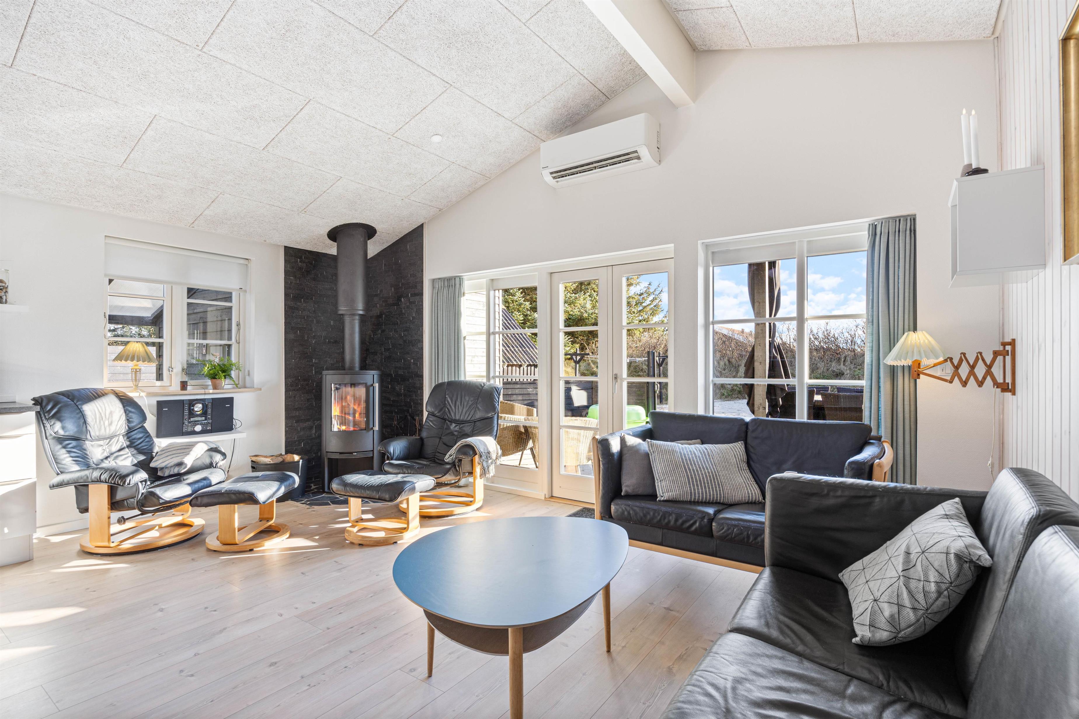 Det lyse, åbne opholdsrum er sommerhusets hjerte byder med sine naturlige farver, højt til loftet og behagelige siddepladser til behagelig afslapning, f.eks. med et brætspil eller to ved det rummelige spisebord. Brændeovnen og den energibesparende varmepumpe giver et behageligt indeklima, og træets knitren skaber en helt særlig atmosfære og feriestemning.