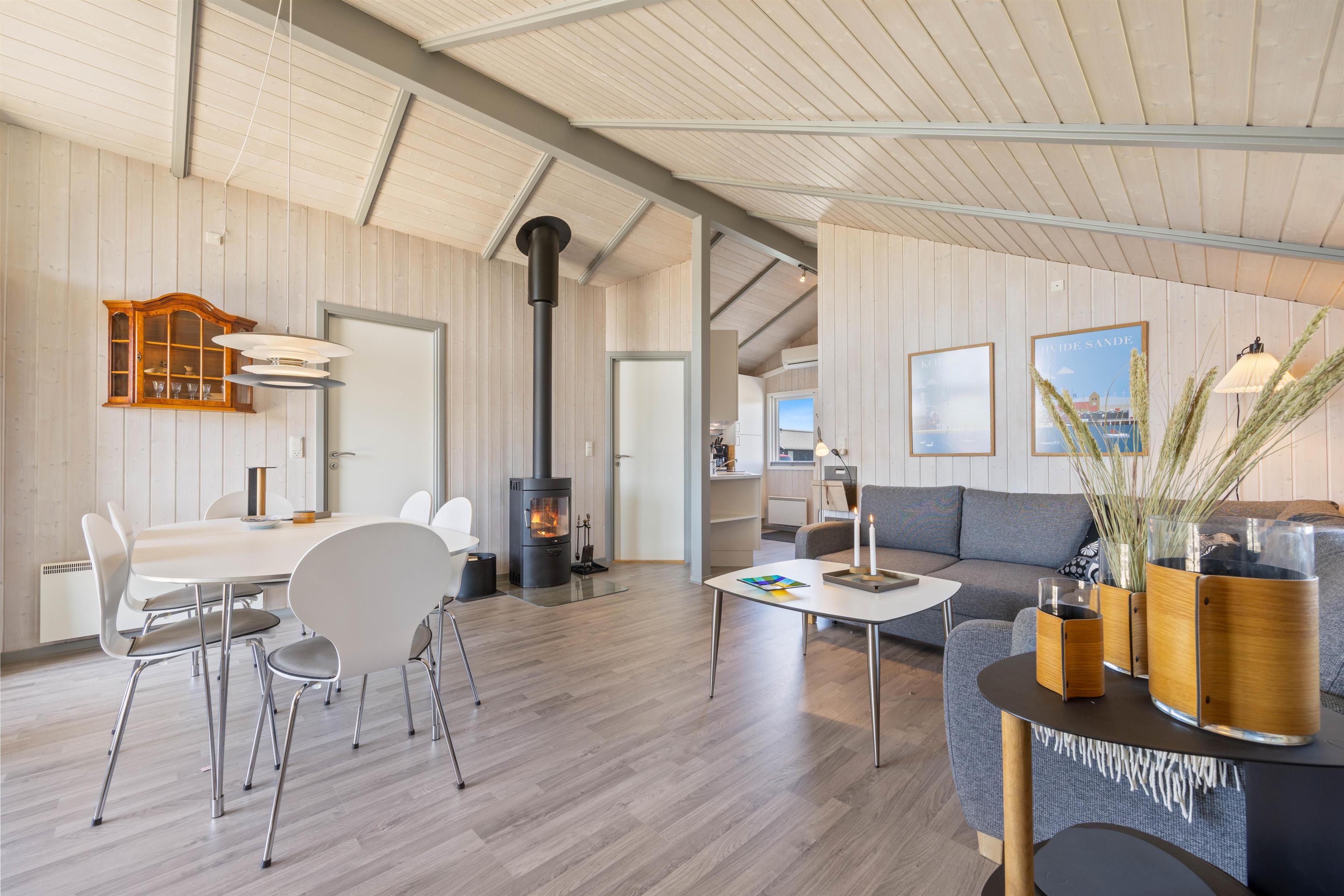 Den lyse træbeklædning, lysindfaldet og loft op i kip med synlige bjælker gør dette sommerhus lyst og venligt. Den hyggelige stue er indrettet med hjørnesofa og brændeovn, så her kan I samles om indendørslivet. Gæt en quiz, lav en spilleaften eller nyd roen og en snak ved varmen fra brændeovnen. Der er en hyggelig alkove i forbindelse med stuen, hvor børnene kan lege eller slappe af. Det tilstødende køkken er udstyret med opvaskemaskine, mikrobølgeovn, induktionskomfur og køle-fryseskab. Her finder du alt, hvad du behøver for at fremtrylle lækre måltider.