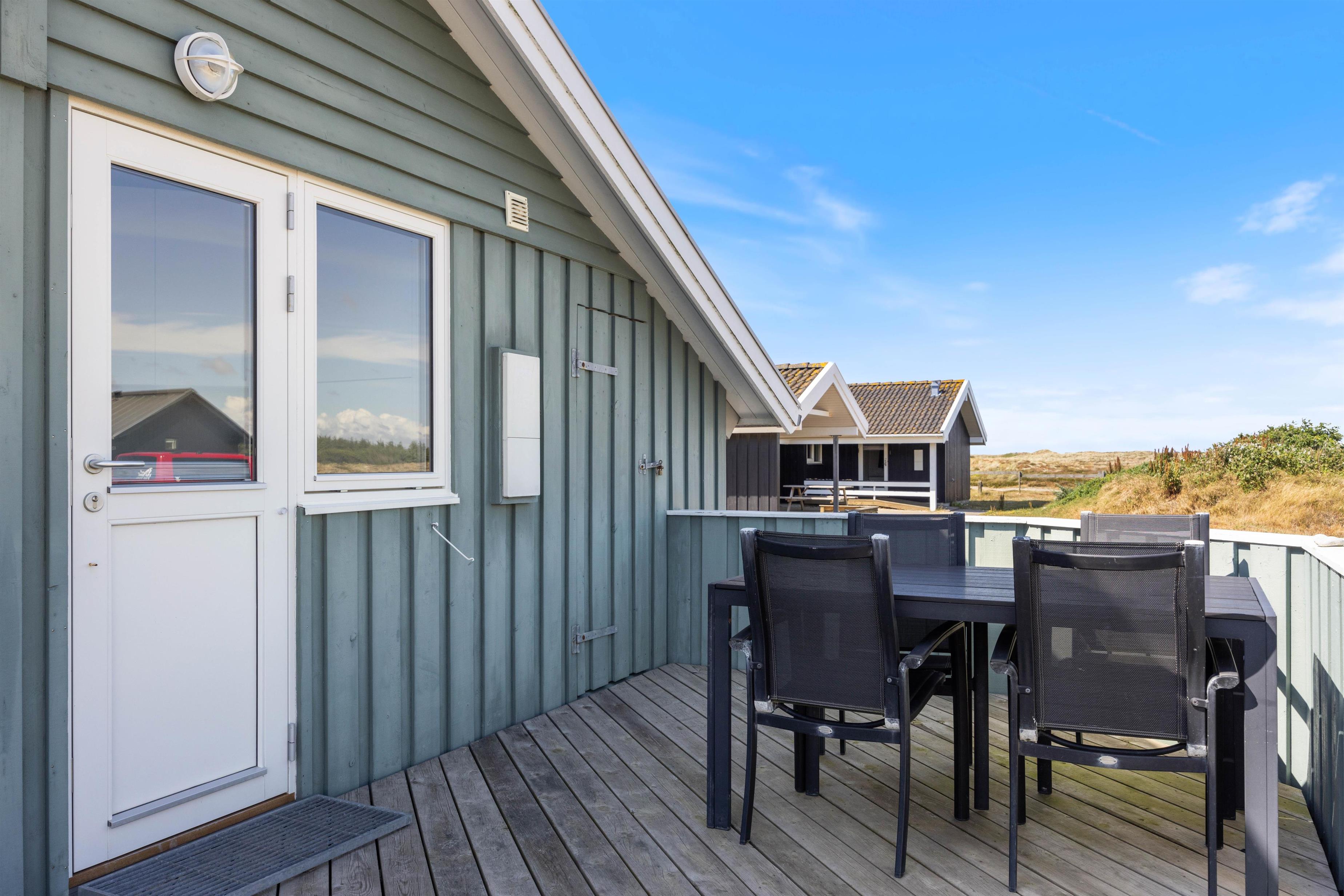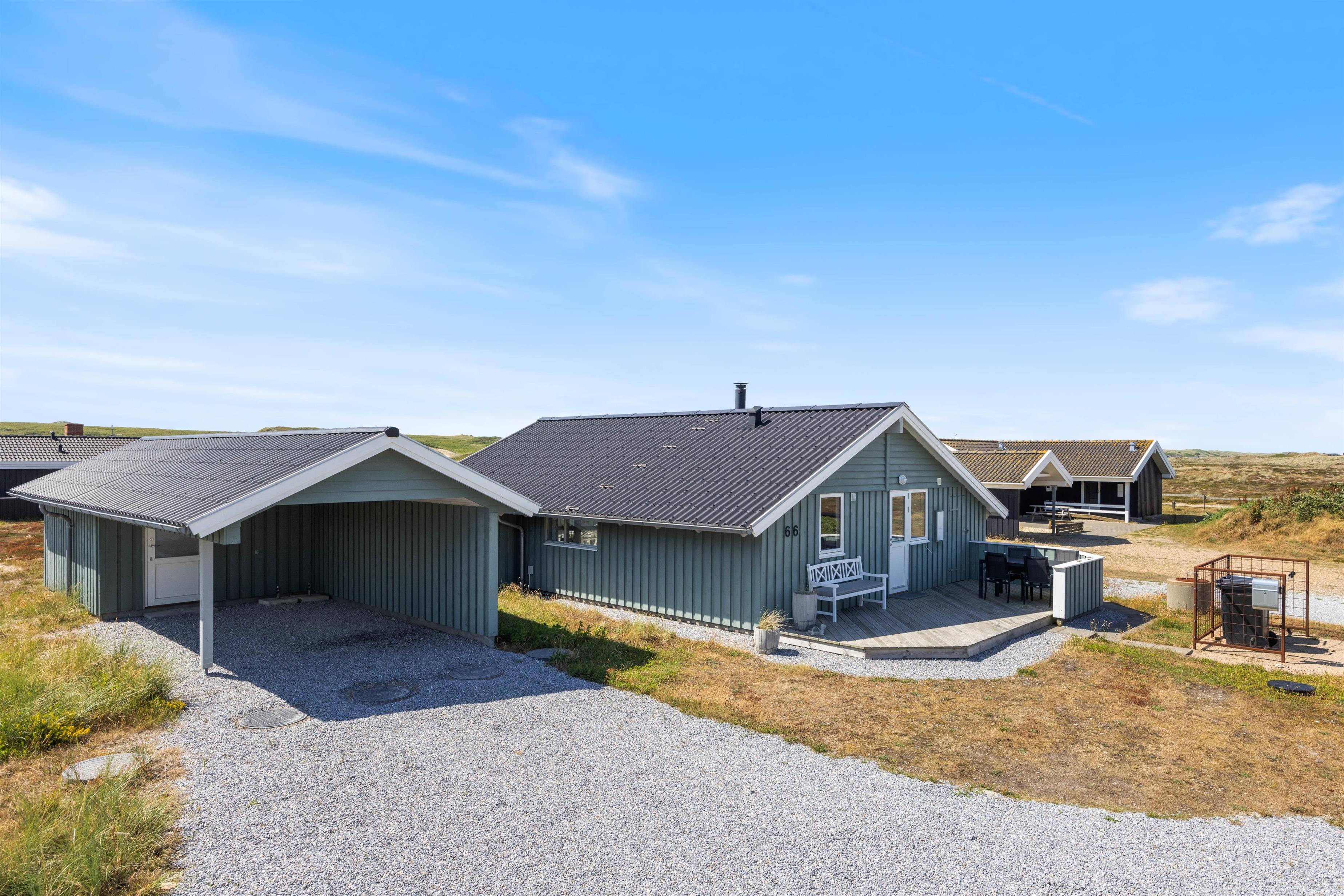 Det hyggelige feriehus omgives af 2 terrasser. Den ene er åben med praktisk afskærmning. Den anden er delvis lukket og delvist overdækket. Her kan I opholde jer i både sol, blæst og regn. Du kan finde en plads til børn eller hund, og du kan slappe af i havemøblerne, imens børnene gynger. Der er gasgrill til en lækker BBQ, og du kan trygt parkere din bil i carporten. Feriehuset ligger naturskønt, og du kan være heldig at se nogle af vestkystens vilde dyr, for eksempel rådyr, hare, ræv, hejrer og gæs.