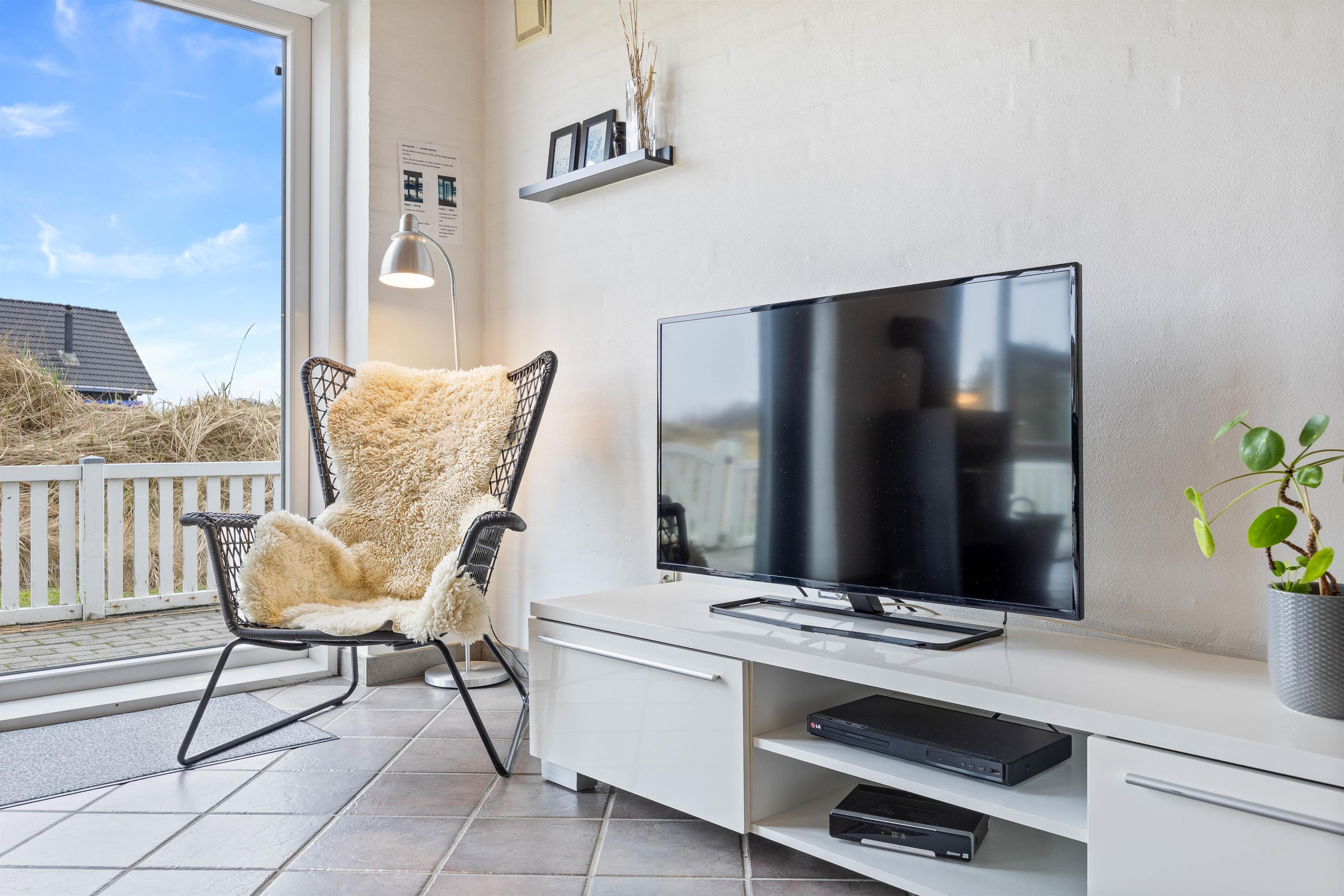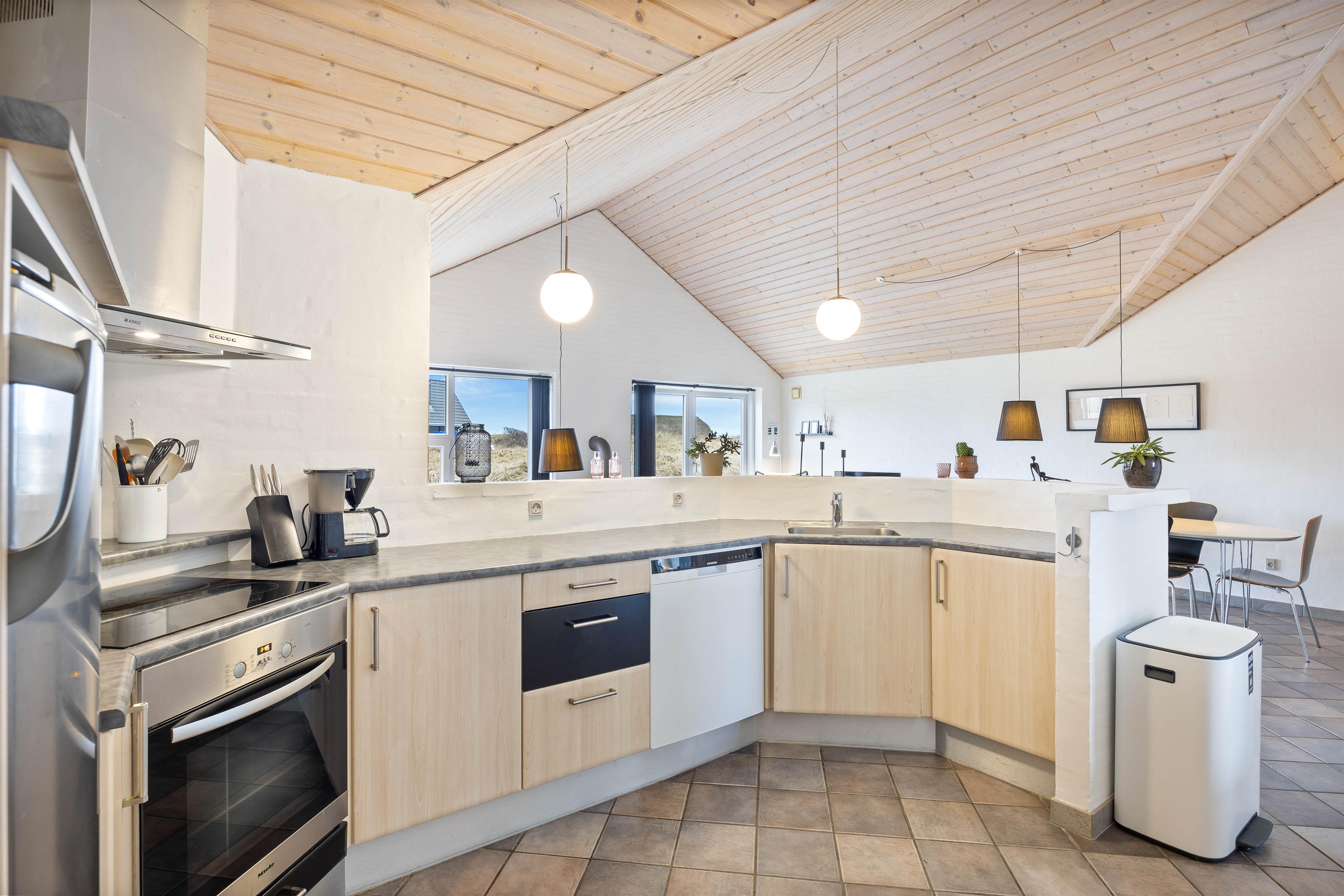 Flot og velindrettet feriehus, med smagfuld møblering. Huset er lyst og indbydende, med flot køkken i åben forbindelse med stue. Her er åbent til kip og masser af lysindfald gennem det store vinduesparti mod syd. Skøn overdækket terrasse med masser af læ, perfekt til en hyggelig grillaften.