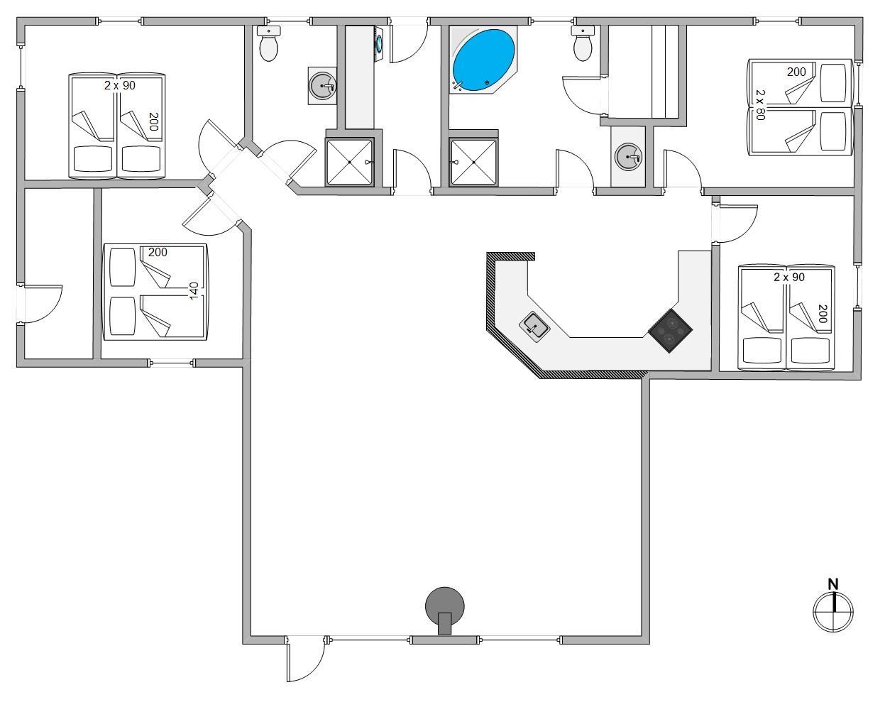 Et flot og velindrettet feriehus hvor der er kræset for indretningen og detaljerne. Sommerhuset står lyst og indbydende og gennem det store vinduesparti mod syd strømmer lyset ind. Her er åbent til kip og køkkenet er i åben forbindelse med stuen, hvor mange hyggelige feriestunder kan tilbringes med familien. Tænd op for brændeovnen og nyd varmen i hele huset. Huset råder over 4 skønne værelser, alle med dobbeltsenge. Her er 2 badeværelser, hvoraf det ene er med en lækker 2 personers spa og med sauna. I begge badeværelser er der gulvvarme. I huset finder du de aller fleste moderne bekvemmeligheder, såsom stort fladskærmstv, trådløs fiber internet, opvaskemaskine, vaskemaskine og tørretumbler.