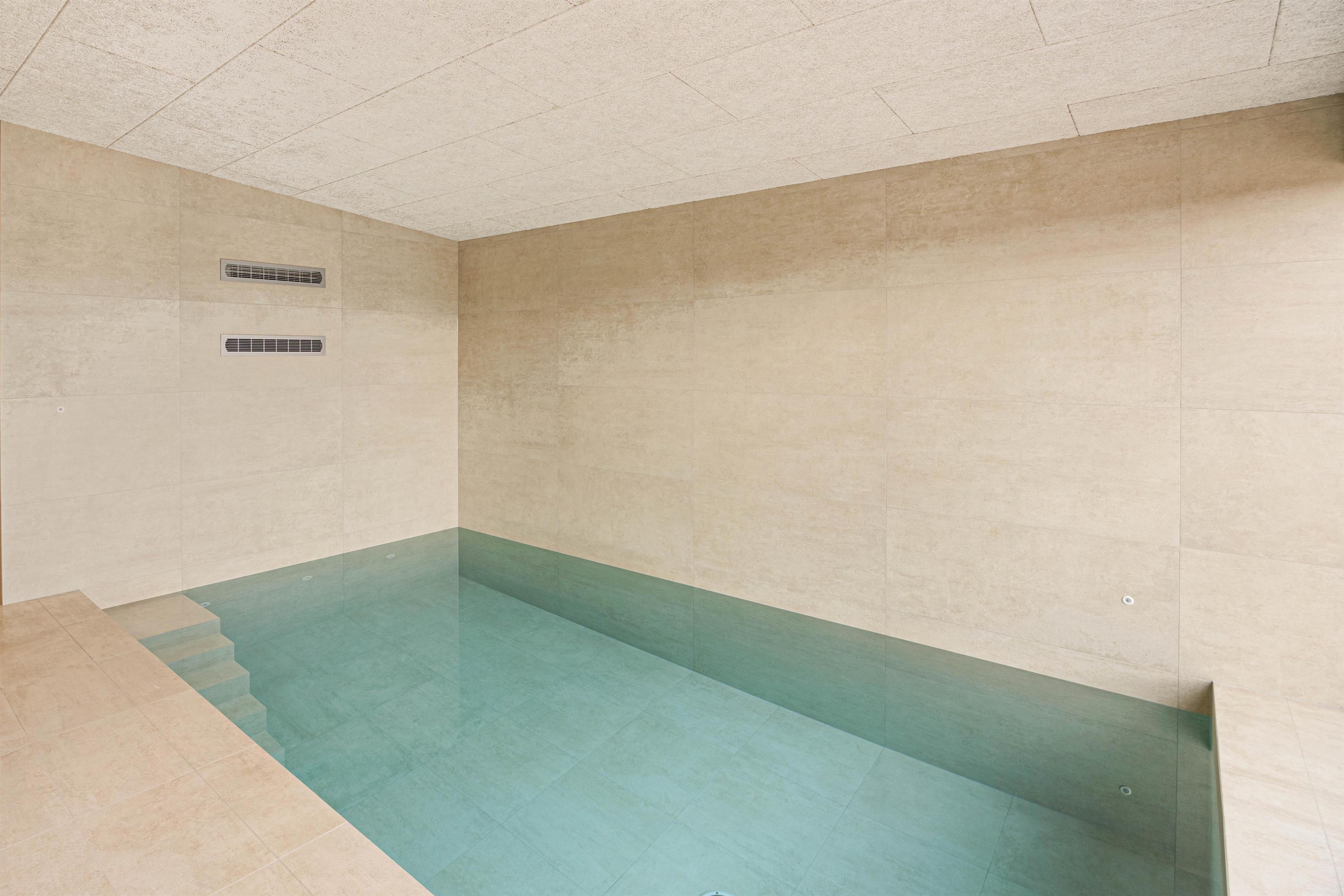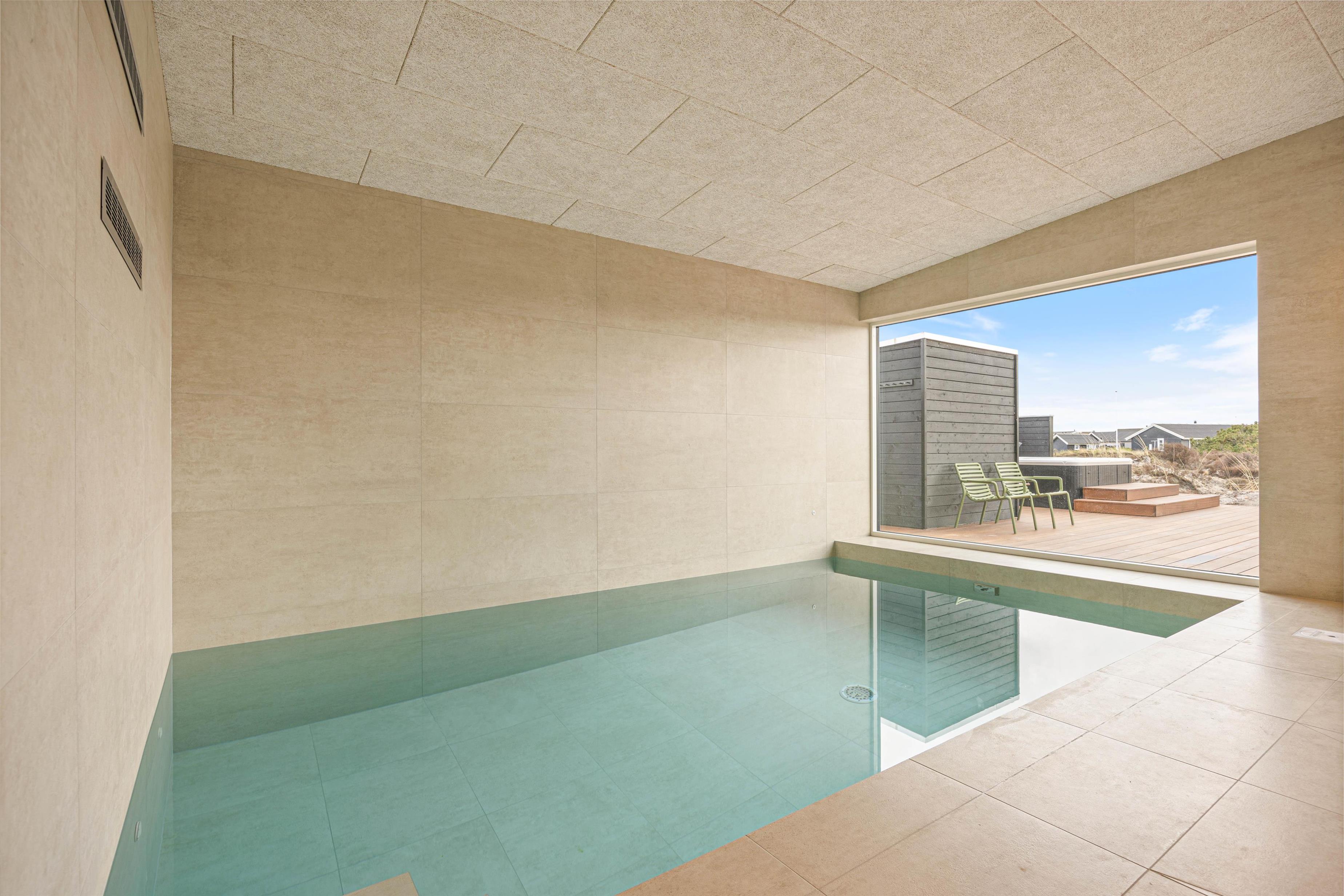 Feriehuset i Bjerregård byder på en indbydende poolafdeling med en 15 m² stor swimmingpool og modstrømsanlæg, der giver mulighed for både aktiv svømning og afslappende stunder i vandet.