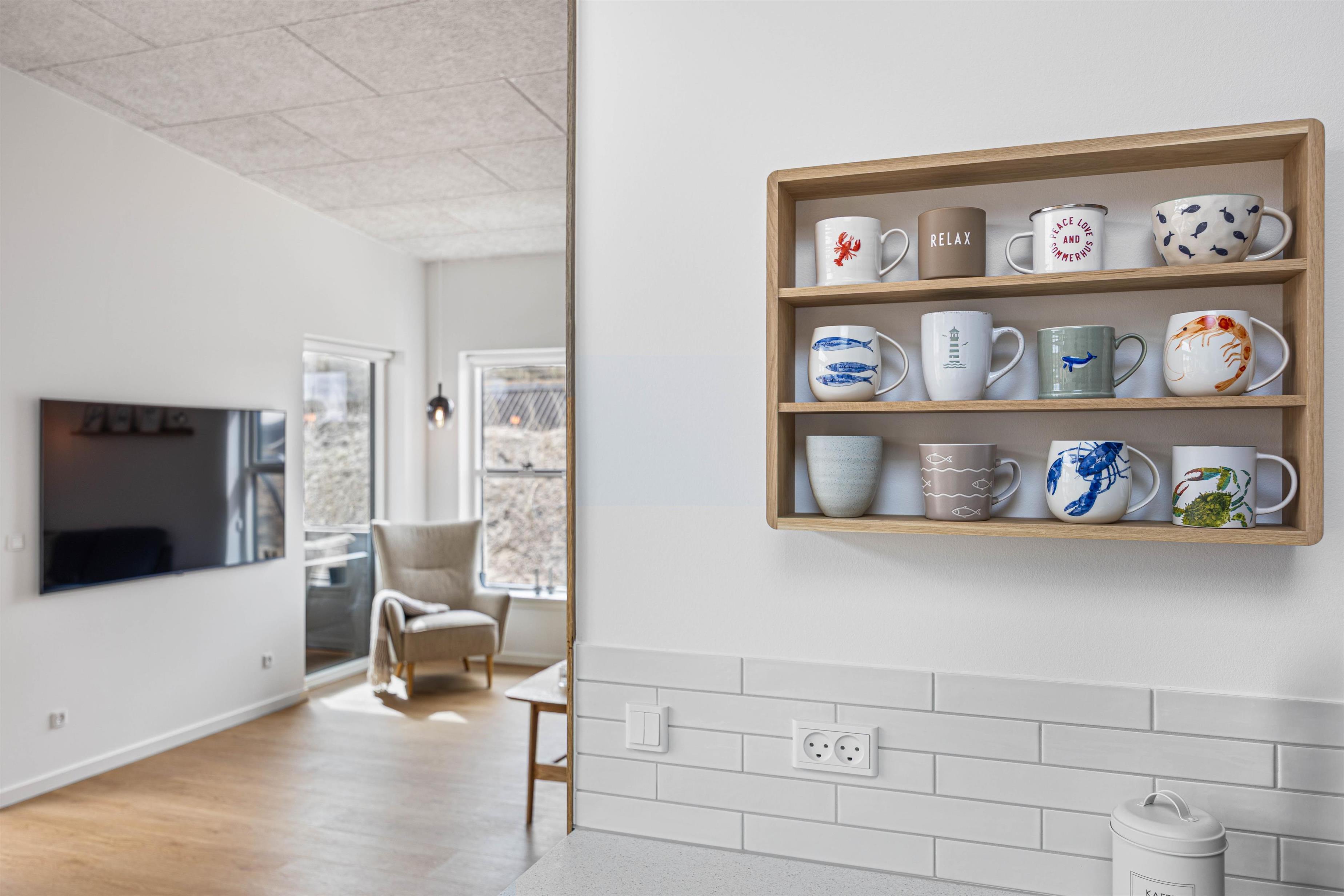 Det moderne køkken ligger i åben forbindelse med opholdsrummet og er udstyret med opvaskemaskine – perfekt til hyggelige madoplevelser sammen. Vaskemaskine og tørretumbler gør ferien ekstra bekvem, især ved længere ophold. Med den energieffektive luft-til-vand-varmepumpe er der sikret et behageligt indeklima året rundt.