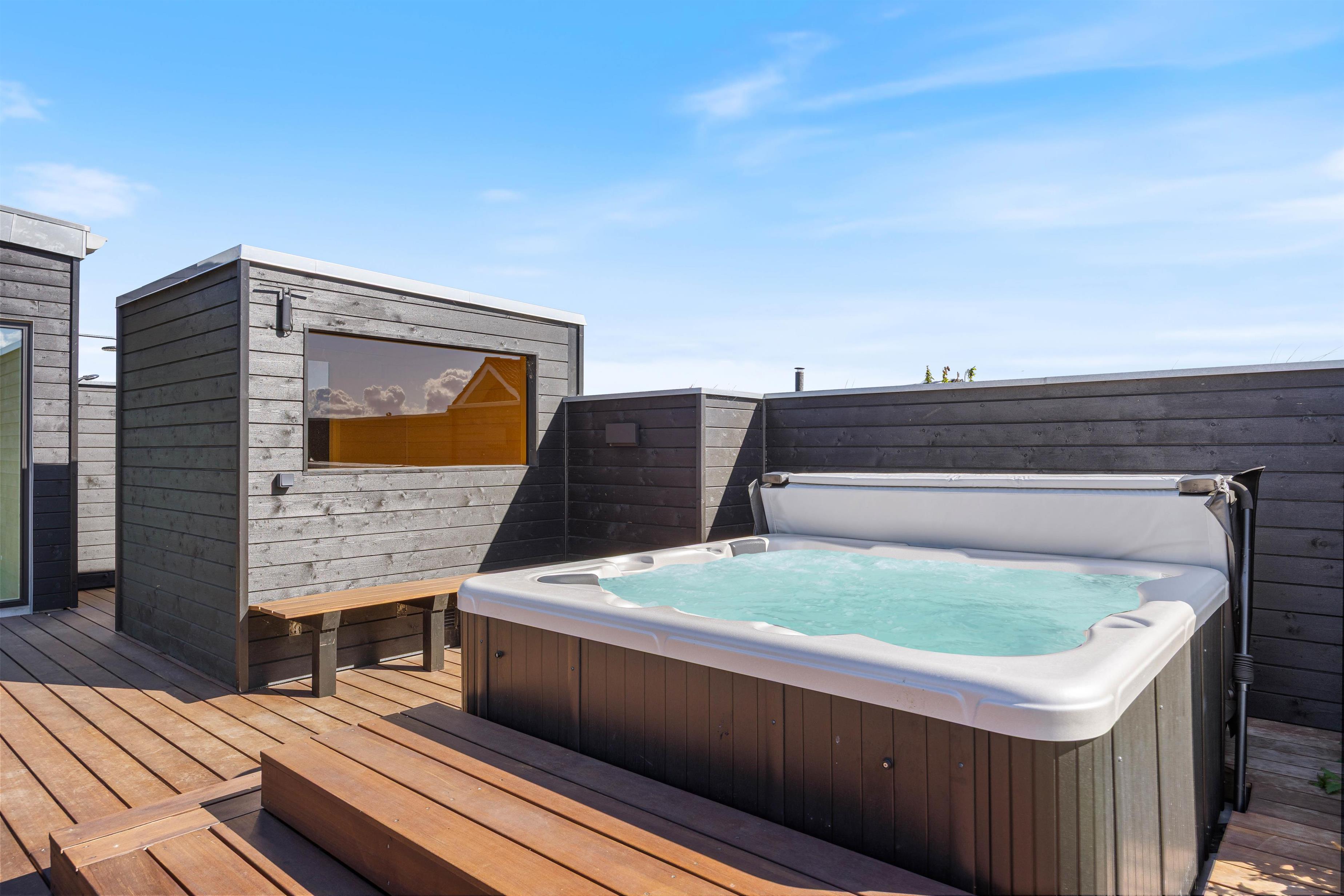 Udenfor venter udendørssauna og en lækker udespa, hvor I kan læne jer tilbage og nyde varmen under åben himmel.
