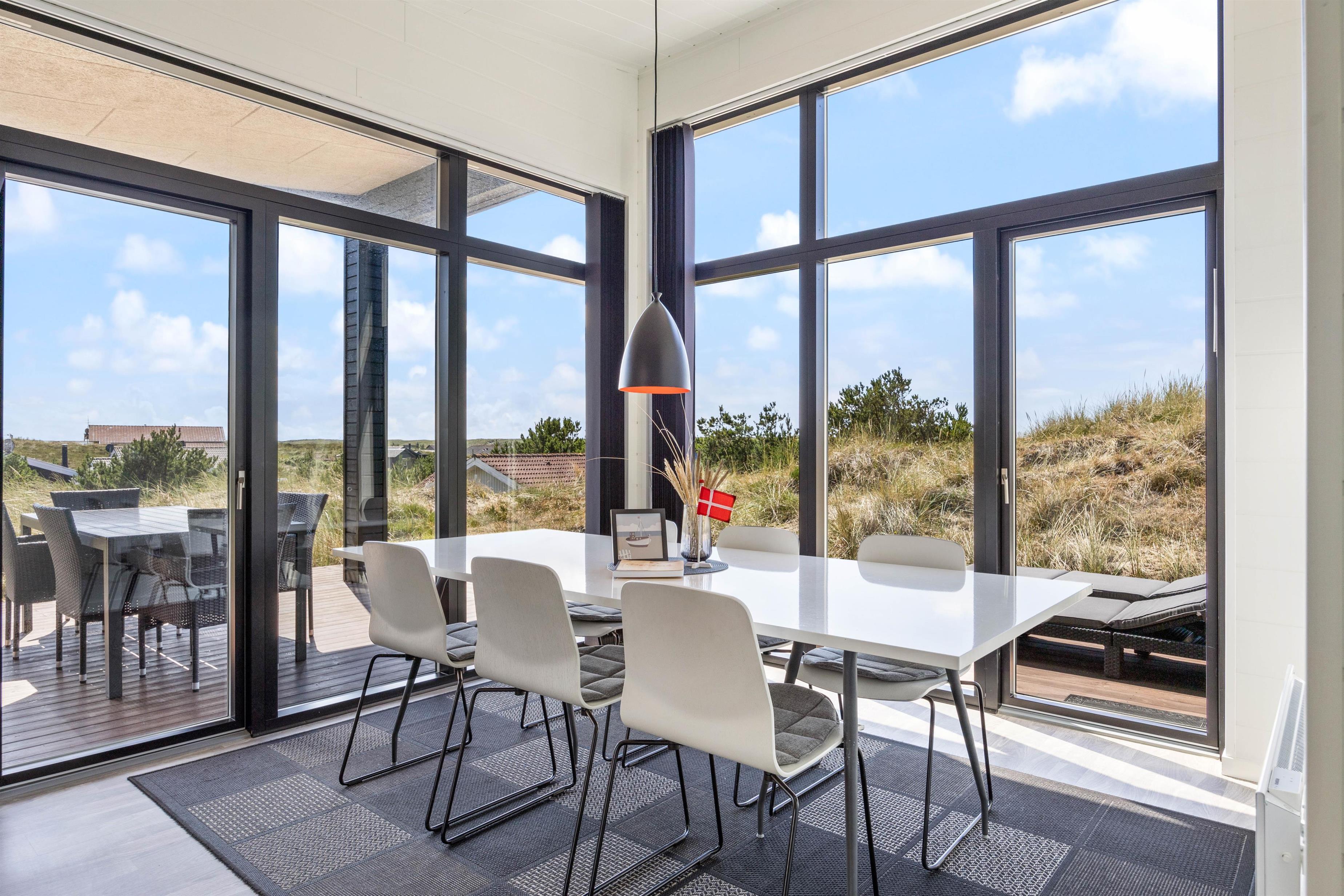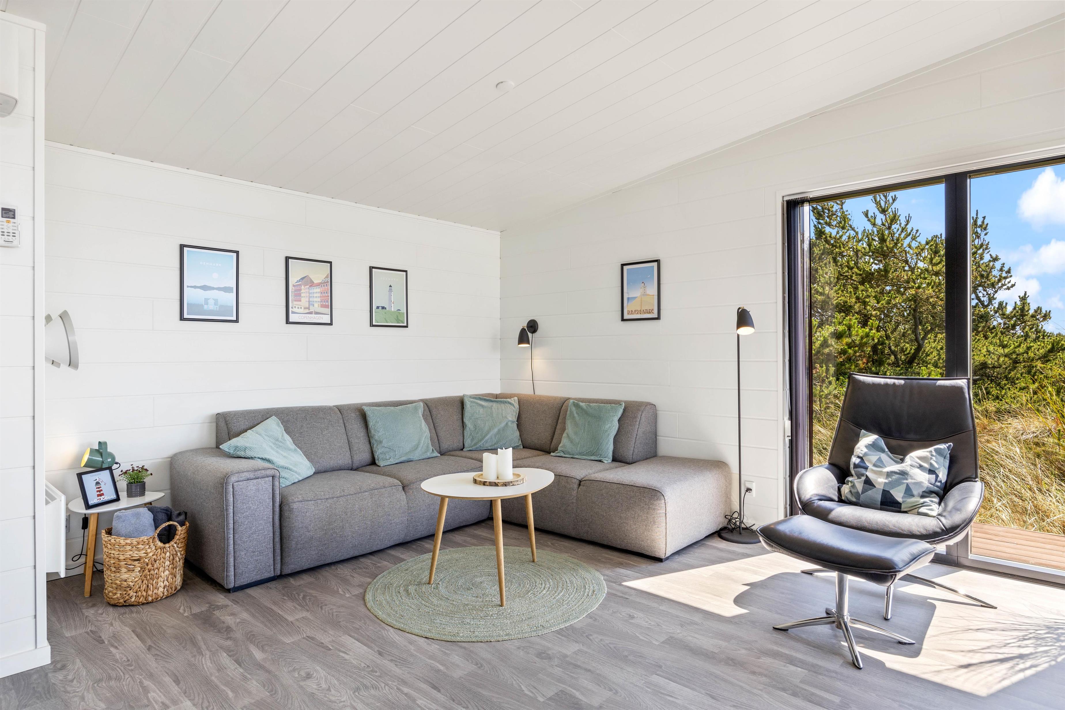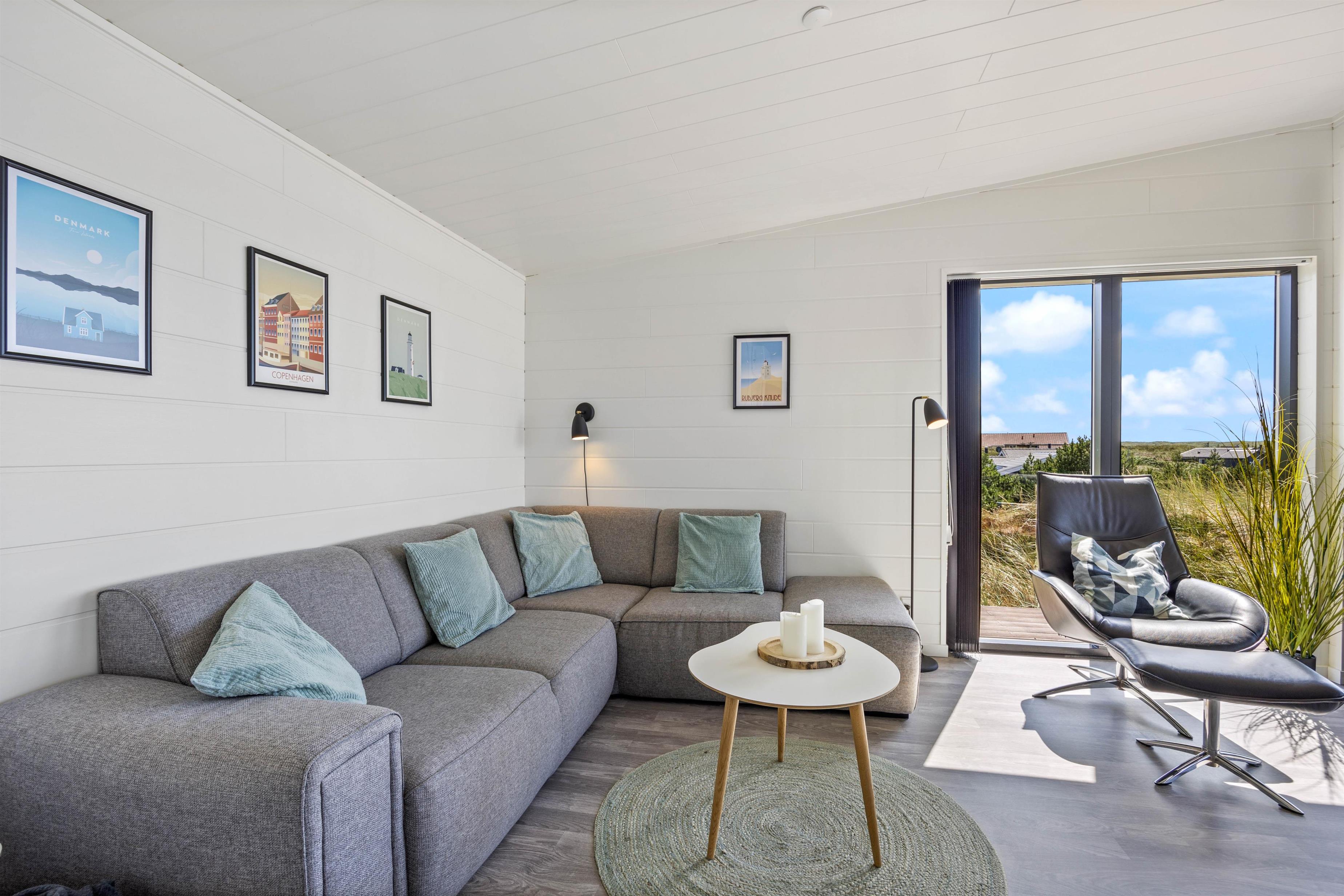 I det store lyse opholdsrum er der indsat store vinduespartier, så den flotte udsigt over ferieområdet kan nydes. Der er også en stor spiseafdeling, 3 gode, lyse soverum med dobbeltsenge, og to badeværelser, så der er fin plads til 6 personer. Og trænger du til lidt ekstra selvforkælelse, kan du nyde et par stunder i saunaen og spaen efter en lang gåtur ved det brusende Vesterhav.