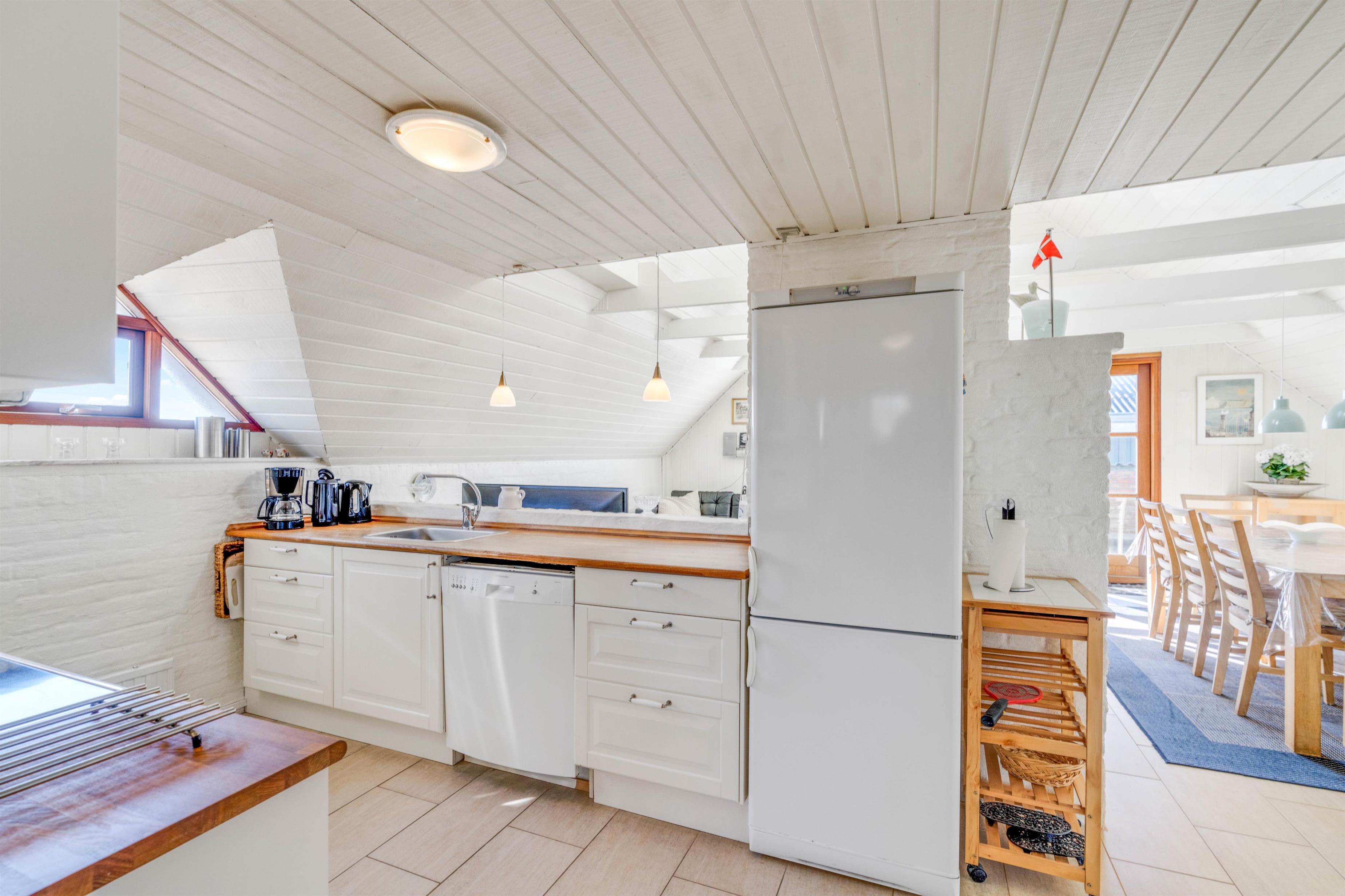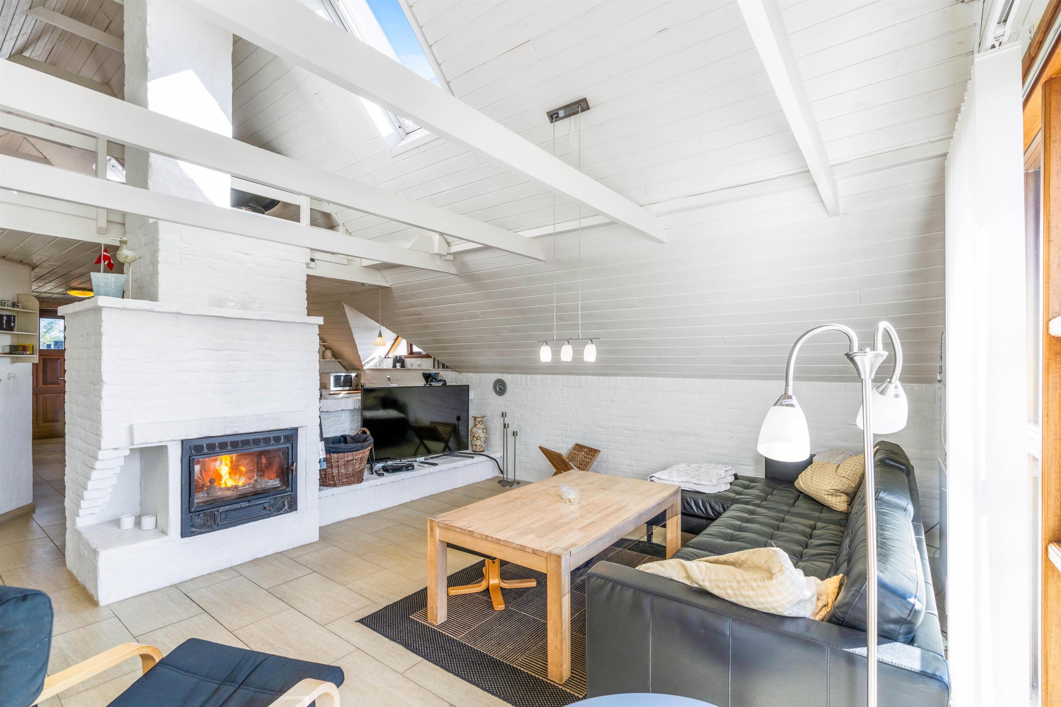 Sommerhusets hjerte er uden tvivl stuen med den indmurede pejs, som giver feriehuset en hyggelig rustik stemning. Sommerhuset på Auroravej 10 er et klassisk feriehus, der er renoveret i 2014. Det veludstyrede køkken er forbundet med spise- og opholdsstue, hvor I kan tilbringe mange dejlige timer sammen med familie og venner. Det store spisebord er ideelt til sjove bræt- eller kortspil med børnene, og sofaen sætter rammen for en dejlig familiefilmaften foran pejsen.
