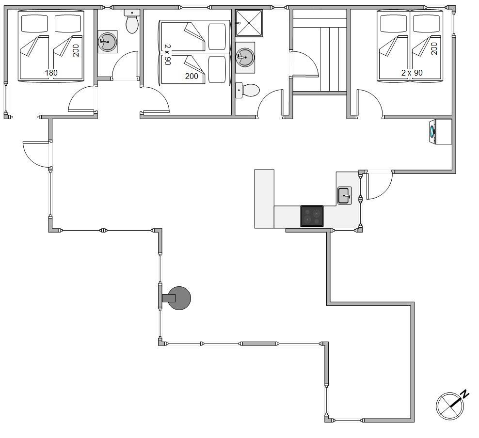 Sommerhuset har 3 soverum, heraf 2 med hver en dobbeltseng og et rum med 2 enkeltsenge.