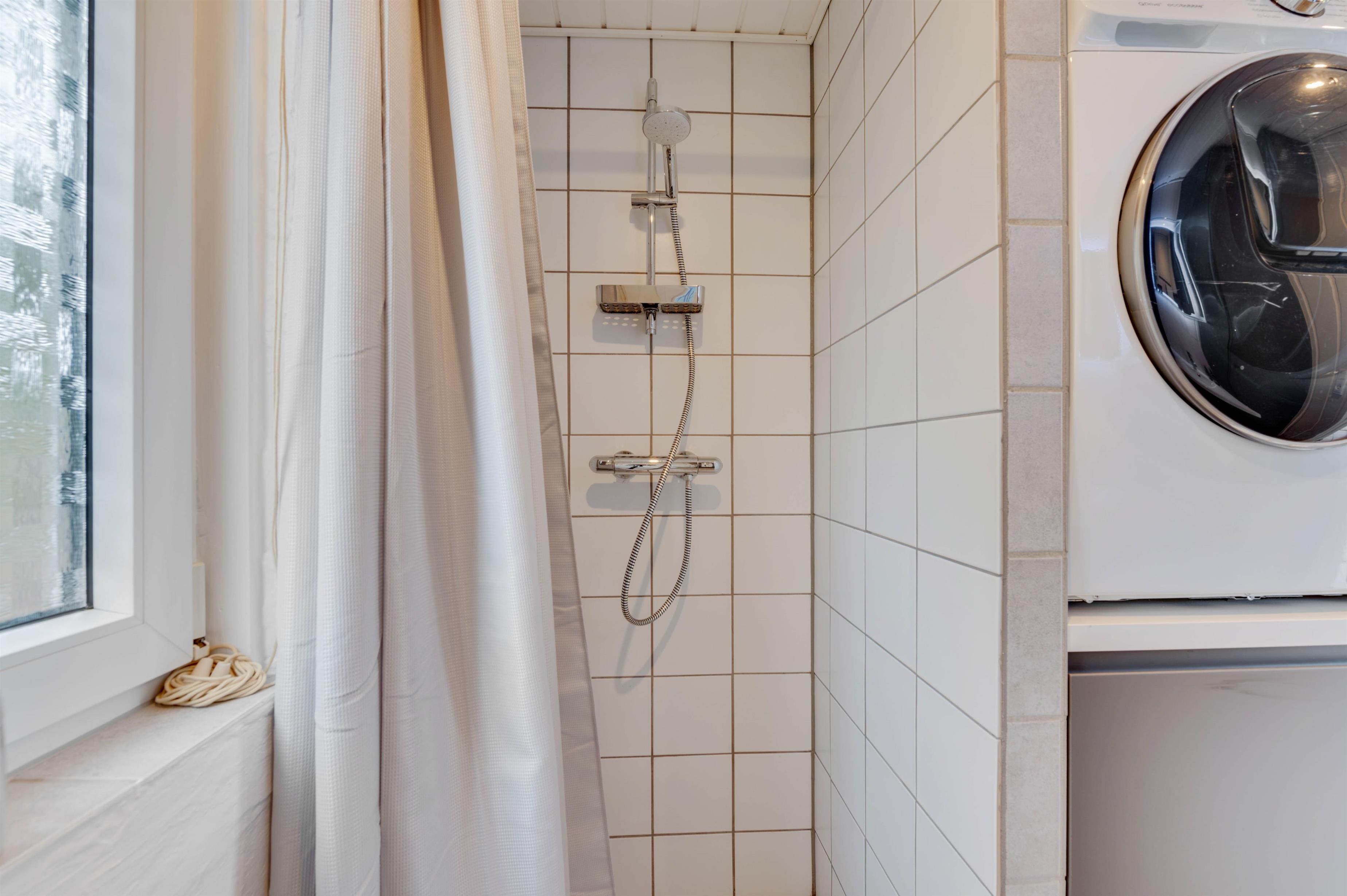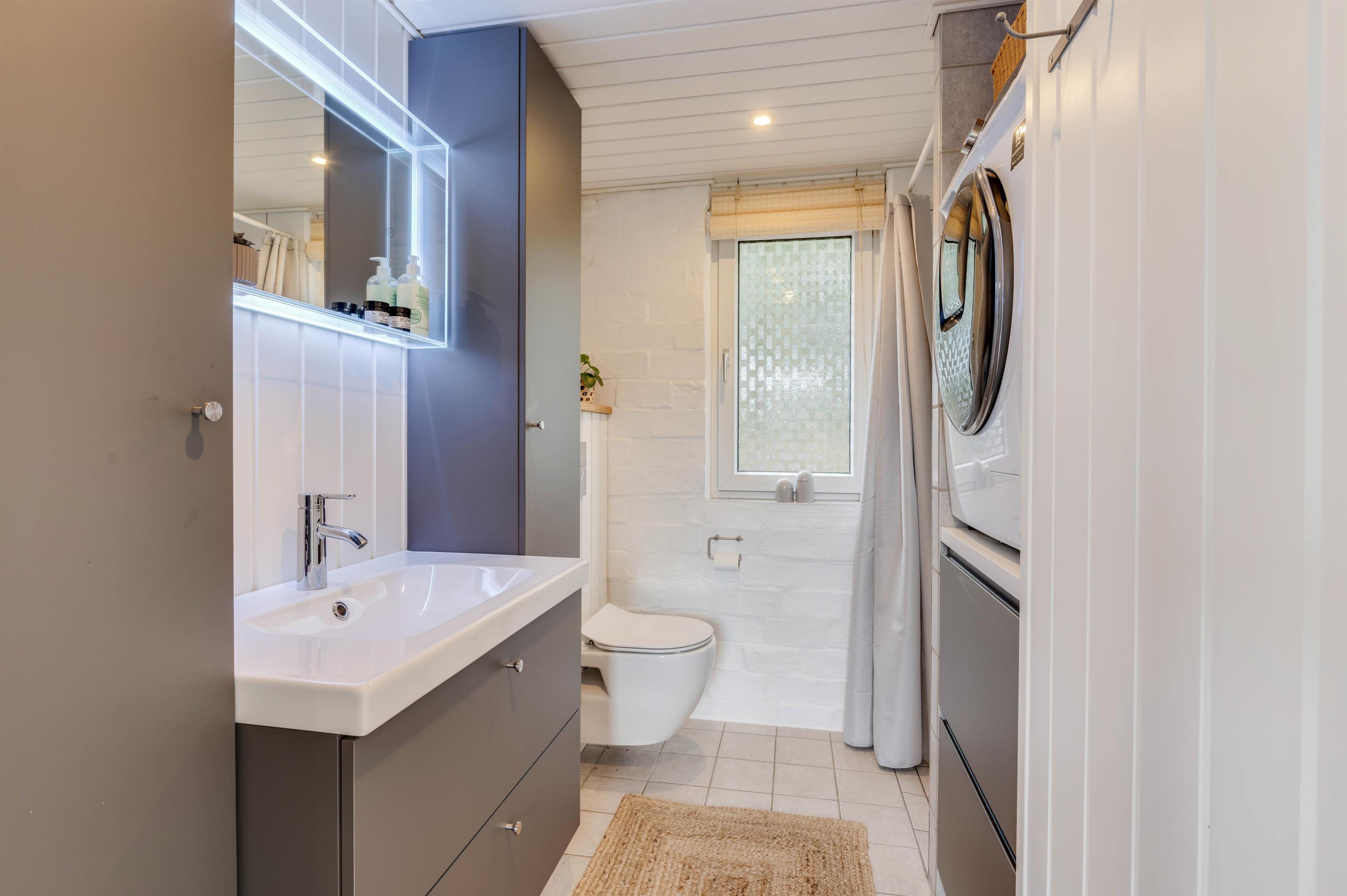 På badeværelset er der gulvvarme og her er også vaskemaskine samt tørretumbler, så I har mulighed for at vaske tøj i løbet af ferien.