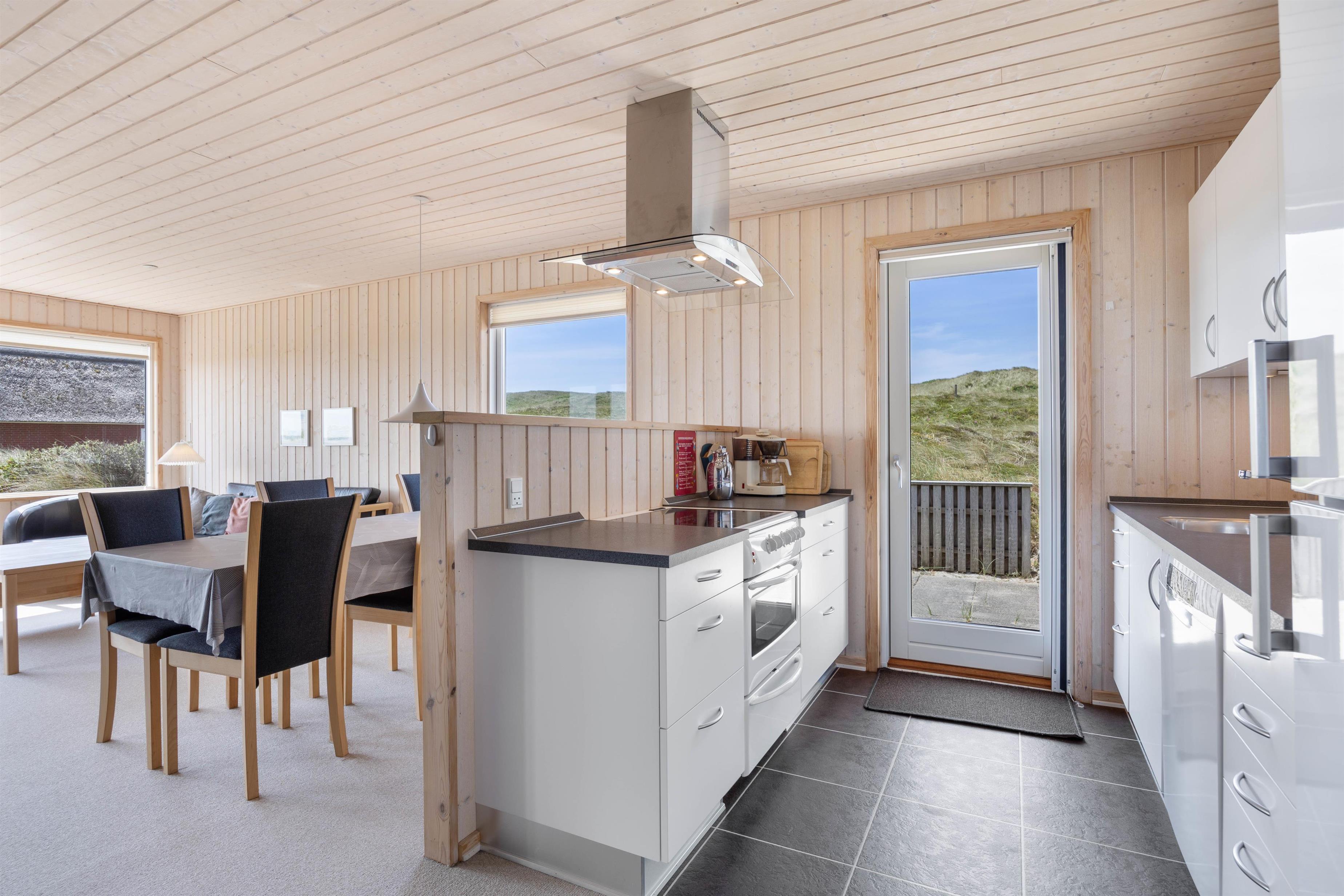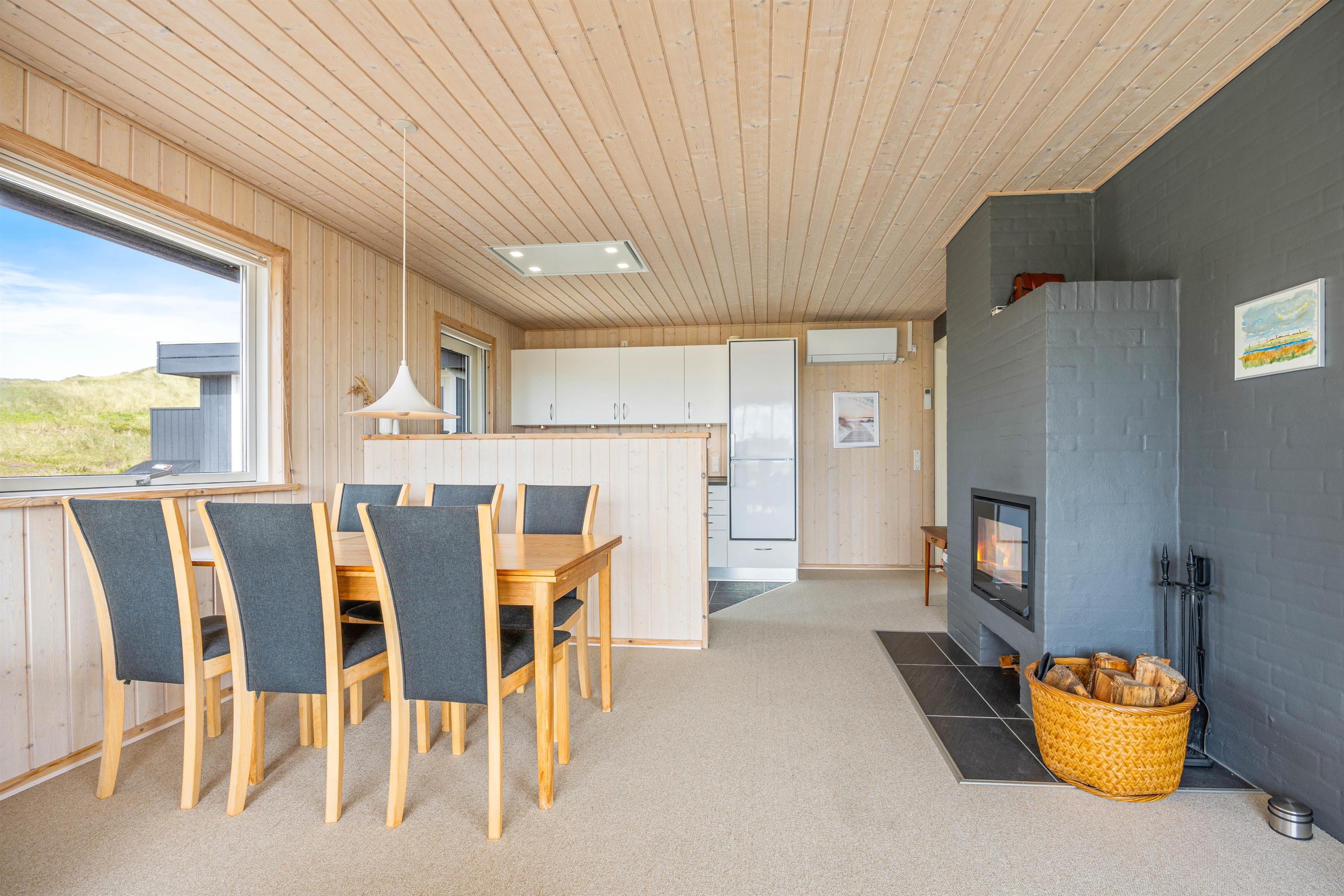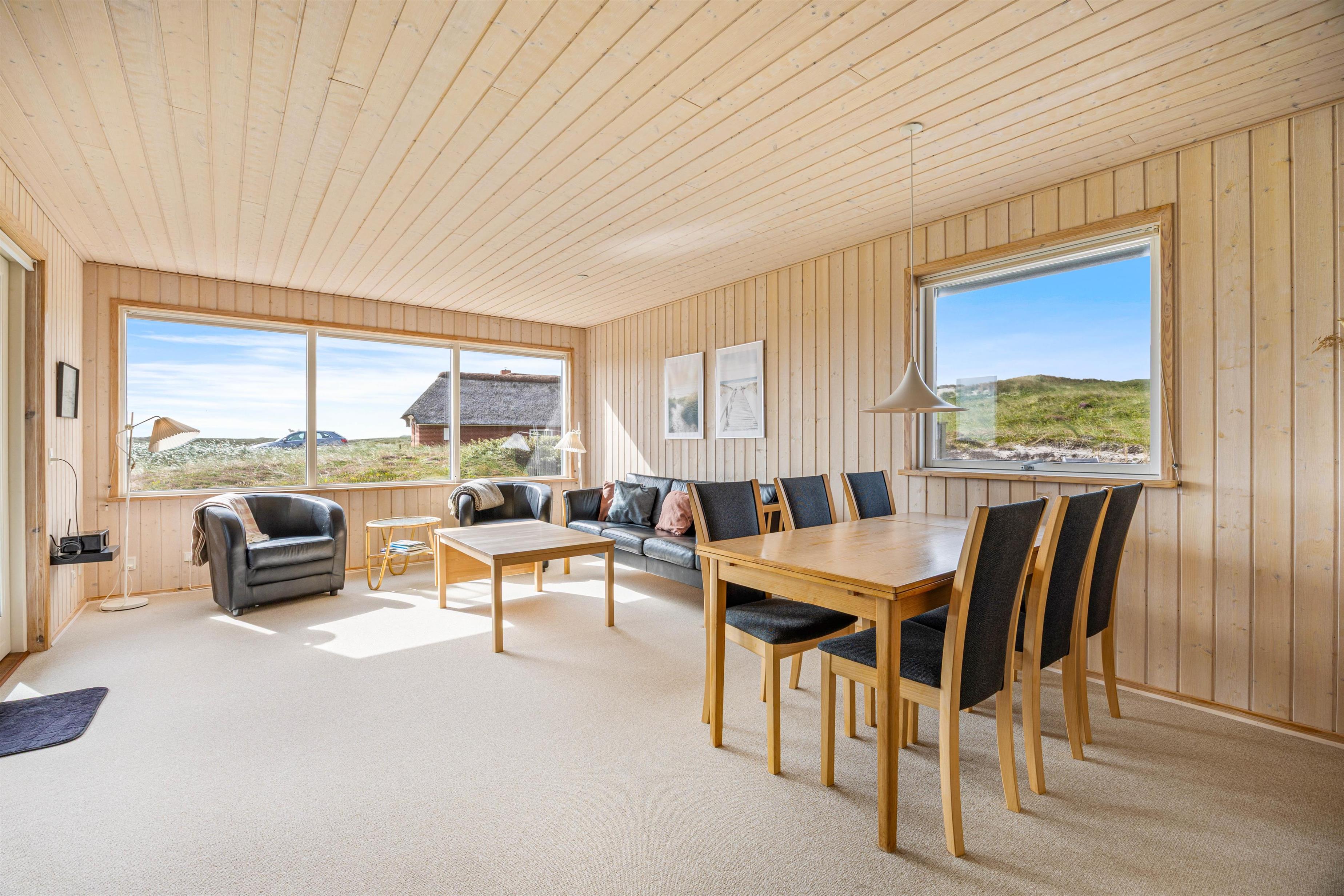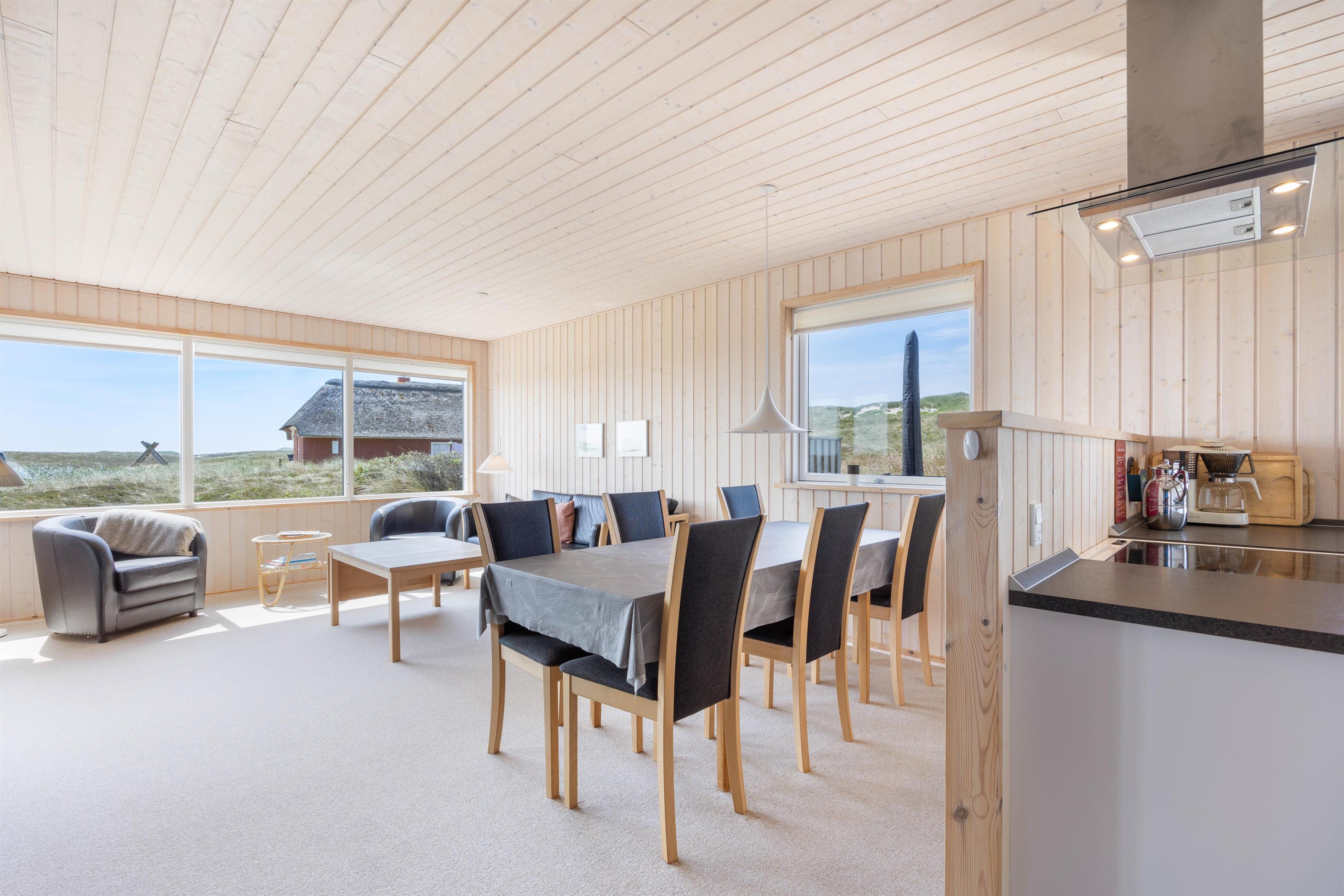 I stuen med panoramavinduer og -døre ligger et lunt gulvtæppe. De træbeklædte vægge er lyse og giver en fin feriestemning. Den komfortable sofagruppe byder på afslapning med en god bog eller en film. Der er Chromecast tilknyttet, så valgmulighederne er mange. Tænd op i brændeovnen om aftenen og arranger eventuelt en fælles filmaften.
