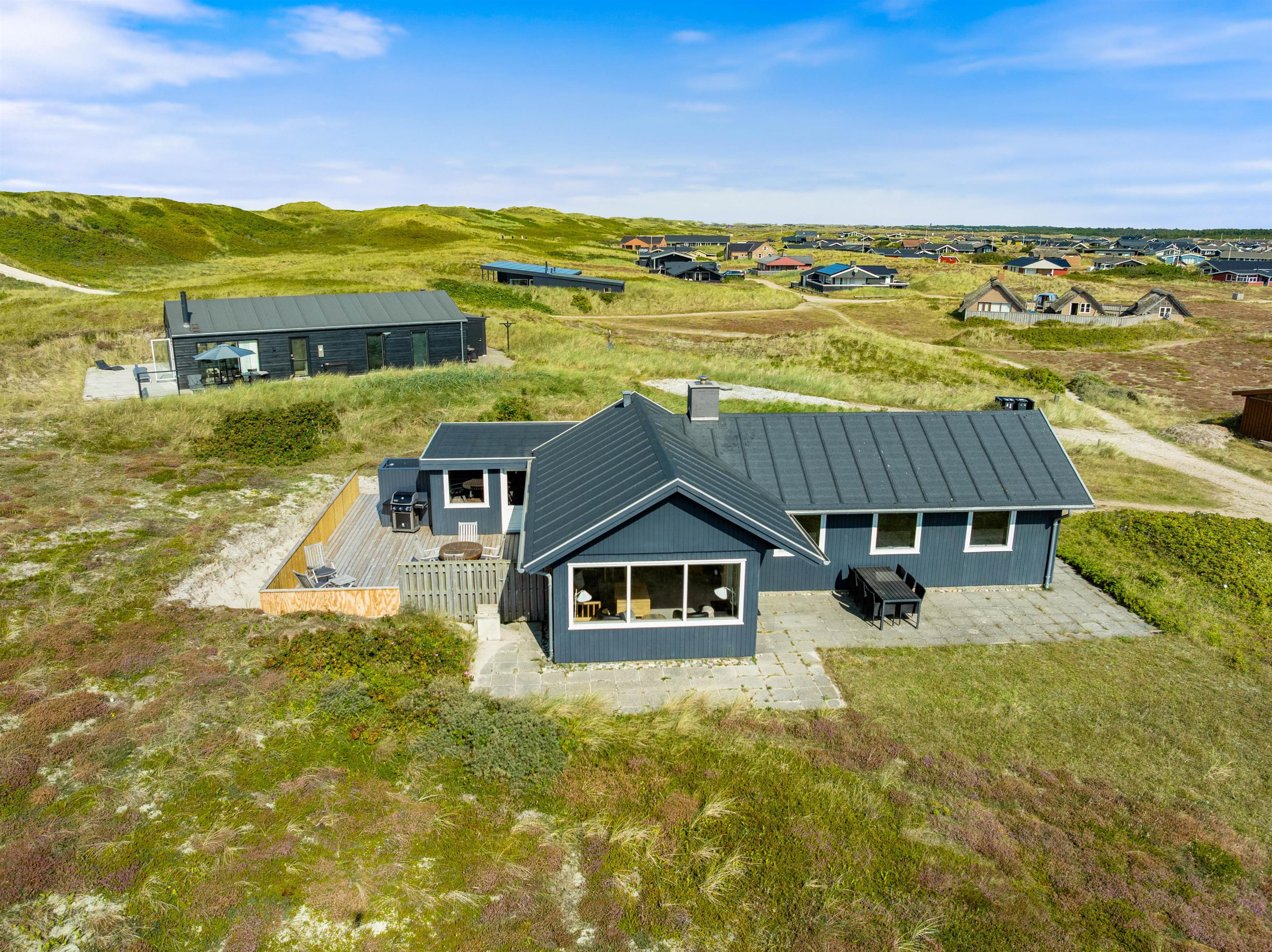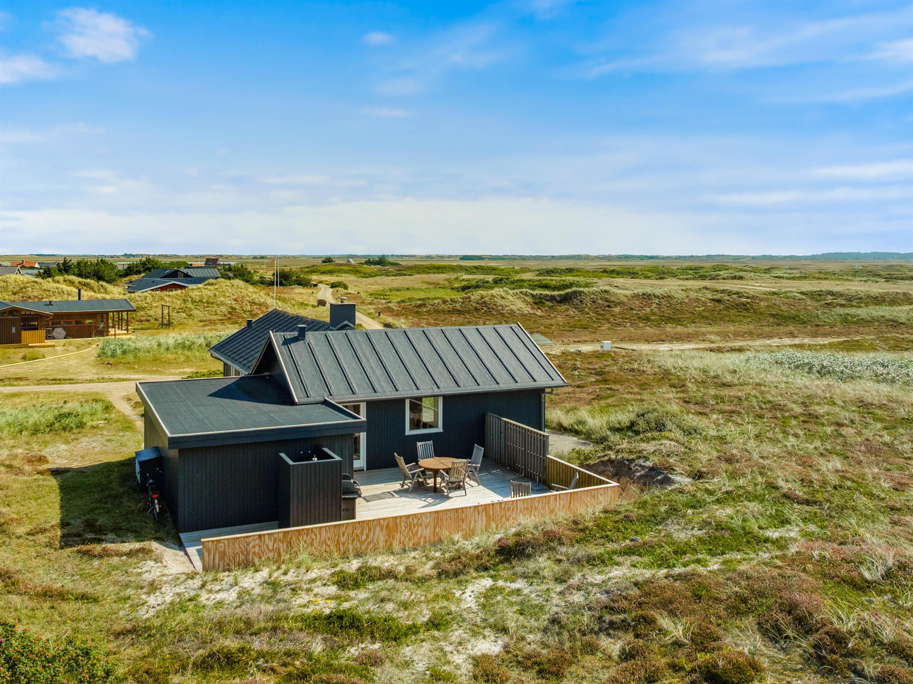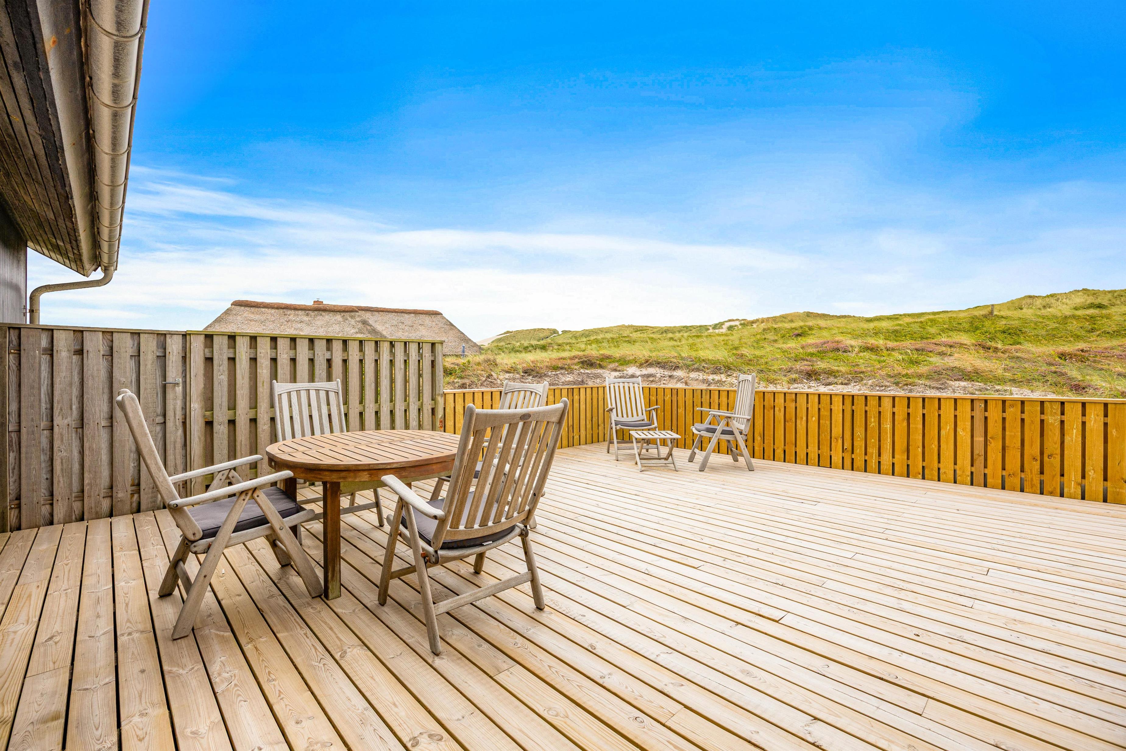 På feriehusets delvist afskærmede terrasse kan du finde en rolig plet til afslapning med en bog eller en kølig drink. Her er havemøbler, solvogne og parasol, så skulle I få lyst til en grillaften i den nedgående sol, er det også en oplagt mulighed. På den 1.750 kvadratmeter store naturgrund kan I udforske Vestkystens særegne plante- og dyreliv, og slappe helt af.