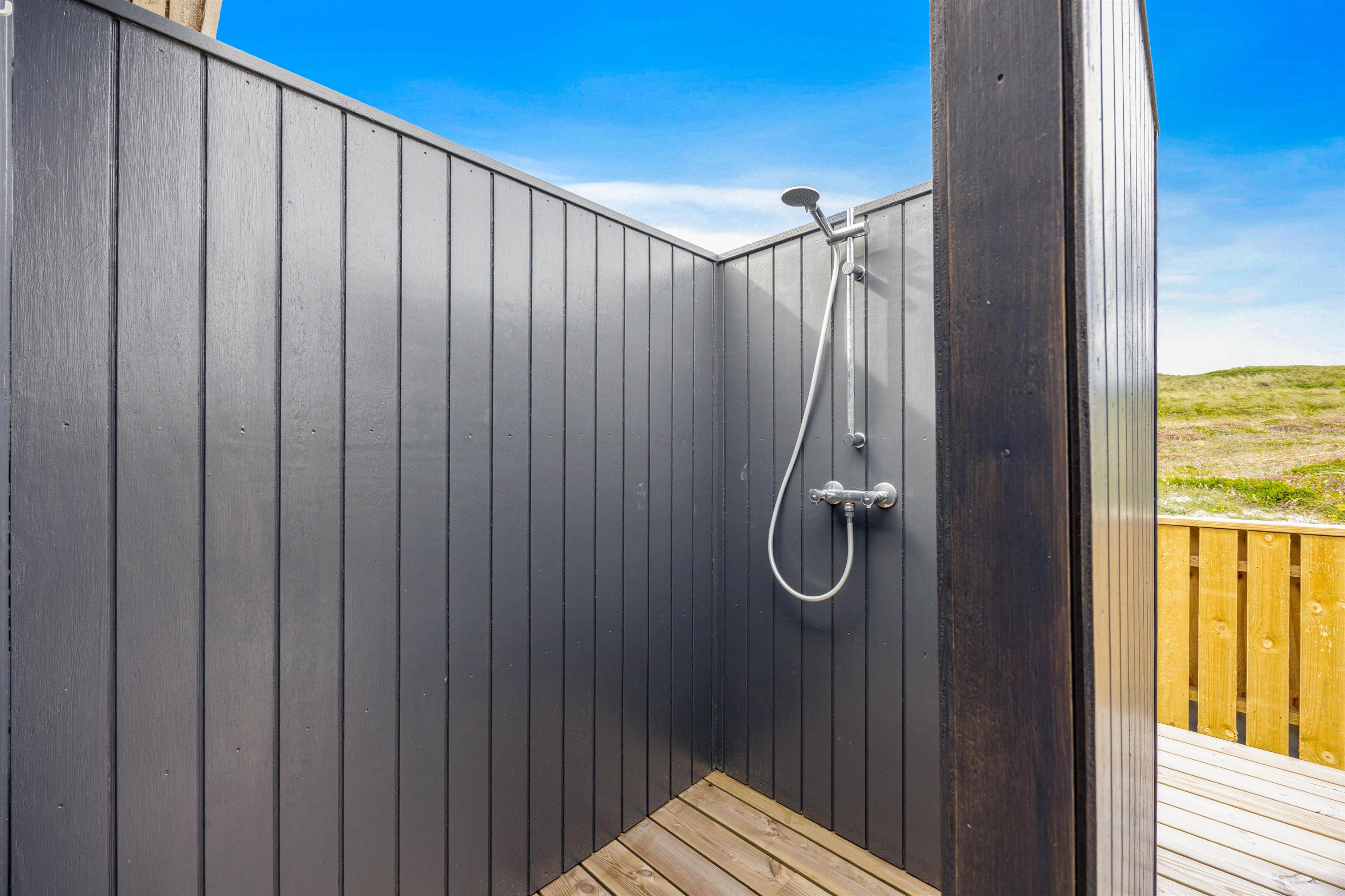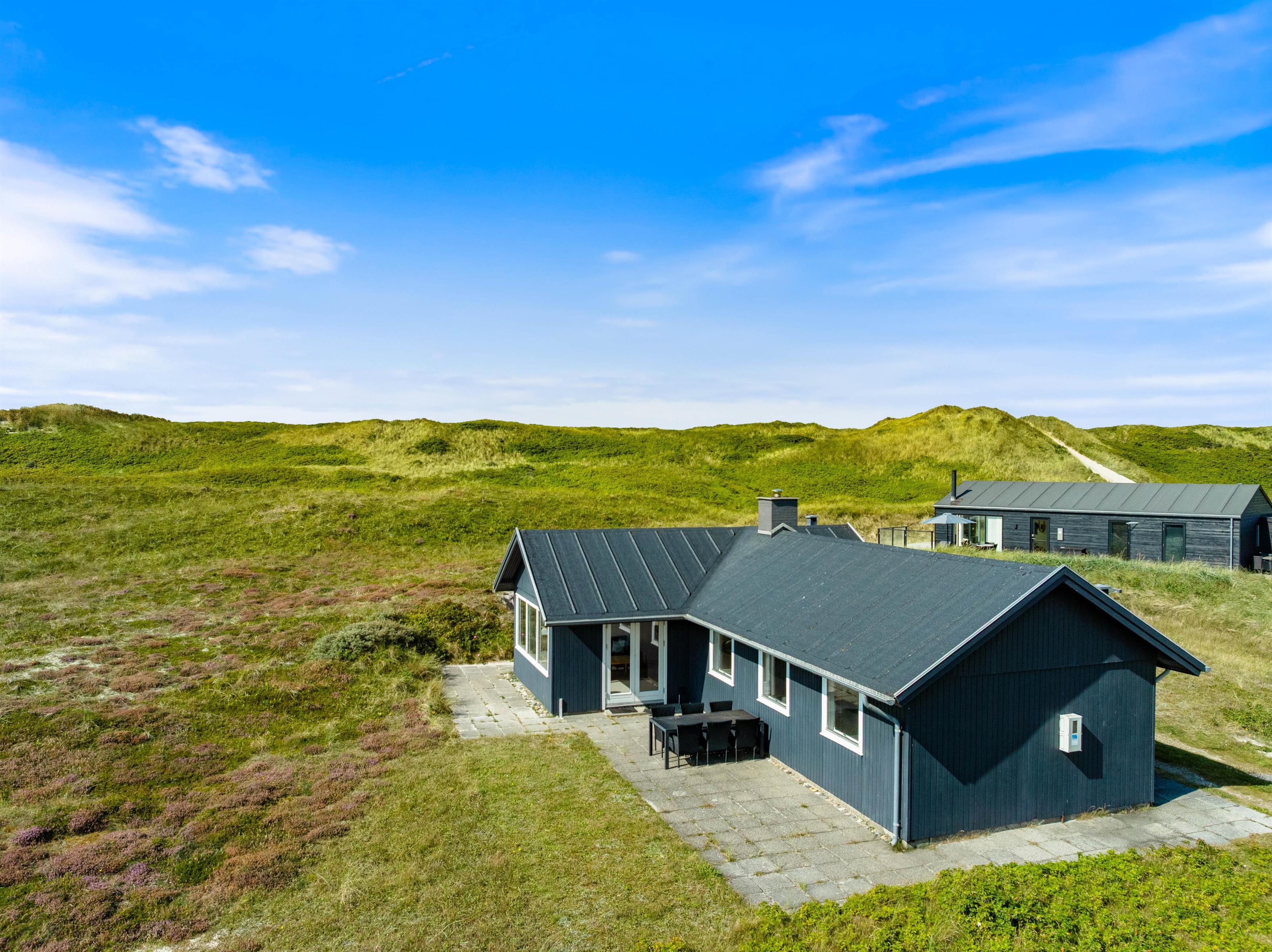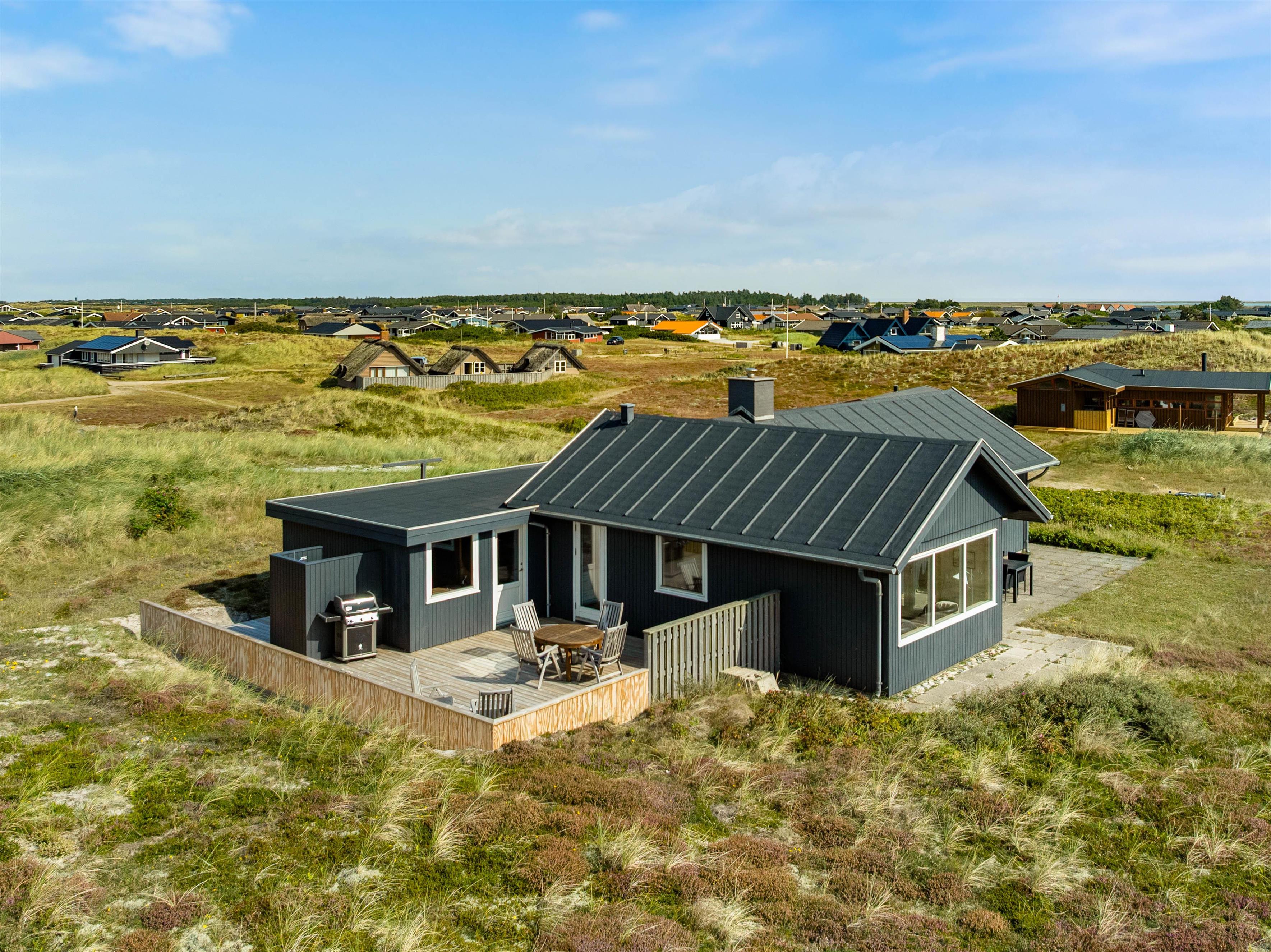 På feriehusets delvist afskærmede terrasse kan du finde en rolig plet til afslapning med en bog eller en kølig drink. Her er havemøbler, solvogne og parasol, så skulle I få lyst til en grillaften i den nedgående sol, er det også en oplagt mulighed. På den 1.750 kvadratmeter store naturgrund kan I udforske Vestkystens særegne plante- og dyreliv, og slappe helt af.