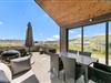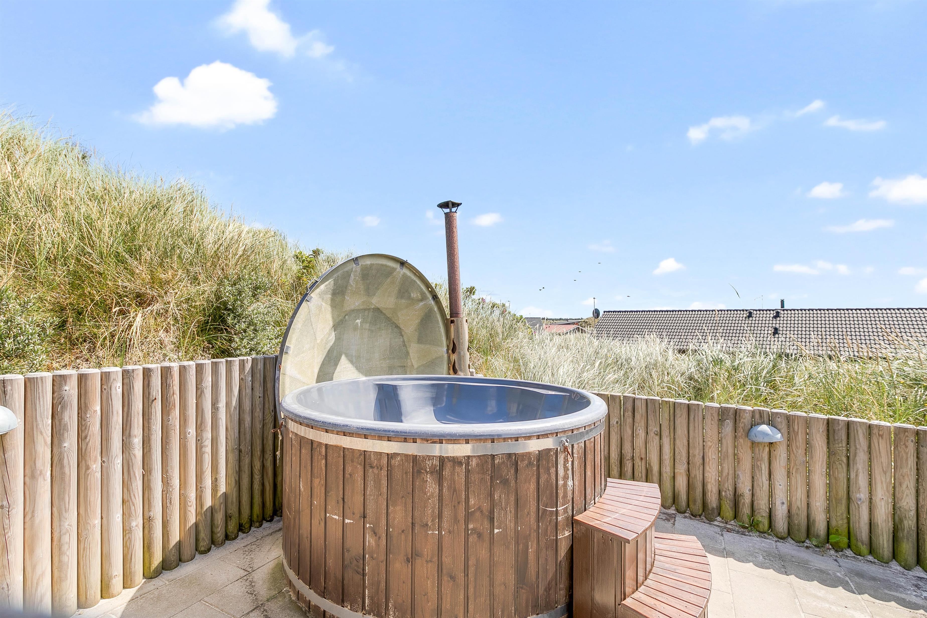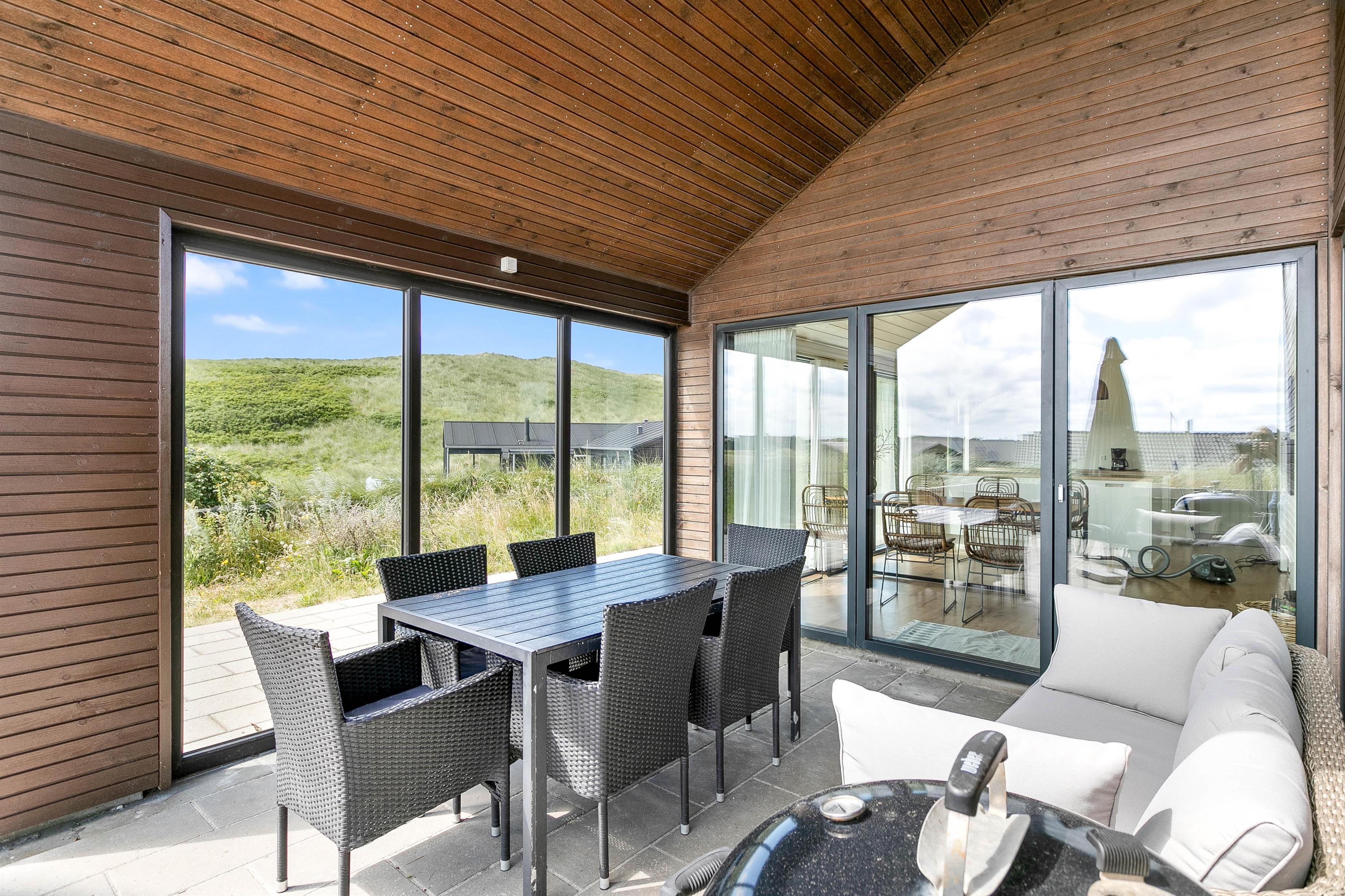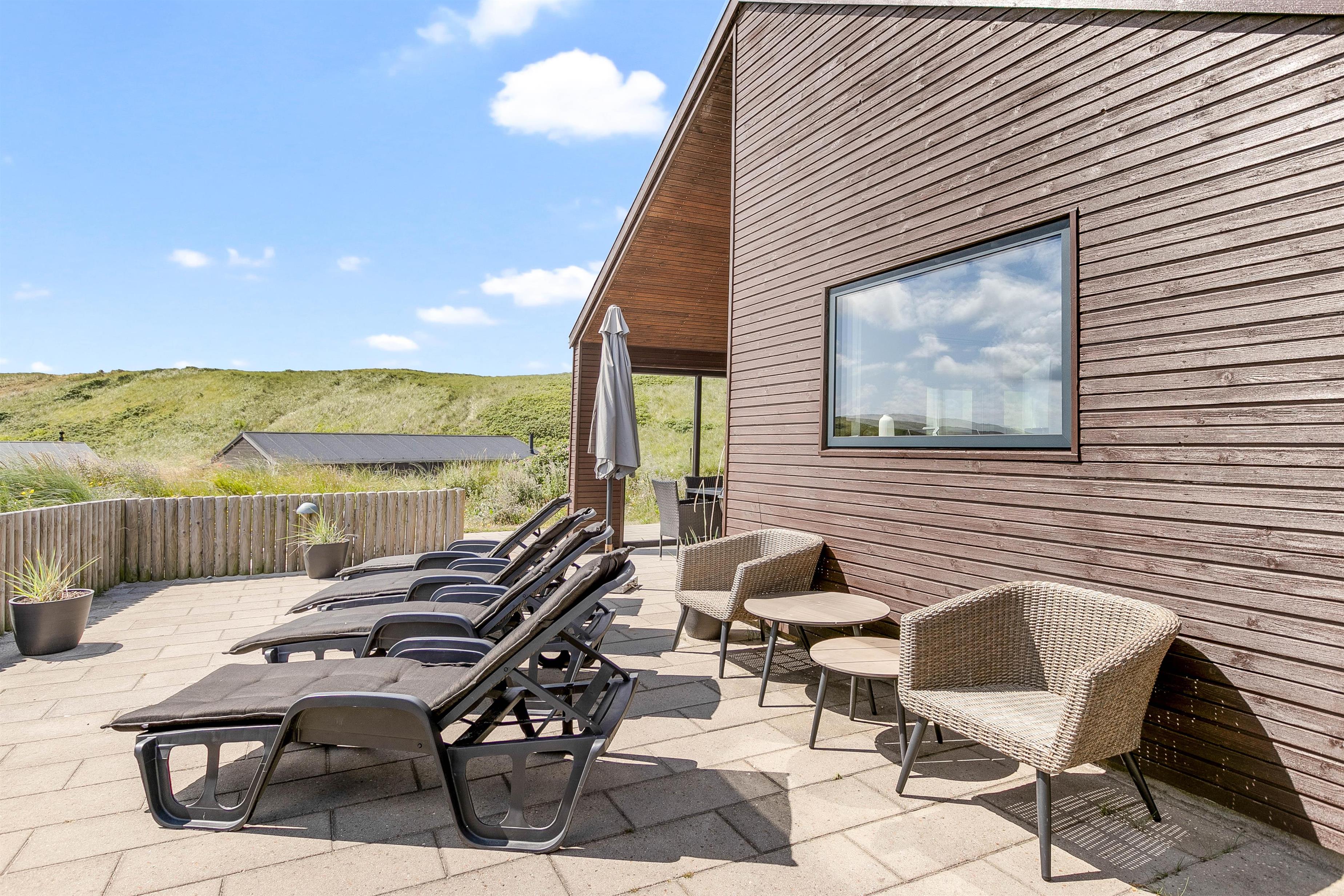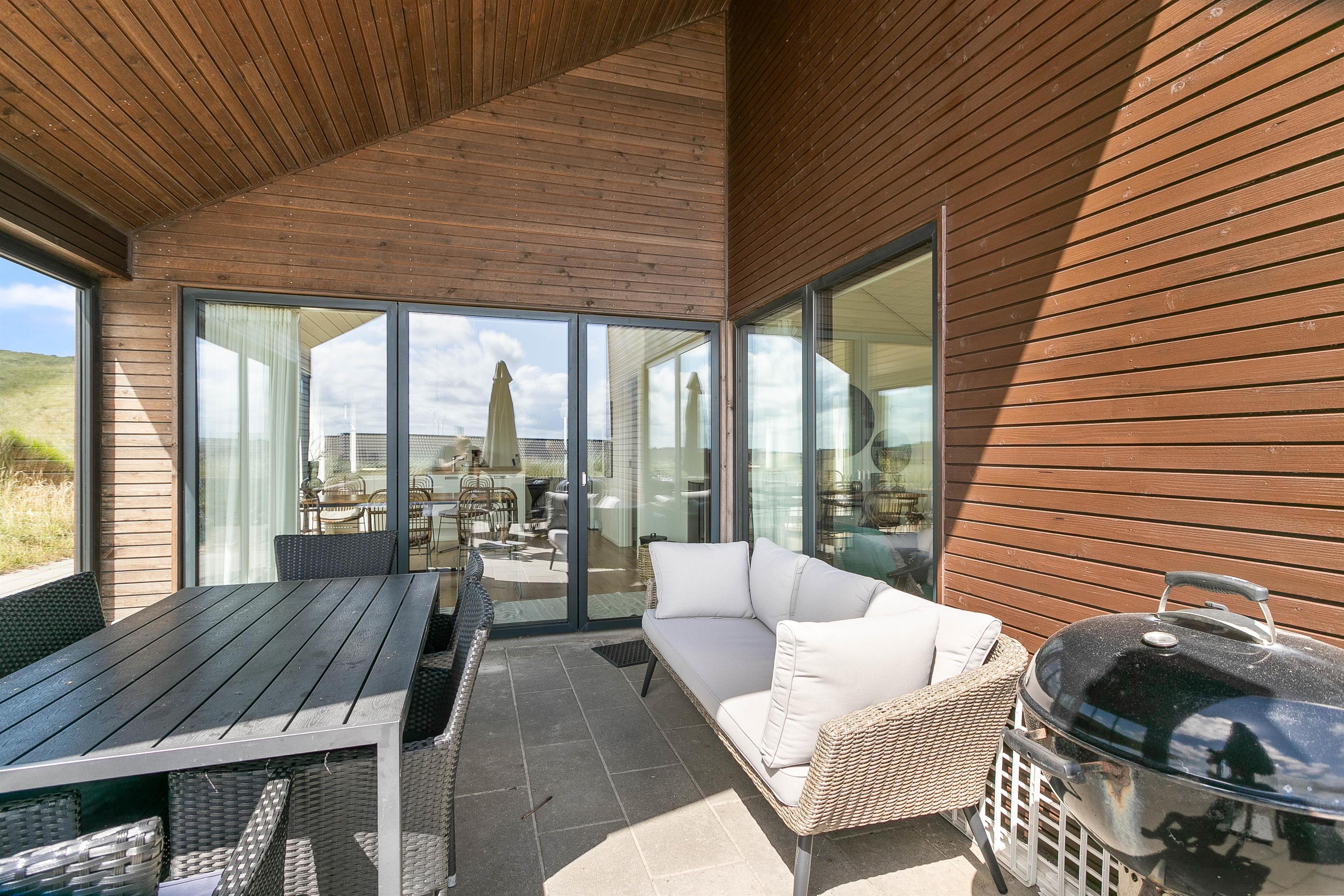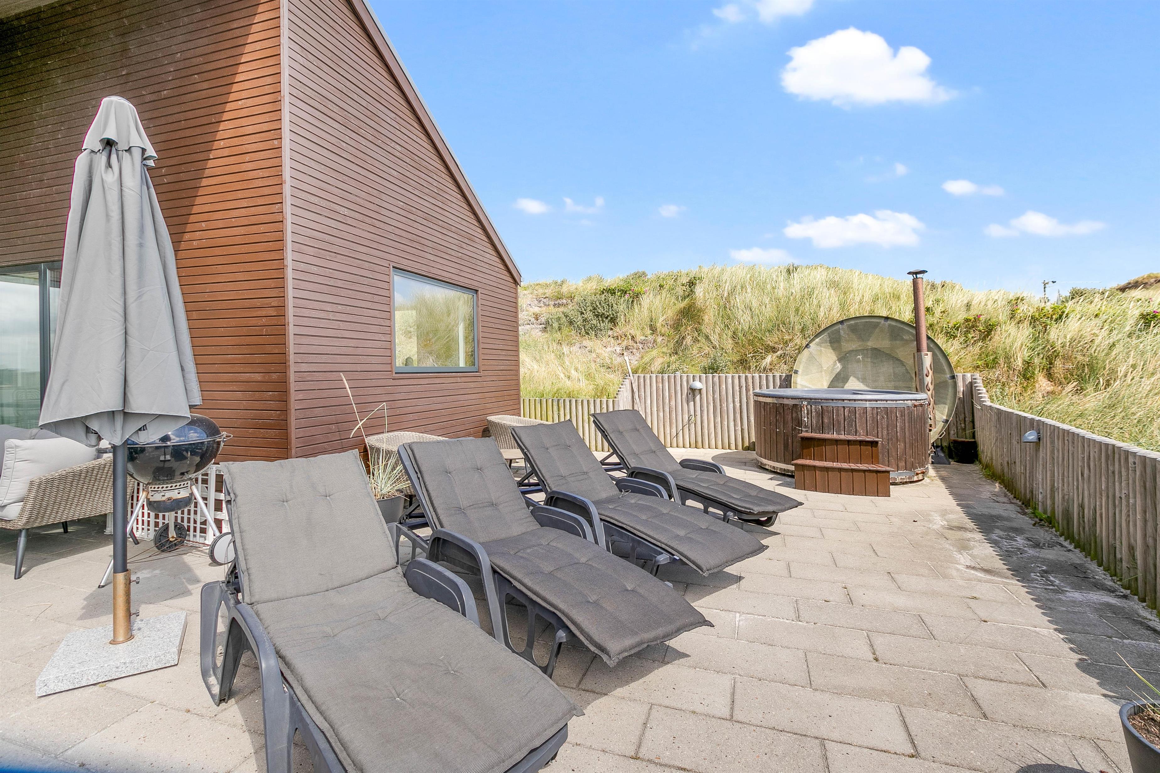 Terrassen er nærmest et rum i sig selv. – Her er tænkt på alt. Et flot stakit, der passer ind i naturen, afskærmer terrassen mod syd, så det er nemt at finde læ-hjørner. Her finder I også det skønne store vildmarksbad og et lounge-område, hyggeligt inddelt med blomsterkummer. Et stort glas-parti afskærmer den overdækkede terrasse mod vest, så her er en rigtig god fuldt overdækket terrasse, som bestemt er med til at forlænge ”ude-sæsonen” her i yderste klitrække, hvor du altid har havets lette brusen og salte duft i baggrunden.
