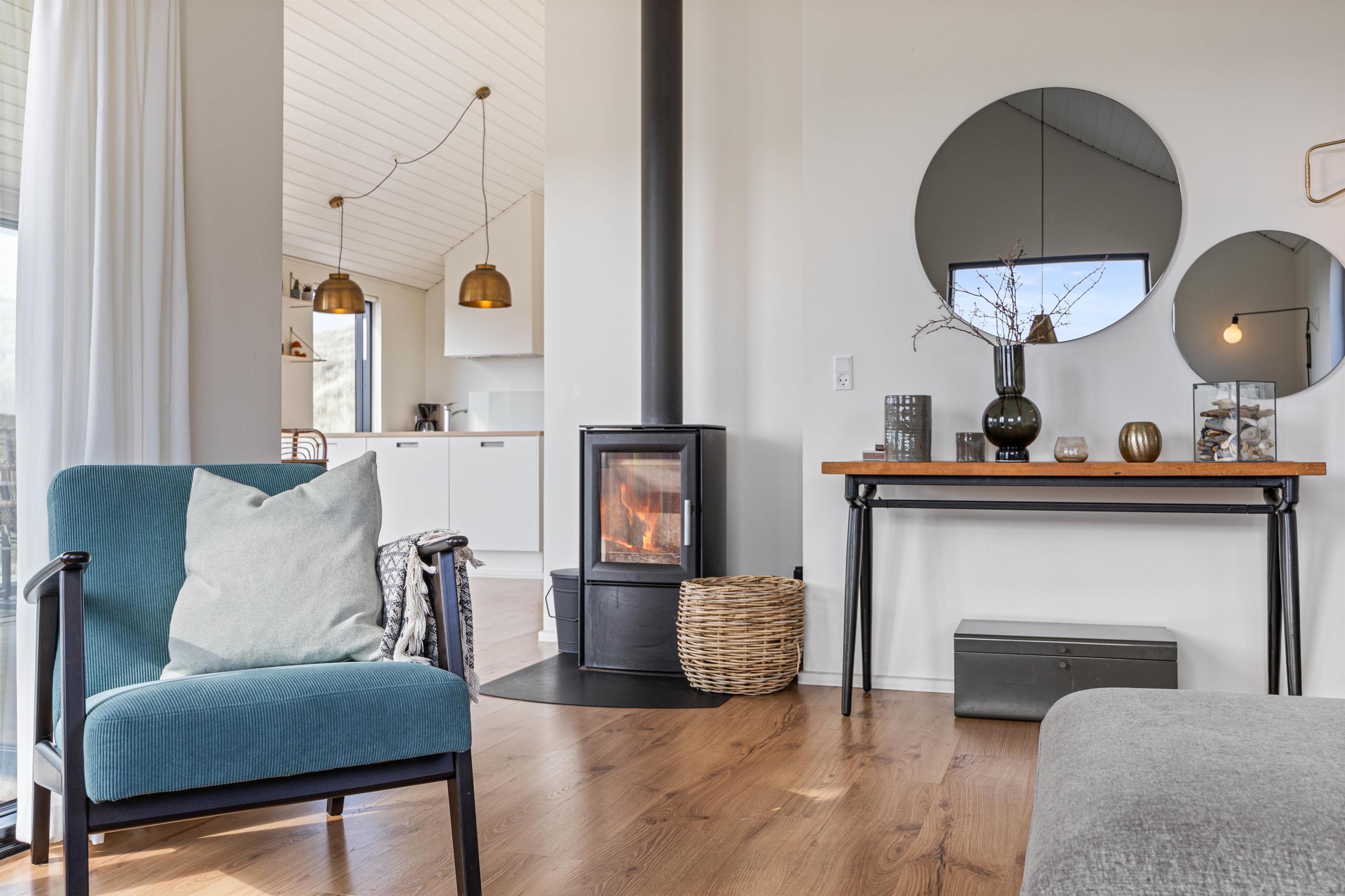 Køkken-alrum og stue hænger sammen i ét stort opholdsrum med brændeovnen i centrum. Her kan I rigtig koble af og glemme hverdagens stress, mens I drikker en kop friskbrygget kaffe på sofaen eller holder spilaften med familien, og de knitrende flammer varmer i baggrunden.