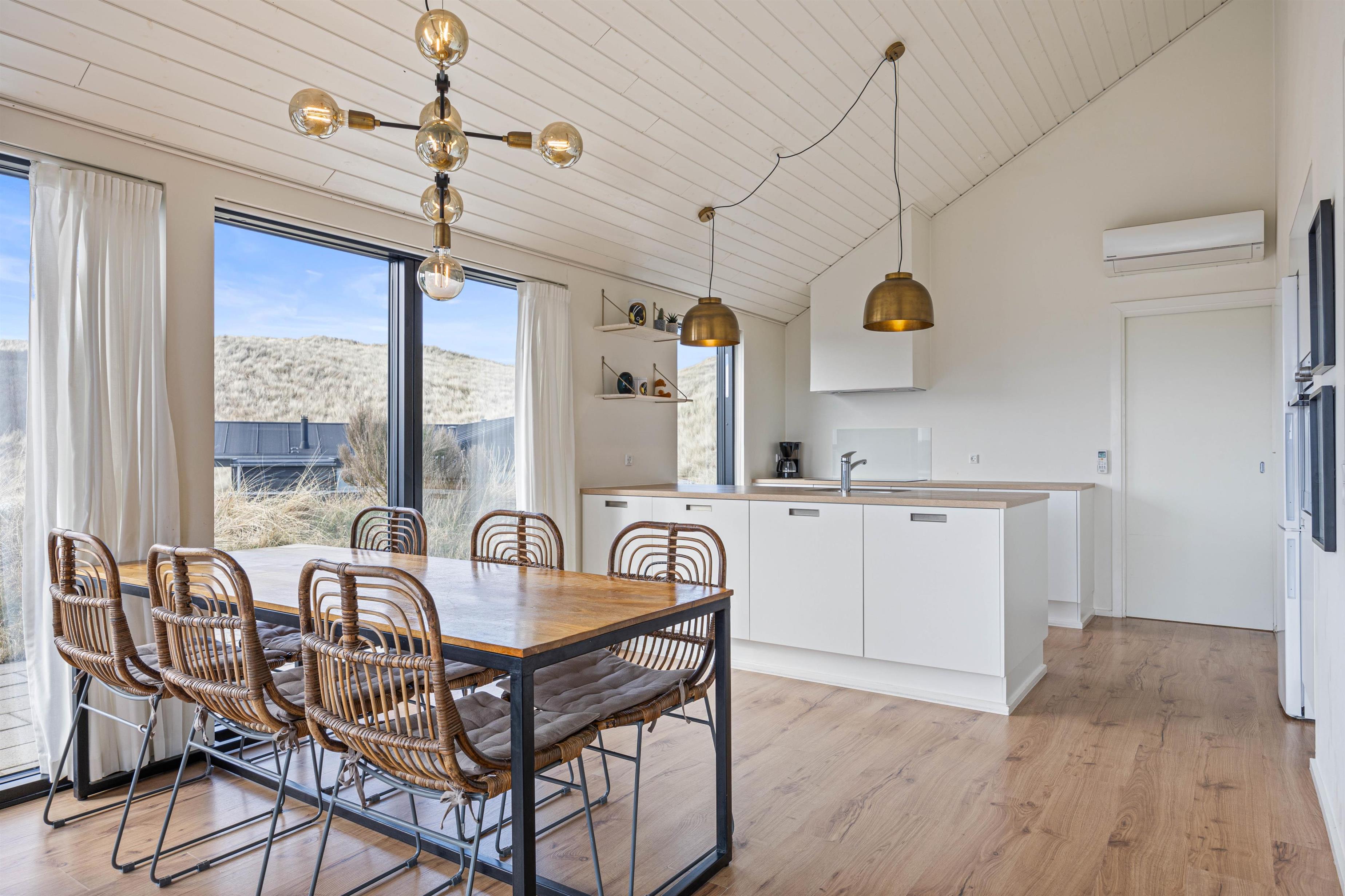 Hvide vægge, store vinduespartier og loft i kip. De 100 stilfulde kvadratmeter rummer mere end god plads til 6 personer (og 2 hunde), og de lyse omgivelser får huset til at virke endnu større og sørger samtidig for en afslappende ferieatmosfære.