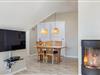 Det hyggelige sofahjørne indbyder til familiehygge med spil og afslapning foran den knitrende ild i brændeovnen. Her er højt til loftet - og mod sydøst inviterer de store vinduespartier naturen og solen helt ind i stuen.