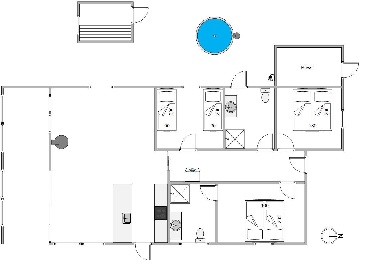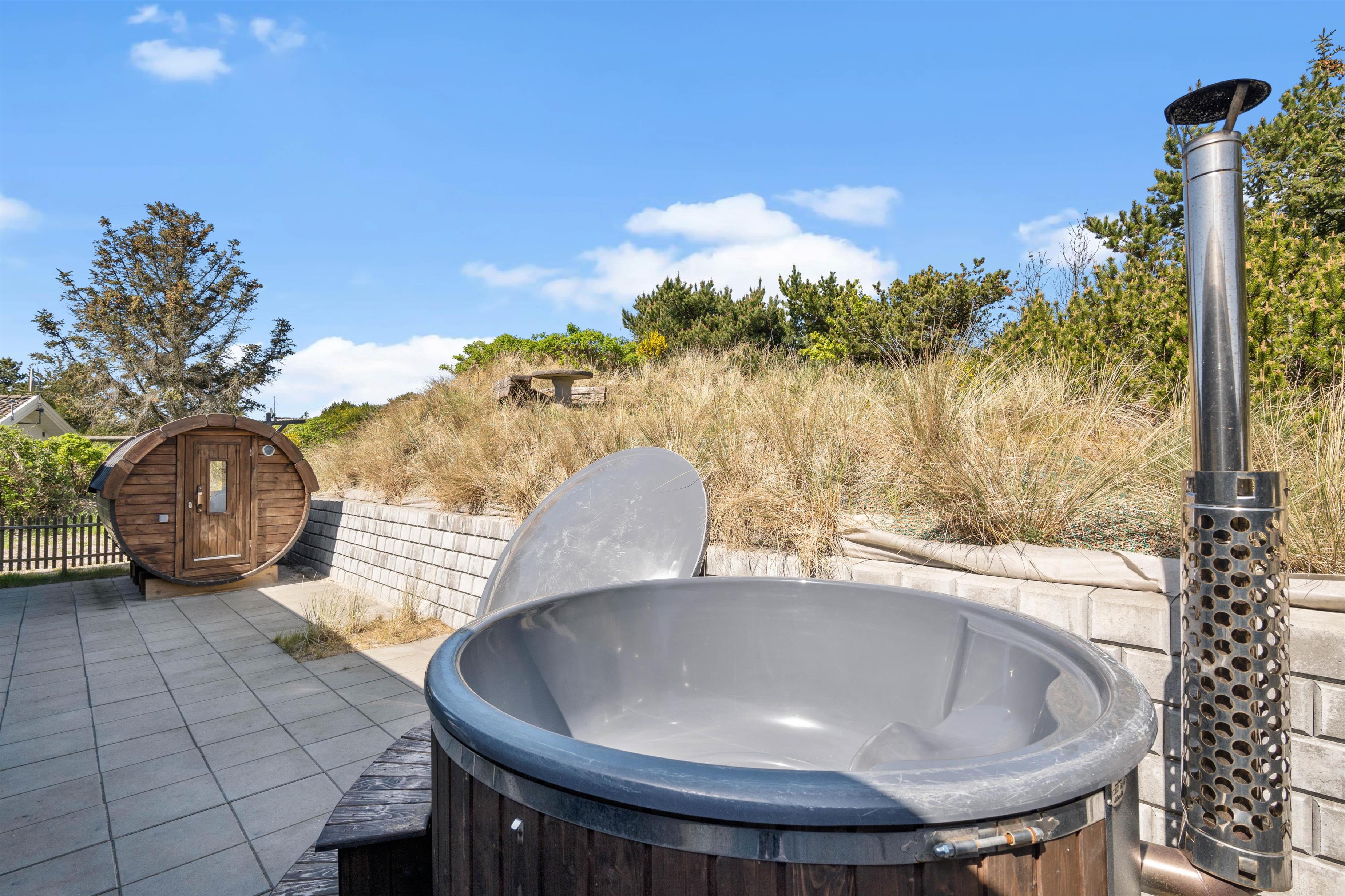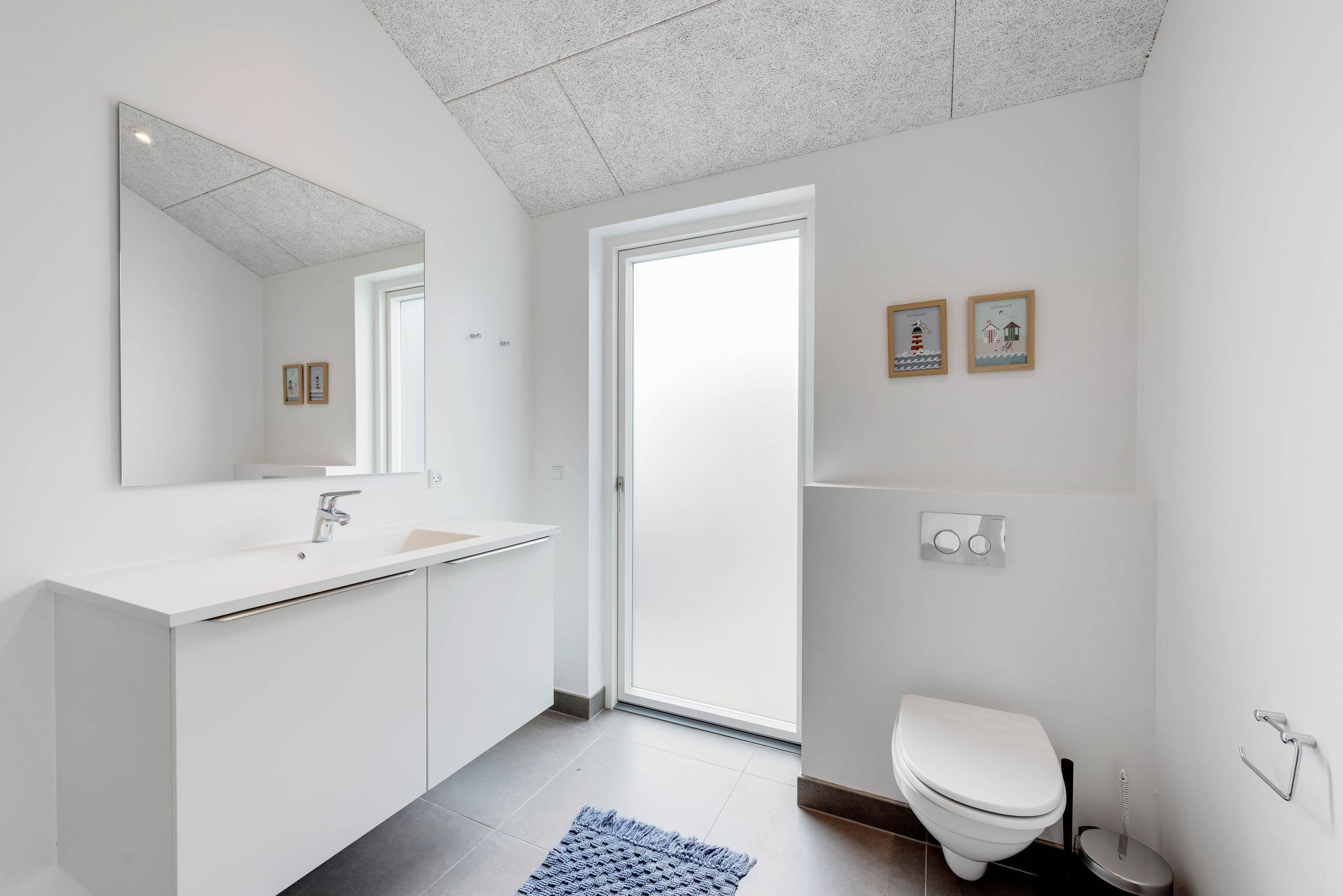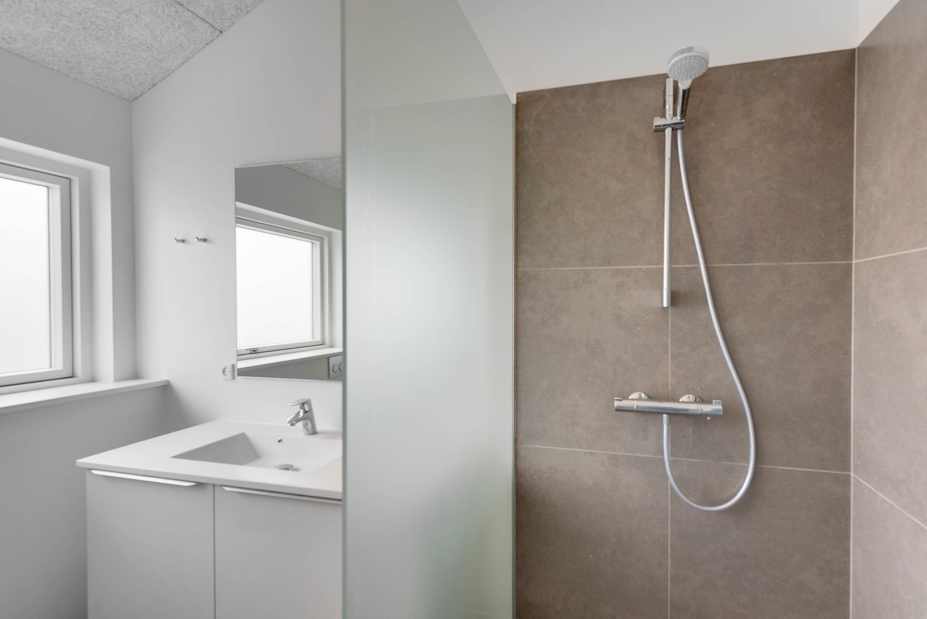 De 2 praktiske og flotte badeværelser byder på masser af velvære – og gør sommerhuset optimalt til flere familier, der gerne vil holde ferie sammen. Fra badeværelset mod vest er der udgang til den vestvendte terrasse, hvor I finder både en lækker udesauna og en udebruser (kan bruges fra april til november). Der kan I hurtigt lade jer afkøle – og være klar til en tur i saunaen igen.