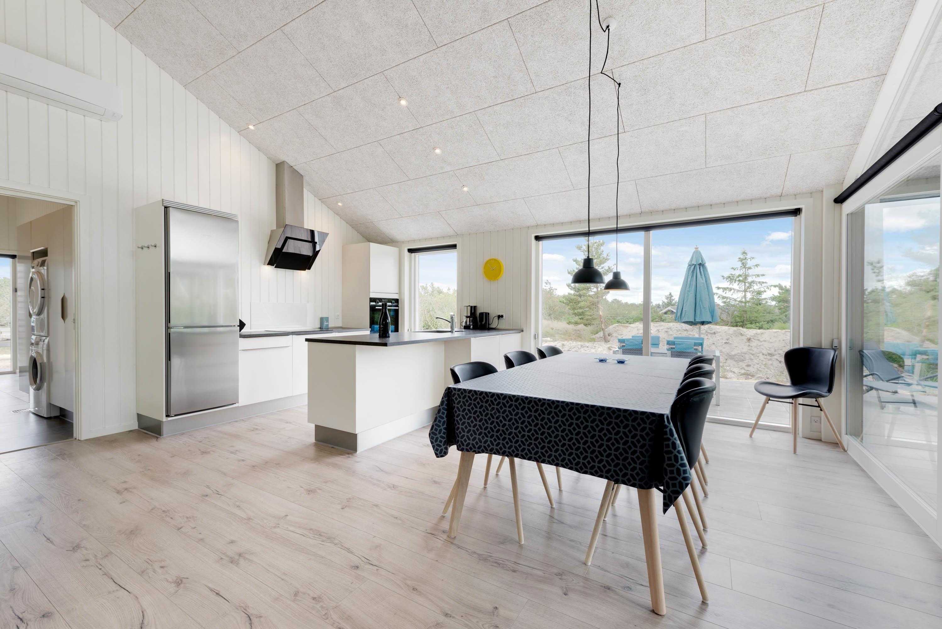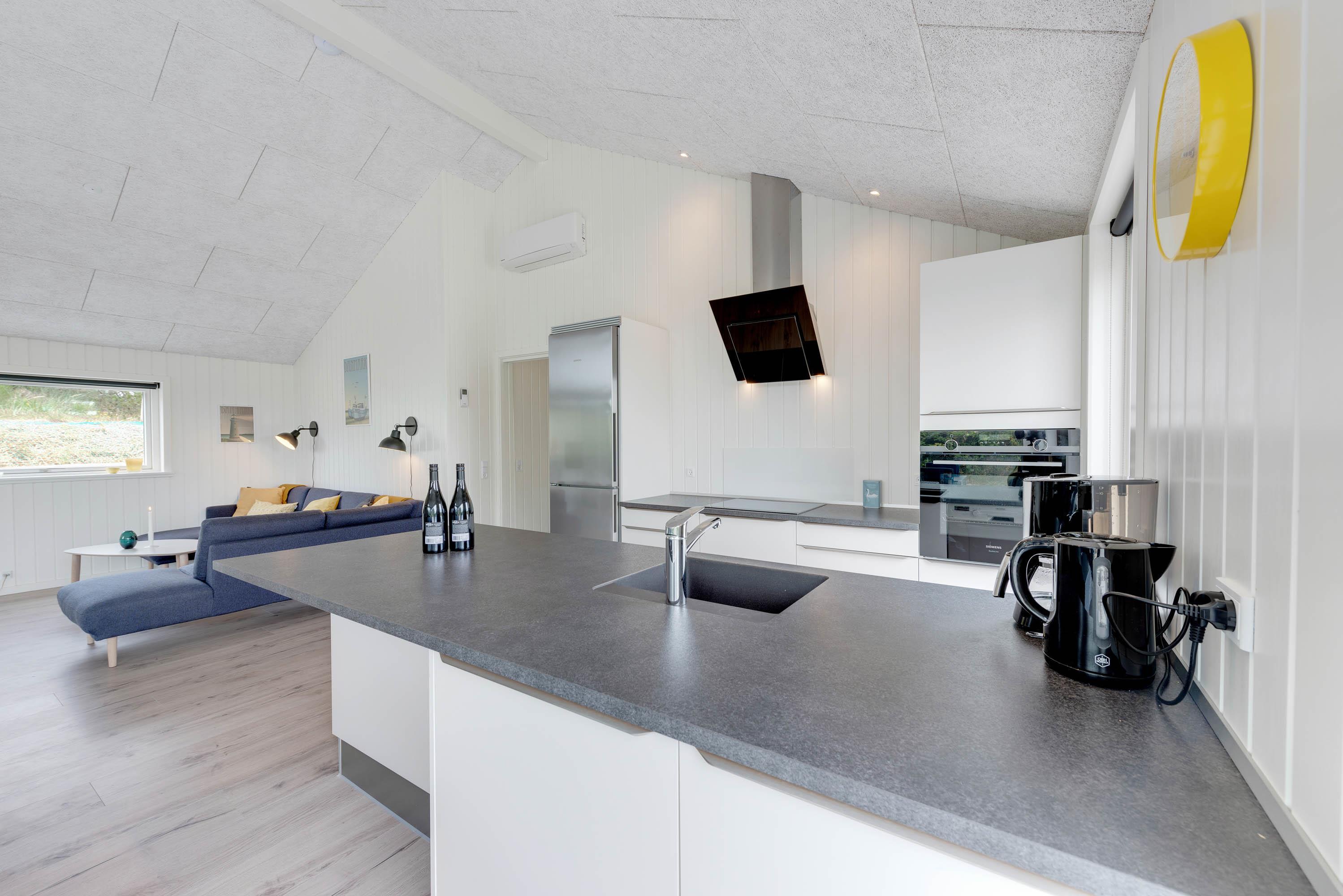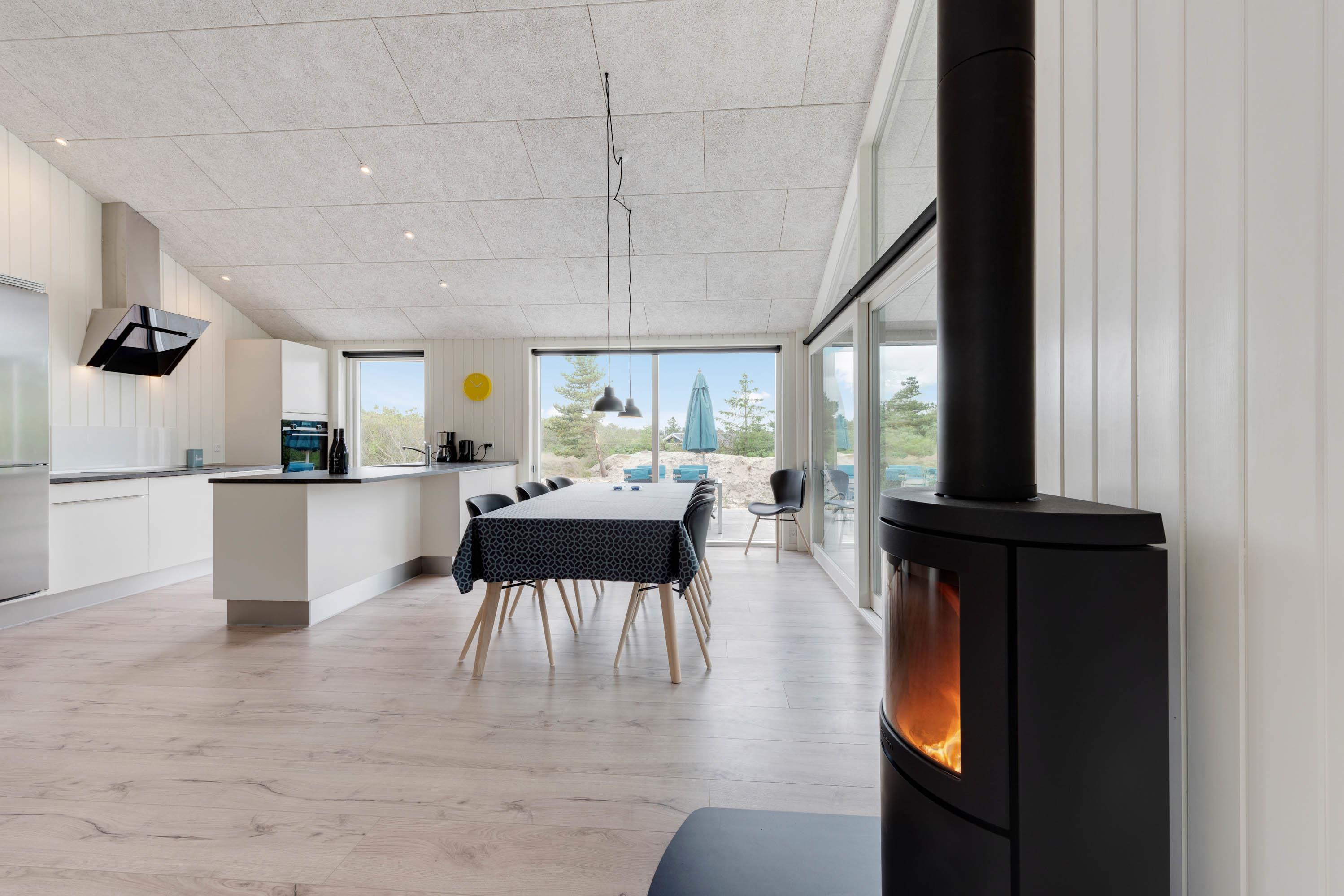 Feriehuset er opført i flotte kvalitetsmaterialer og er praktisk og flot indrettet. Det store opholdsrum med køkken- og spiseafdeling er sommerhusets hjerte og naturlige samlingspunkt. Køkkenafdelingen er flot og velindrettet med bl.a. opvaskemaskine, og herfra har I et godt overblik over rummet og ud over området igennem de store sydvendte panoramavinduer.