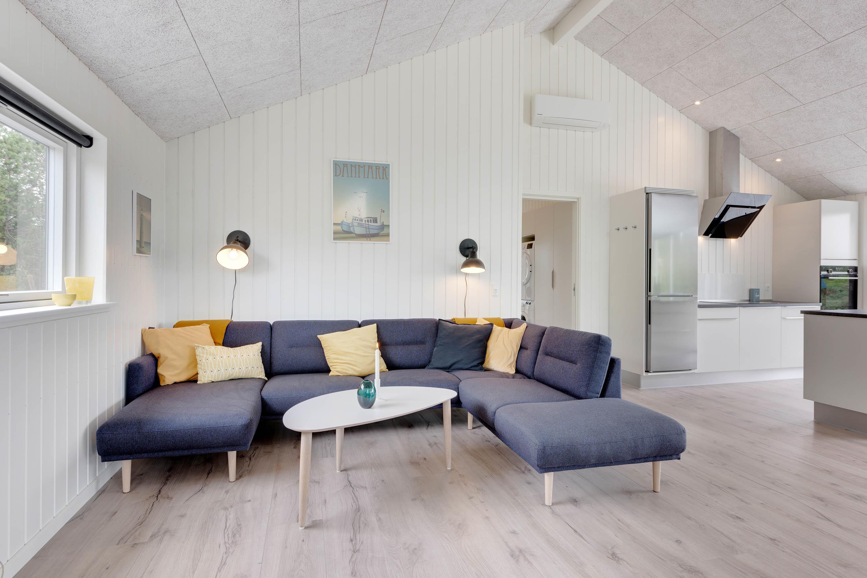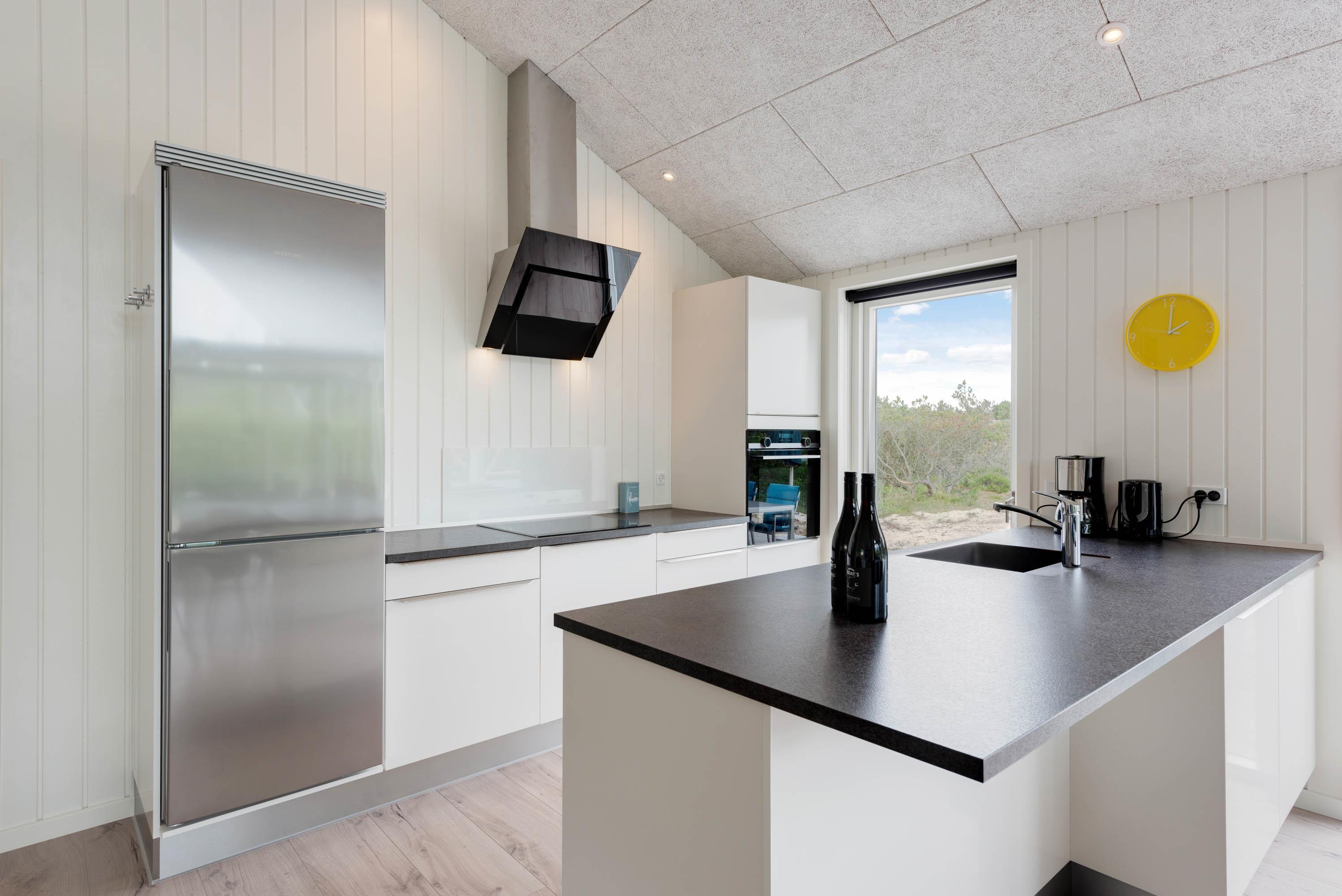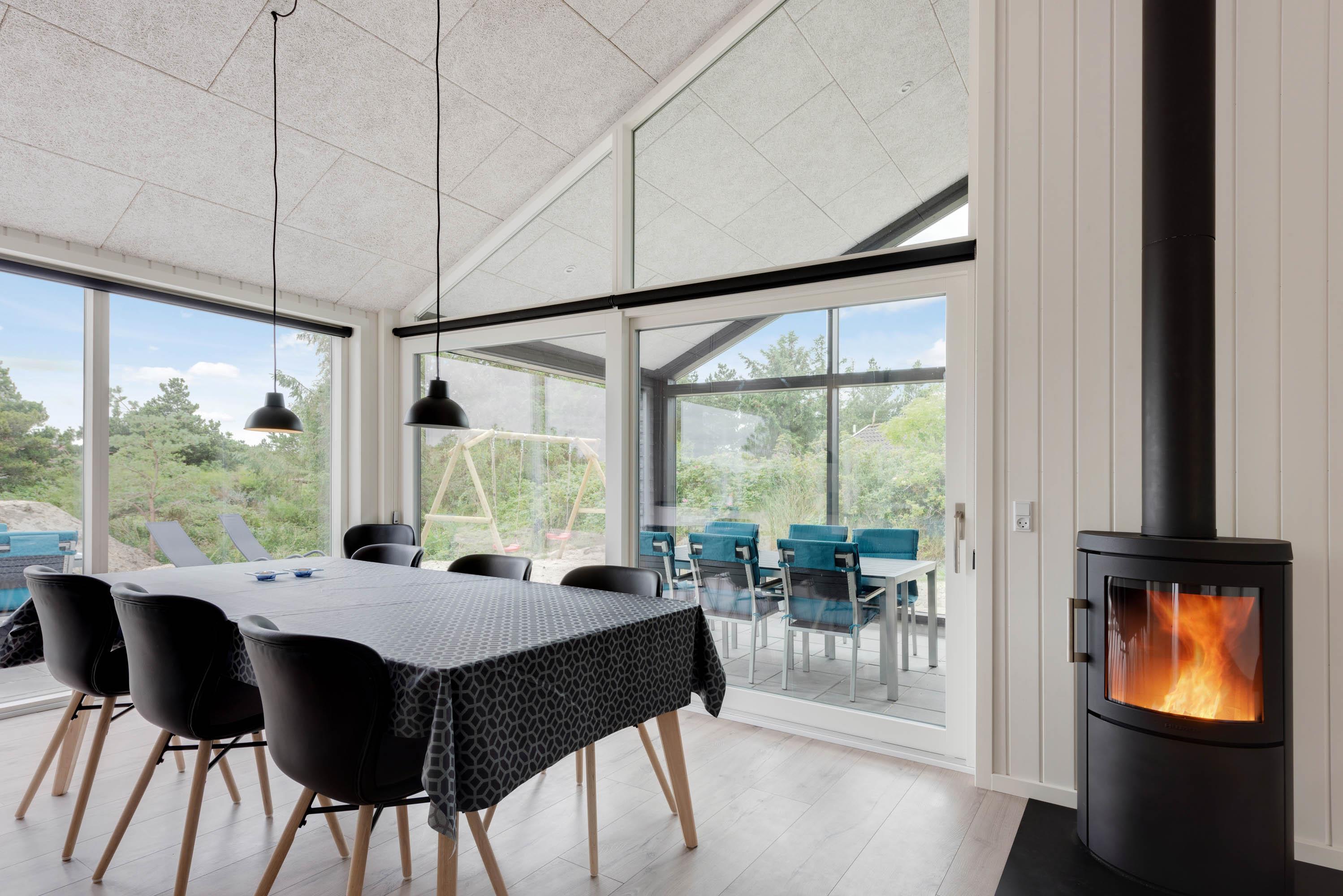 Feriehuset er opført i flotte kvalitetsmaterialer og er praktisk og flot indrettet. Det store opholdsrum med køkken- og spiseafdeling er sommerhusets hjerte og naturlige samlingspunkt. Køkkenafdelingen er flot og velindrettet med bl.a. opvaskemaskine, og herfra har I et godt overblik over rummet og ud over området igennem de store sydvendte panoramavinduer.