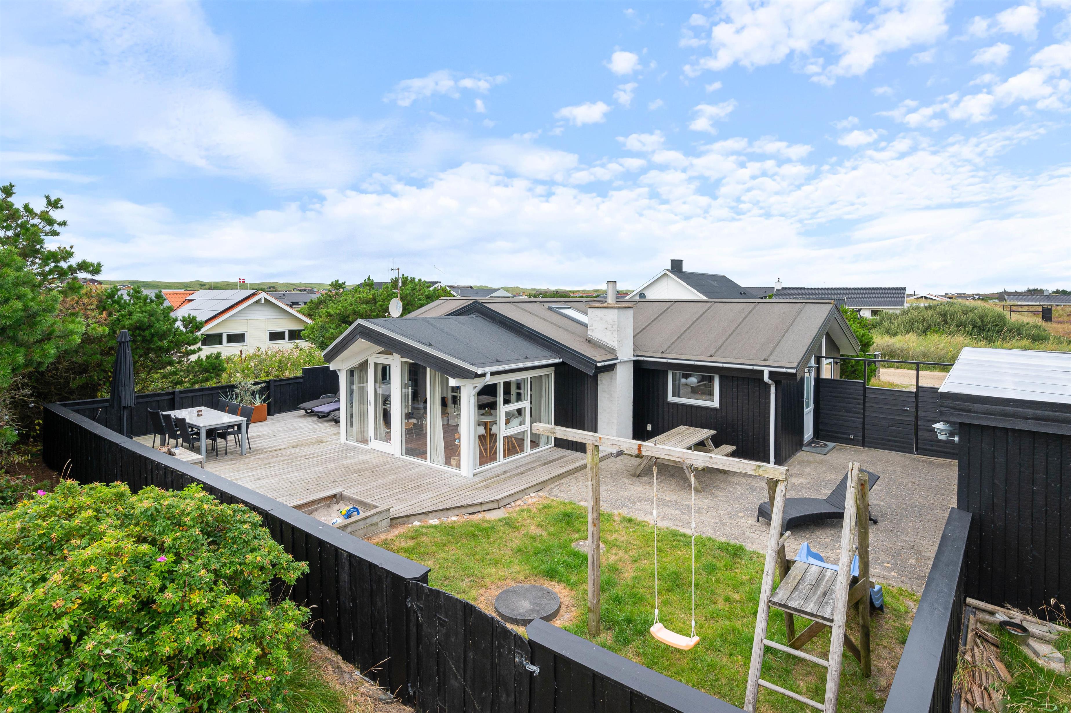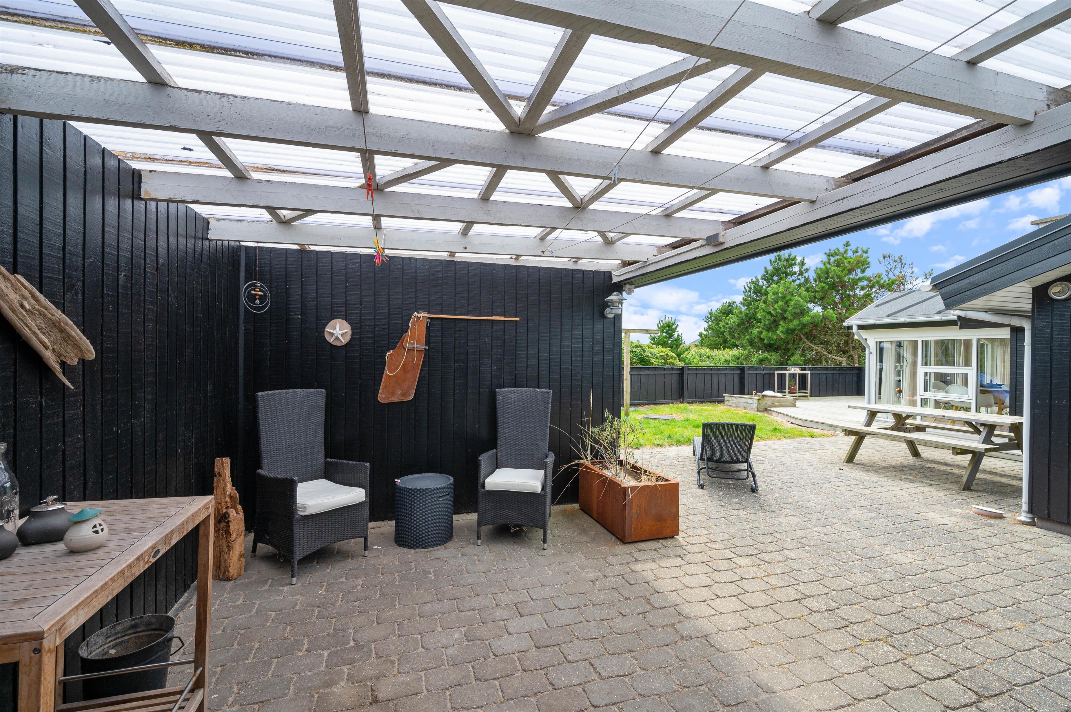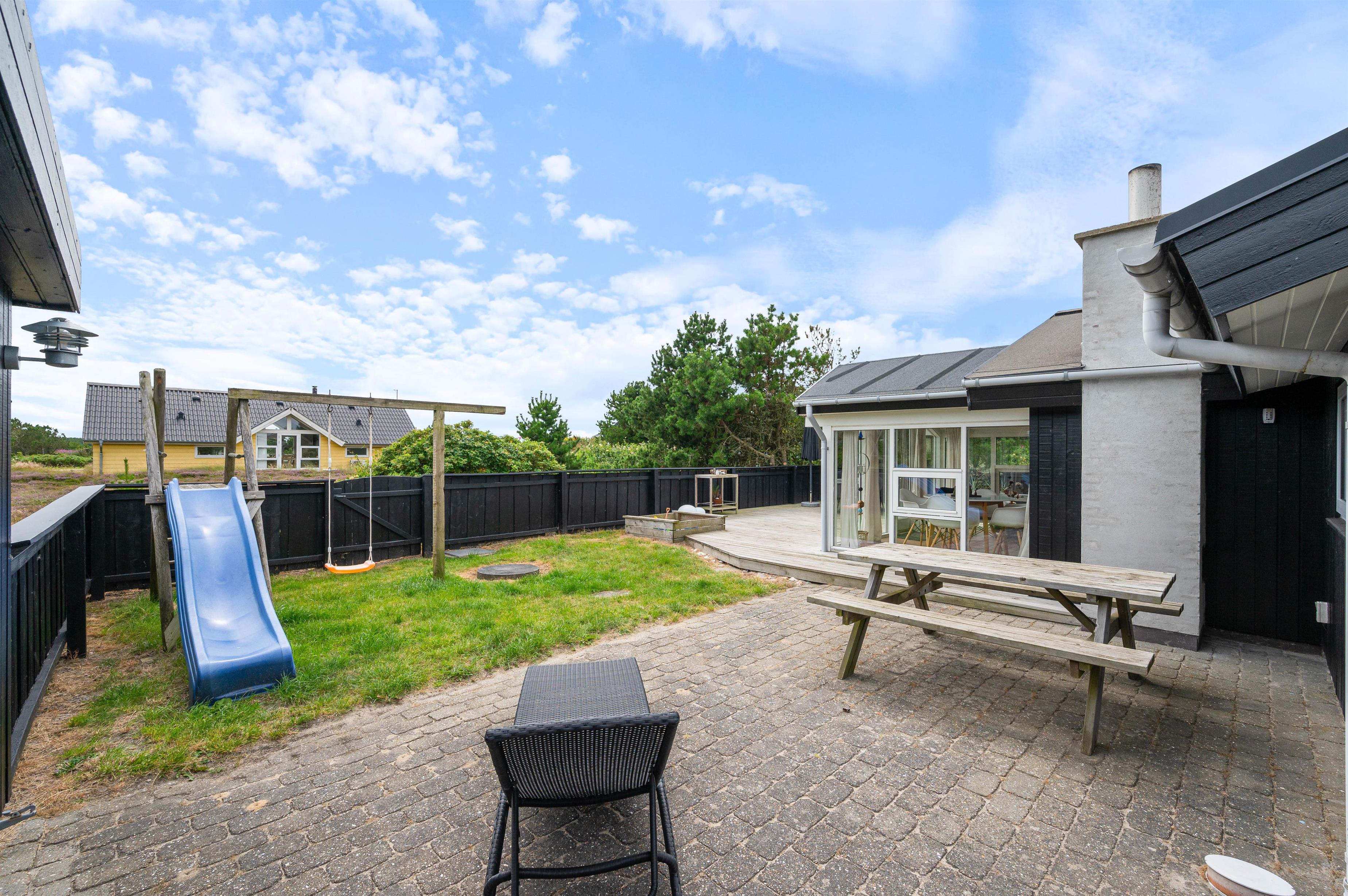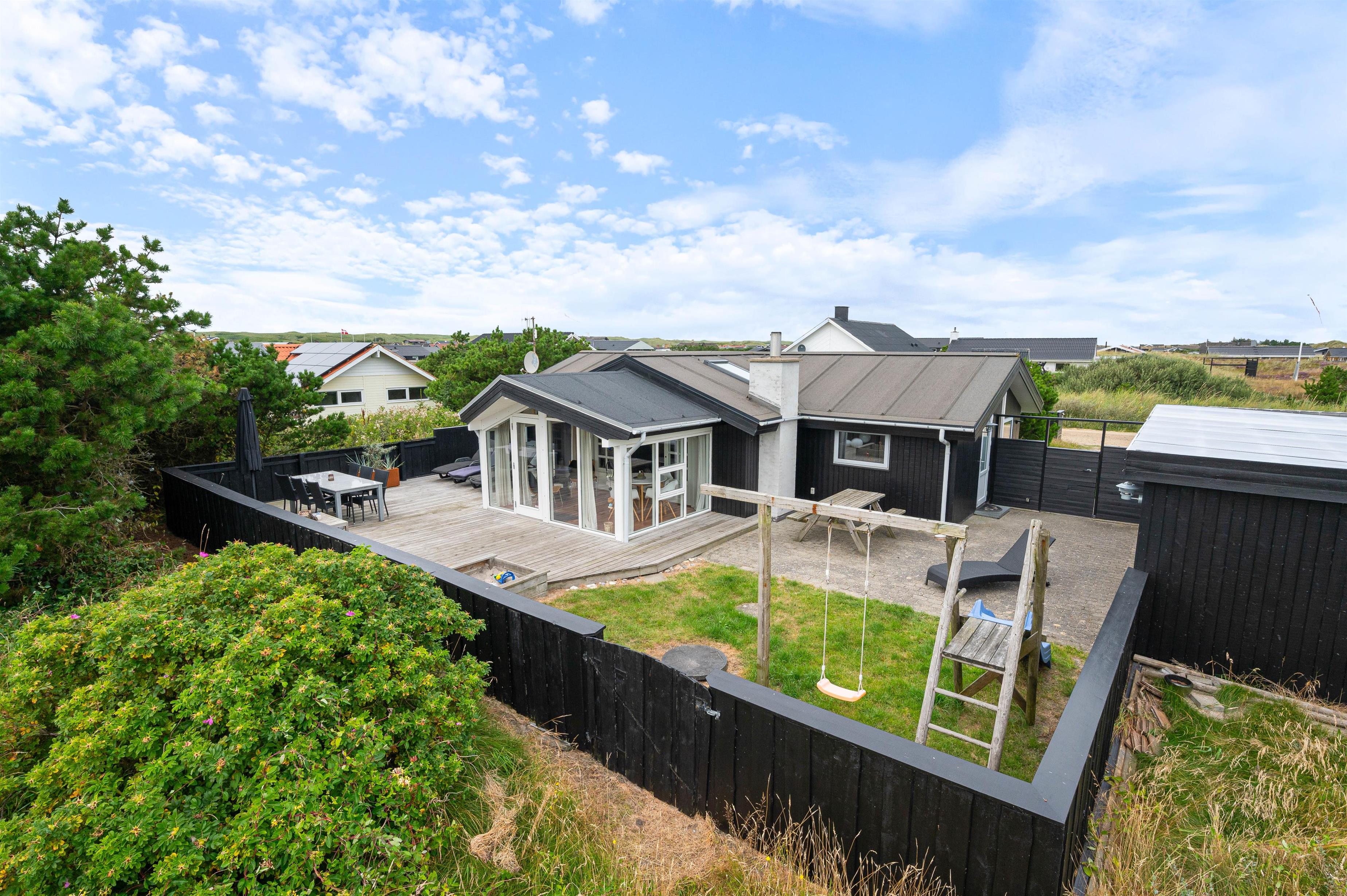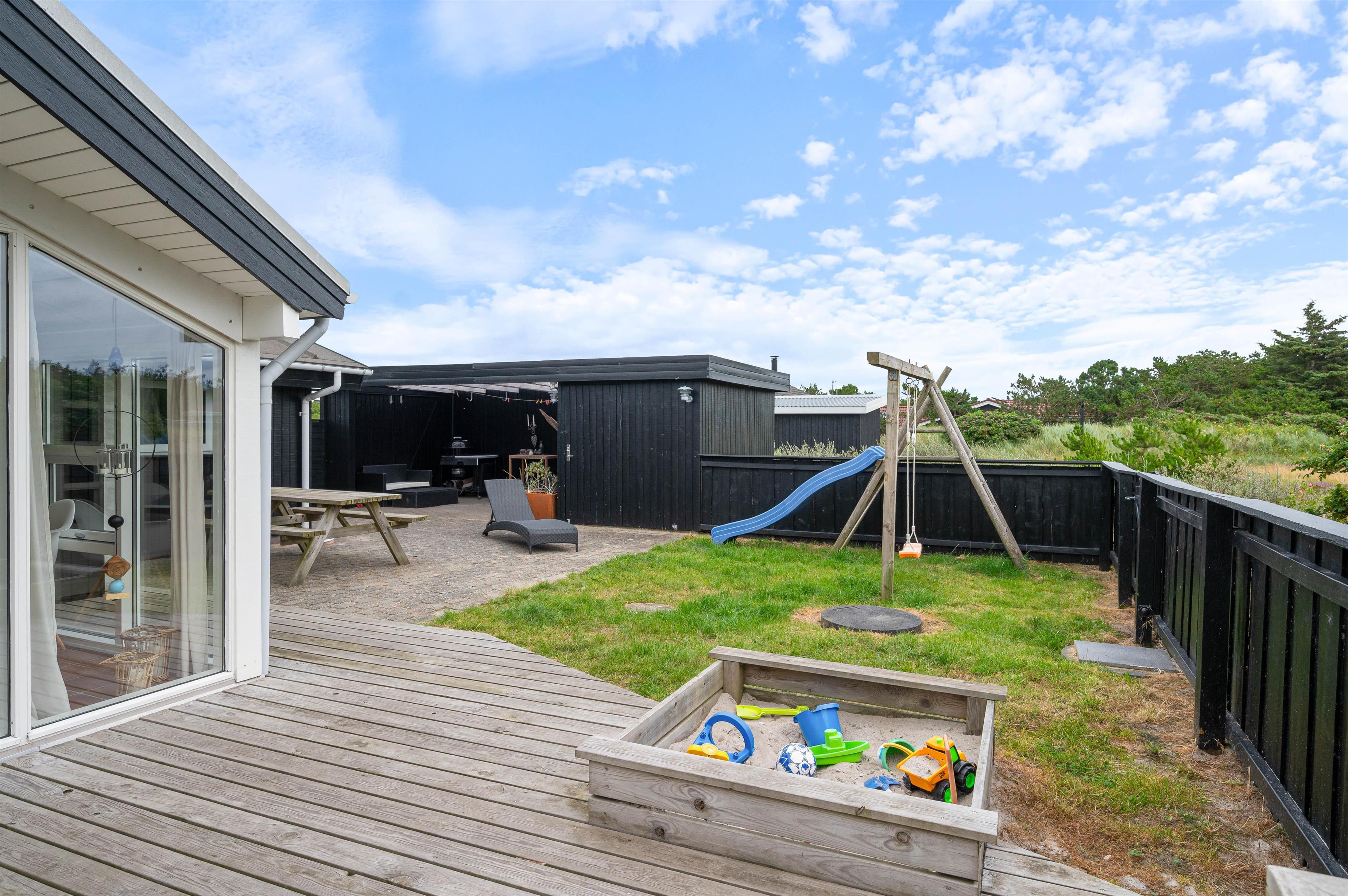 Rauhesvej 21 ligger på den dejlig stor naturgrund, kun 500 m fra Vesterhavet og den kilometerlange sandstrand. Området omkring sommerhuset er helt lukket, og skaber et hyggeligt gårdhavemiljø, hvor du trygt kan lade børn eller hund opholde sig. Et stykke af terrassen er overdækket, så du behøver ikke at holde dig inde på grund af lidt støvregn eller blæst. På terrassen finder du naturligvis også havemøbler, solvogne og en grill, så I kan udnytte den i både dag- og aftentimerne. Til de mindste er der en fin, integreret sandkasse, og udenfor afskærmningen et klatre/gyngestativ.