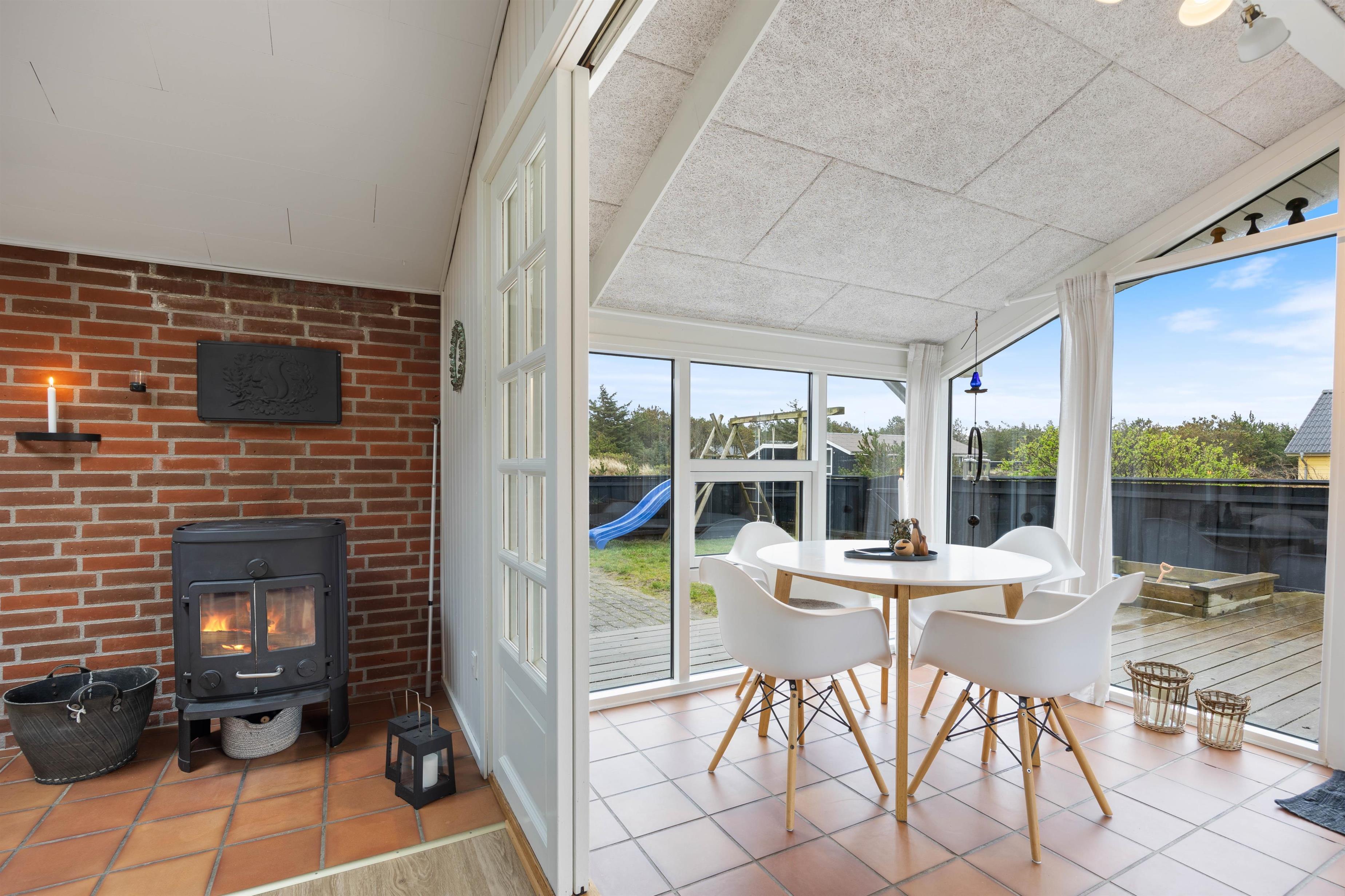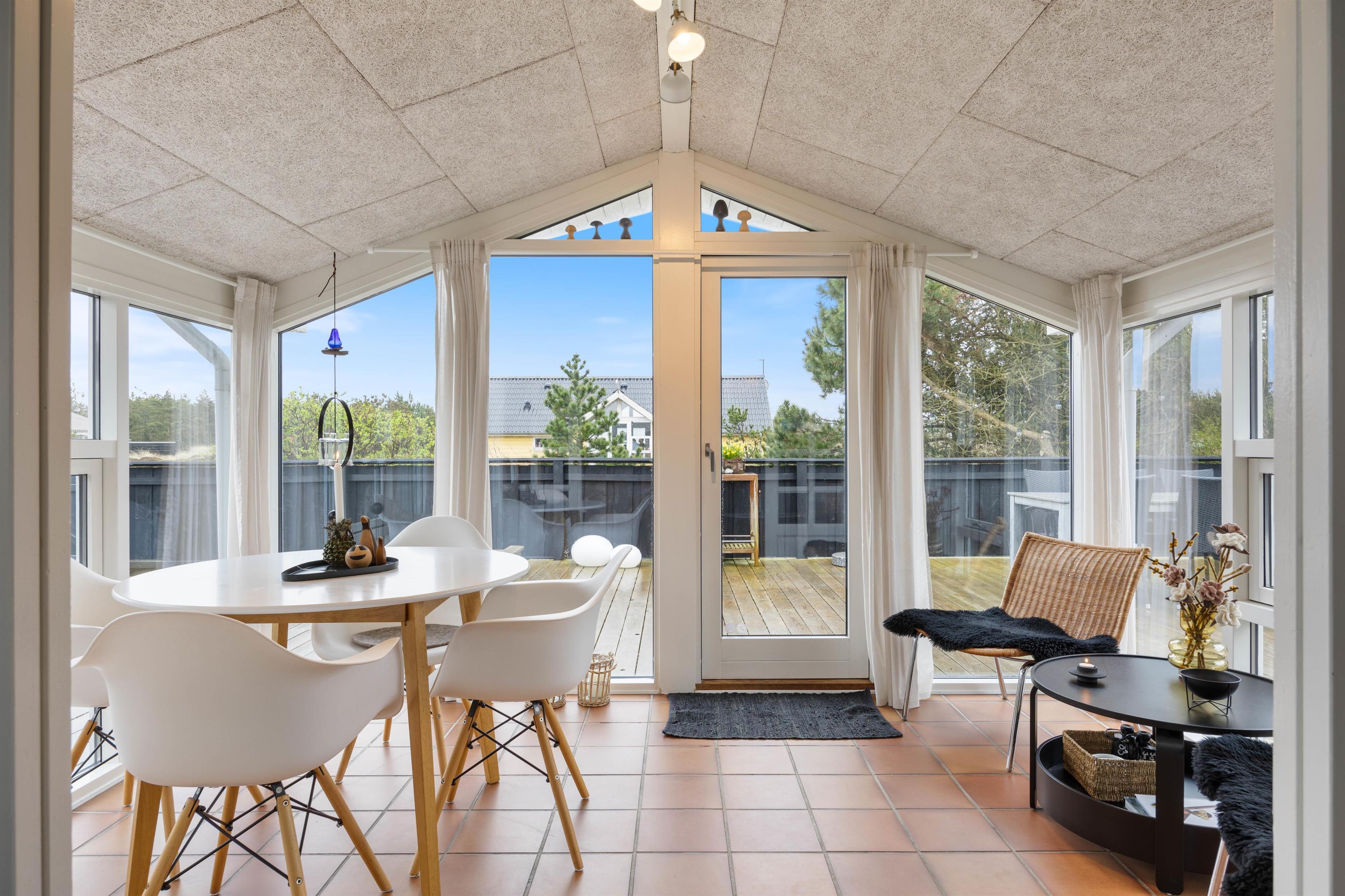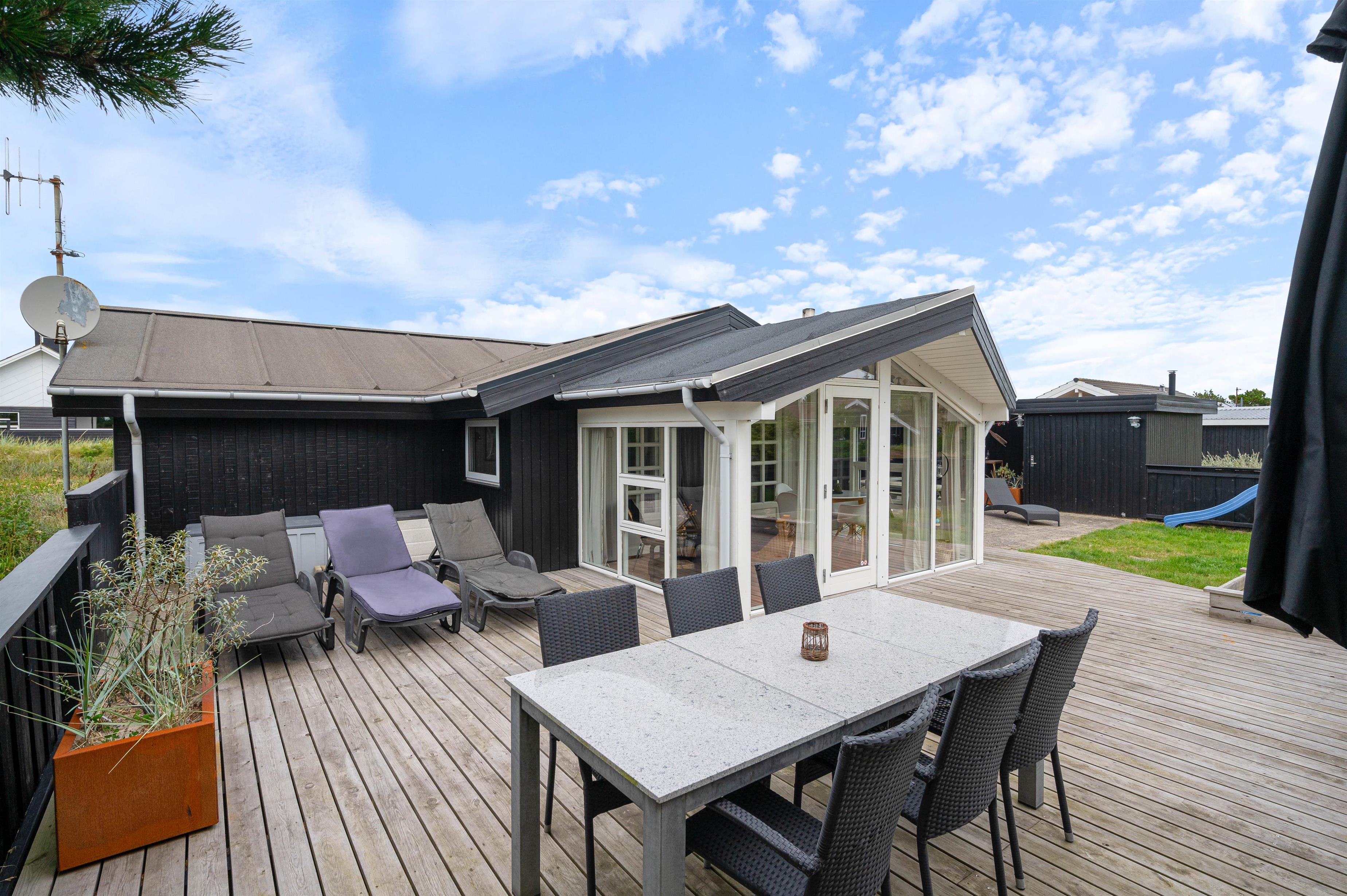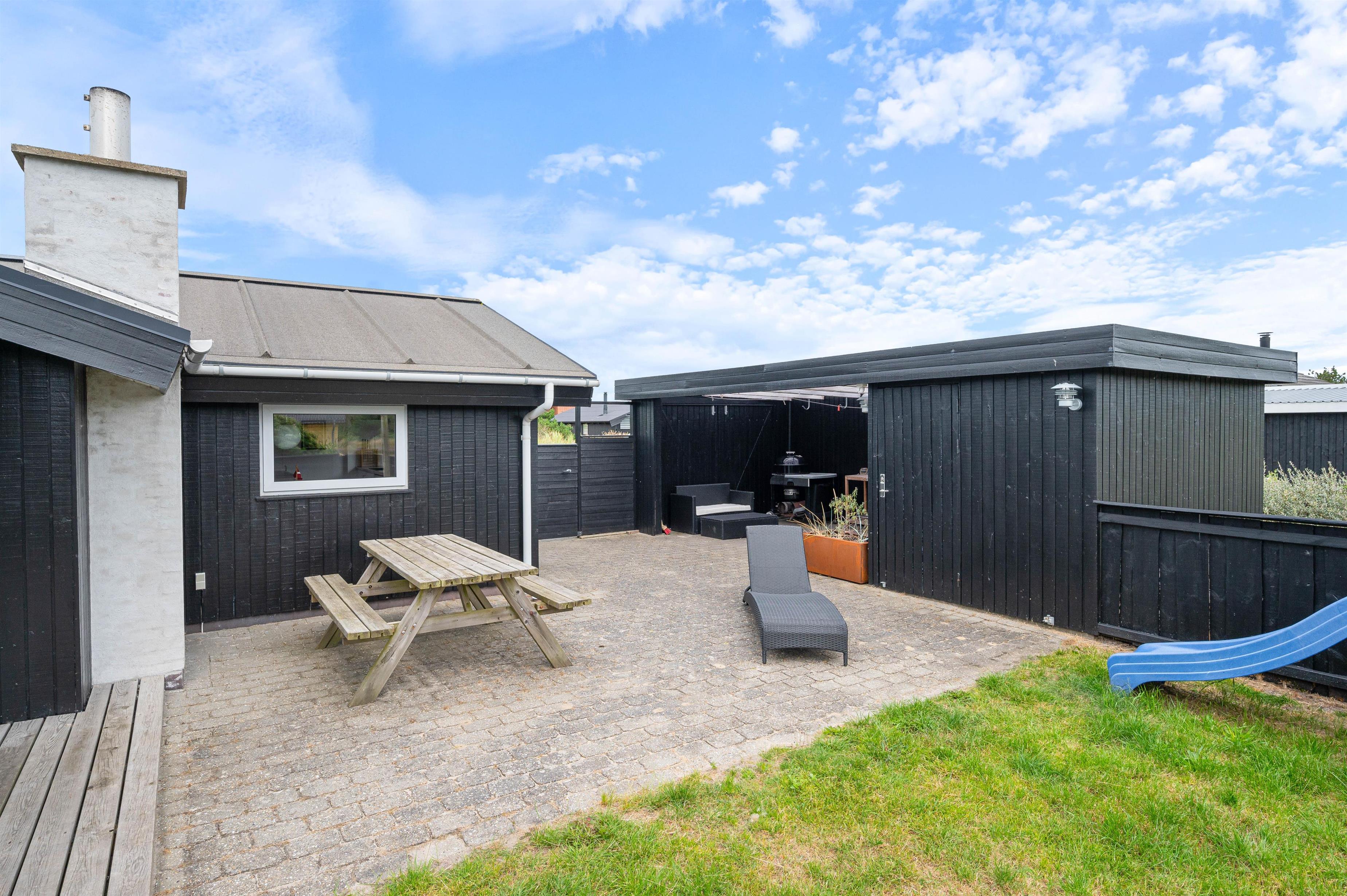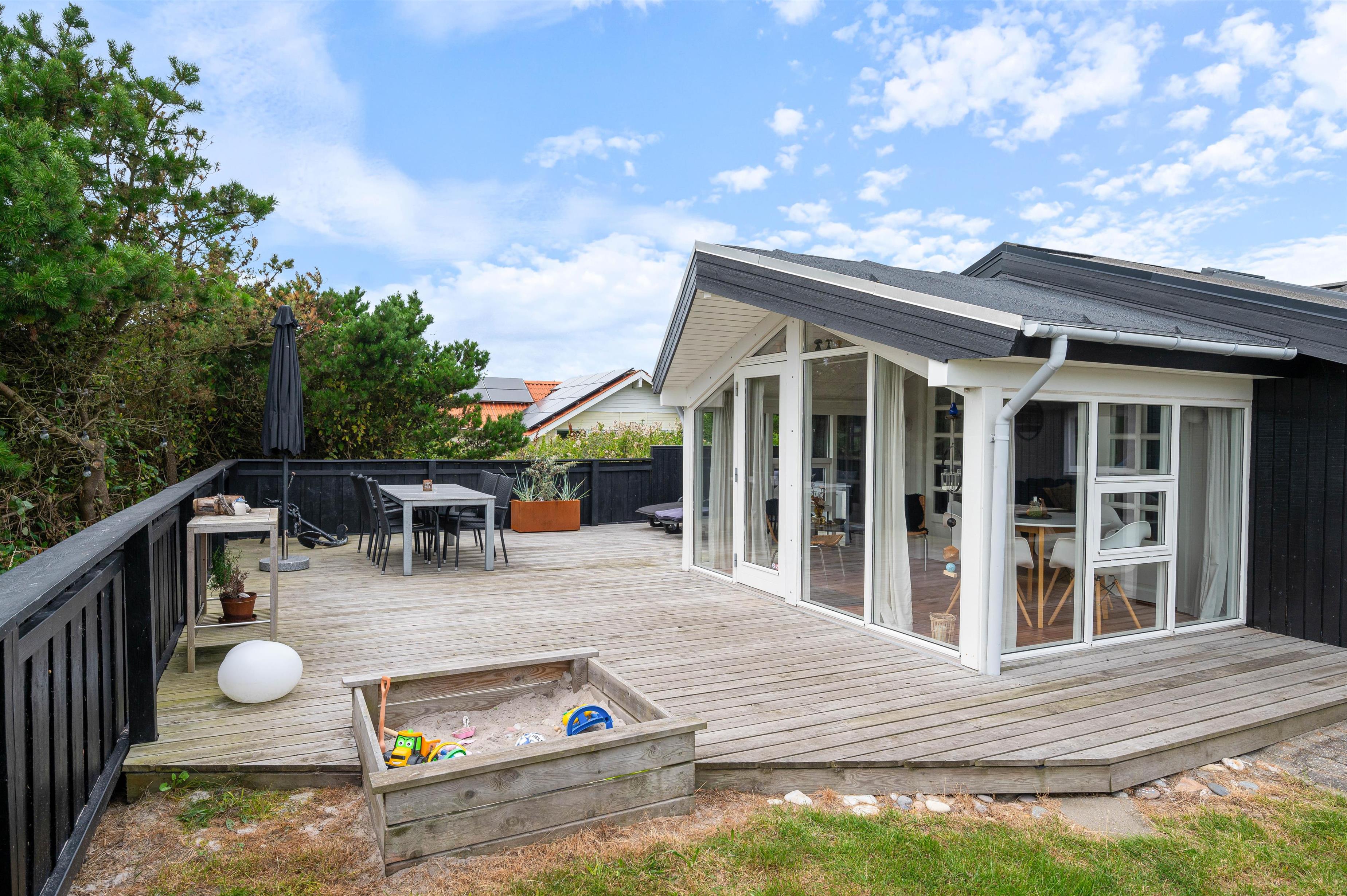 Rauhesvej 21 ligger på den dejlig stor naturgrund, kun 500 m fra Vesterhavet og den kilometerlange sandstrand. Området omkring sommerhuset er helt lukket, og skaber et hyggeligt gårdhavemiljø, hvor du trygt kan lade børn eller hund opholde sig. Et stykke af terrassen er overdækket, så du behøver ikke at holde dig inde på grund af lidt støvregn eller blæst. På terrassen finder du naturligvis også havemøbler, solvogne og en grill, så I kan udnytte den i både dag- og aftentimerne. Til de mindste er der en fin, integreret sandkasse, og udenfor afskærmningen et klatre/gyngestativ.