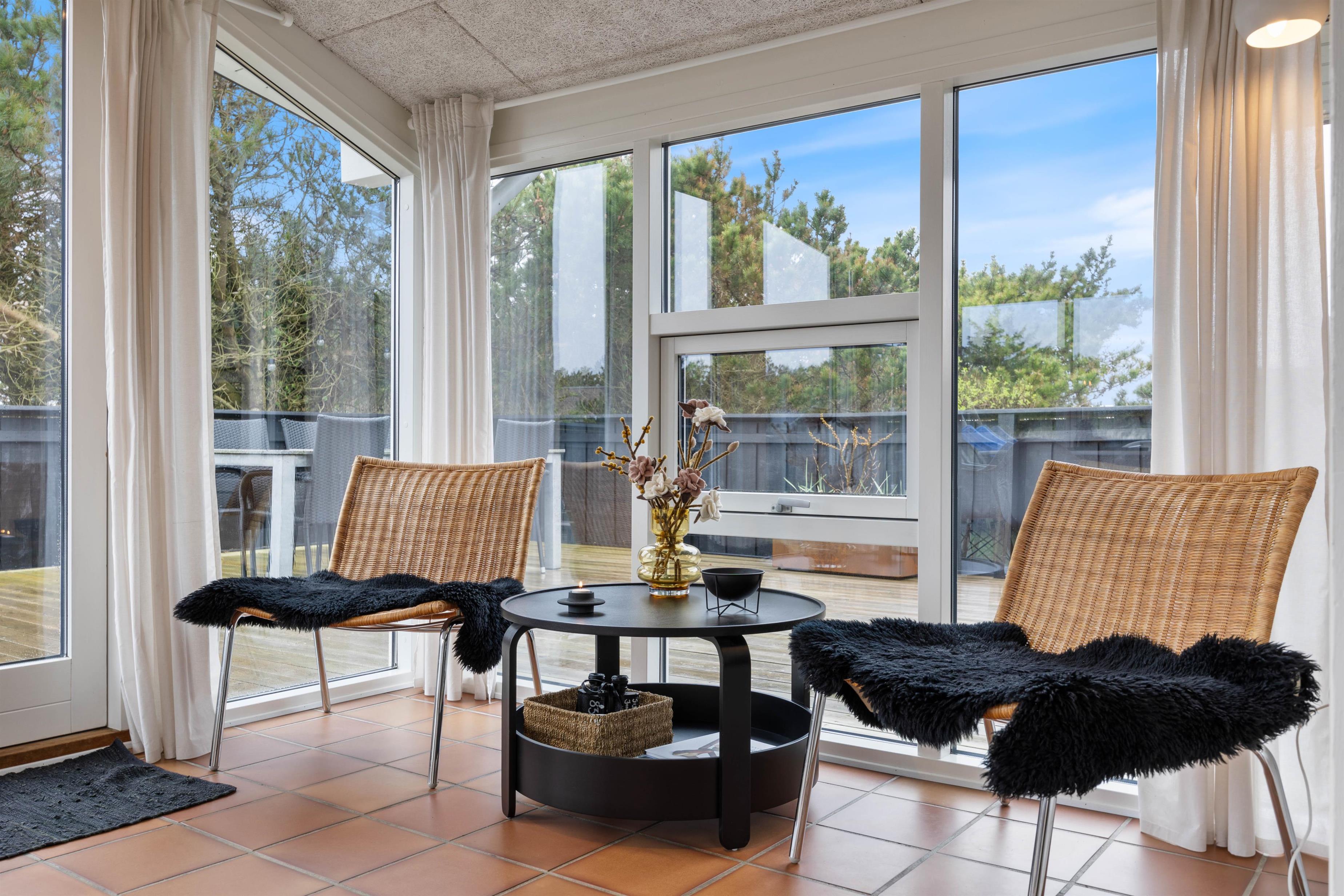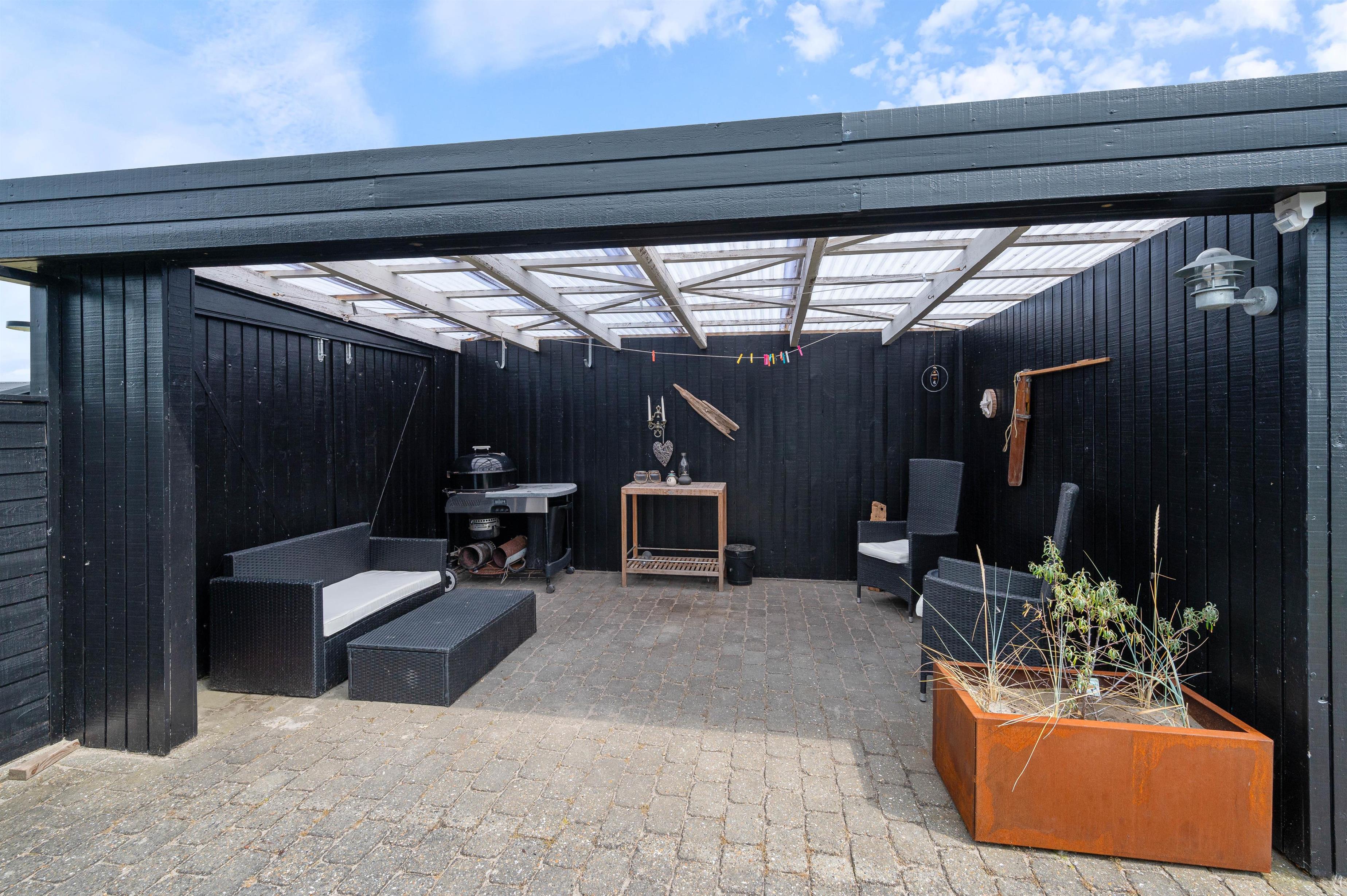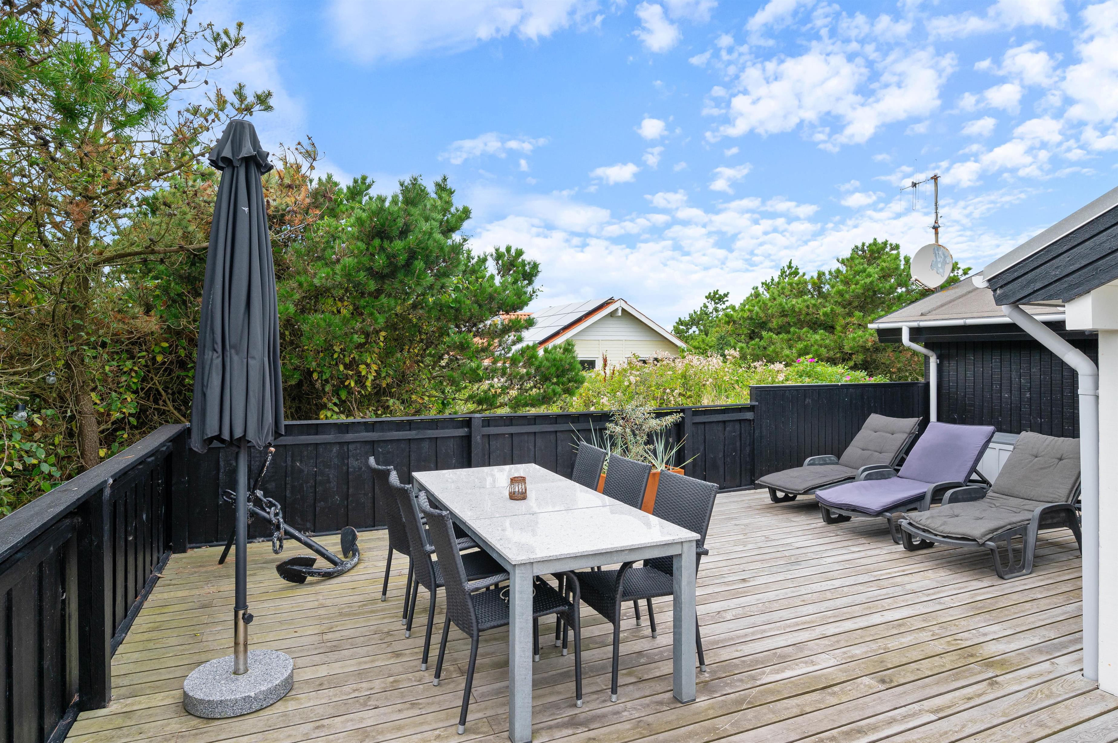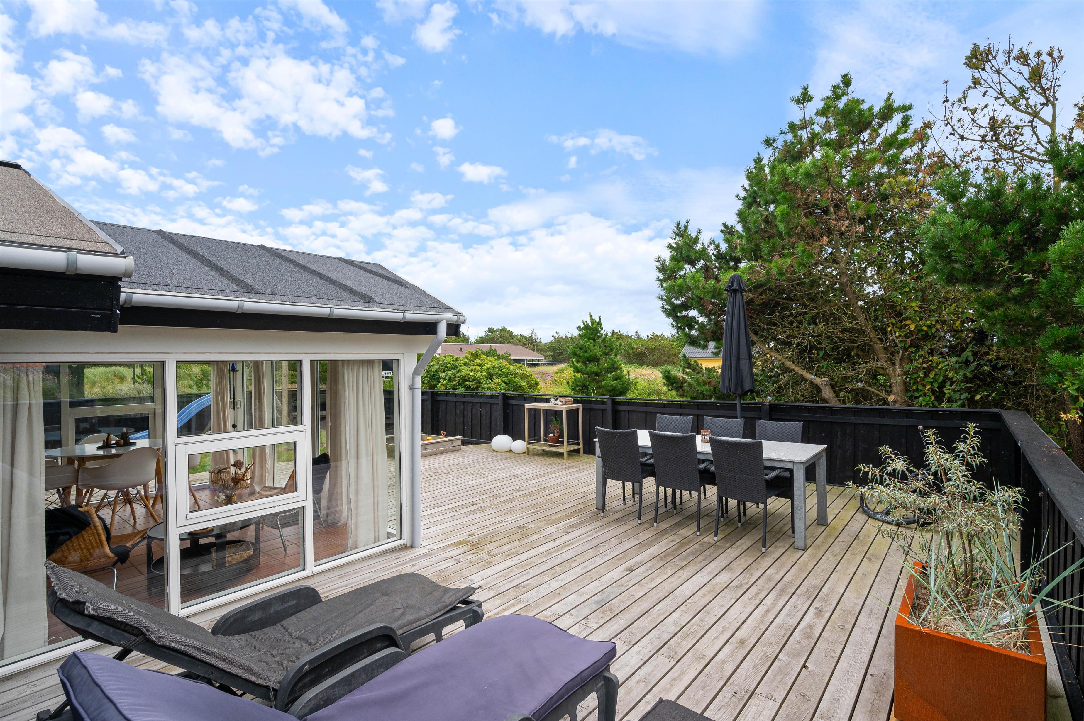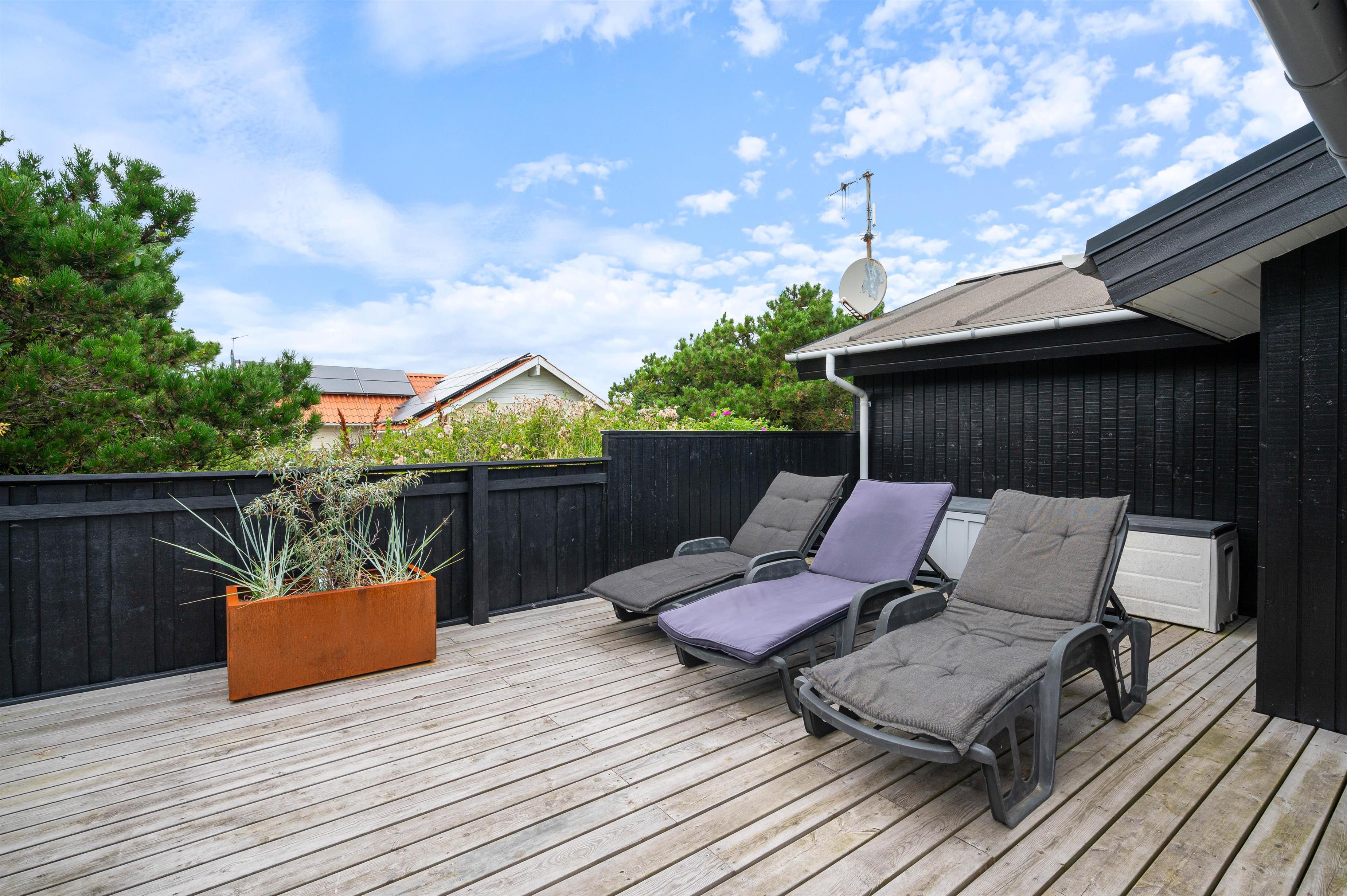Rauhesvej 21 ligger på den dejlig stor naturgrund, kun 500 m fra Vesterhavet og den kilometerlange sandstrand. Området omkring sommerhuset er helt lukket, og skaber et hyggeligt gårdhavemiljø, hvor du trygt kan lade børn eller hund opholde sig. Et stykke af terrassen er overdækket, så du behøver ikke at holde dig inde på grund af lidt støvregn eller blæst. På terrassen finder du naturligvis også havemøbler, solvogne og en grill, så I kan udnytte den i både dag- og aftentimerne. Til de mindste er der en fin, integreret sandkasse, og udenfor afskærmningen et klatre/gyngestativ.