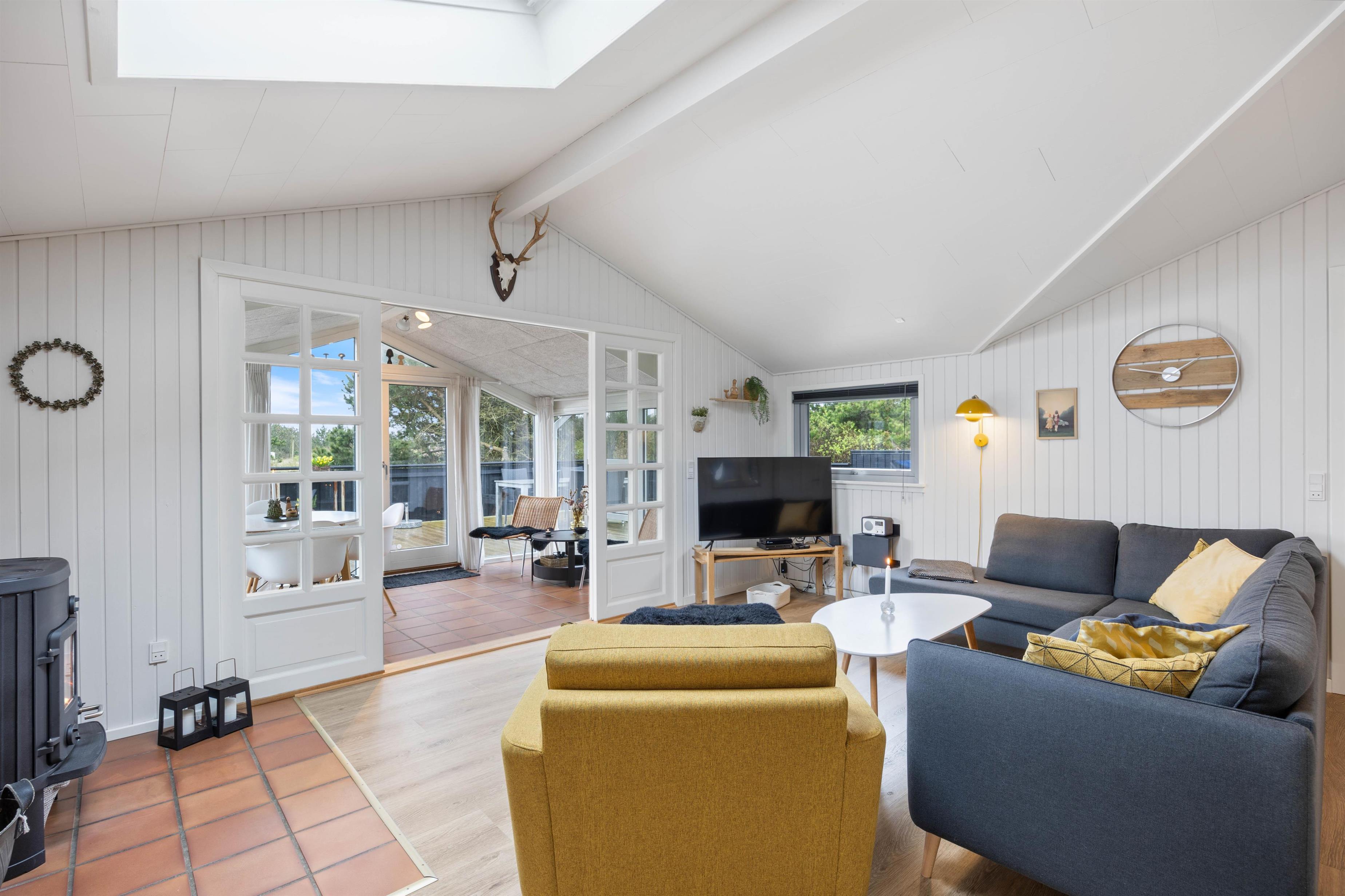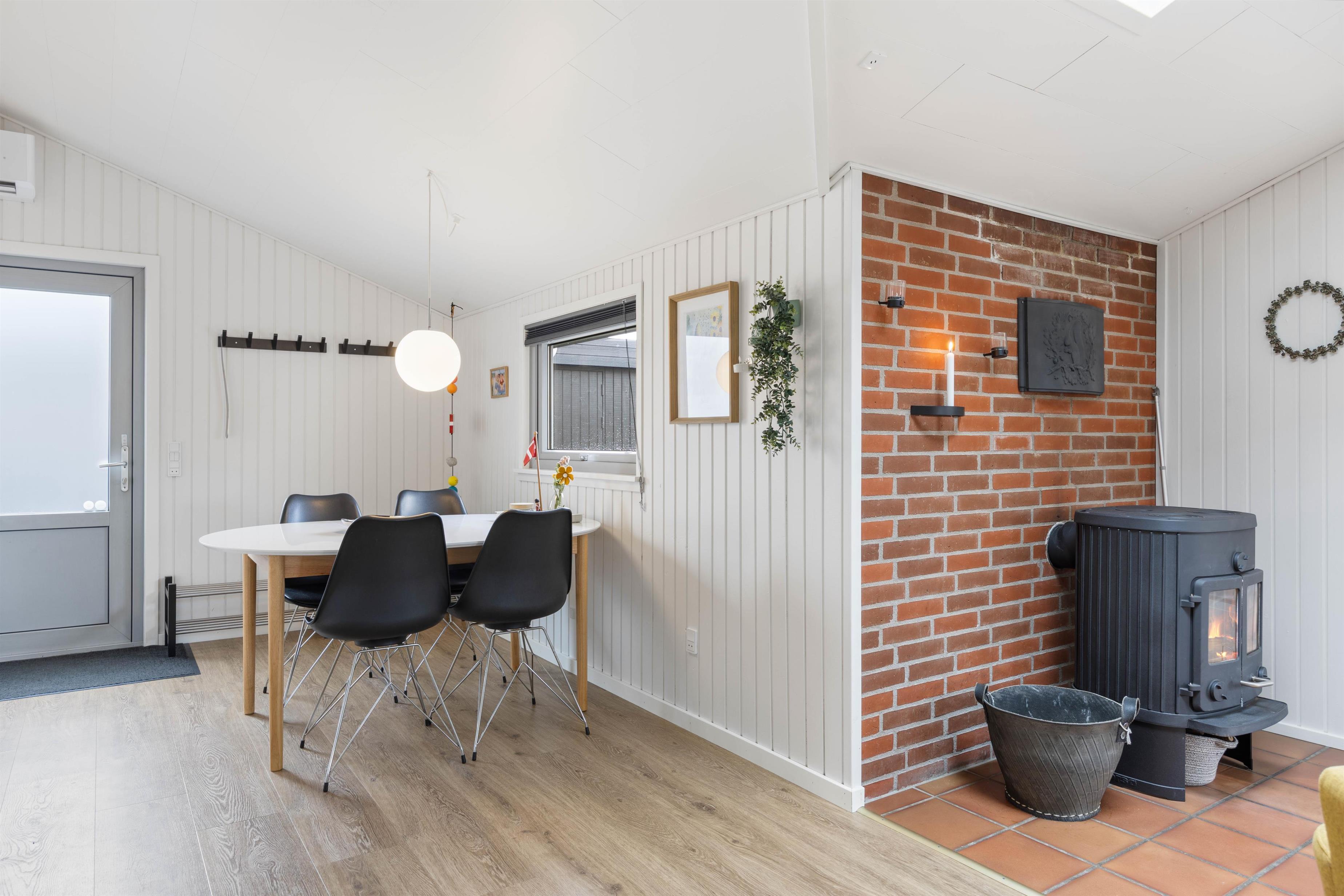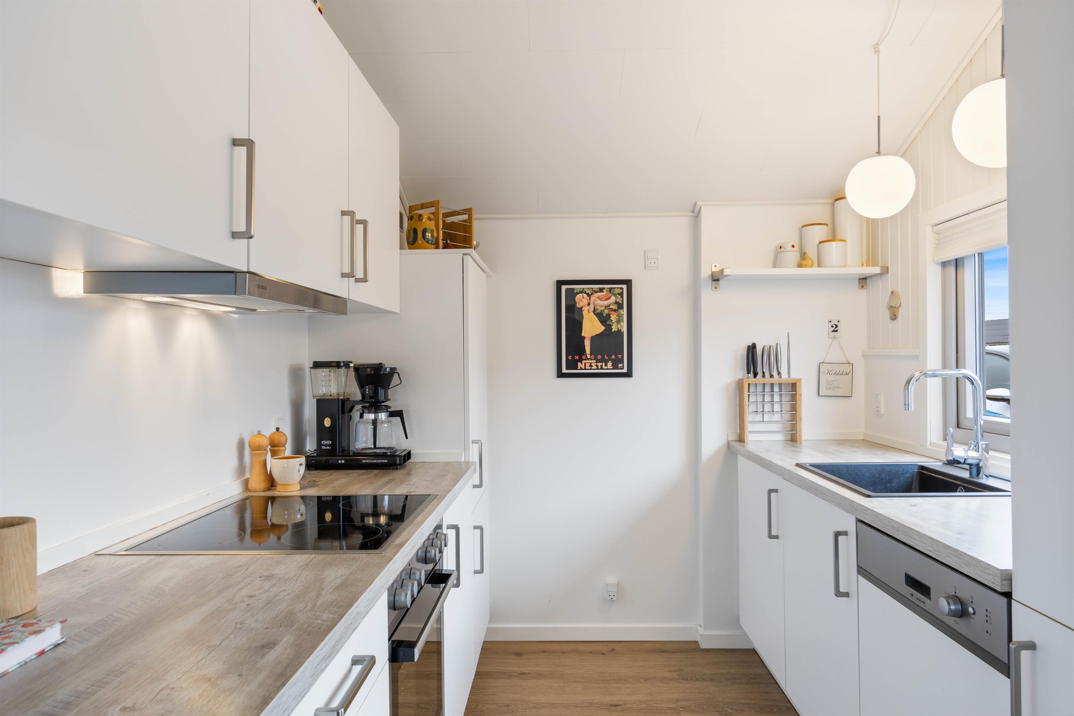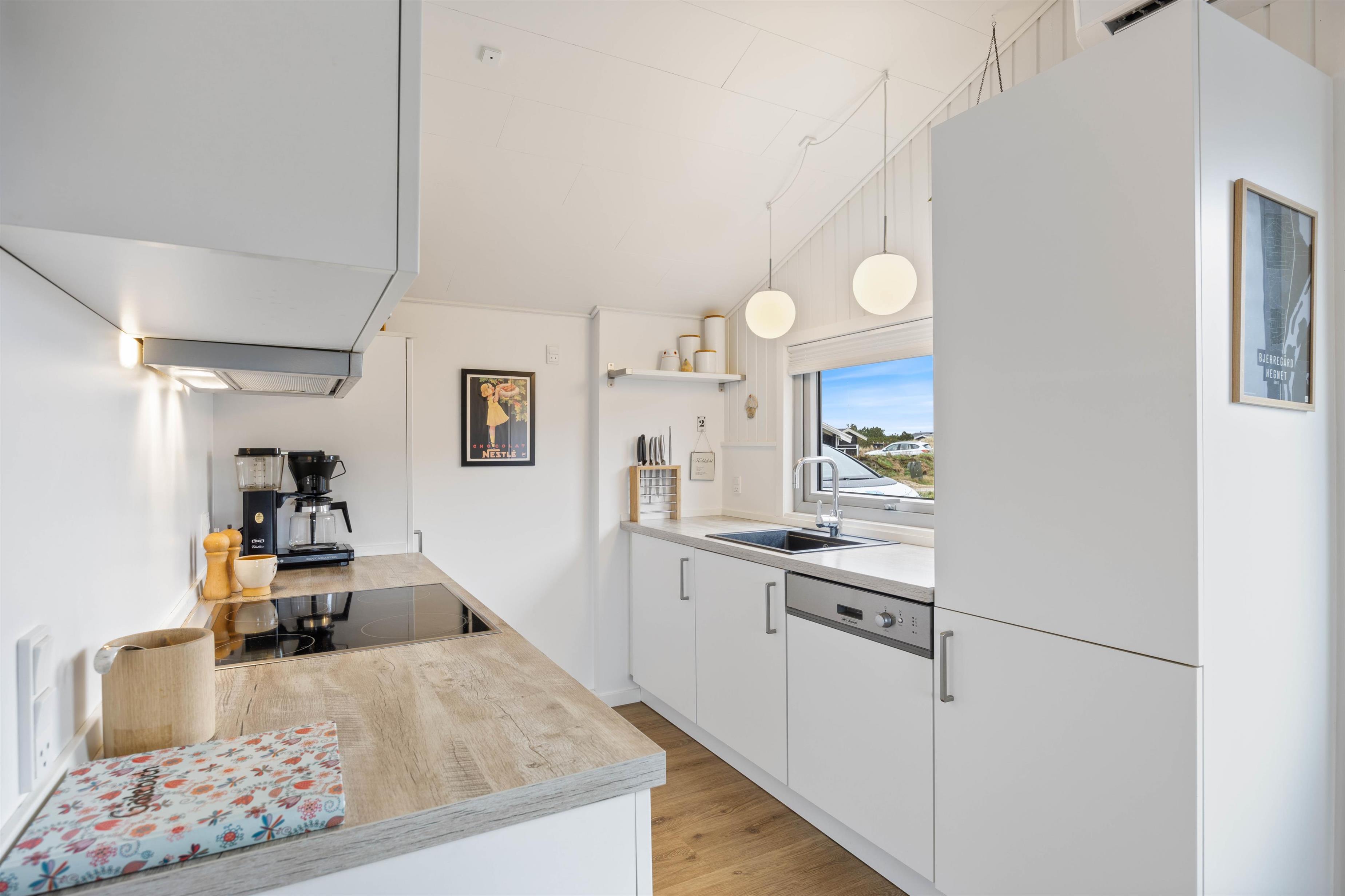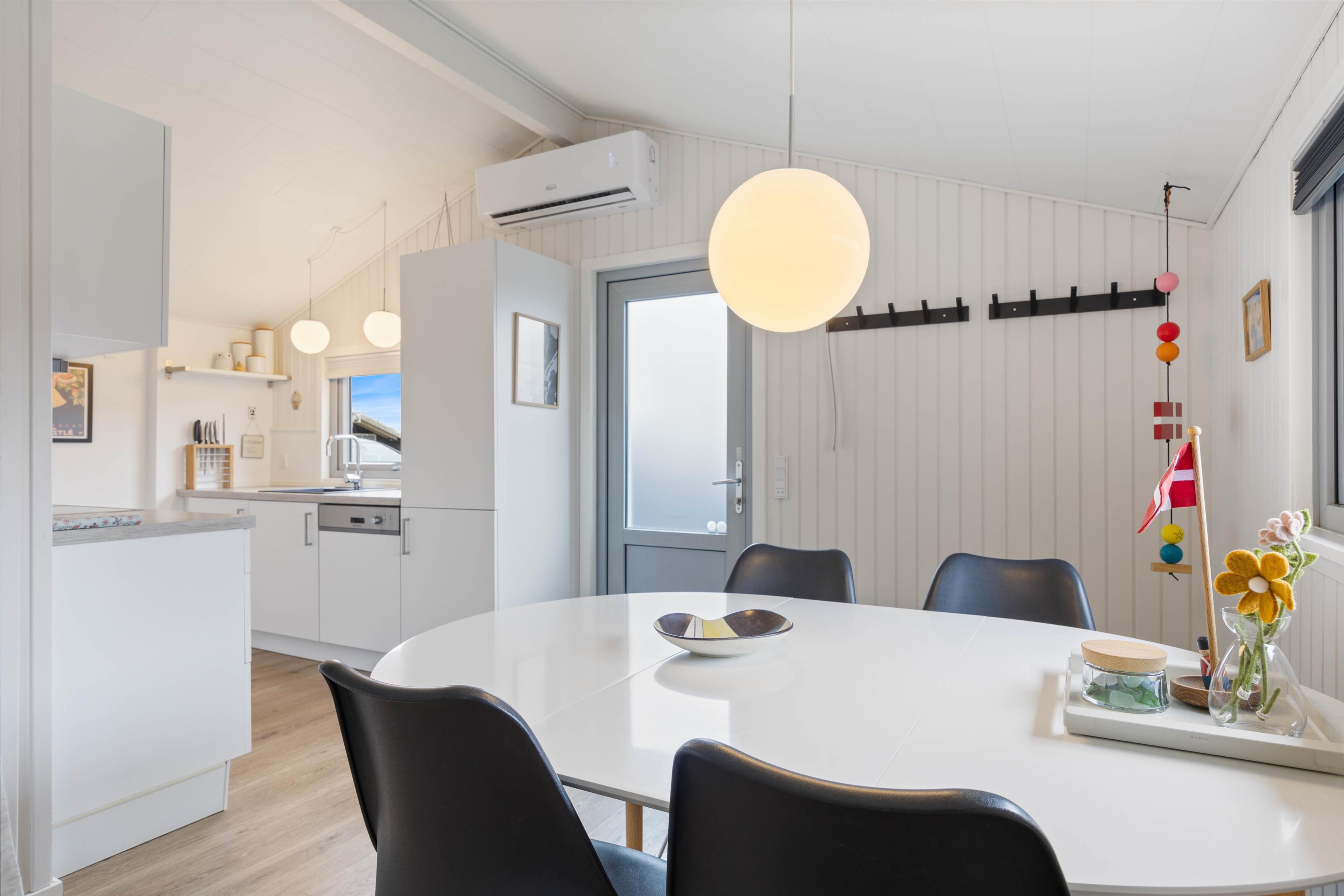 Det praktisk indrettede køkken er åbent ind til stuen, så du kan være i dialog med sofagruppen, hvis nogle slapper af eller ser TV der imens. Brændeovnen i hjørnet spreder varme og hygge til både køkken, stue og udestue. Den lyse og let maritime indretning giver en dejlig feriestemning og forbinder rummene fint.