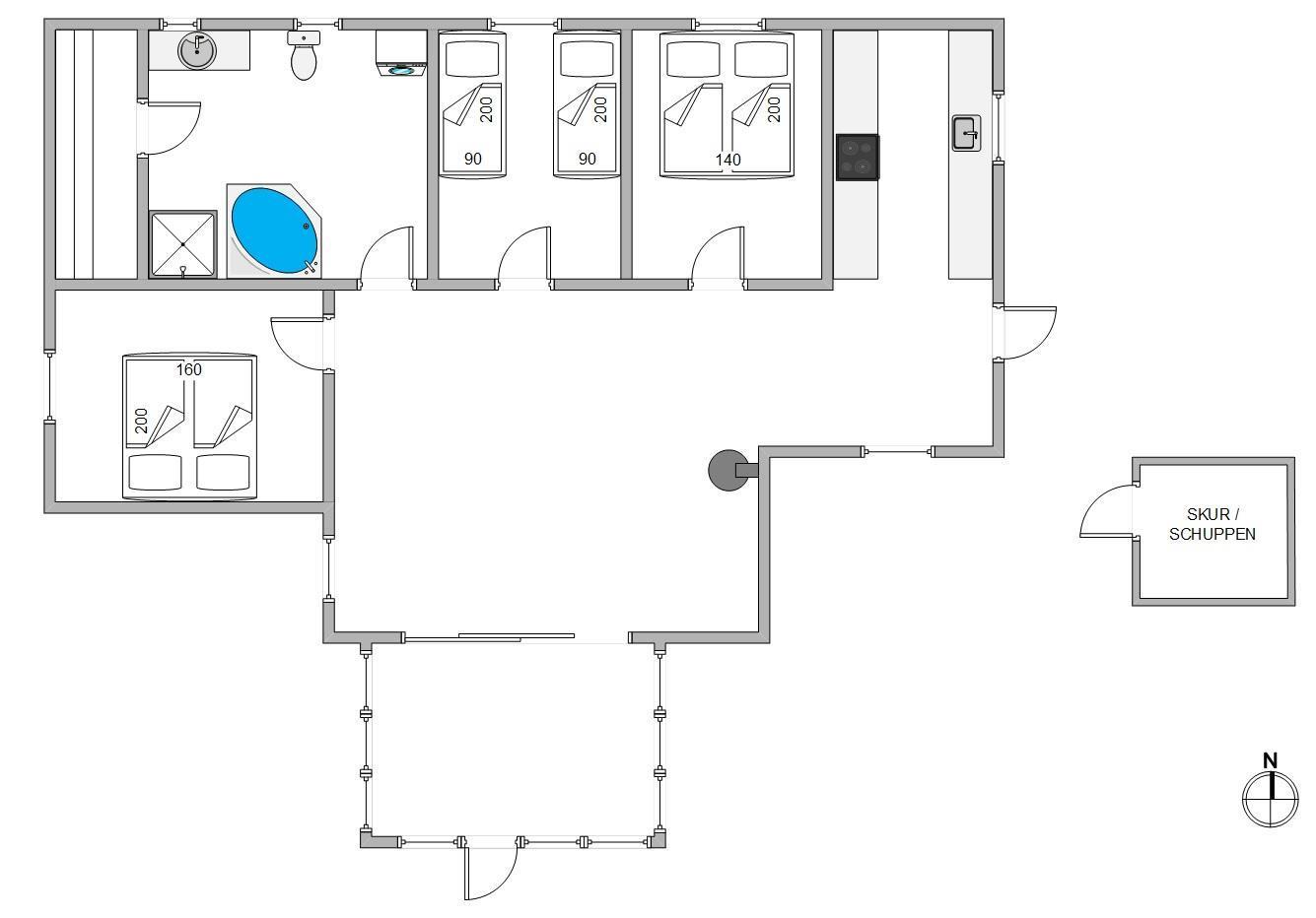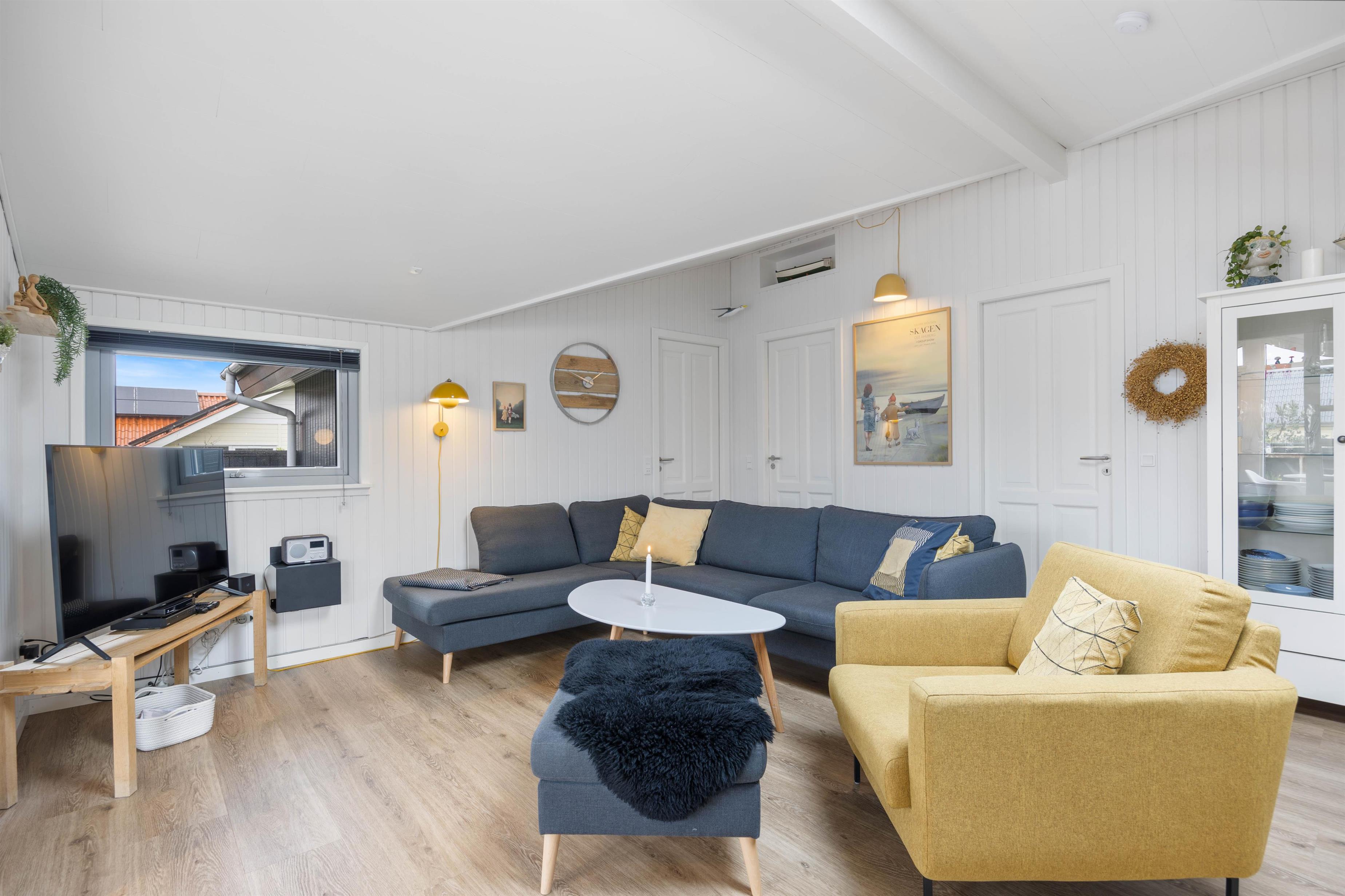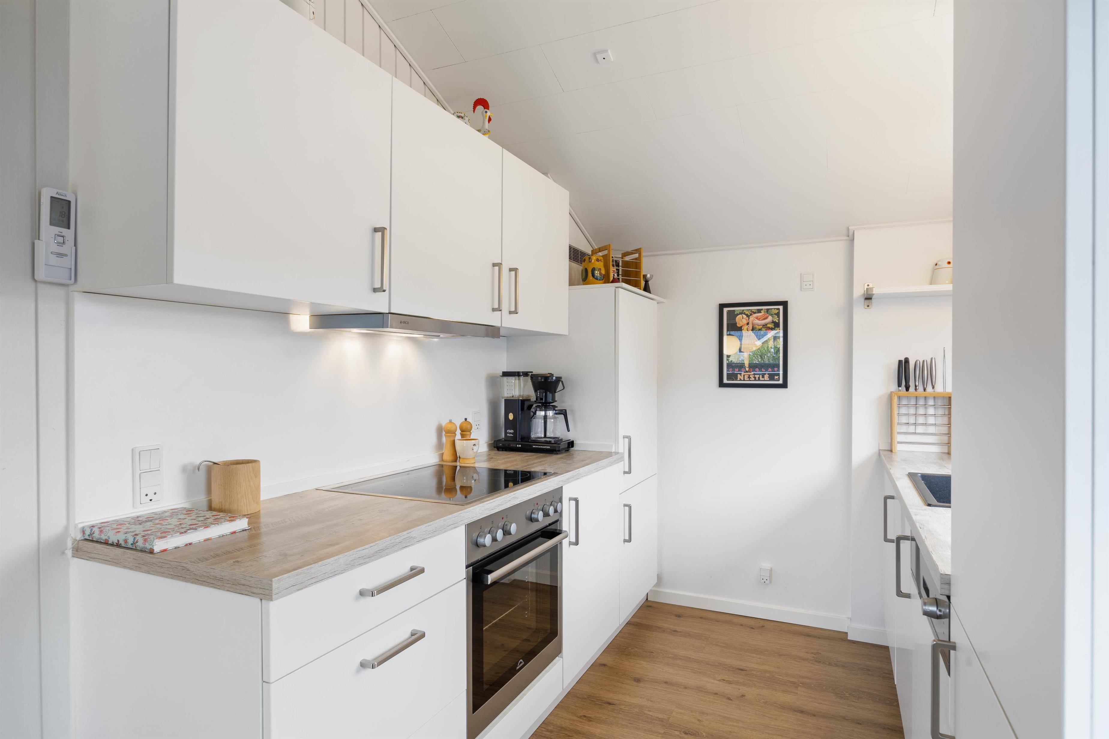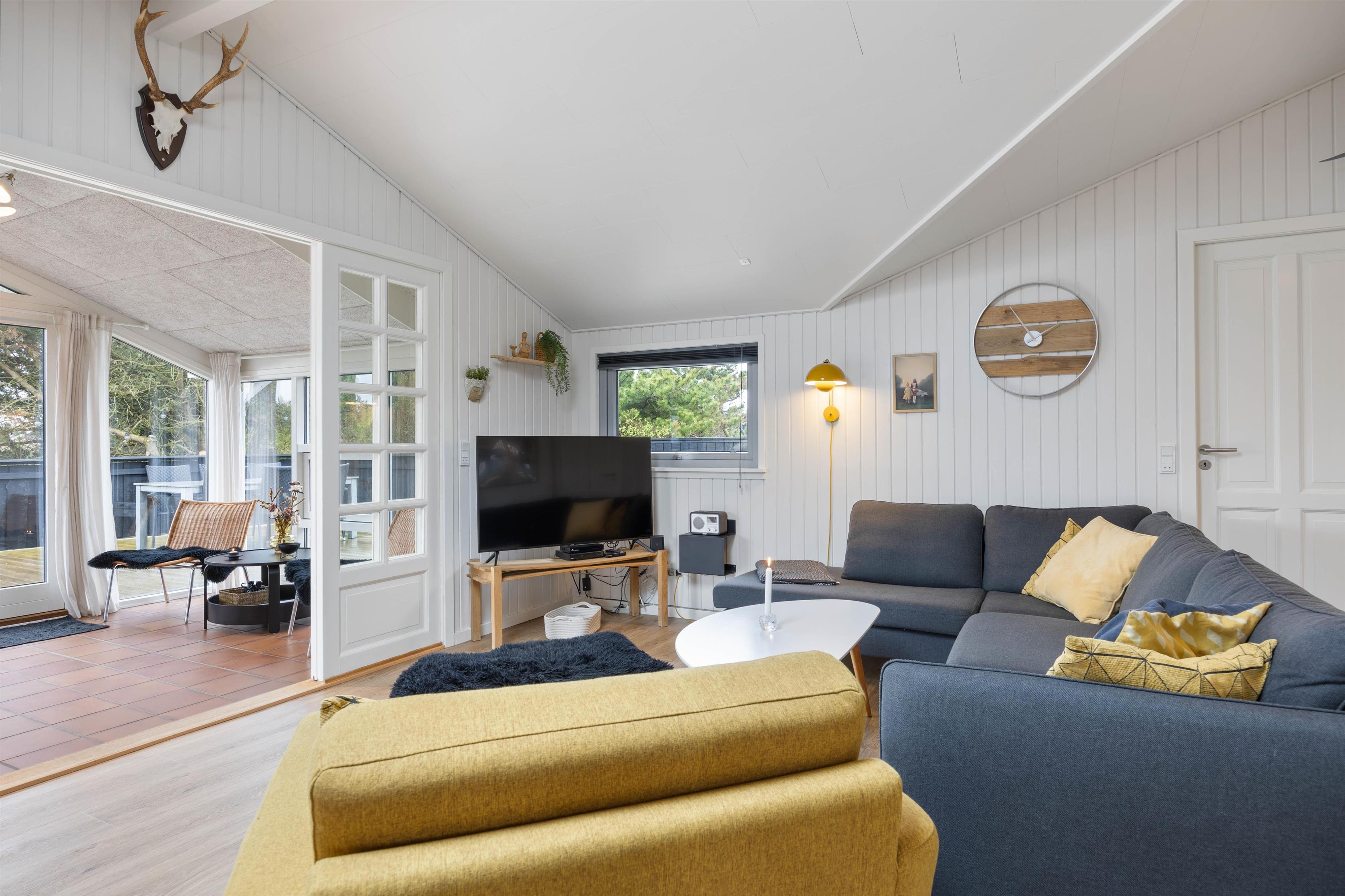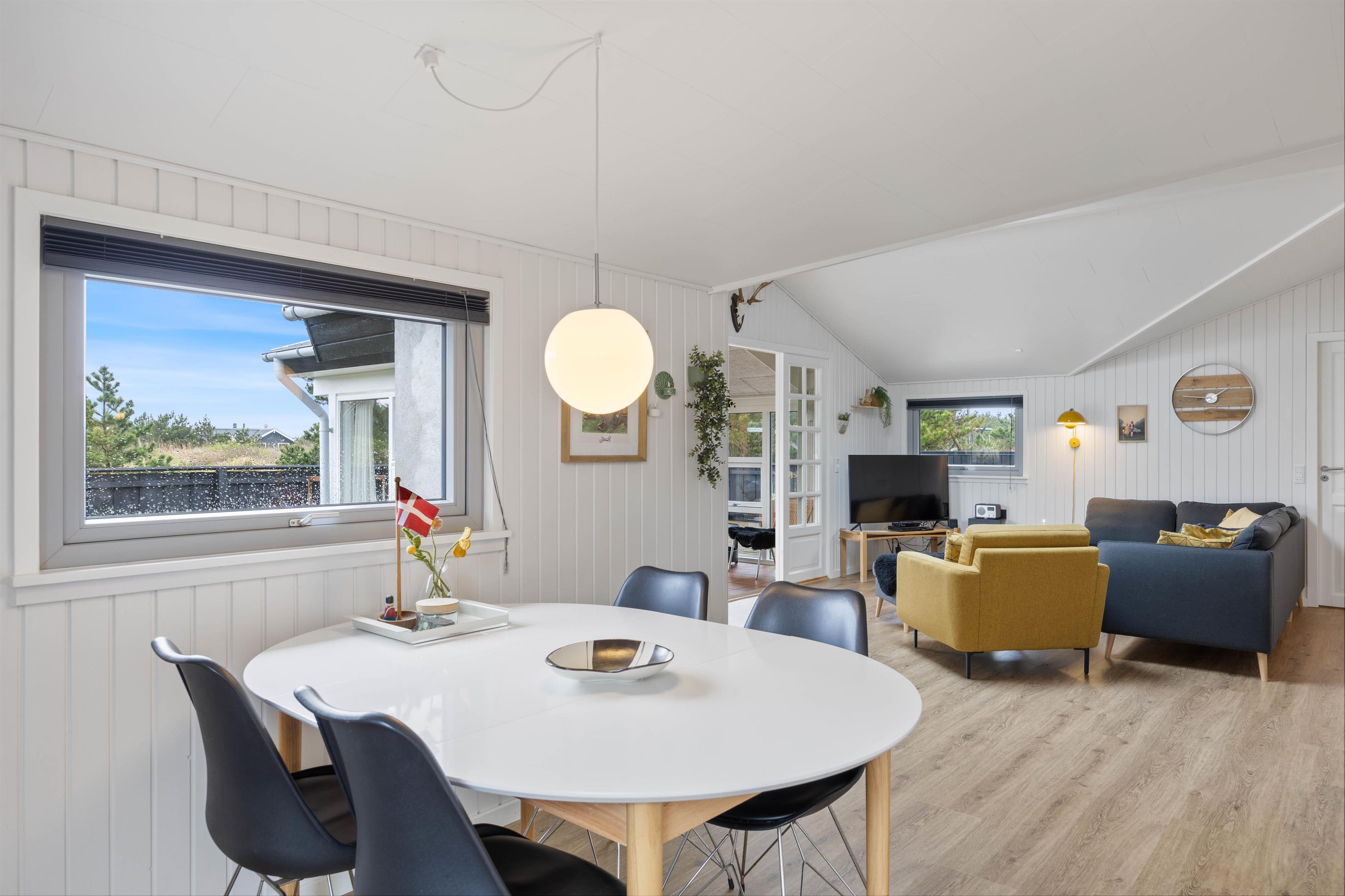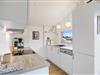 Det praktisk indrettede køkken er åbent ind til stuen, så du kan være i dialog med sofagruppen, hvis nogle slapper af eller ser TV der imens. Brændeovnen i hjørnet spreder varme og hygge til både køkken, stue og udestue. Den lyse og let maritime indretning giver en dejlig feriestemning og forbinder rummene fint.