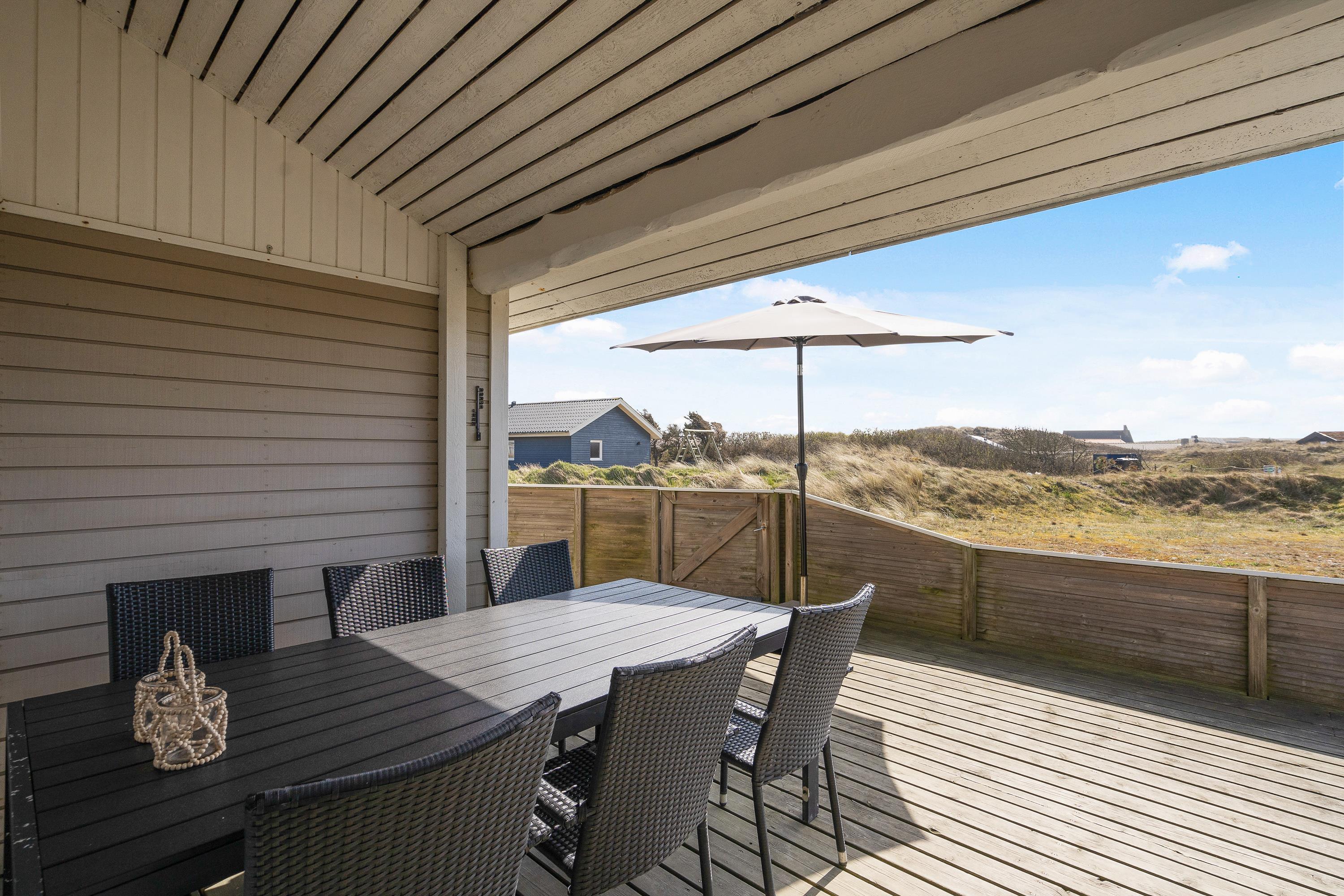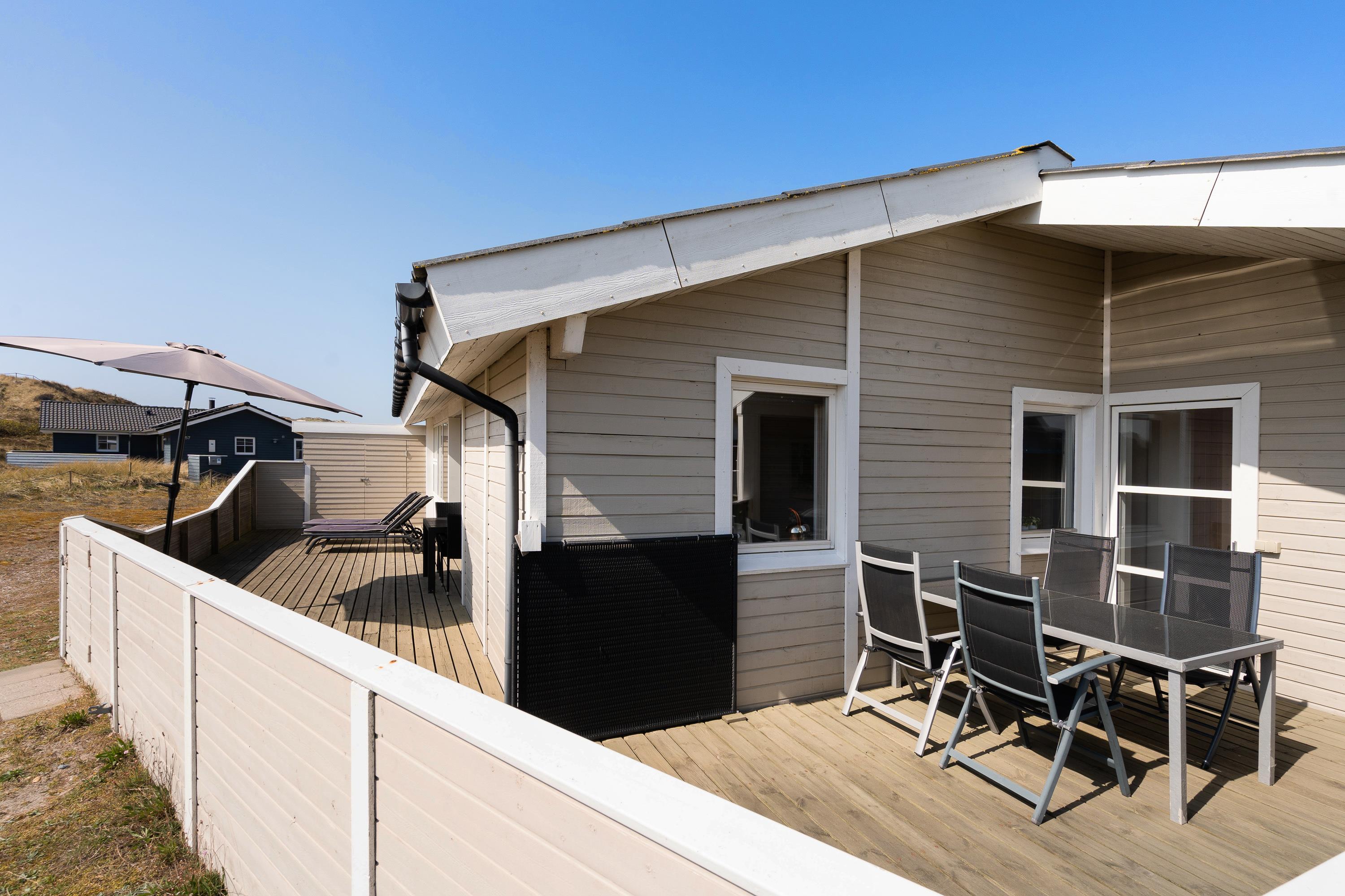 Syd for feriehuset ligger den dejlige store terrasse, hvor der er god plads til, at hele familien kan slappe af. Den er tilmed lukket, så I uforstyrret kan nyde solskinsdagene i liggestolene og slutte af med et dejligt måltid tilberedt på grillen.