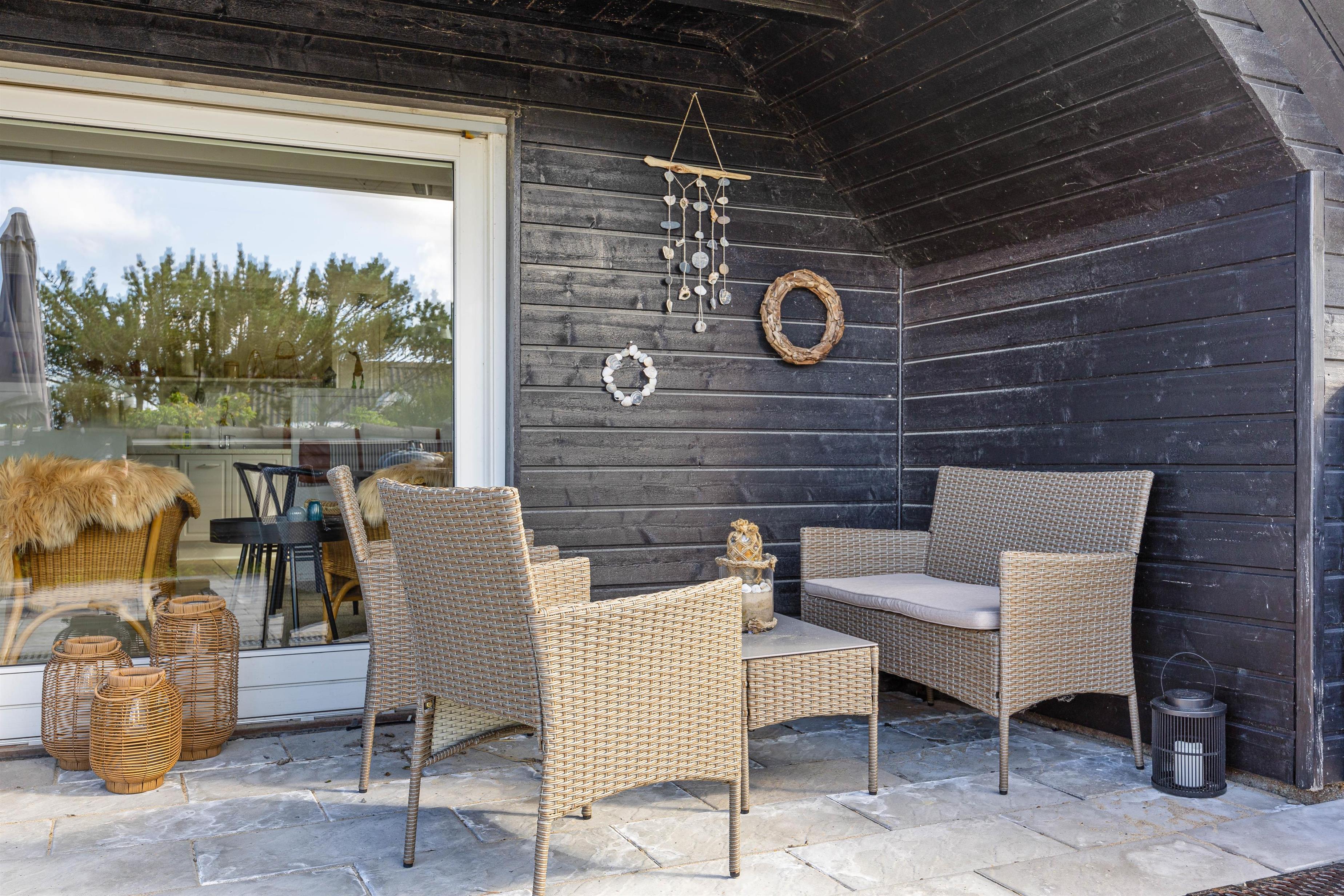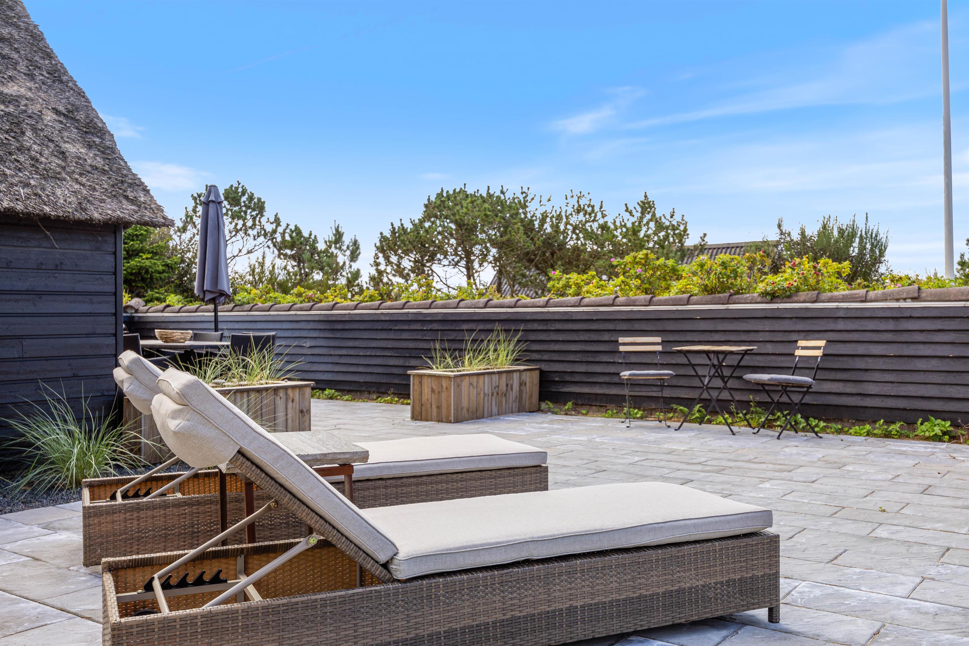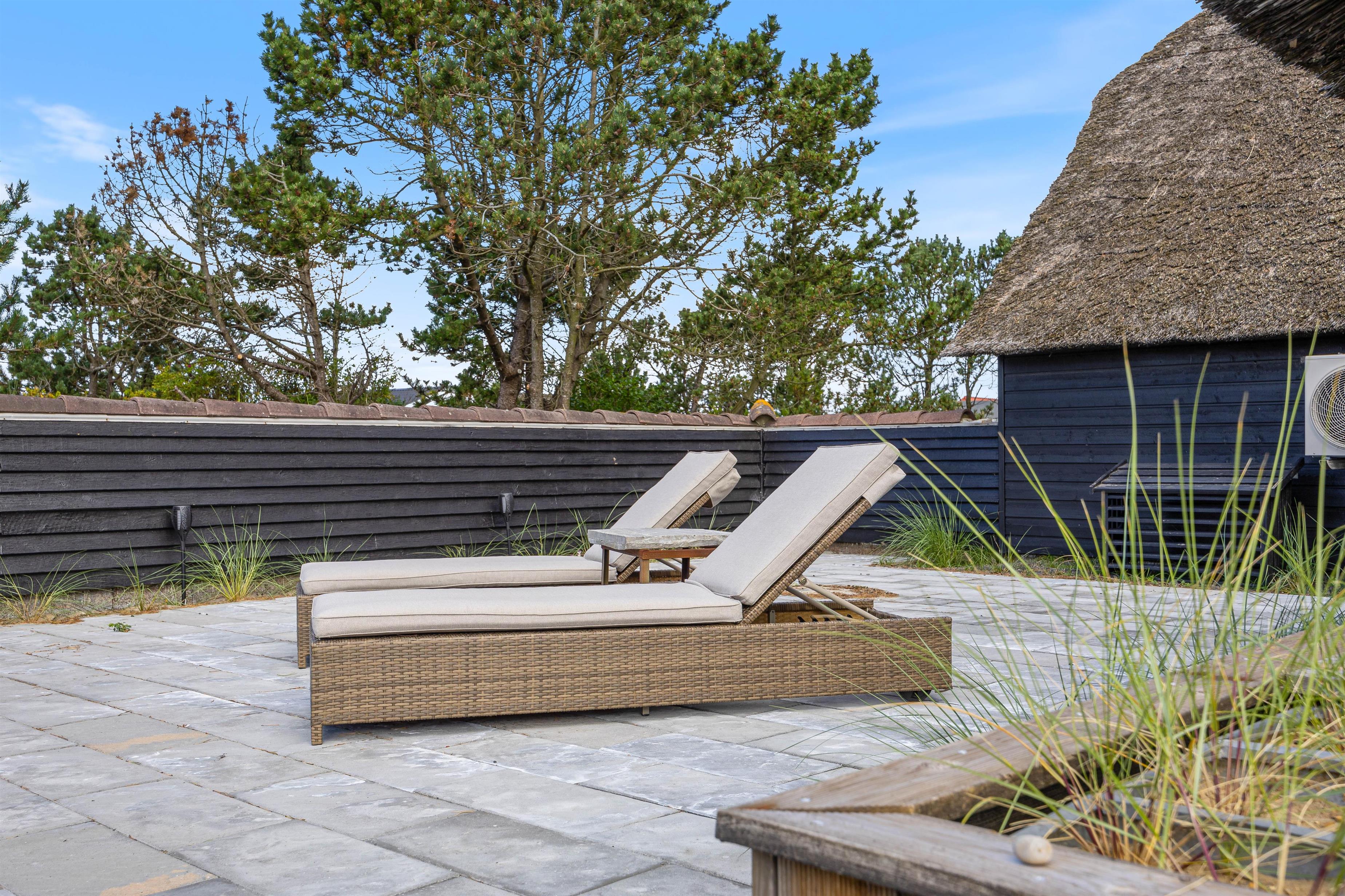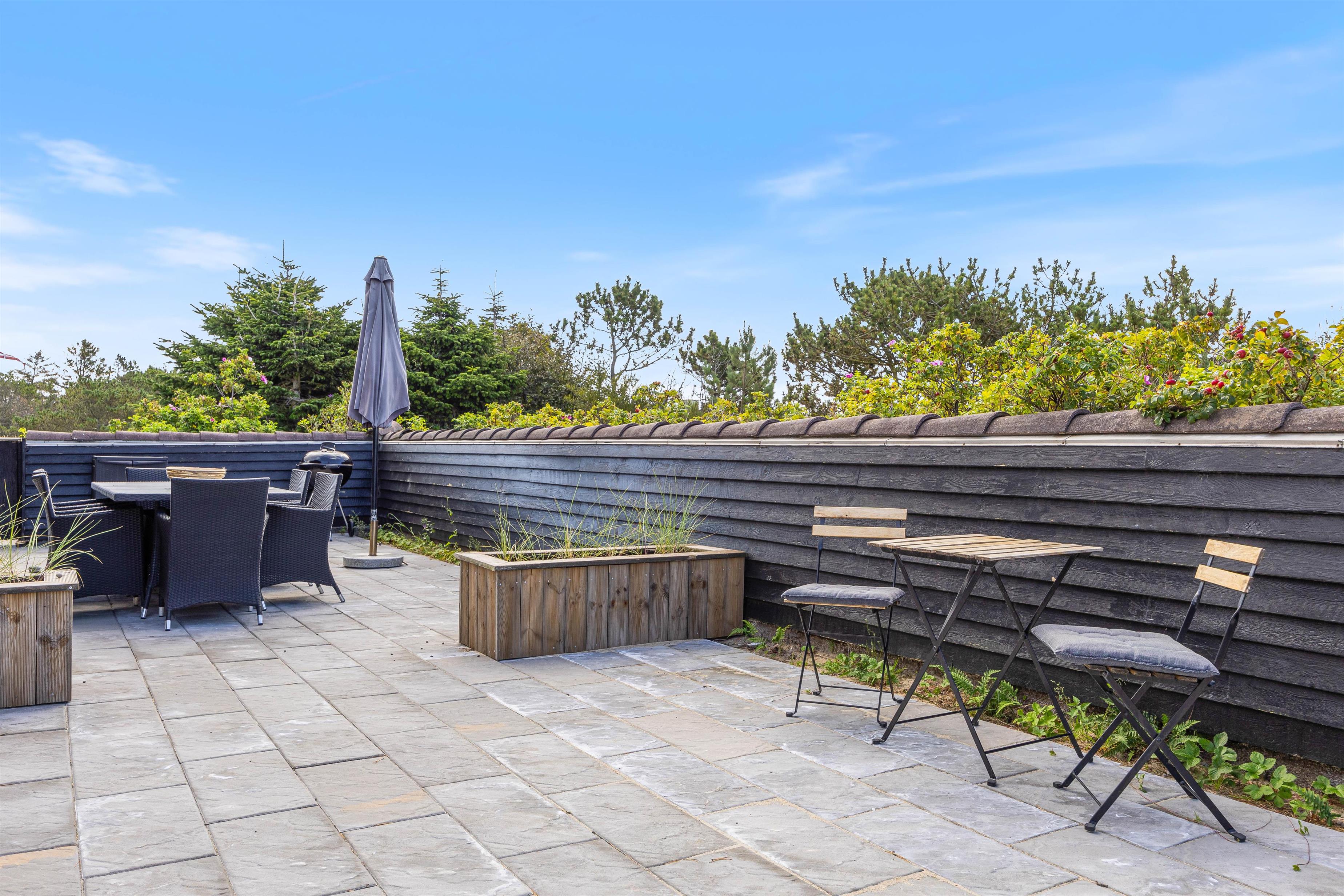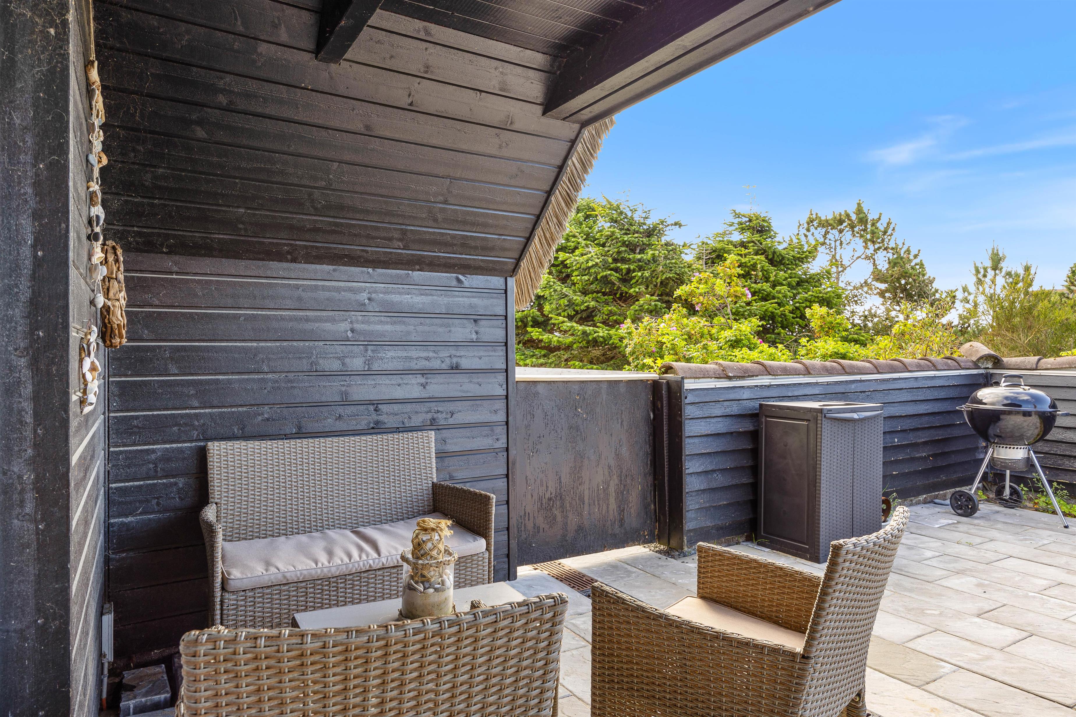 Sommerhuset har en skøn og lukket terrasse, som er placeret mod syd og mod vest. Mod syd er den endvidere delvist overdækket, hvilket er helt ideel til grillaftener. Både børnene og familiens hund vil nyde den lukkede terrasse, især fordi den er så dejlig stor. Der er desuden en sandkasse på naturgrunden udenfor terrassen, hvor børnene kan øve sig på at konstruere sandslotte, inden turen går ned til Vesterhavet, som ligger kun 750 meter fra sommerhuset.