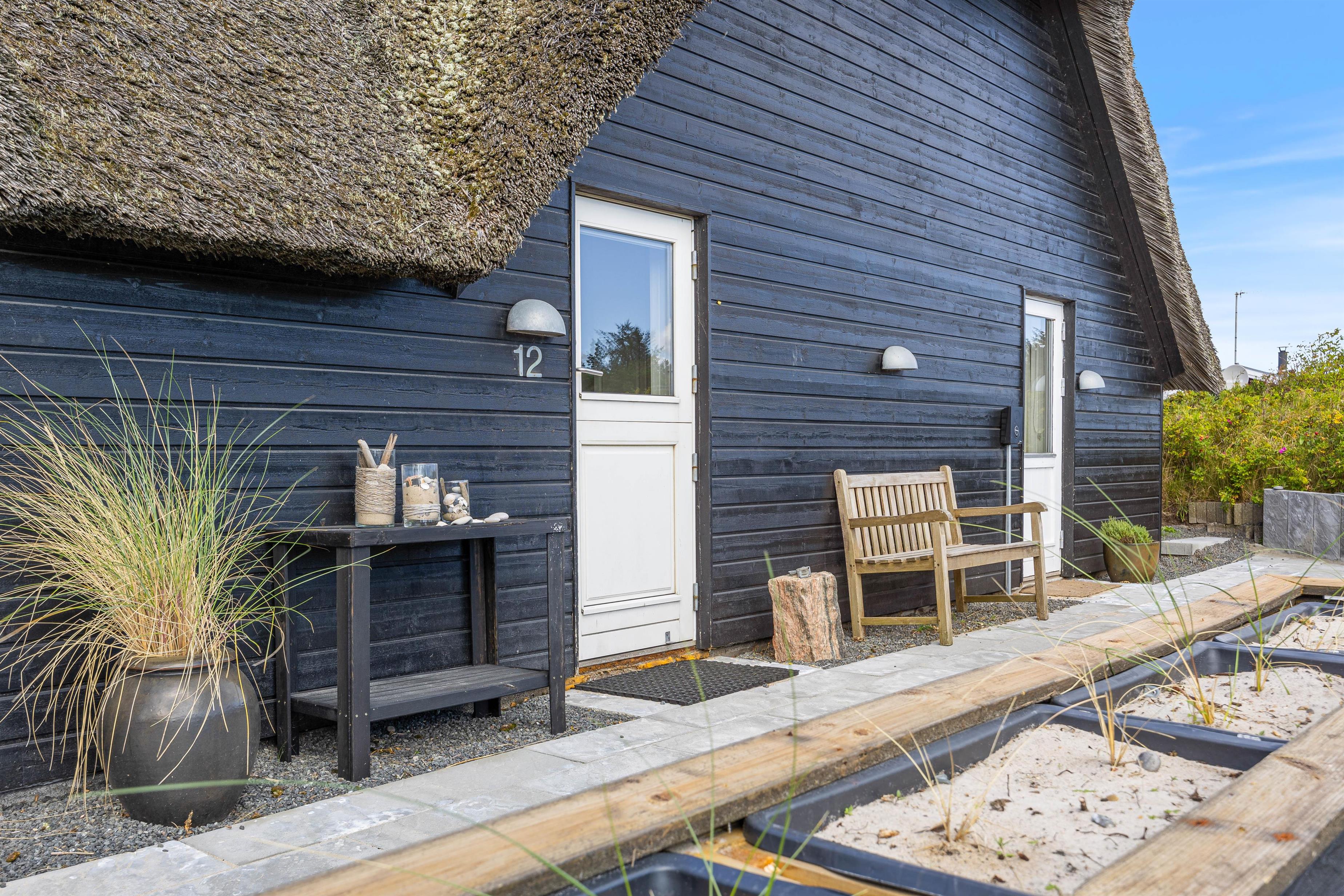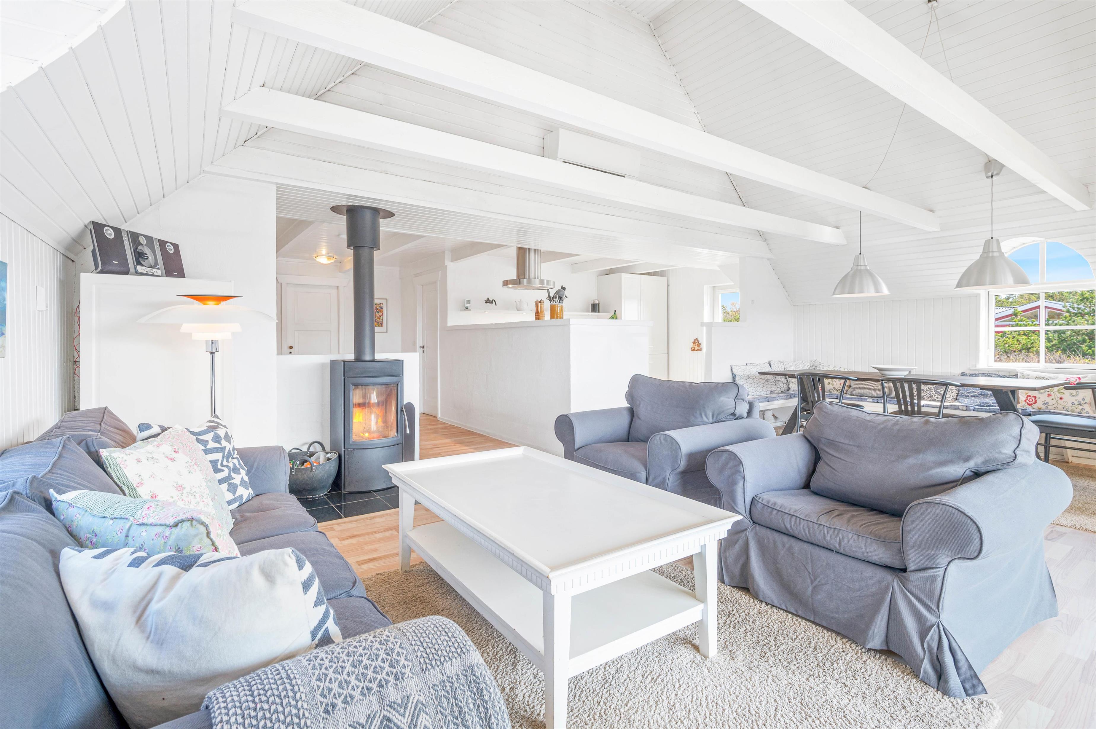 Sommerhuset er bygget i sortmalet træ og med stråtag. I stuen er der loft til kip og synlige bjælker samt en brændeovn, et fladskærms-TV med Viasat og TV2, DVD og en radio m/CD-afspiller, som tilsammen udgør rammen om hyggestunder i godt selskab.