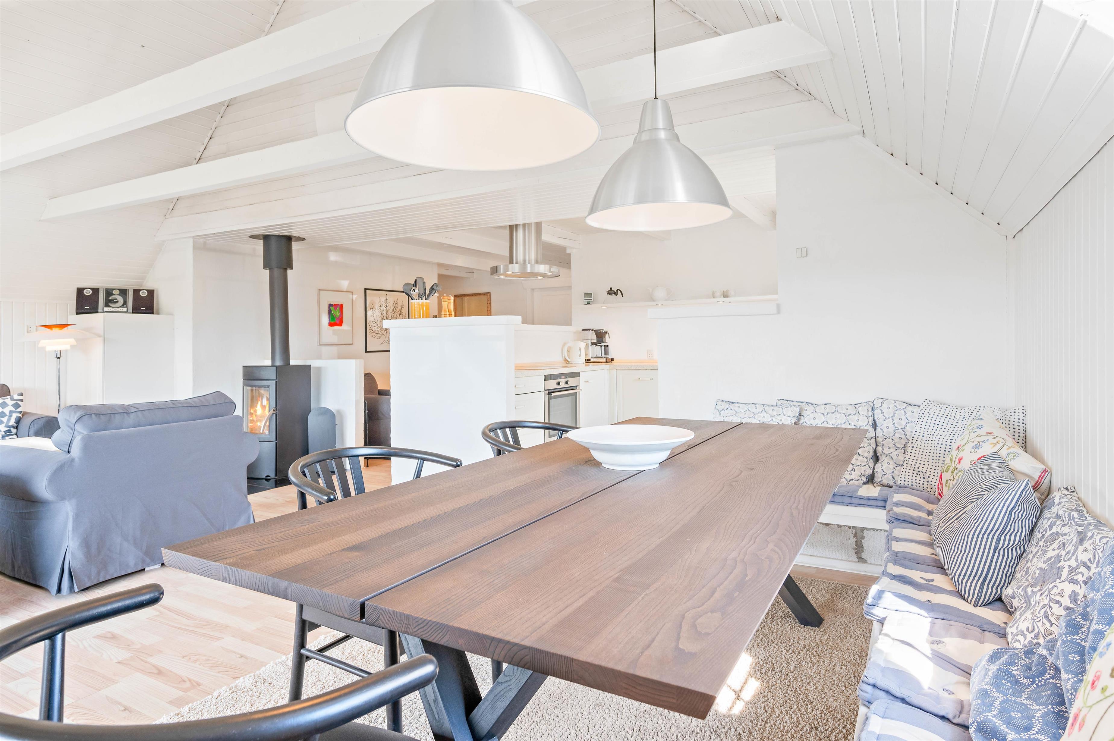 I sommerhuset her på Julianevej 12 kan I holde ferie i et sommerhus til 8 personer og 1 hund. Sommerhuset er indrettet med brændeovn, der giver dejlig varme i alrummet. Fra stuen er der udgang til en stor, lukket og delvist overdækket terrasse, som er perfekt, hvis I har små børn eller hund.