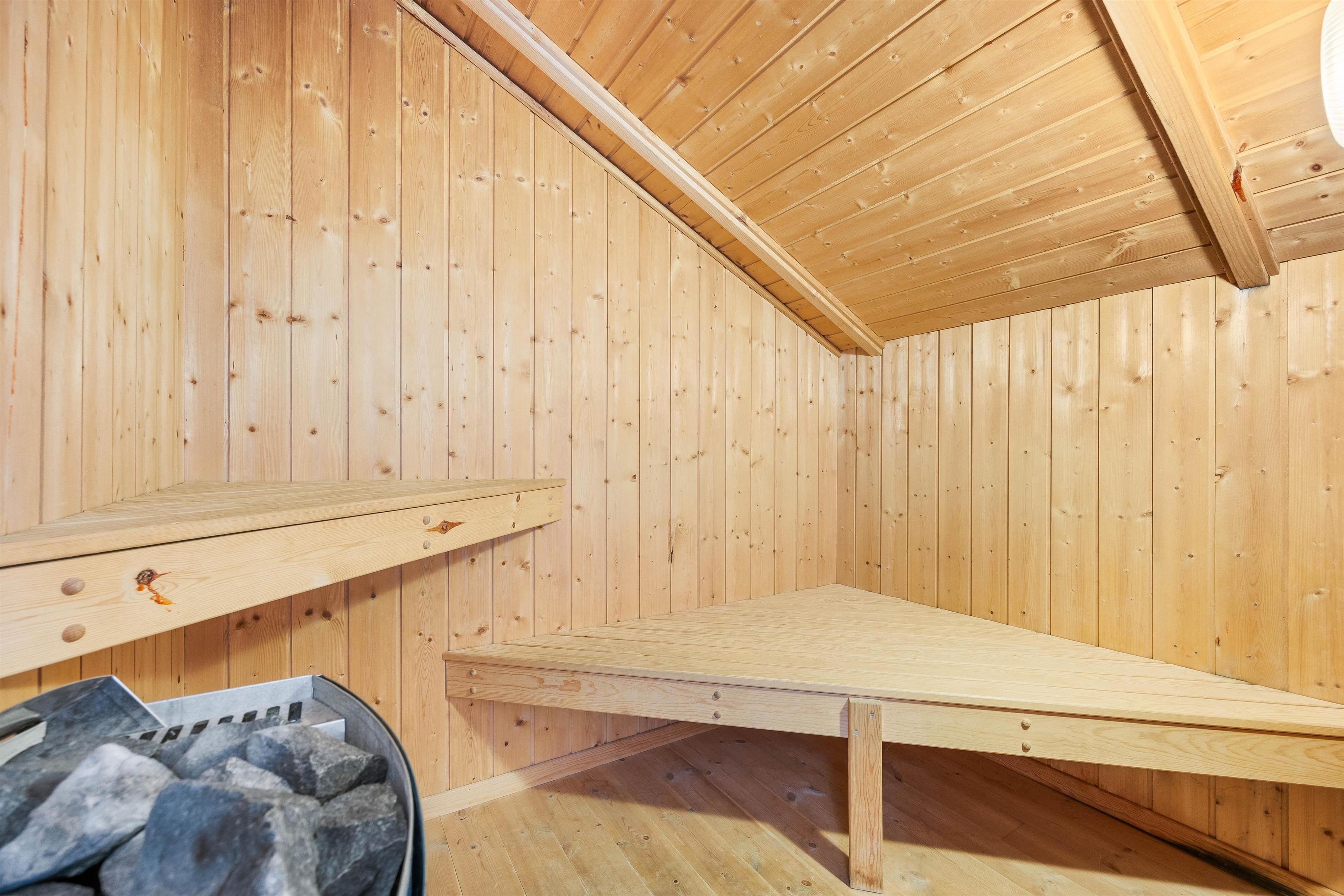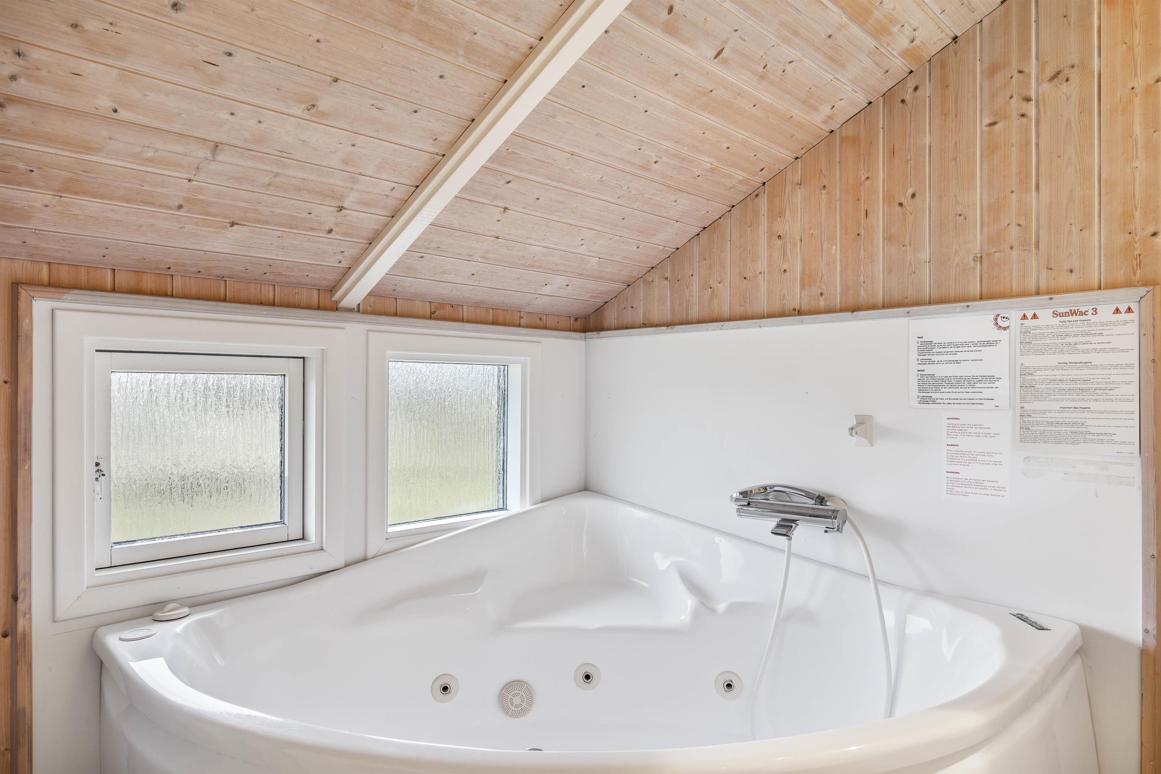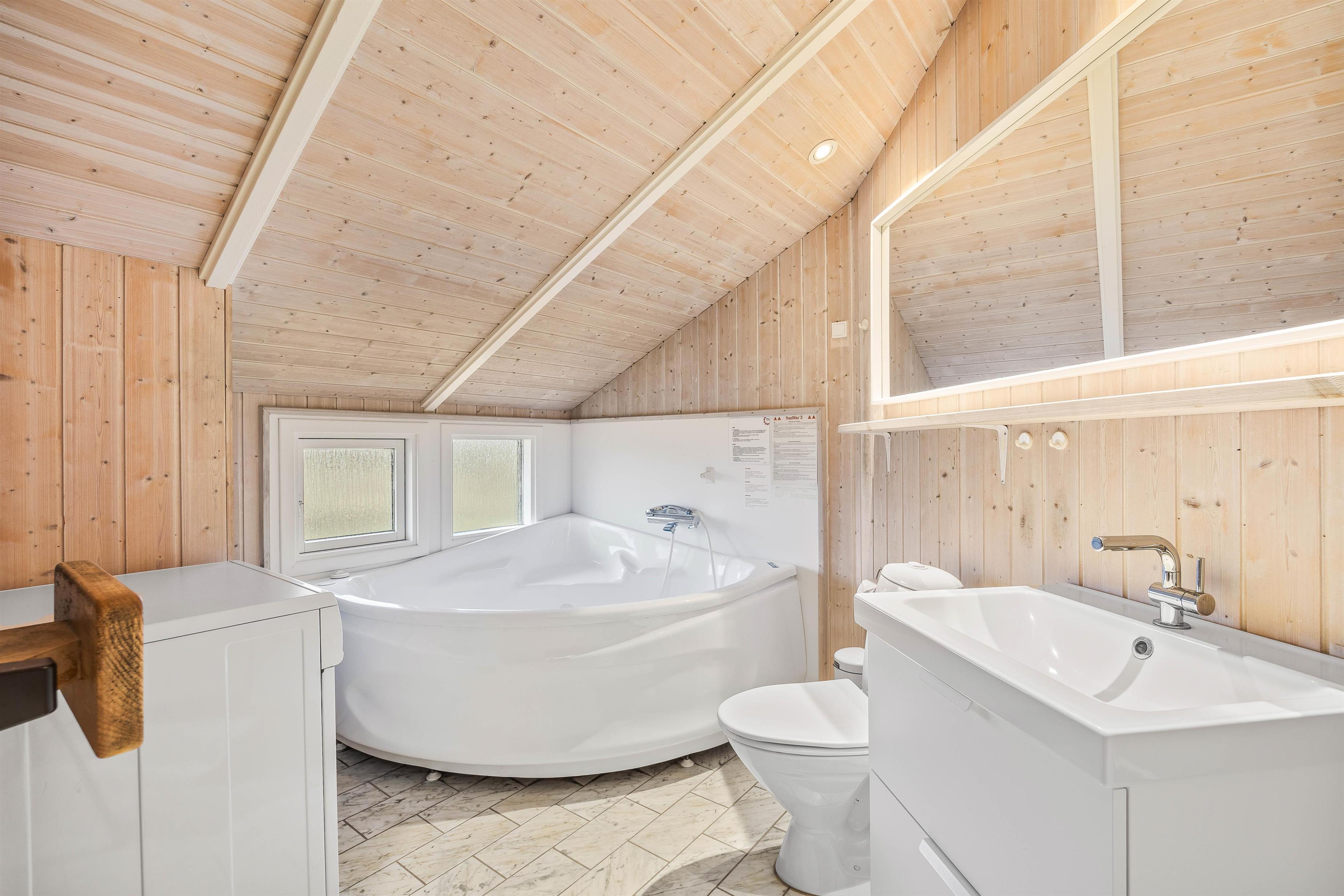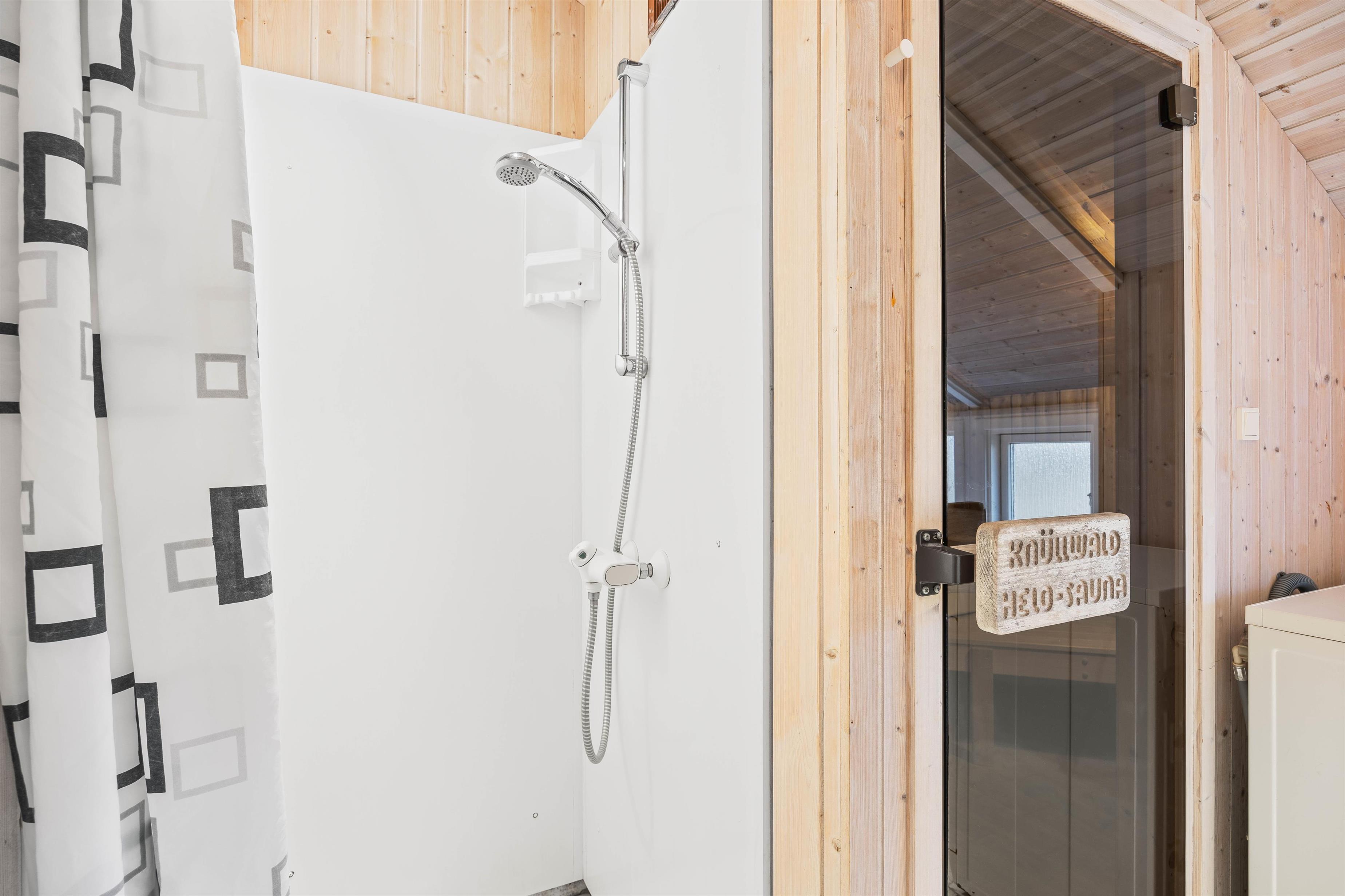 Sommerhuset har et godt badeværelse med gulvvarme og byder på wellness med spa og adgang til sauna. Med sommerhusets placering blot 100 meter fra stranden, kan I tage en frisk aftendukkert og derefter nyde varmen fra saunaen.