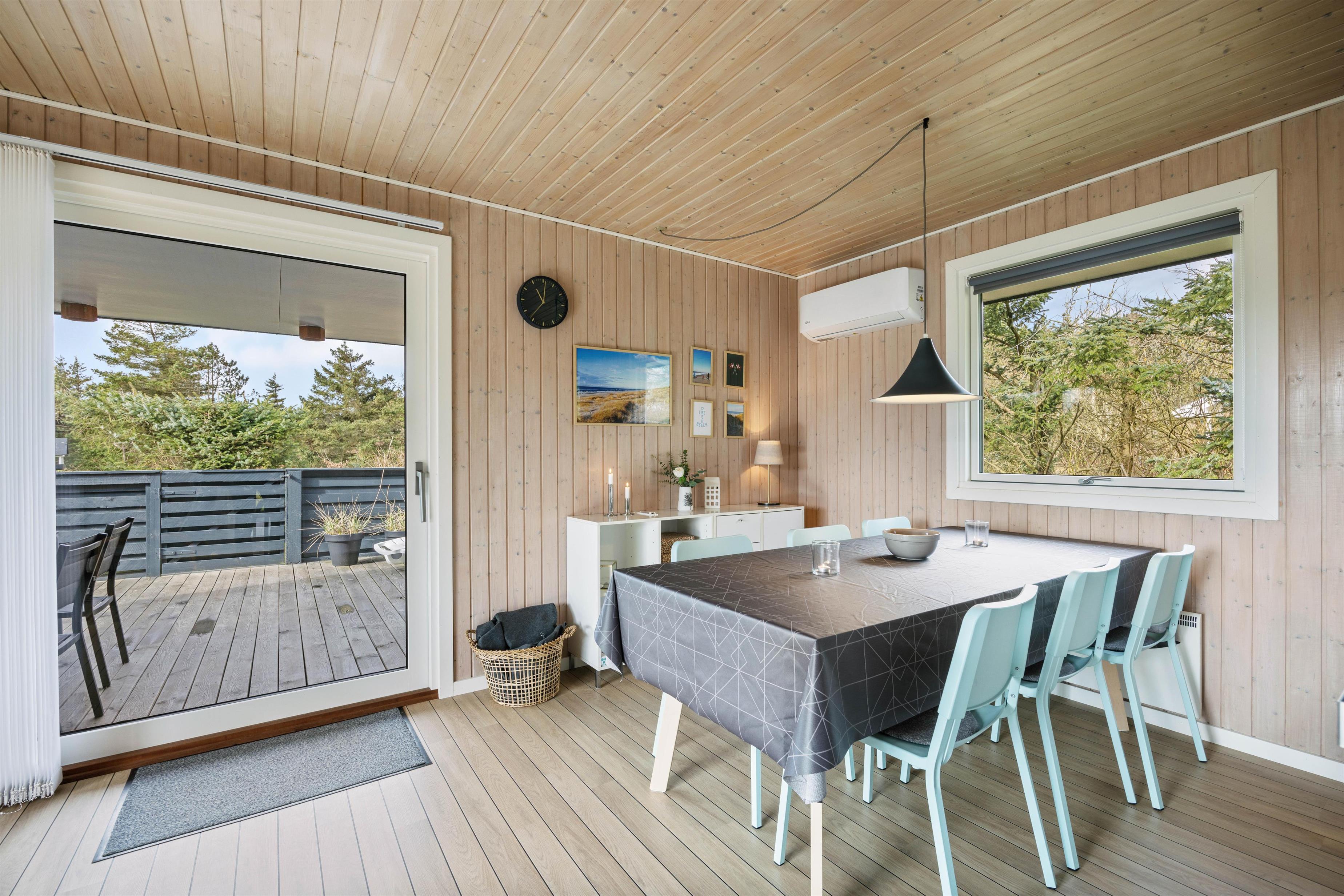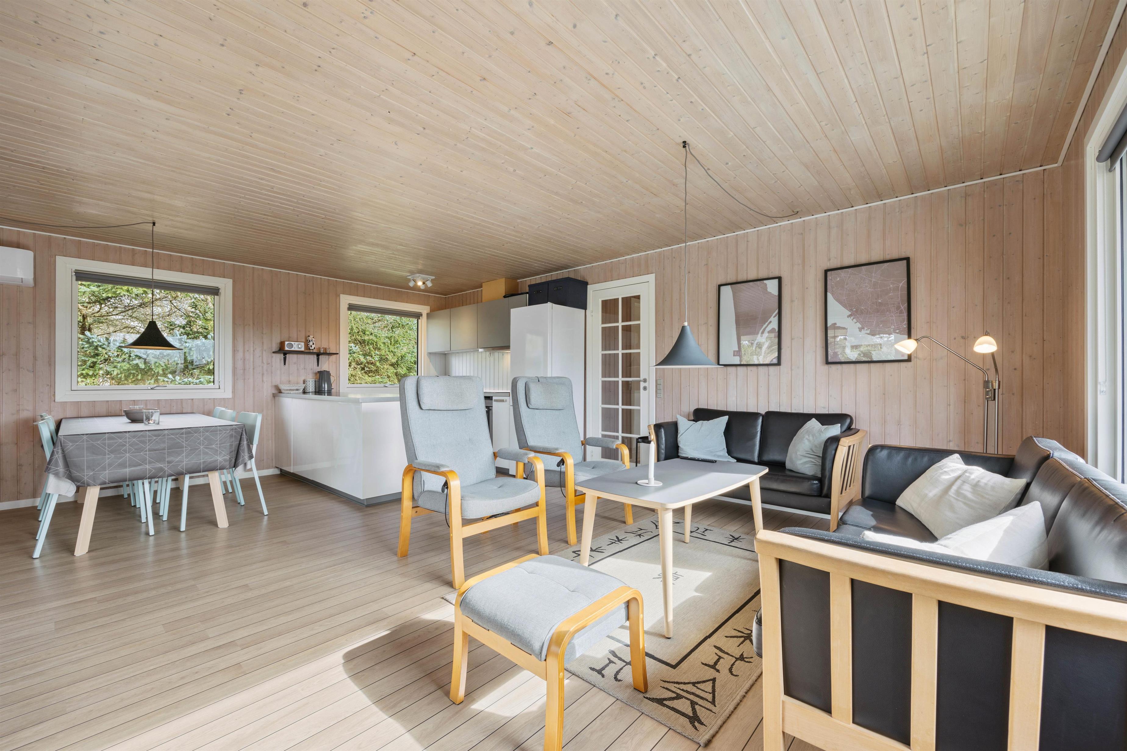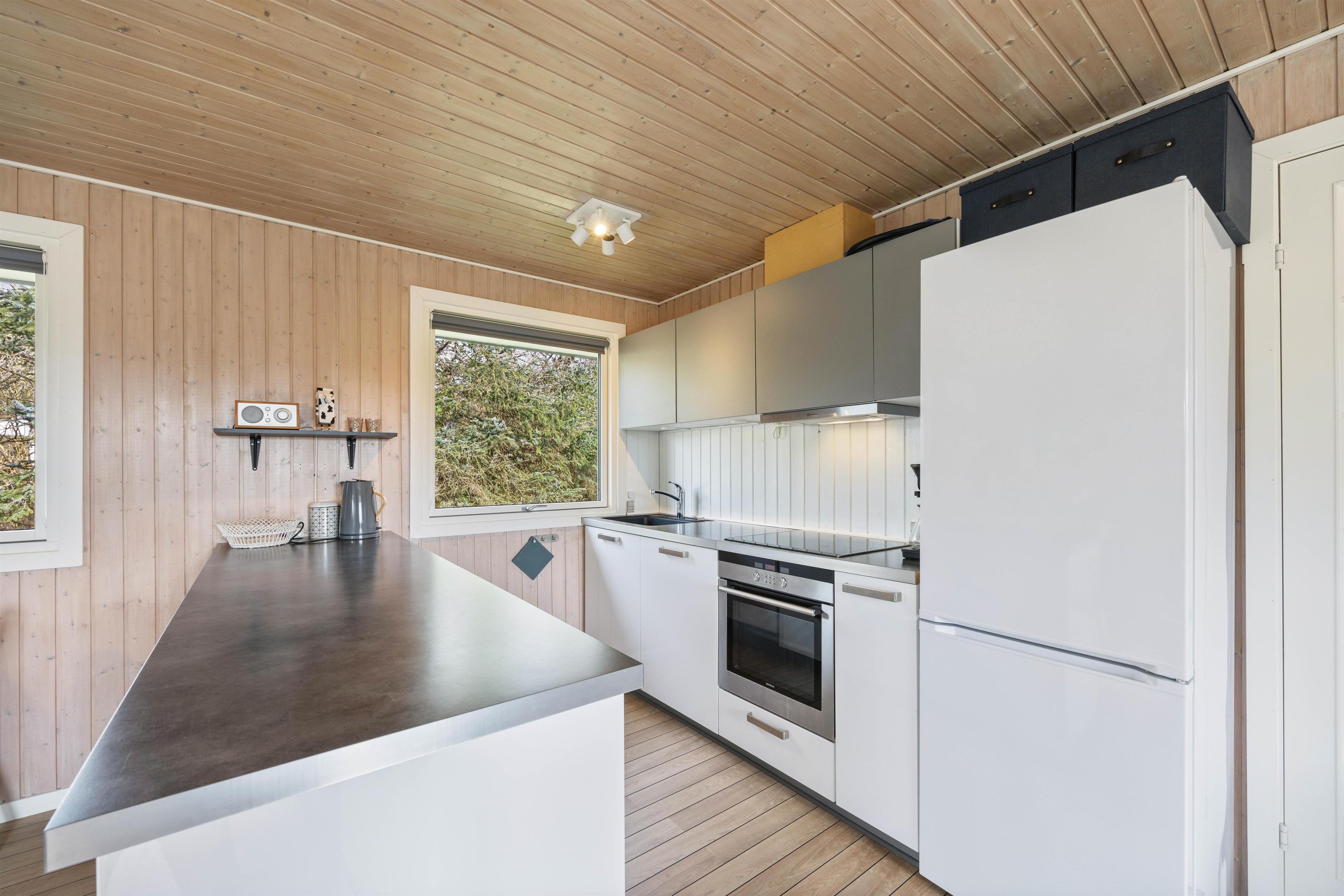 Det veludstyrede køkken har blandt andet induktionskomfur og opvaskemaskine. Fryseren på 80 liter vil især glæde lystfiskerne blandt jer. Her er der masser af plads til en friskfanget fisk eller to. Den omkostnings- og energibesparende varmepumpe sørger for behagelige temperaturer i feriehuset.