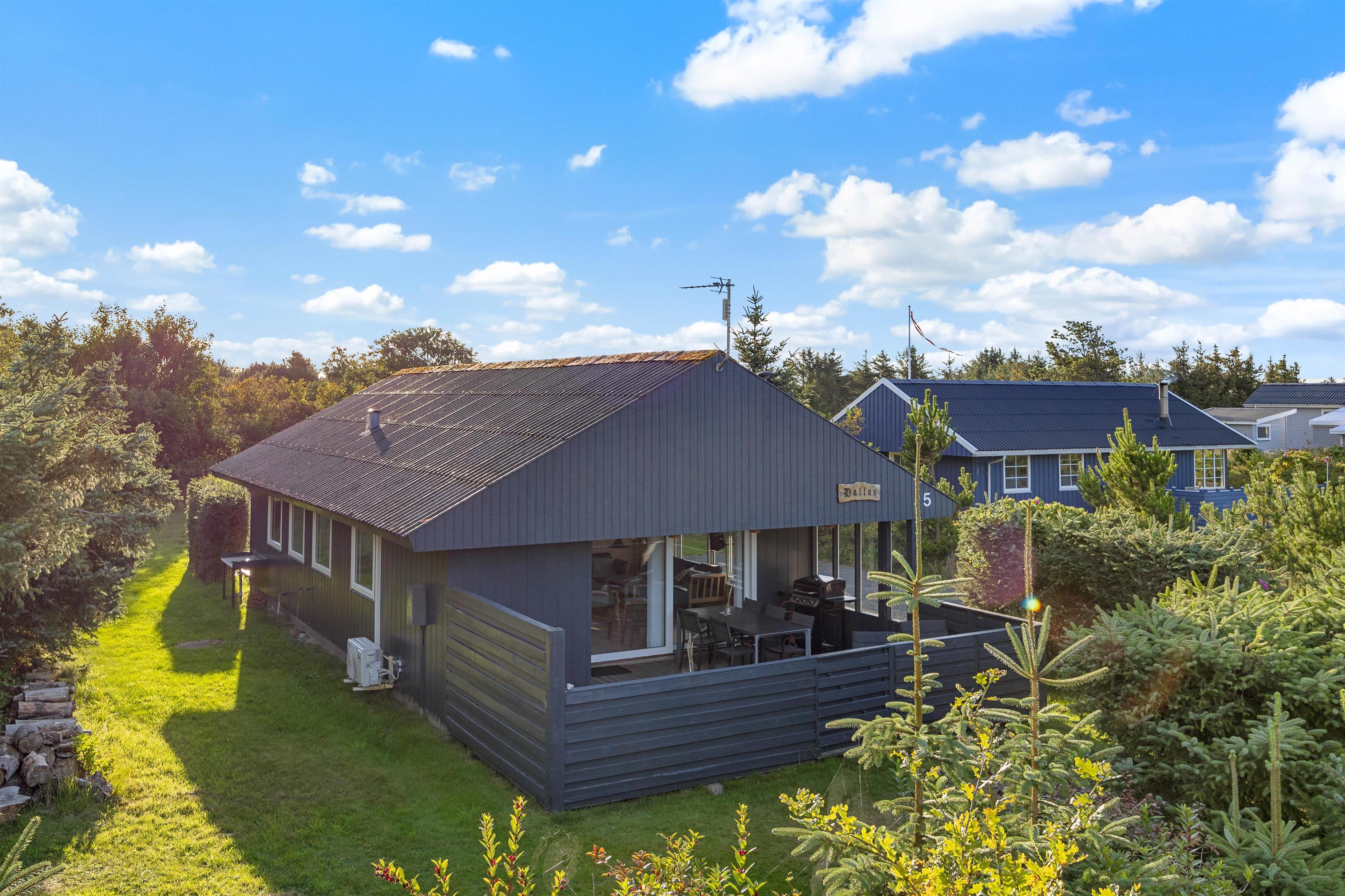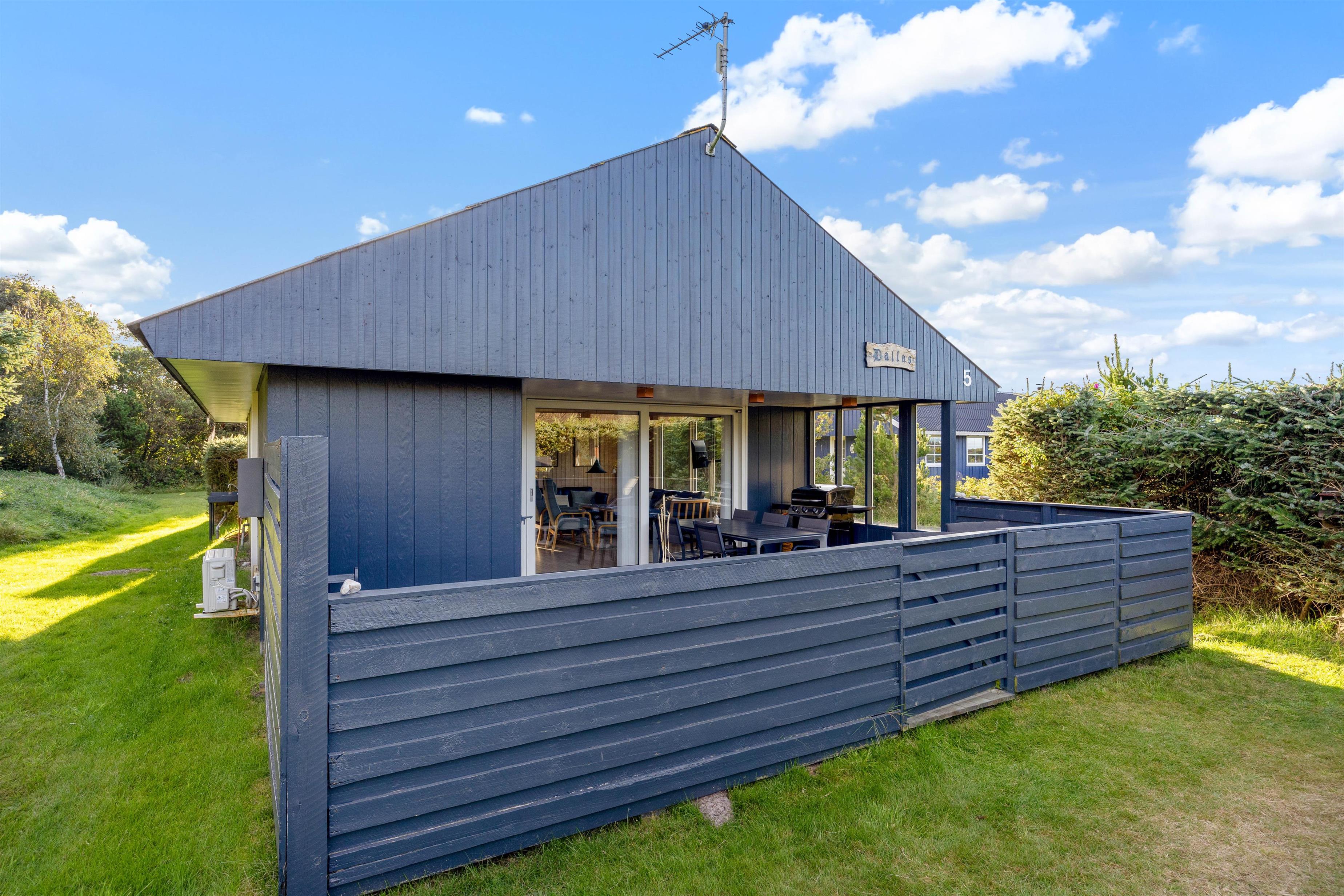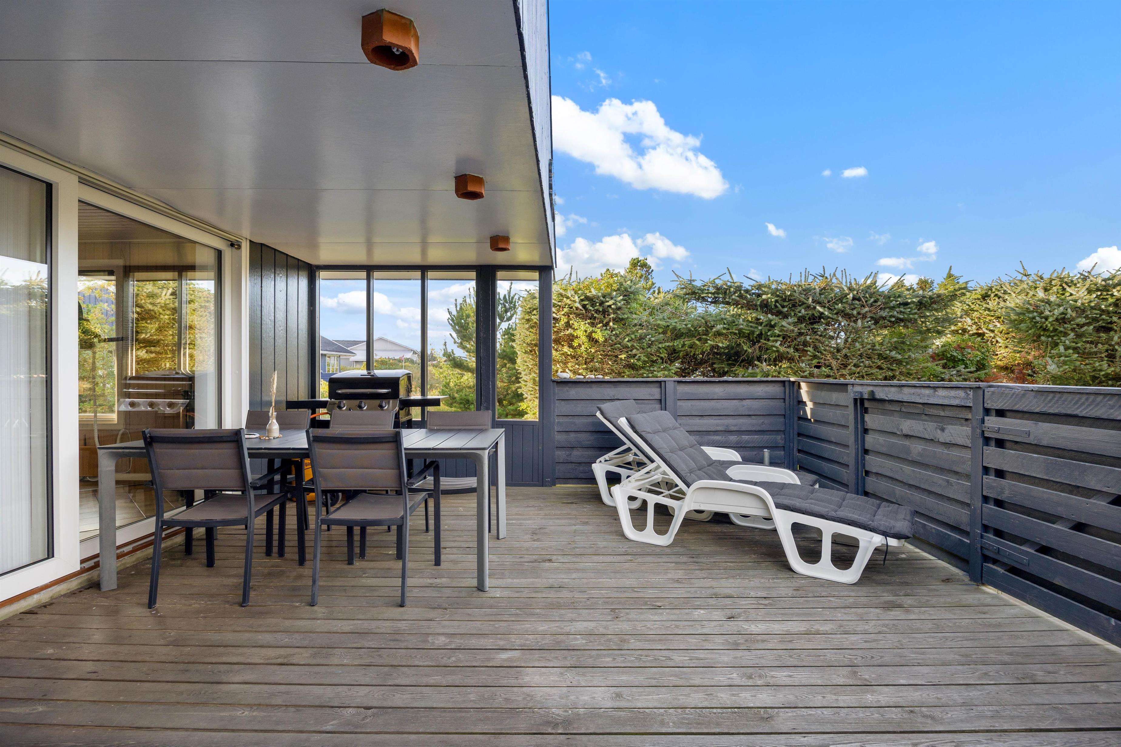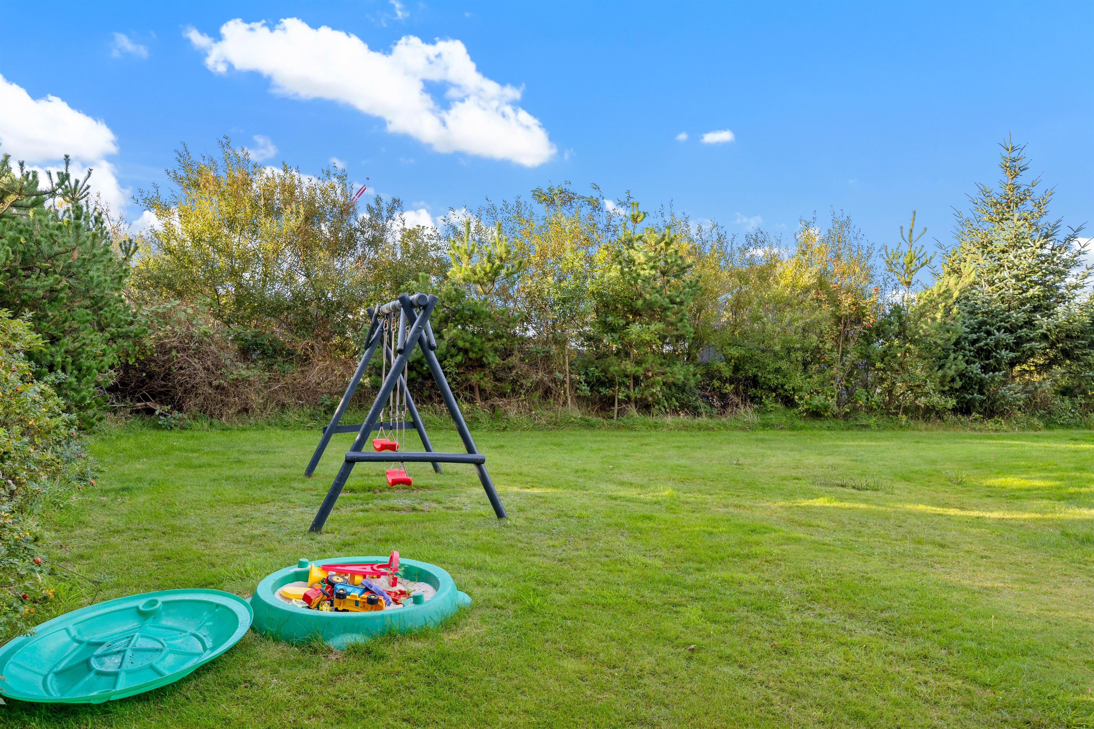 Sommerhuset ligger på en ca. 1200 m² stor plænegrund. Her kan børnene slå sig løs med et spil viking, i sandkassen eller på gyngerne. Imens kan du sætte dig til rette i de hyggelige havemøbler på en af de to terrasser. Hundene kan løbe frit på den lukkede og delvist overdækkede terrasse, og du kan nyde den friske havluft, selv når det regner. Der er en gasgrill til rådighed til en lækker grillaften, så I kan runde ferien af i en hyggelig atmosfære i det fri.