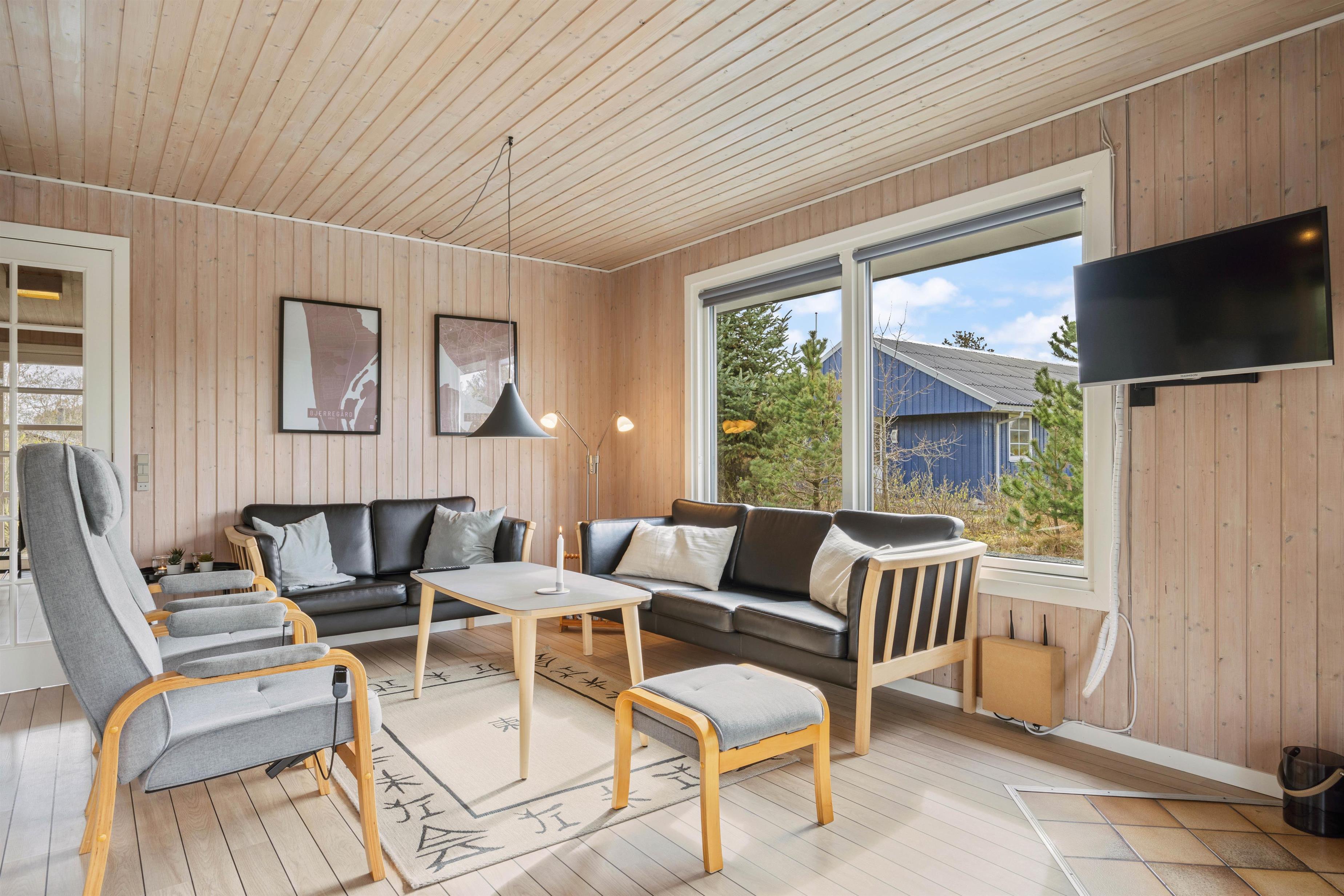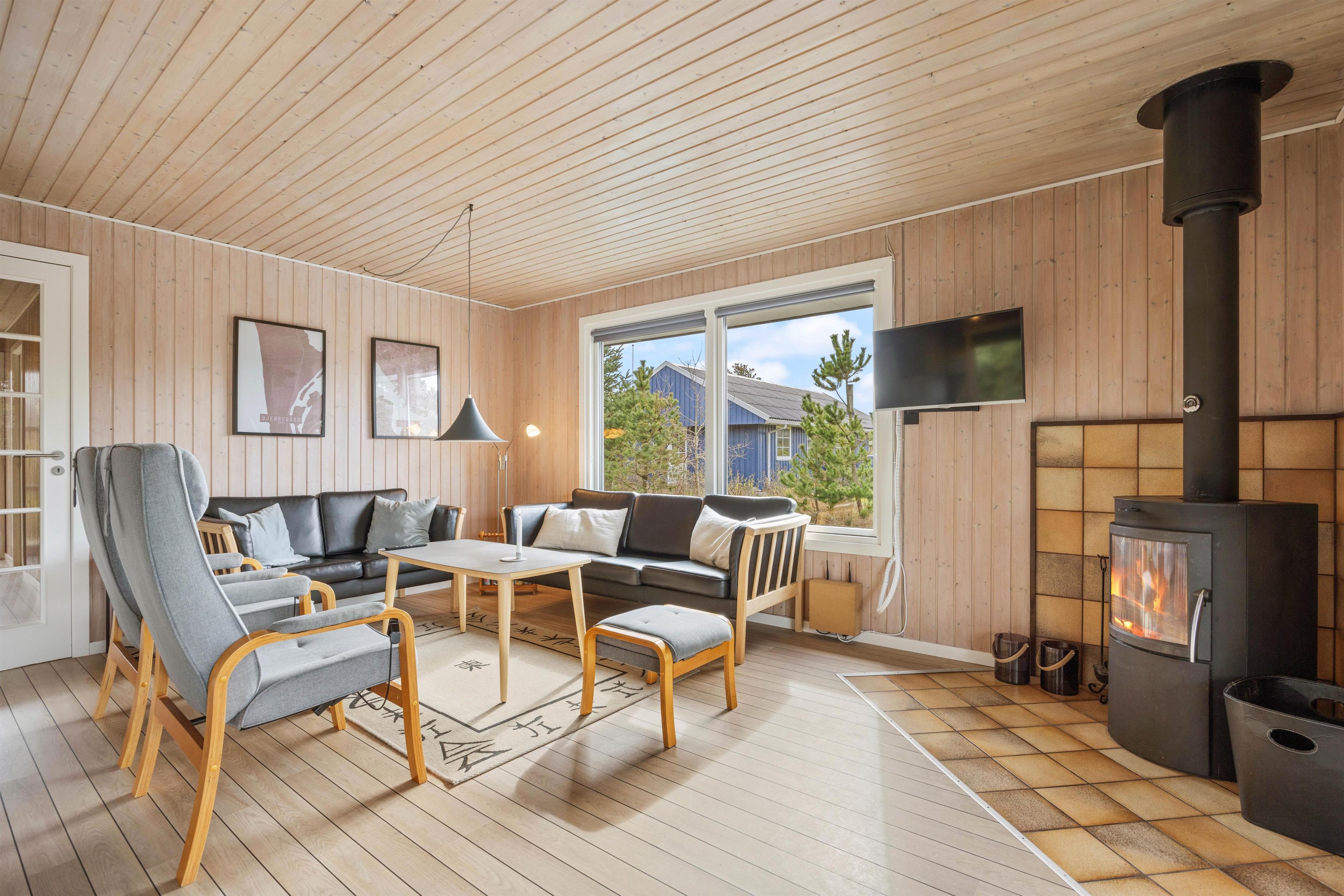 På Midtvej 5 er samlingspunktet den rummelige og hyggeligt indrettede stue med spiseplads og åbent køkken. Gennem de mange vinduer kommer et fint lysindfald, og I fornemmer naturen omkring jer. Sæt jer godt til rette i sofaen med et glas vin og lyt til den knitrende ild i brændeovnen. Eller nyd at se en film sammen med hjemmelavede popcorn.