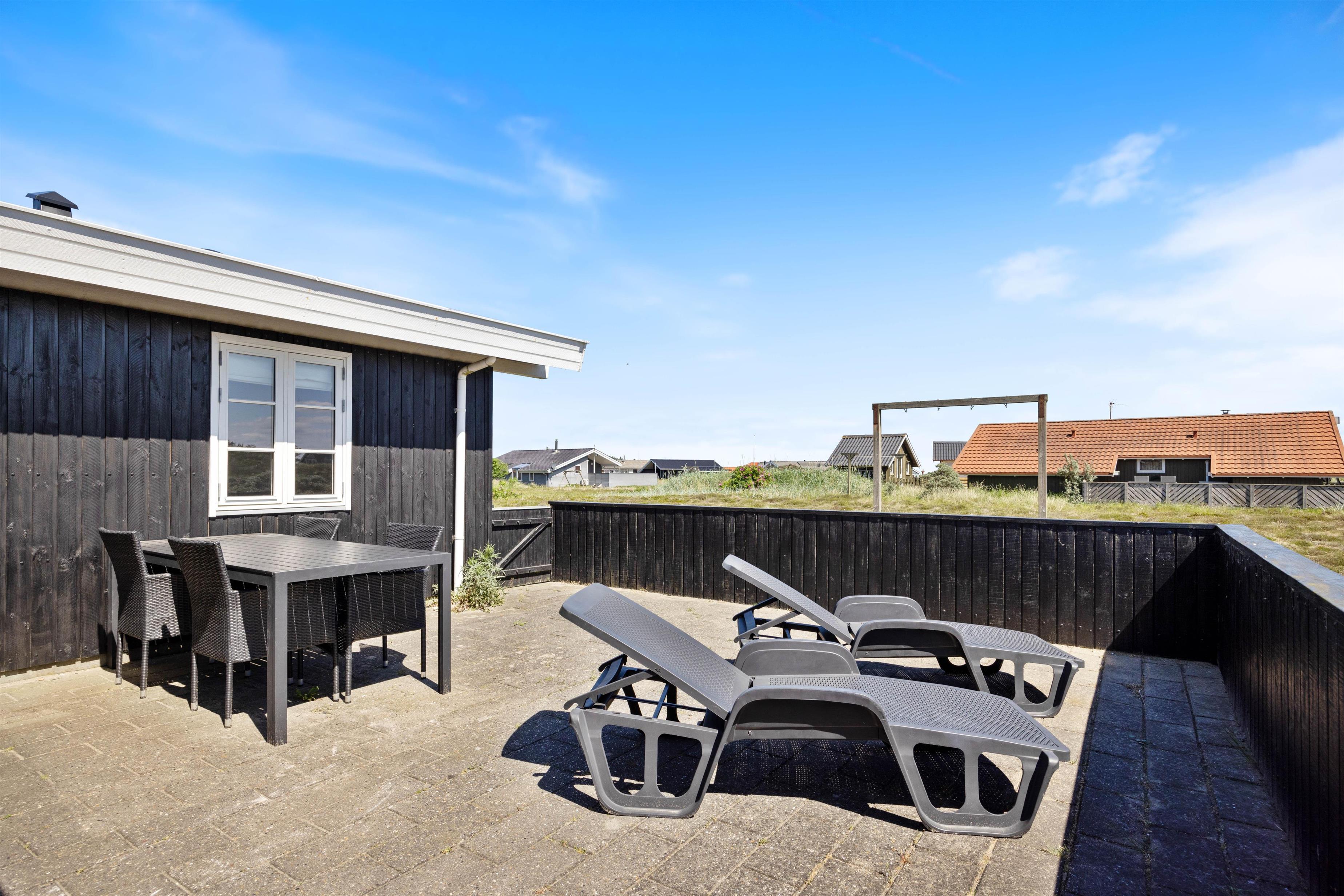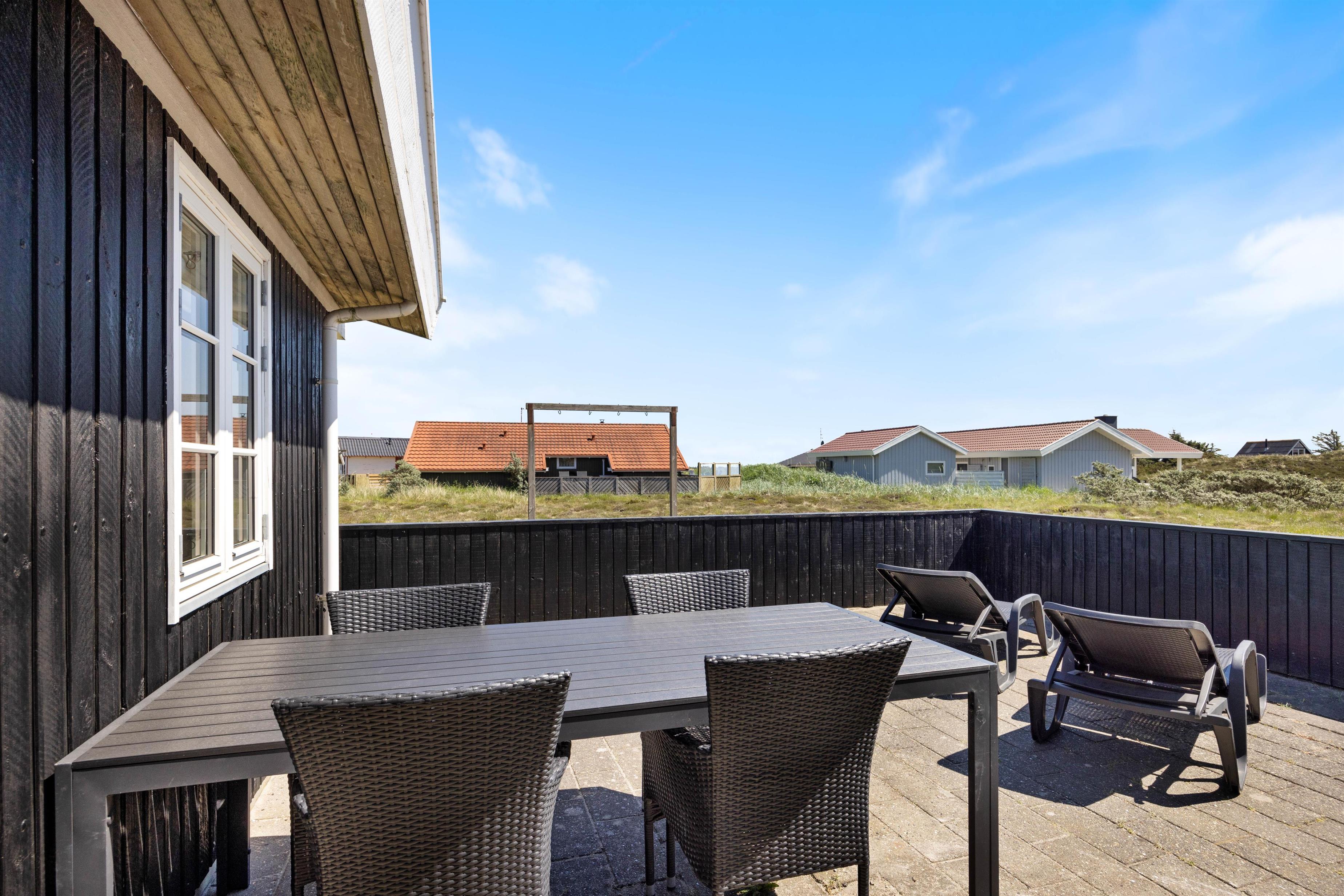 En hyggelig og helt lukket terrasse mod sydøst indbyder til masser af udendørs aktivitet, både for voksne, børn og familiens hund. Her har man et fantastisk view udover den flotte natur. Drik morgenkaffen til solopgangen over Ringkøbing Fjord mod øst.