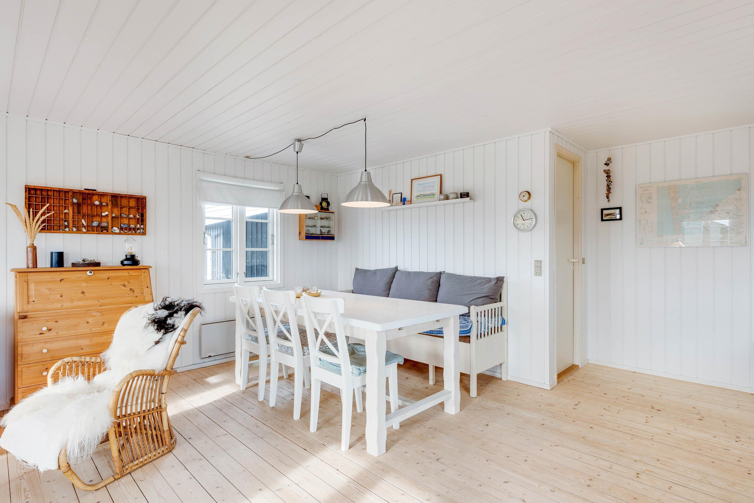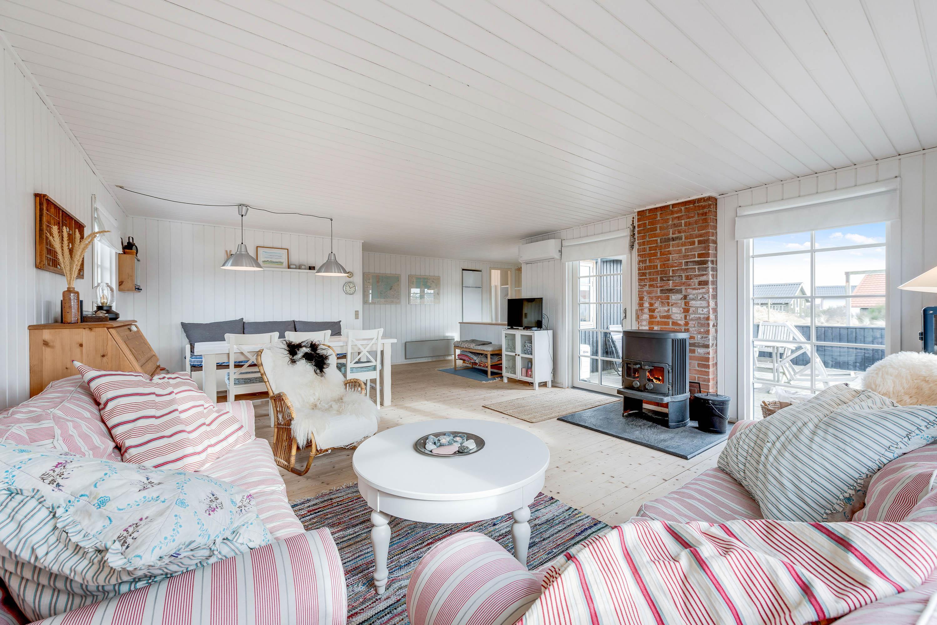 Stuen er indrettet i nordisk stil med kludetæpper, flotte trægulve og bløde sofaer. Rigtig hyggeligt – og oplagt til indendørs hygge – måske med familiespil eller en god bog foran brændeovnen. Her kan man kun føle sig hjemme.