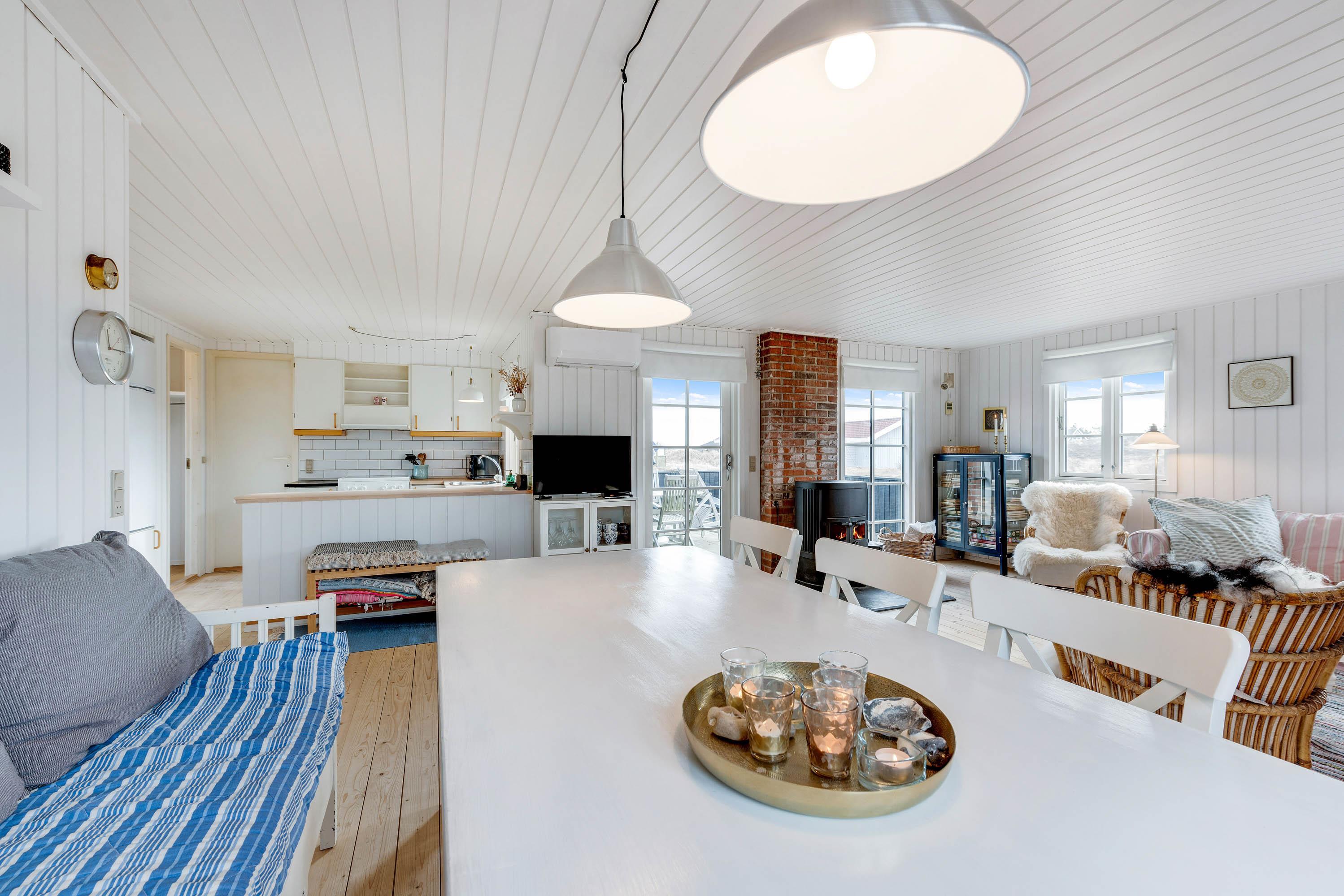 Et virkelig charmerende sommerhus, indrettet i ”rigtig” sommerhus-stil med personlighed og sans for detaljer – perfekt til 4 personer. Huset er hyggeligt og praktisk indrettet med bl.a. kombineret spisestue -opholdsrum – med en praktisk køkkenafdeling. Den åbne og veludrustede køkkenafdeling er bl.a. med 40 l. fryser og mikroovn. Opvaskemaskinen står i bryggerset.