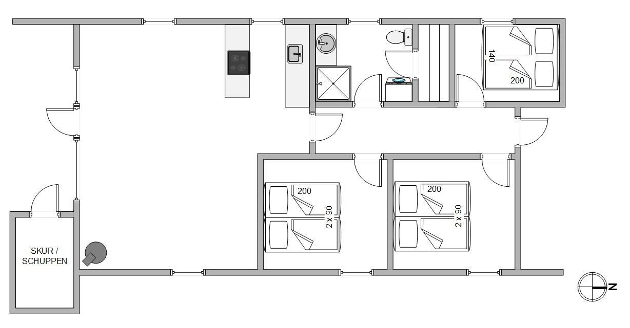 Hjerterummet er uden tvivl alrummet, hvor stue og køkken forenes. Her er plads til hele familien og kombineret med de lyse trælofter til kip og de lyse vægge skabes en lys og venlig atmosfære. Det veludstyrede køkken har mange af hverdagens bekvemmelige som mikroovn, opvaskemaskine og en stor fryser på 90L. Her kan I sammen tilberede de lækreste måltider, som I efterfølgende kan nyde omkring spisebordet. Efterfulgt af en lækker middag, står den på sofahygge. Sæt jer godt til rette i den behagelige sofa med en god bog eller fælles om et brætspil. På de køligere aftner inviterer sofaen til filmhygge, mens brændeovnen knitrer i baggrunden. Fra stuen har I adgang til terrassen mod syd. Desuden byder sommerhuset på gratis internet, vaskemaskine samt tørretumbler – superpraktisk og fleksibelt, hvis man har småbørn.