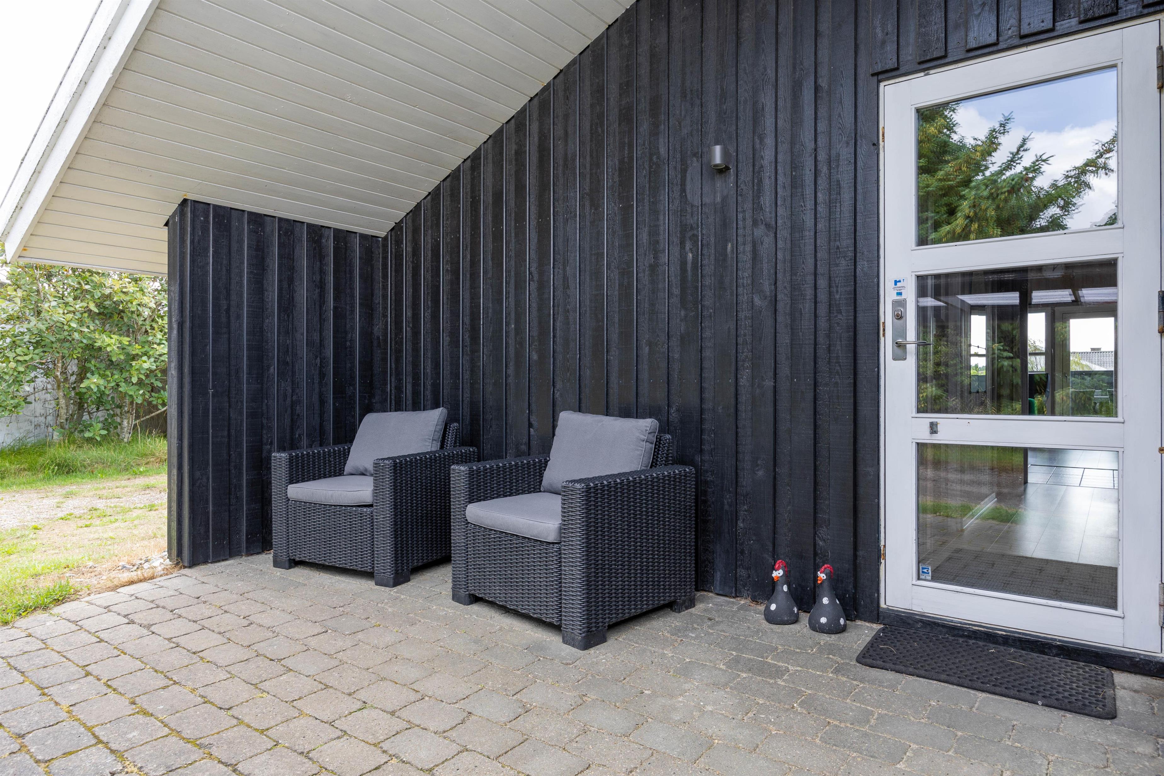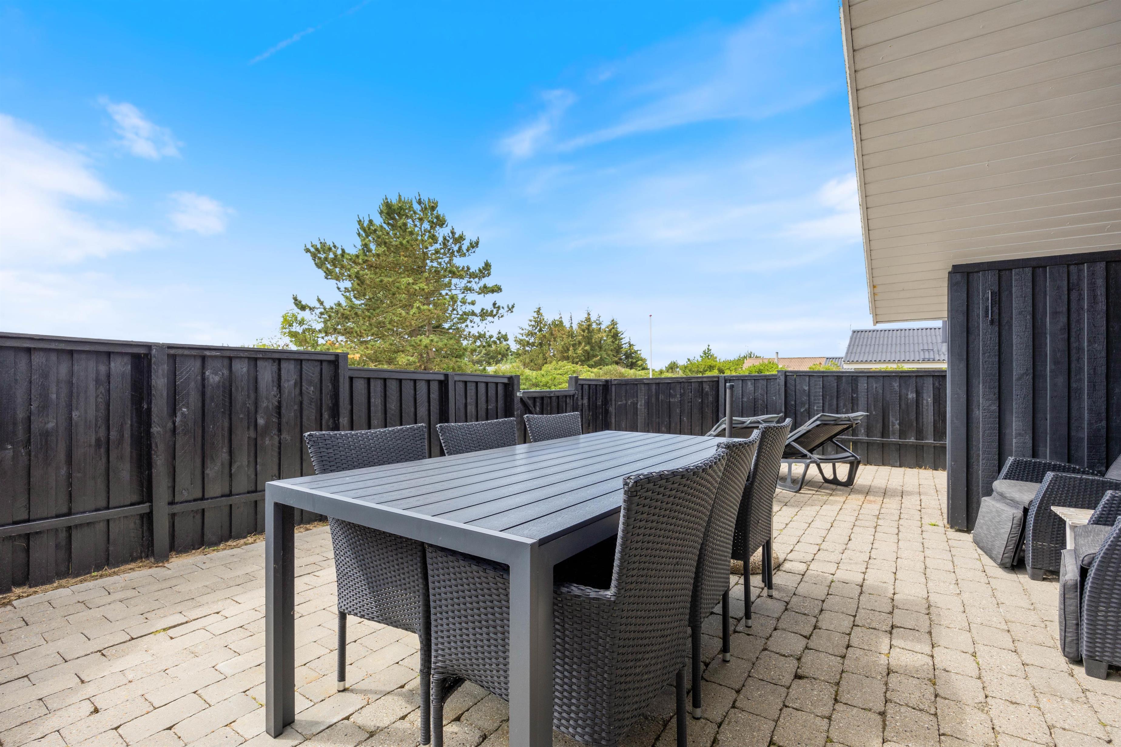 Til sommerhuset hører 2 terrasser. Den store terrasse mod syd er lukket og strækker sig nogle meter om huset mod vest. Mod syd er den delvist overdækket og derfor særdeles velegnet til grillaftener i de lune måneder. Her kan børnene og hunden trygt bevæge sit frit uden bekymringer. Mod nord, mellem indgangspartiet til feriehuset og carporten, findes den anden terrasse. Også her er det delvist overdækket og et fantastisk sted at nyde morgenkaffen.