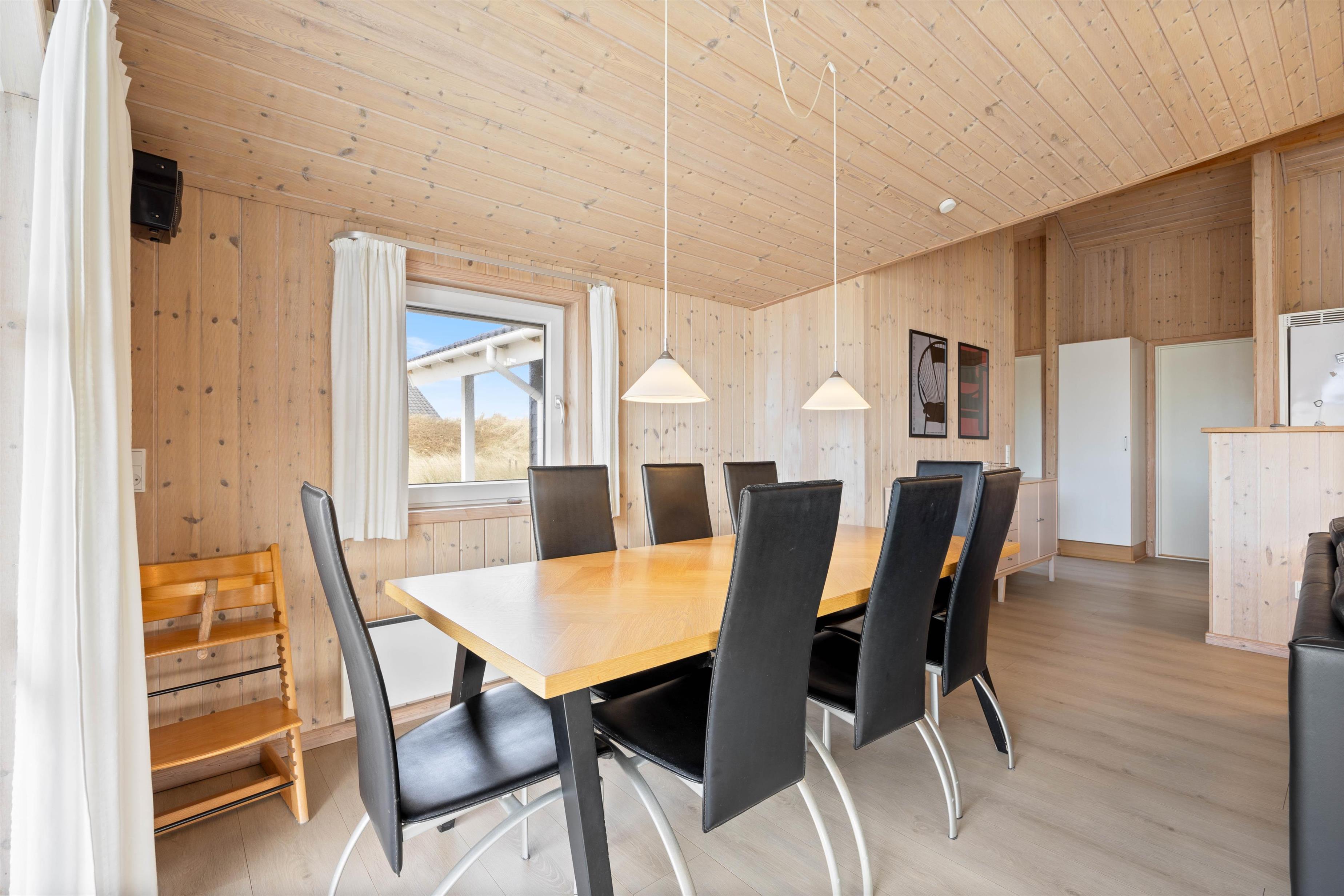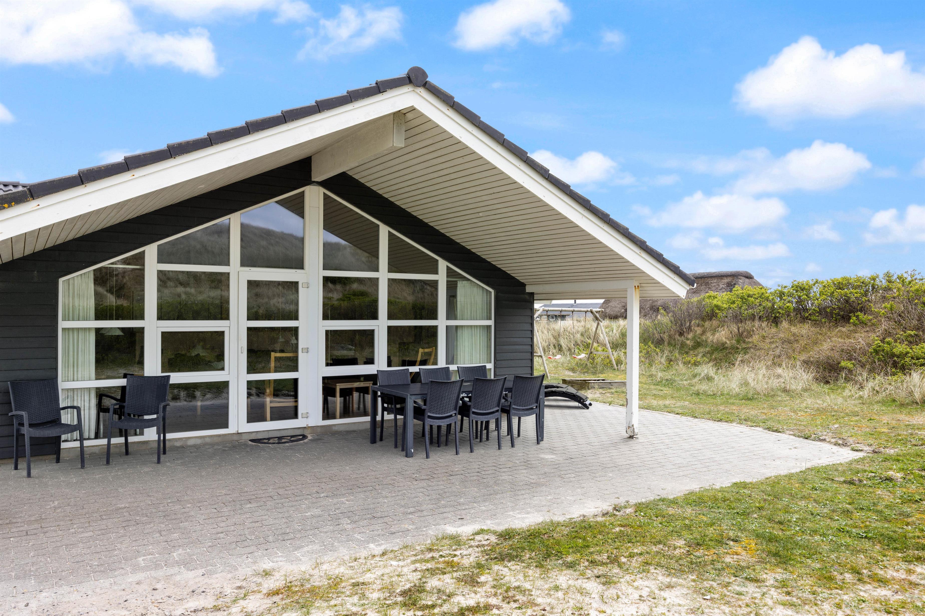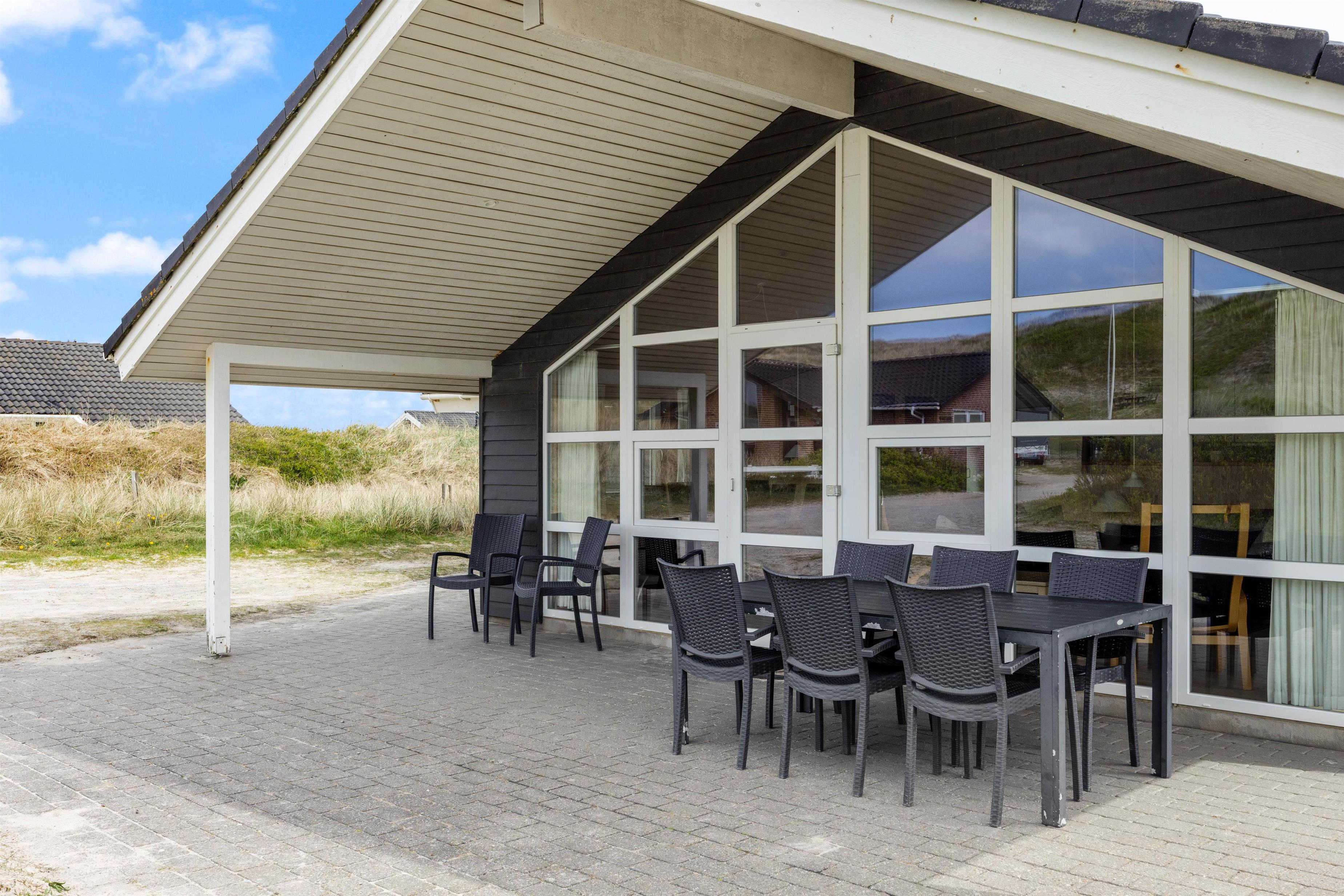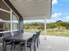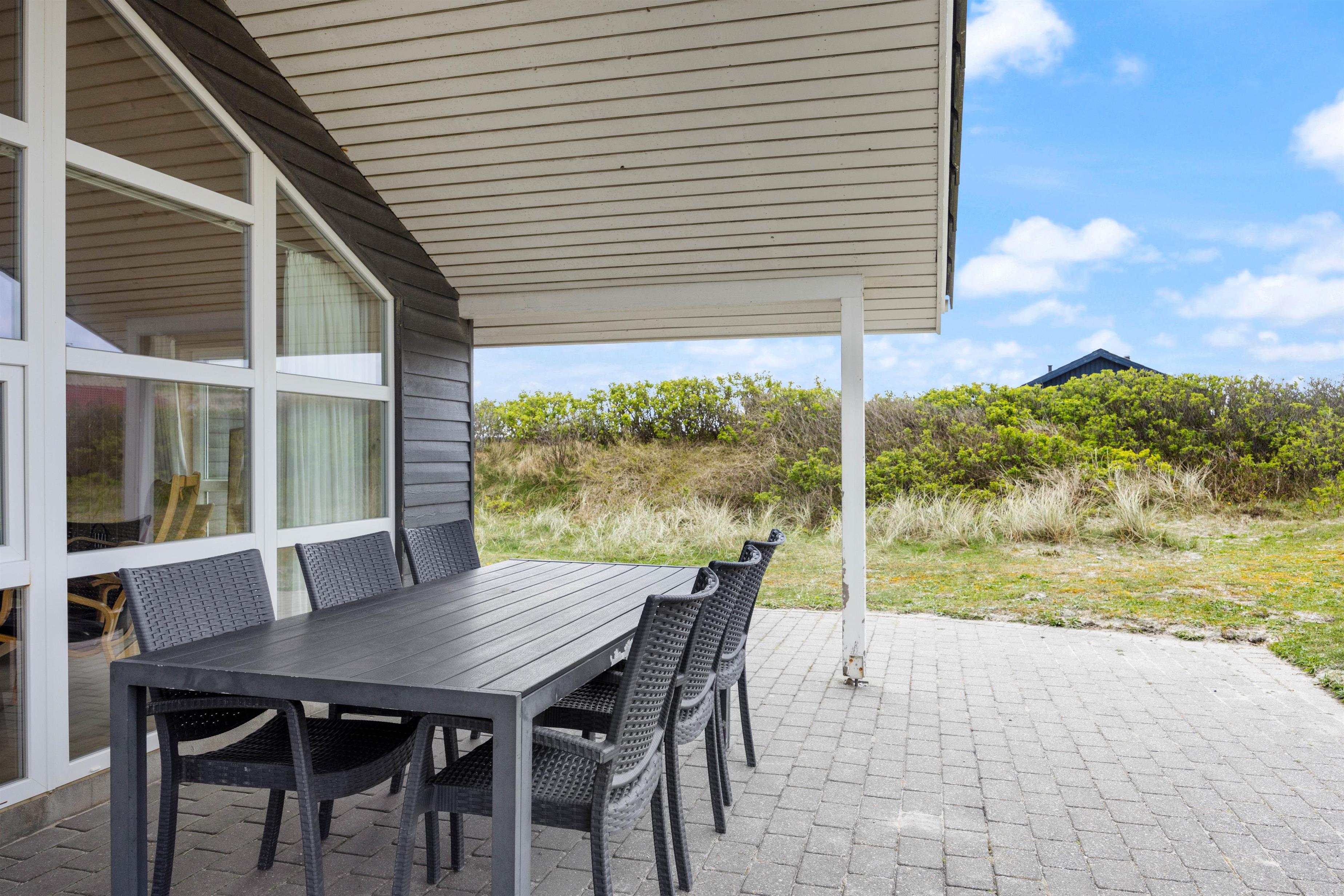 På den store, åbne og delvist overdækkede terrasse kan du nyde udsigten til klitterne. Sommerhuset er naturligt afskærmet, så du ikke bliver forstyrret af nysgerrige blikke. Terrassen er udstyret med liggestole, havemøbler og grill. Her er desuden opstillet gynge og sandkasse til de mindste.