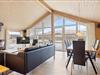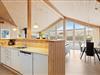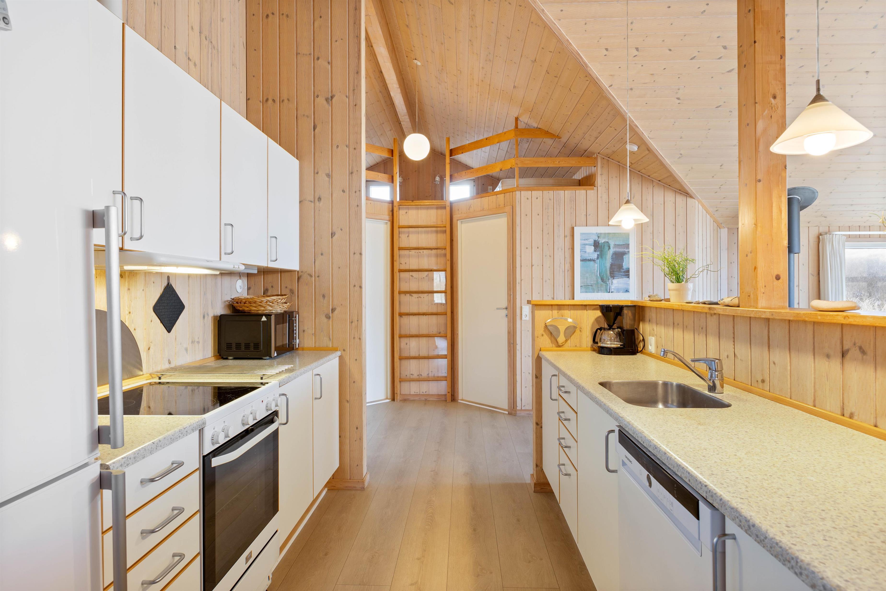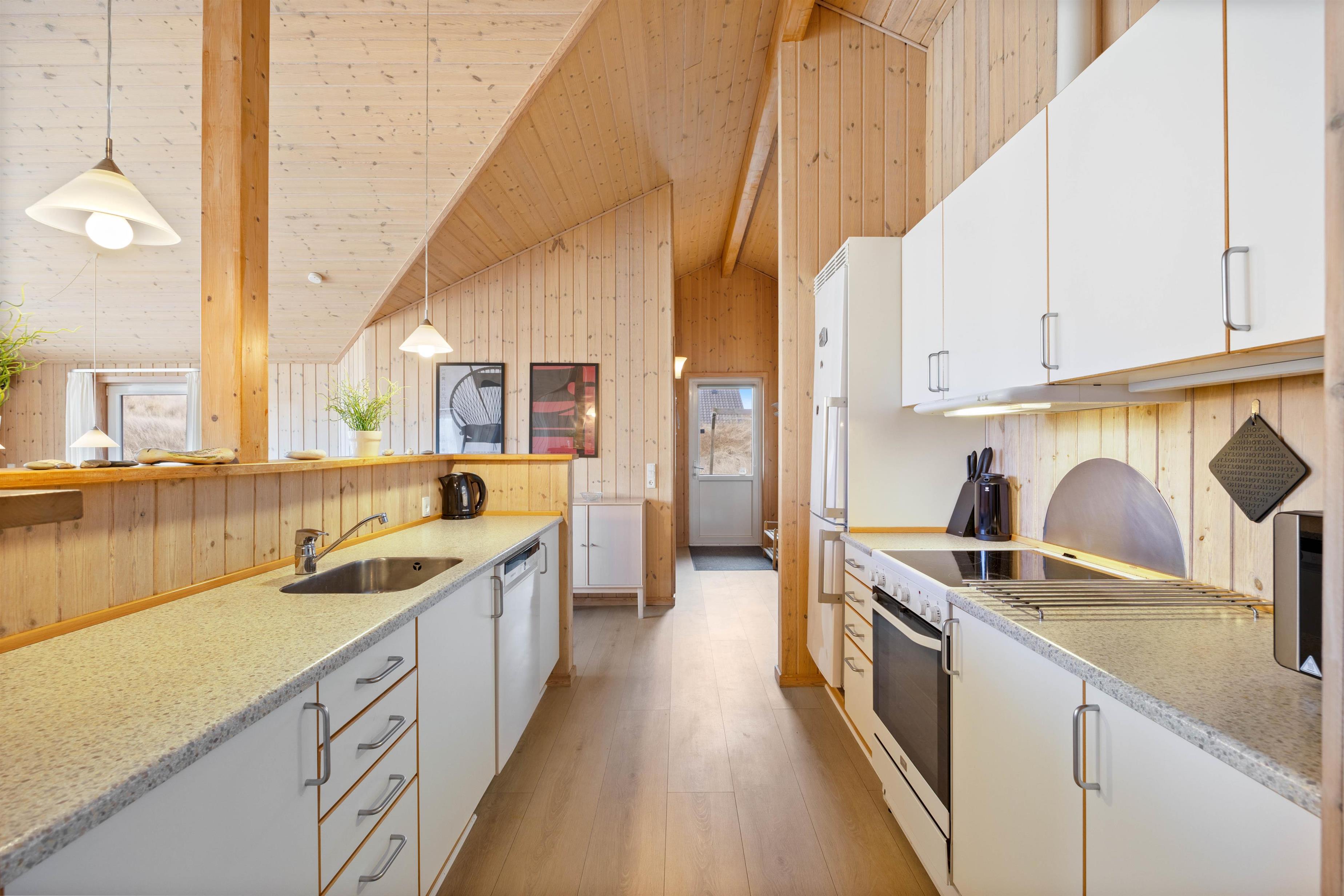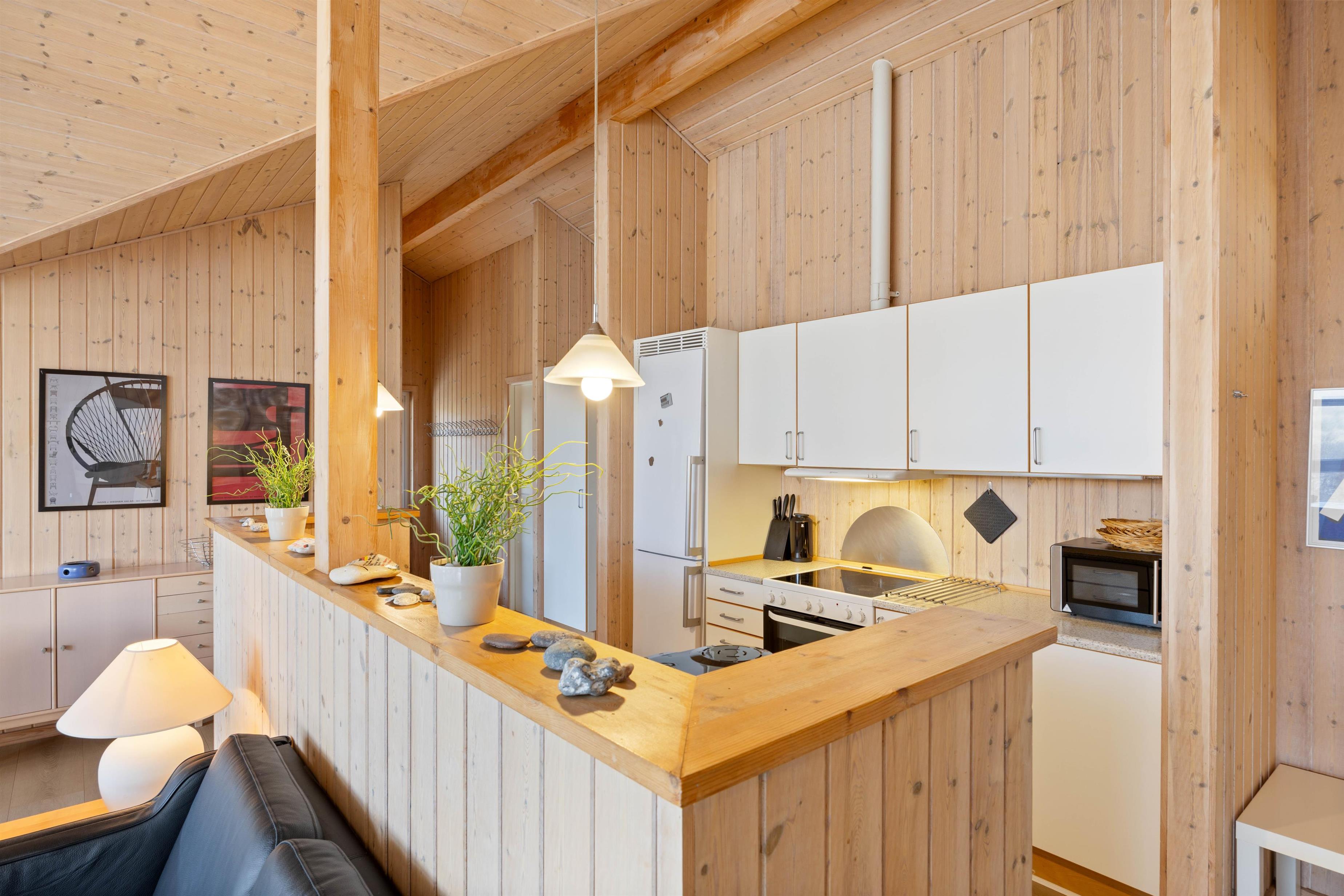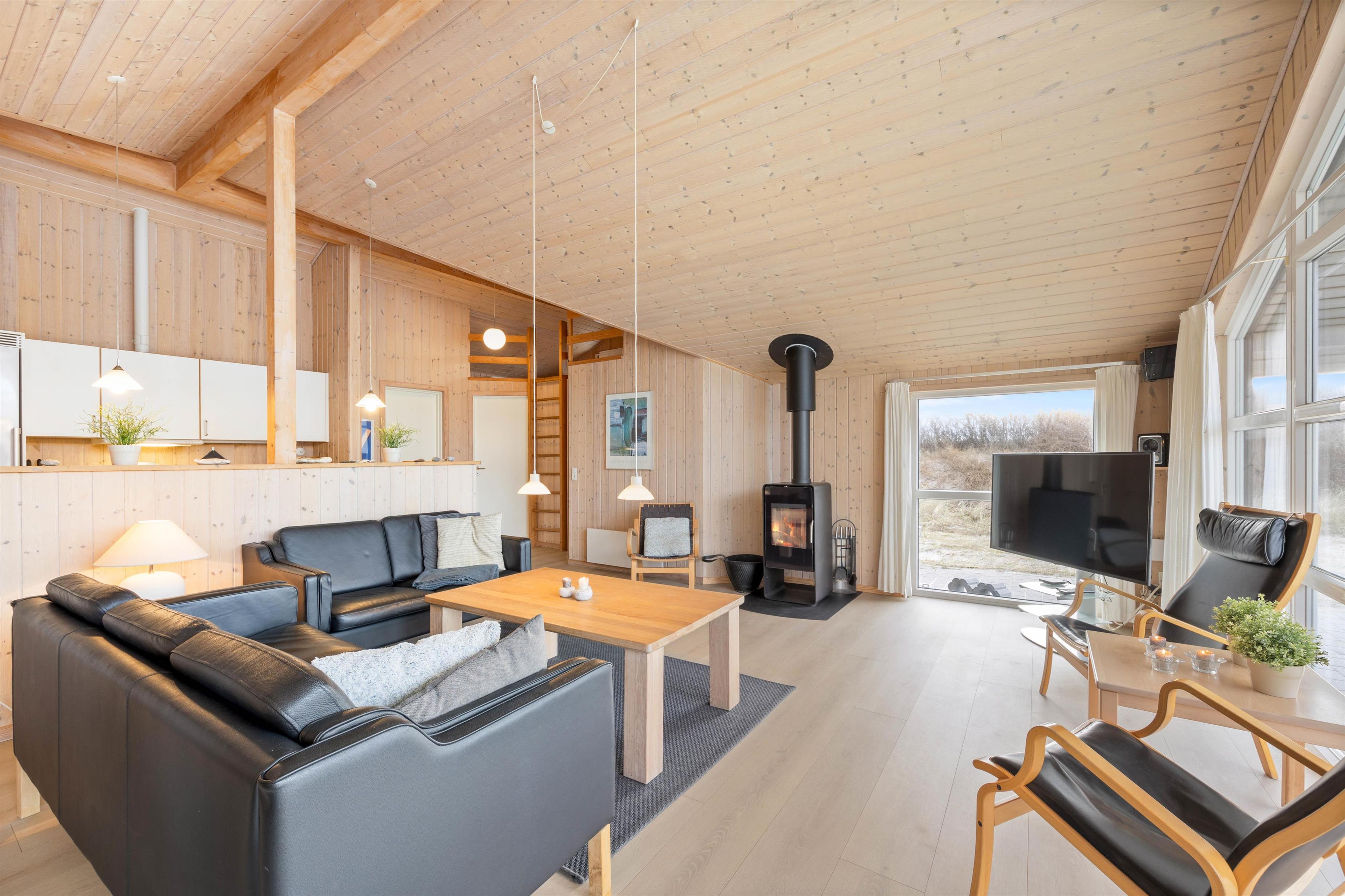 Sommerhuset har et praktisk indrettet køkken, udstyret med køle/fryseskab, glaskeramisk komfur, opvaskemaskine og mikroovn. Køkkenet står i åben forbindelse med den store, lyse stue. Stuen er indrettet med pæne, komfortable møbler, brændeovn og trægulve. Sommerhusets 55? fladskærms-TV er et Smart TV med internetadgang.