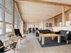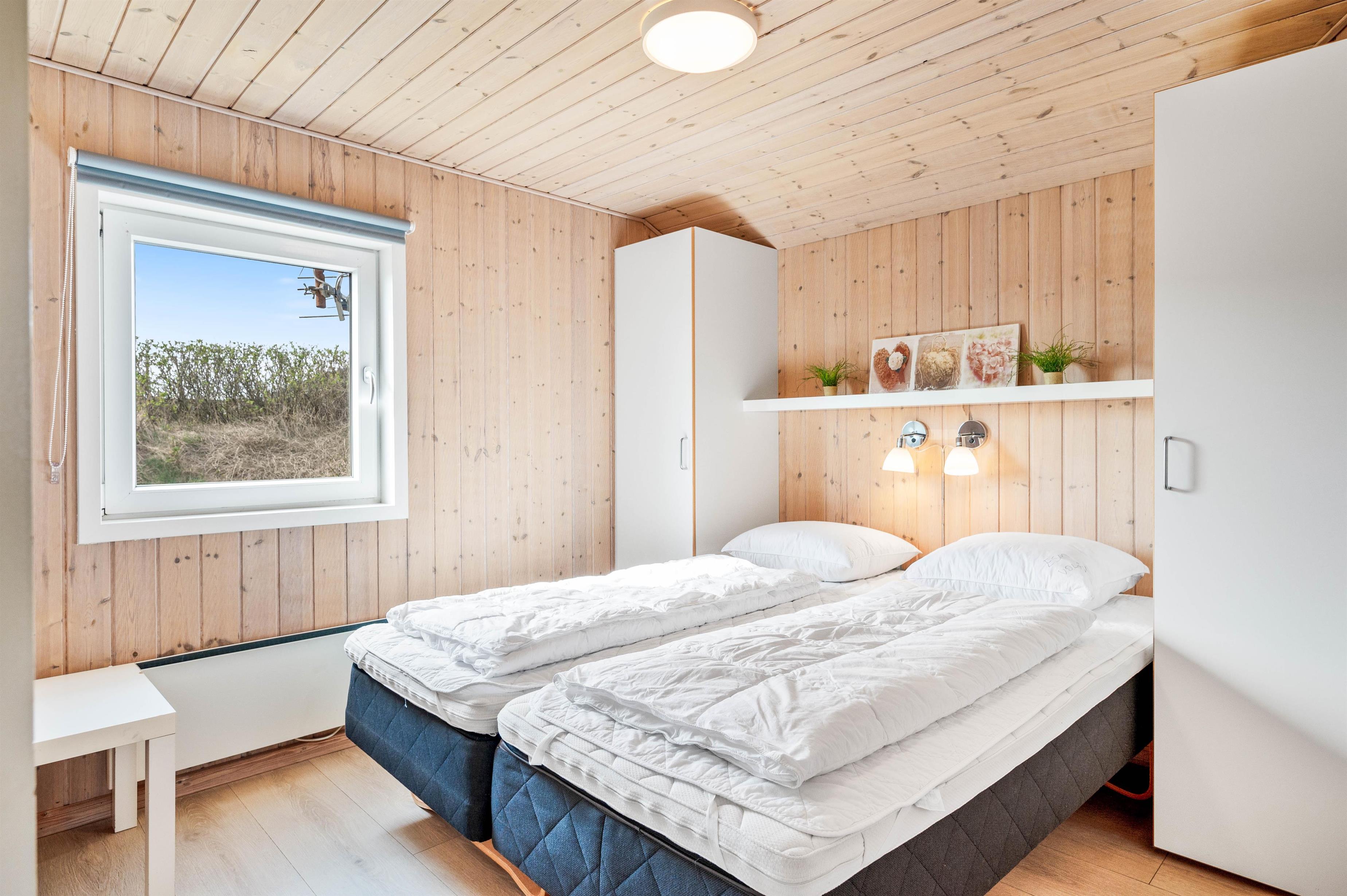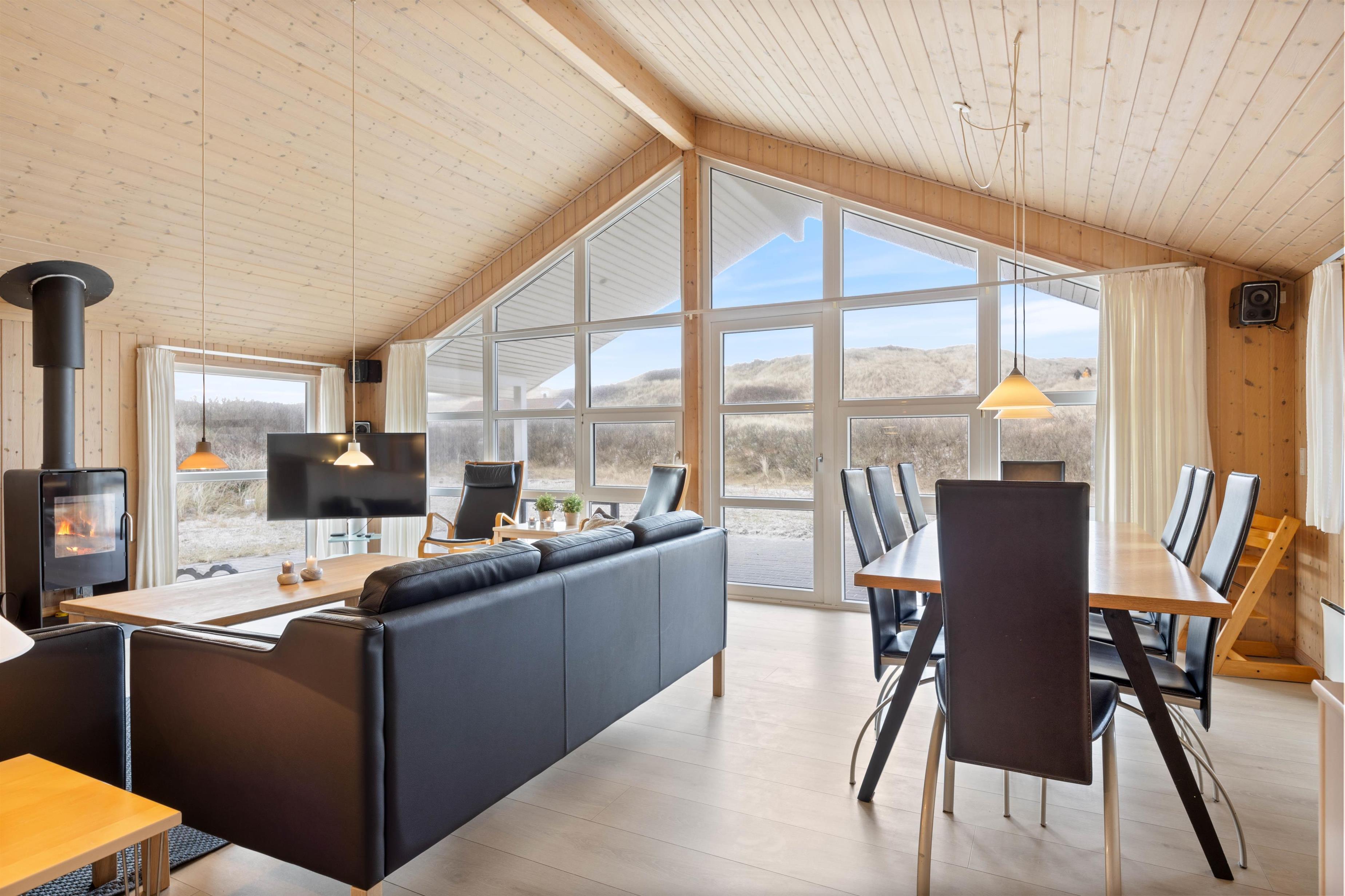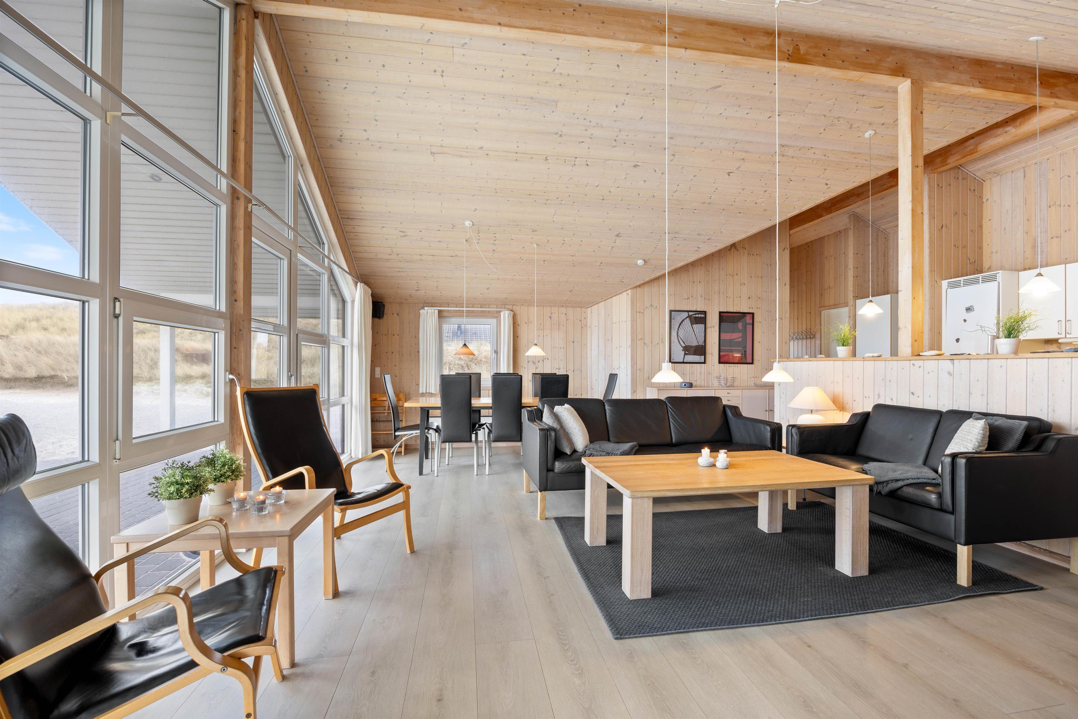 Sommerhuset er stort og indbydende med masser af lysindfald gennem de store vinduespartier og åbent til kip i opholdområdet. Her er plads til 8 personer. De 4 soveværelser er alle udstyret med dobbelte boksmadrasser og har trægulve.