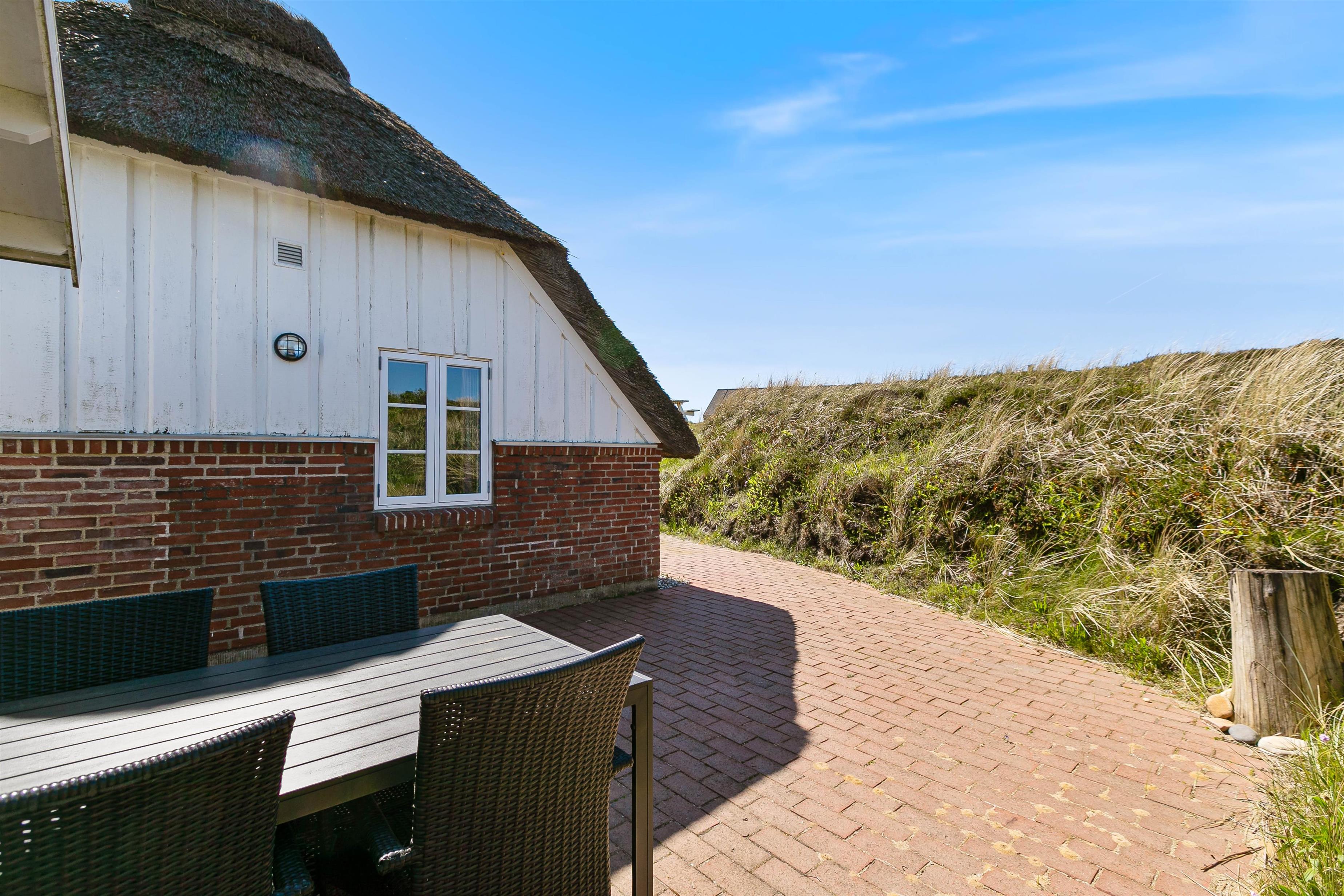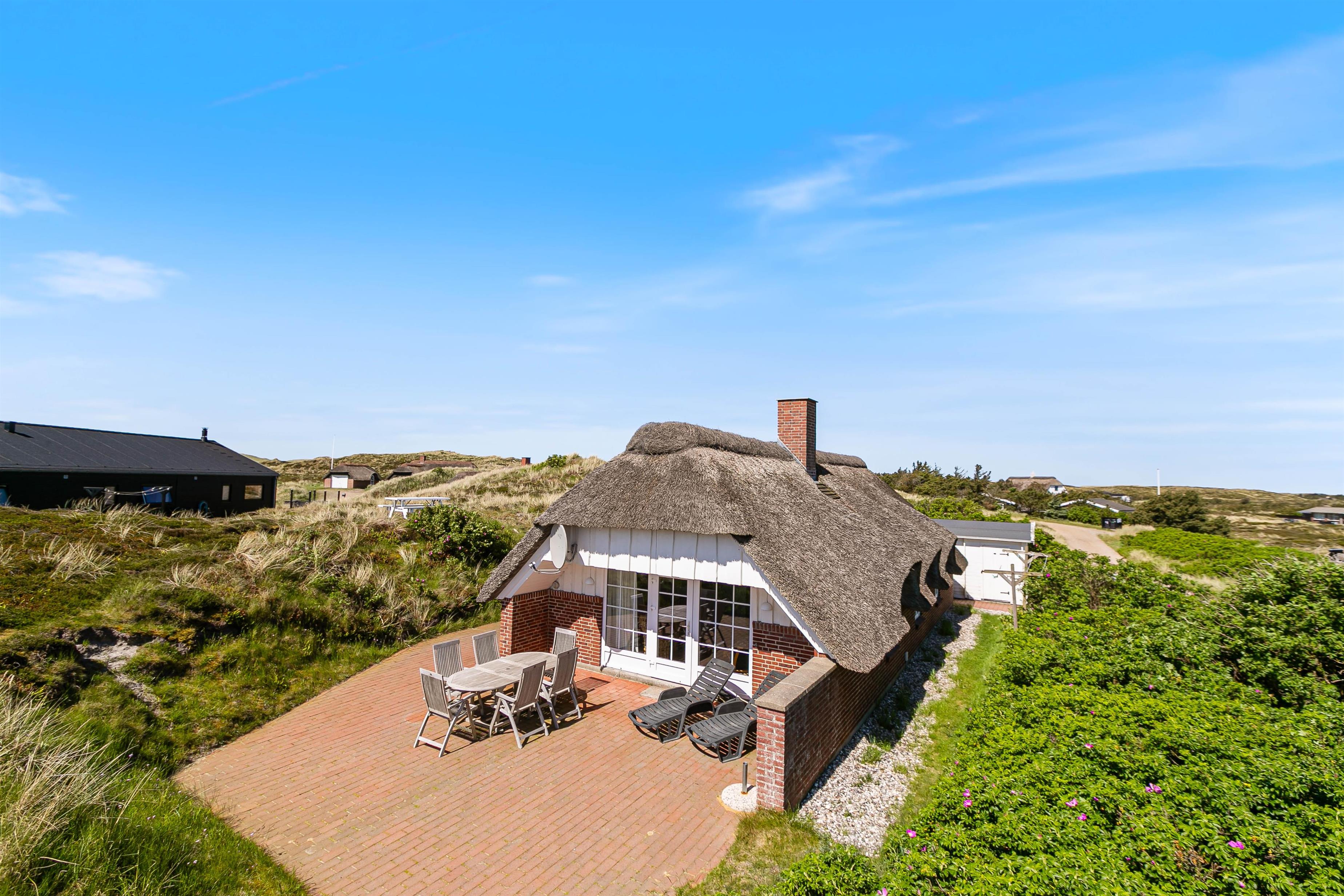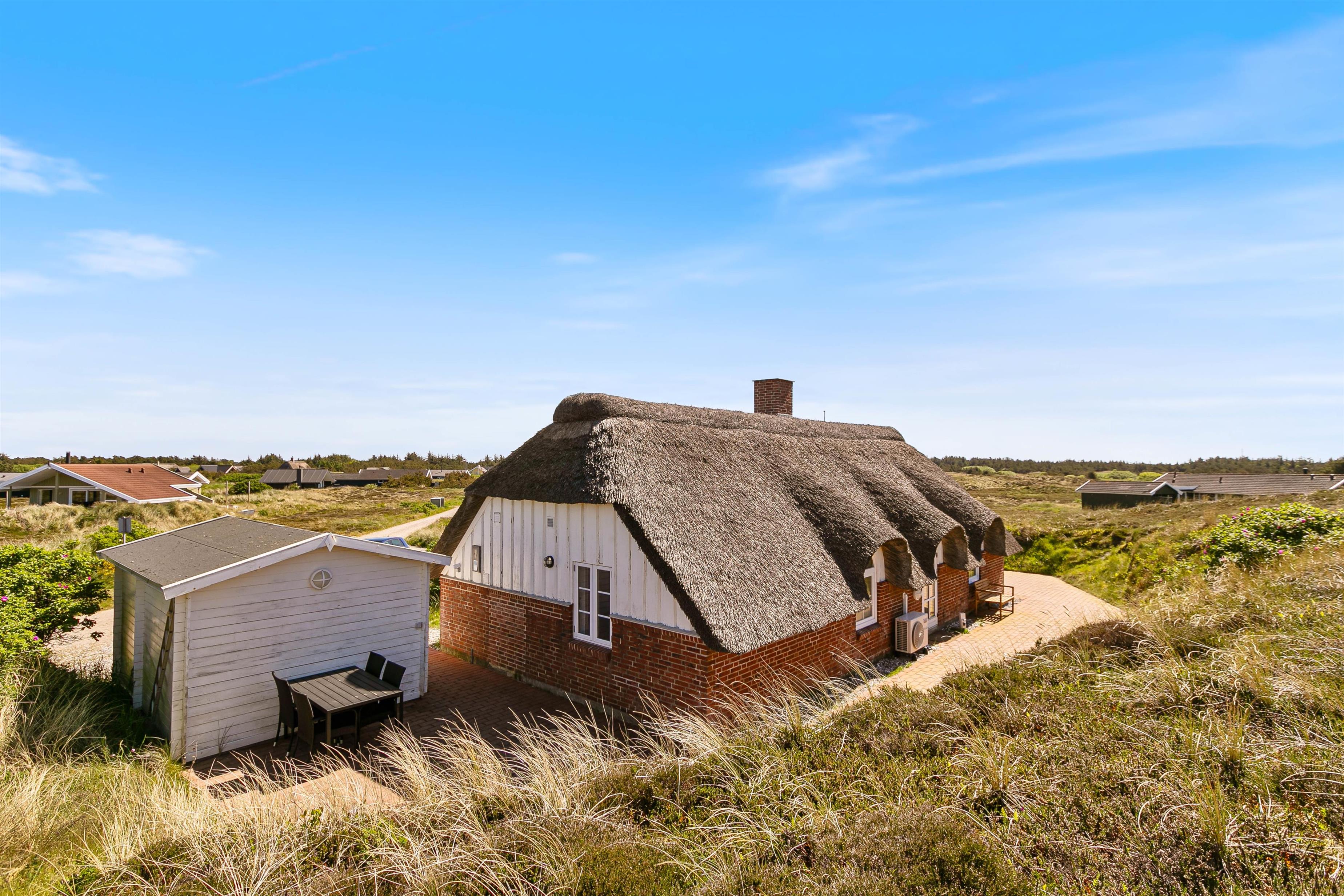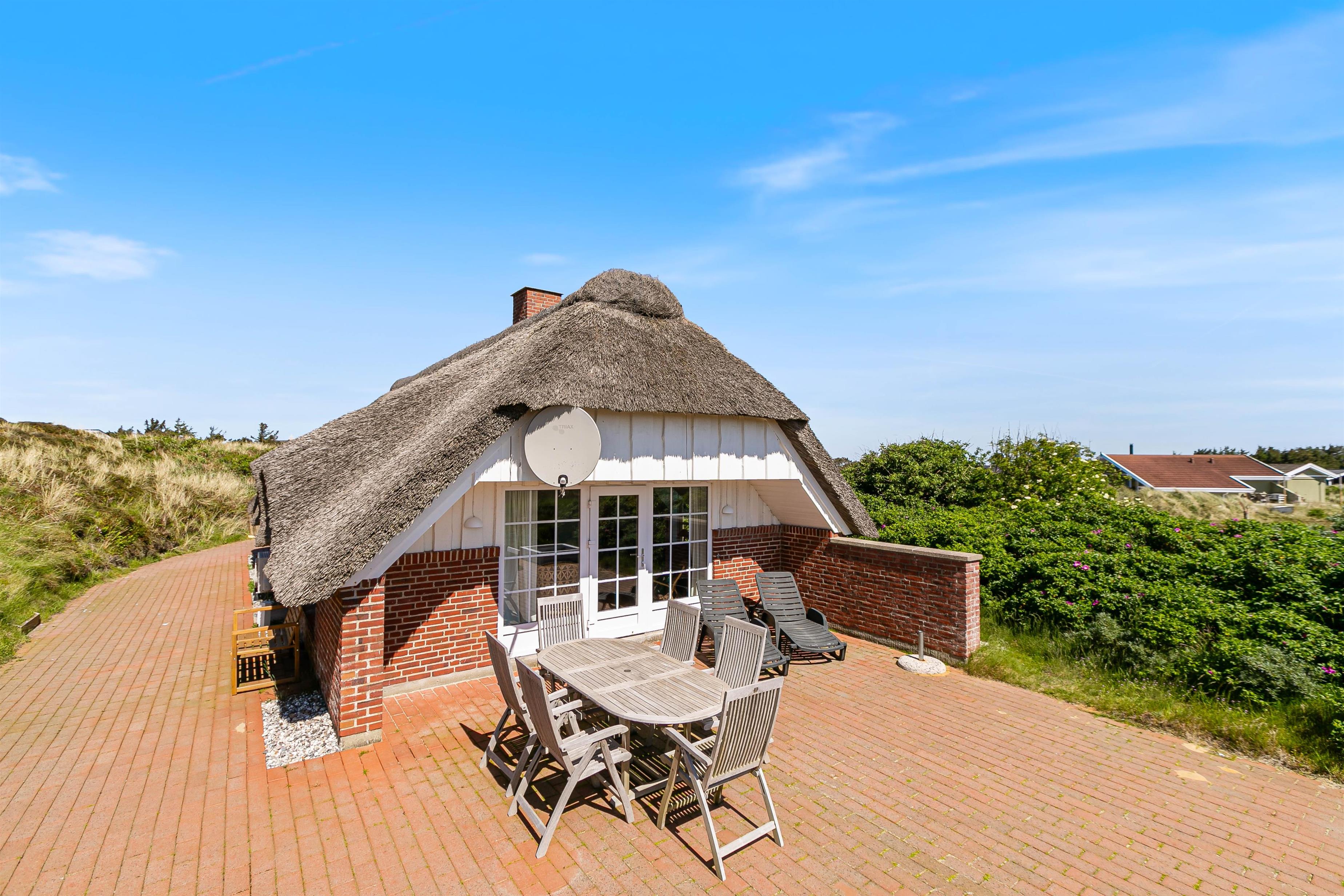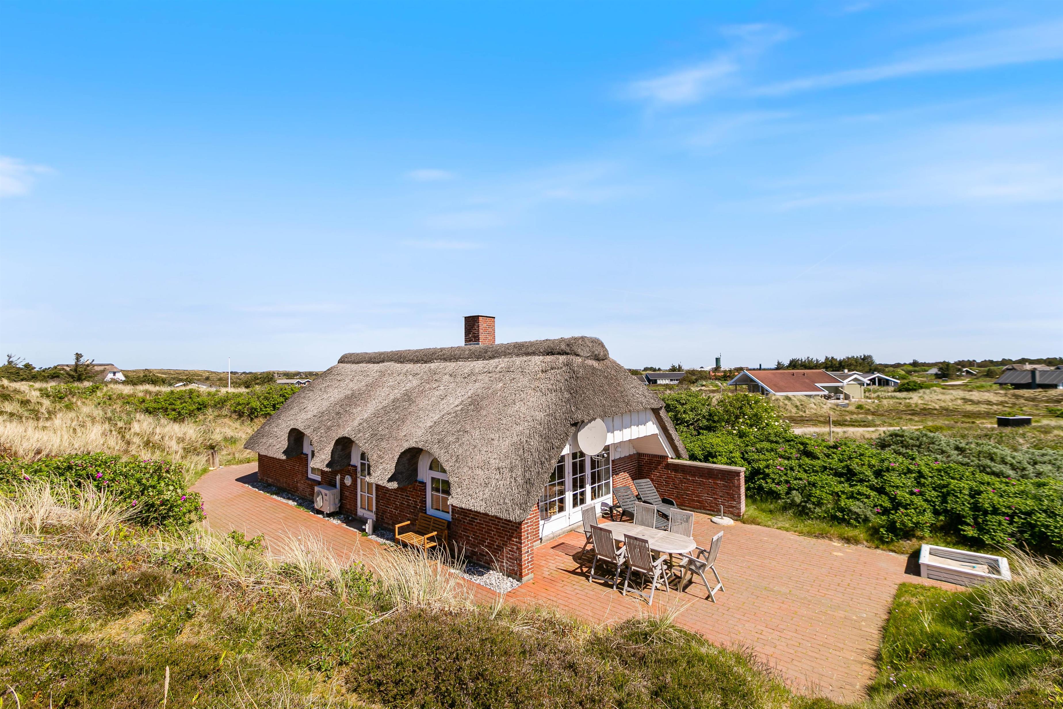 På en stor ugeneret klitgrund midt i den smukke natur på vestkysten ligger dette totalrenoverede, stråtækte feriehus. Her er altid mulighed for at finde en læfyldt krog, hvor man i ro og fred kan nyde solen og den friske luft på den godt møblerede og store terrasse, der går næsten hele vejen rundt om huset.