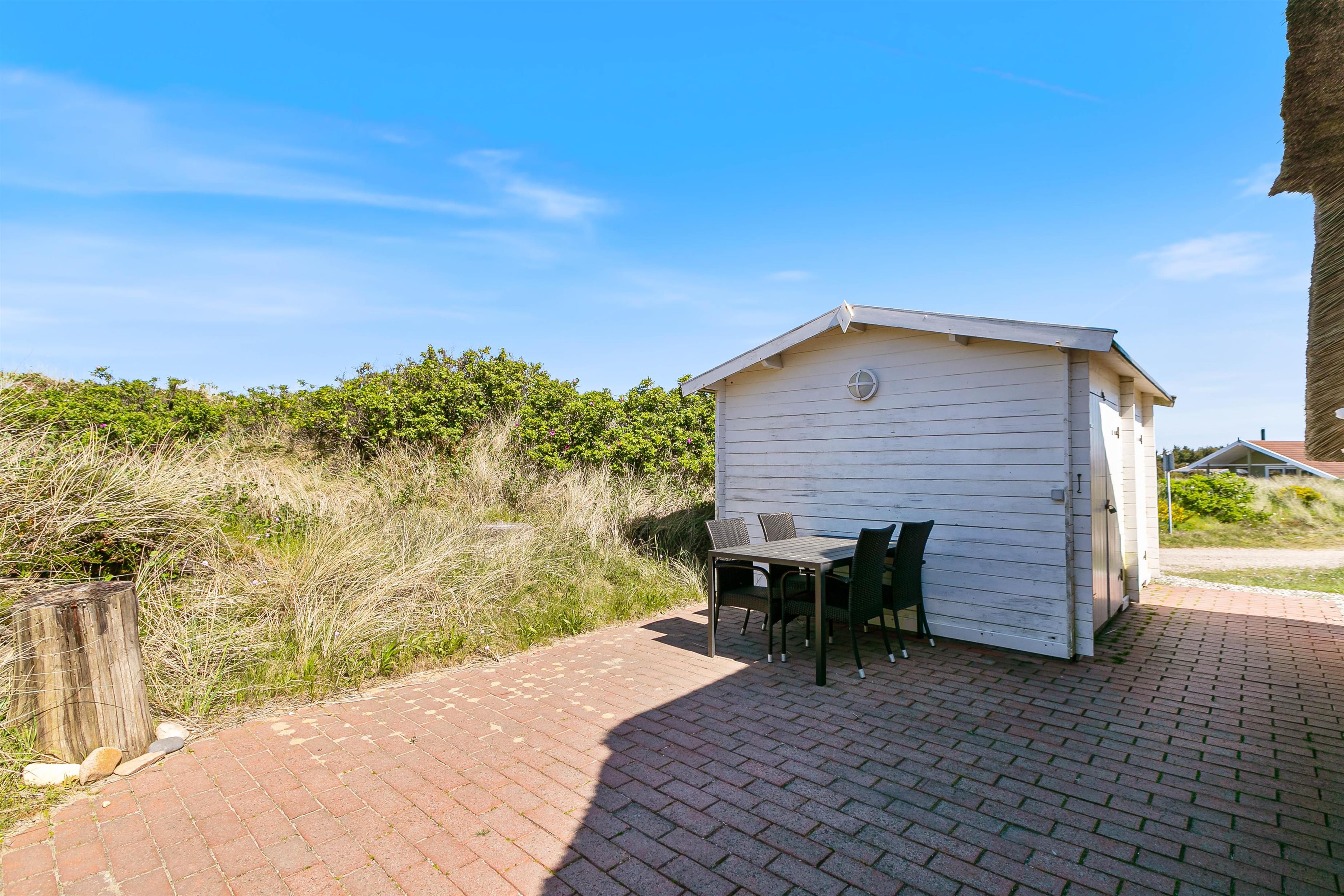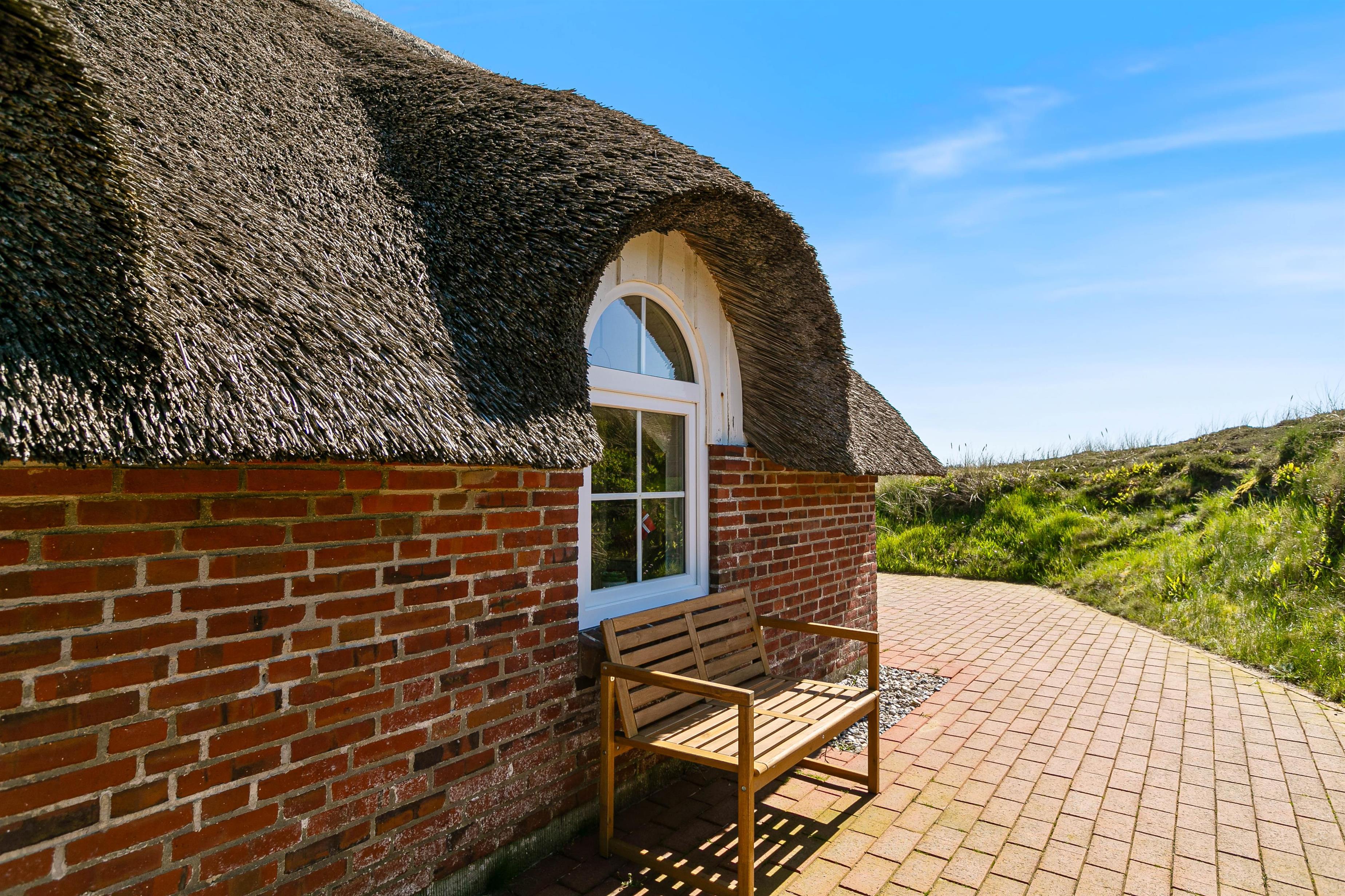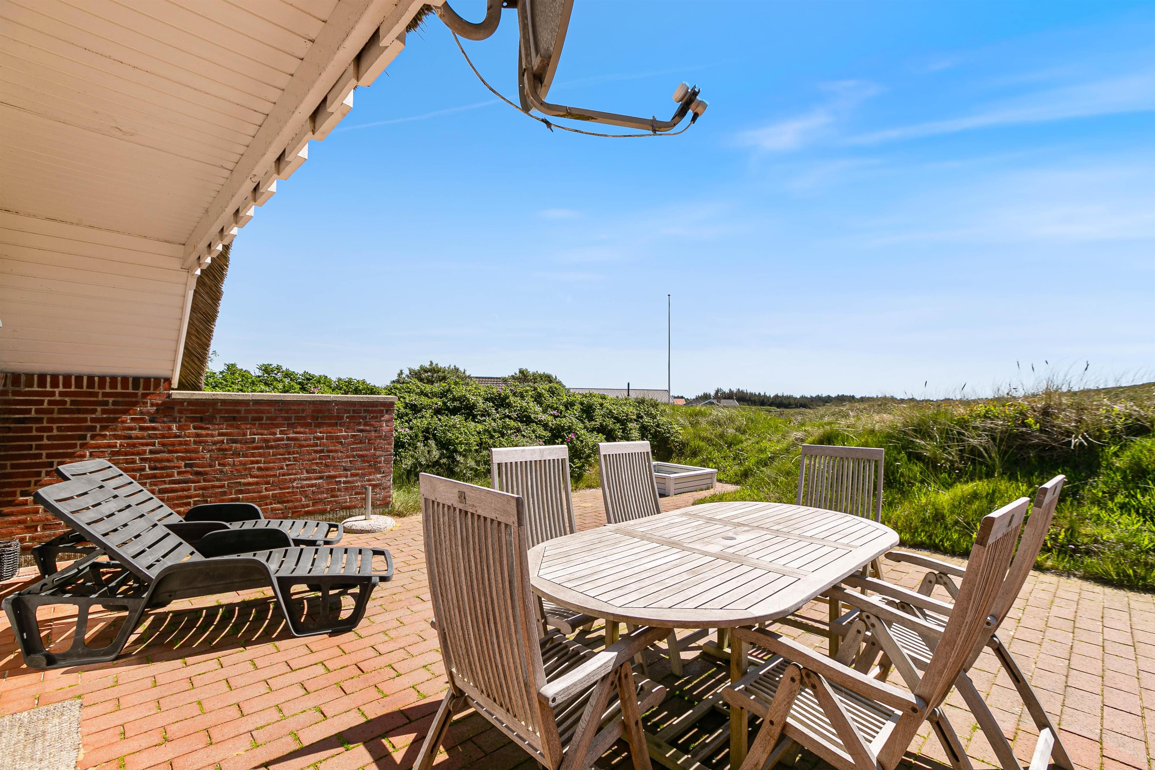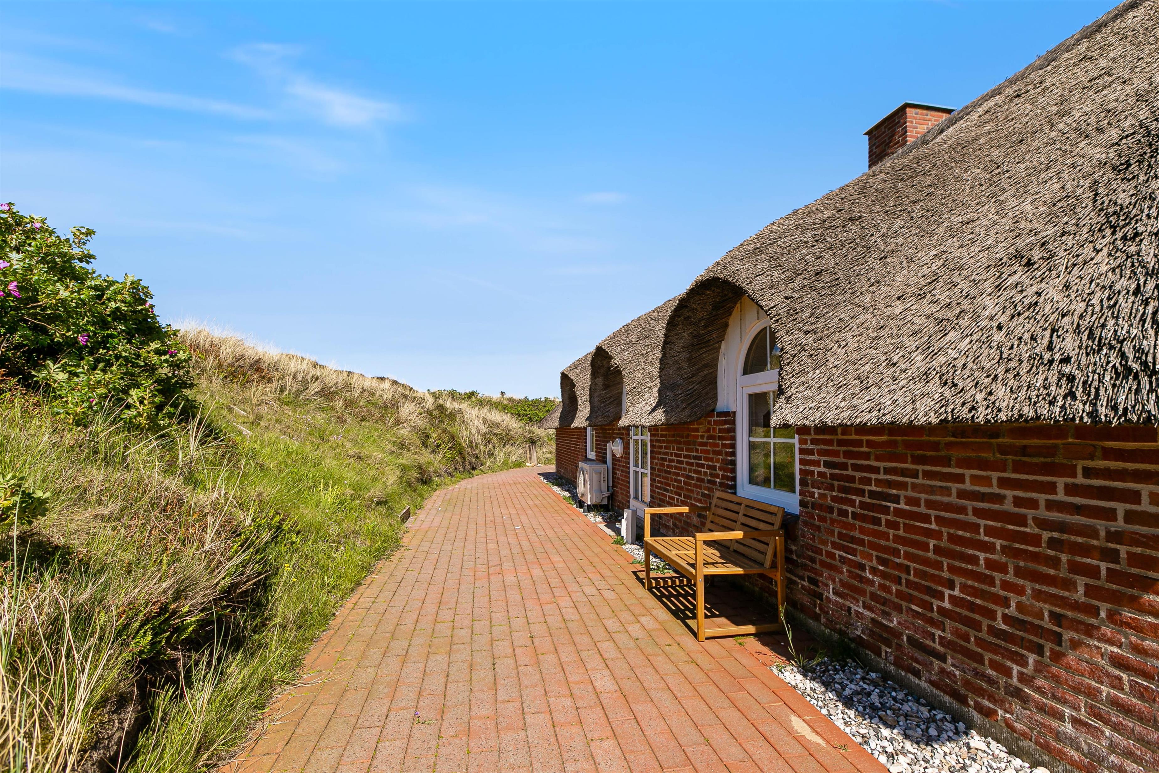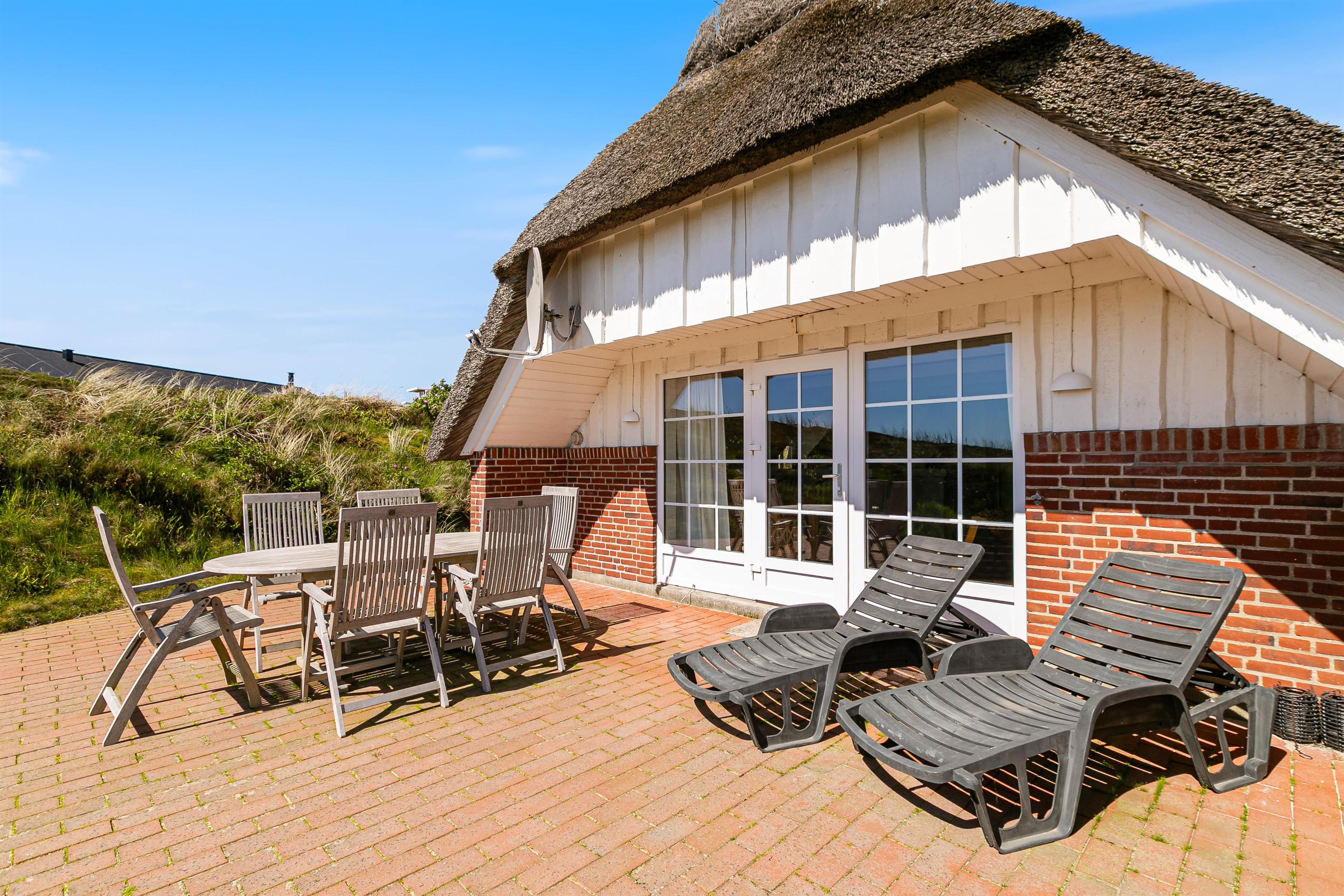 På en stor ugeneret klitgrund midt i den smukke natur på vestkysten ligger dette totalrenoverede, stråtækte feriehus. Her er altid mulighed for at finde en læfyldt krog, hvor man i ro og fred kan nyde solen og den friske luft på den godt møblerede og store terrasse, der går næsten hele vejen rundt om huset.