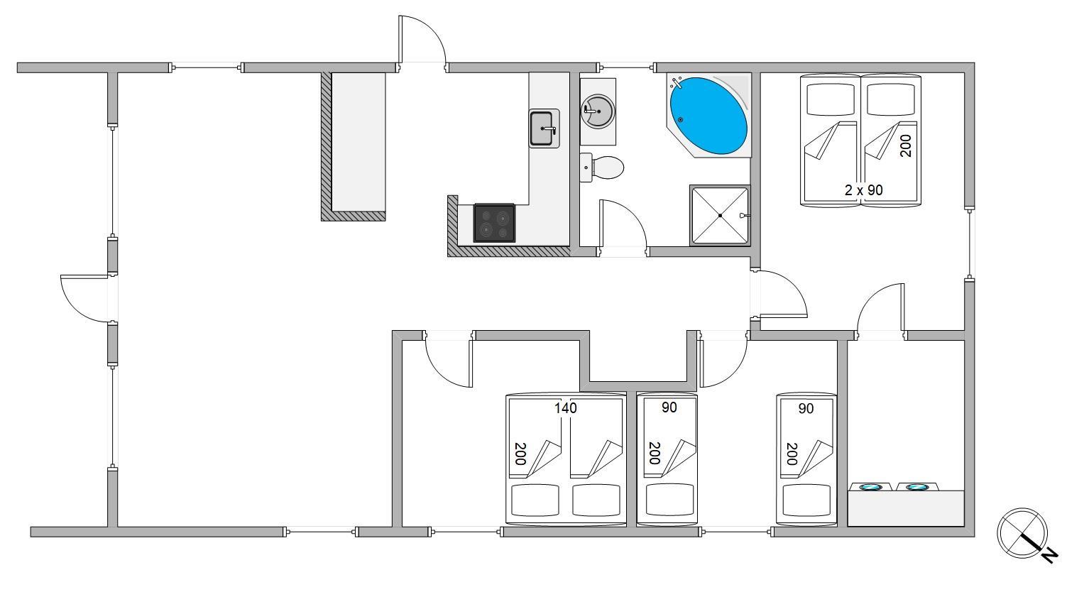 Det lyse badeværelse er udstyret med spa og gulvvarme. Huset byder på gratis opkobling til det trådløse internet. Her er tre gode soveværelser med trægulve og komfortable senge til 6 personer.