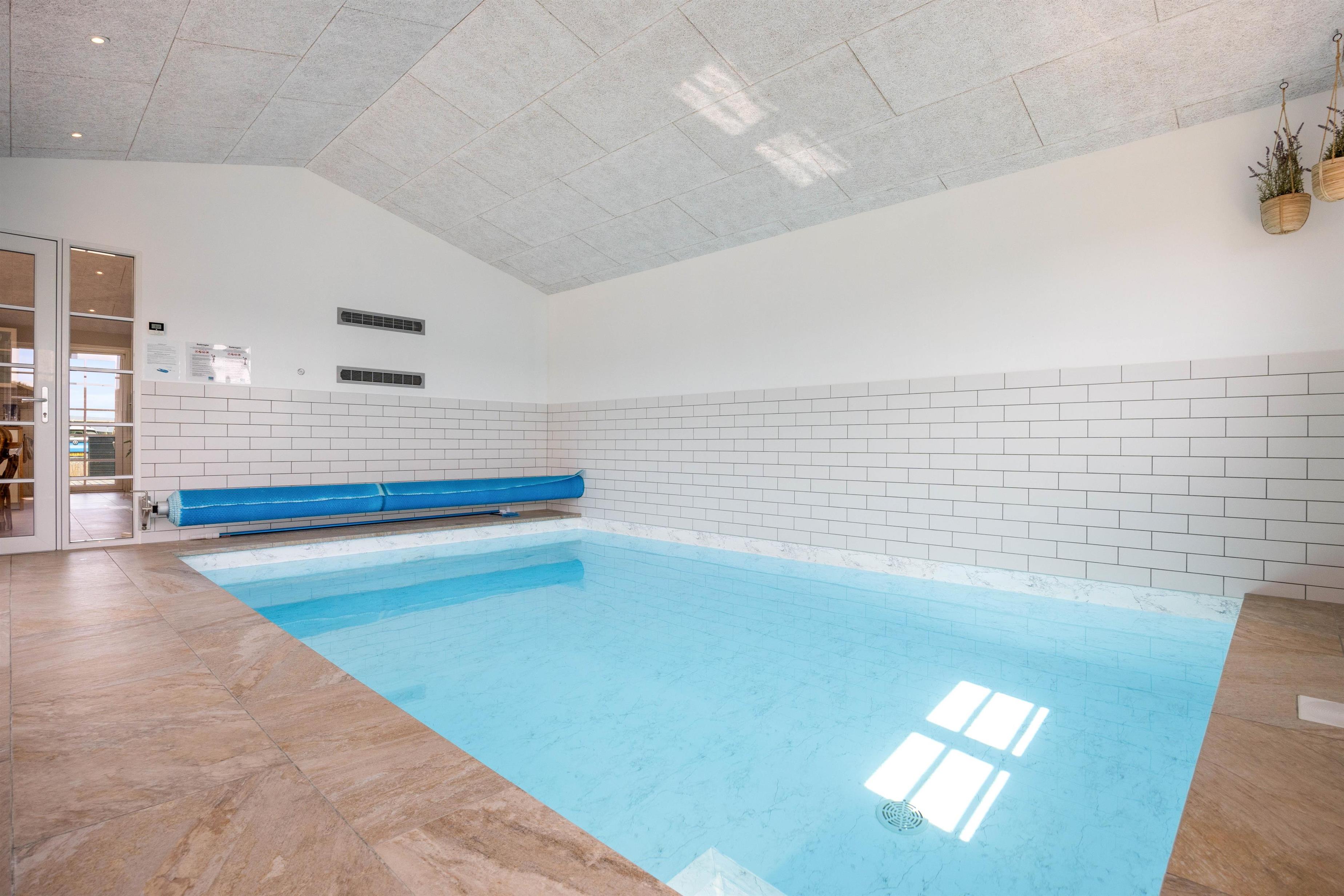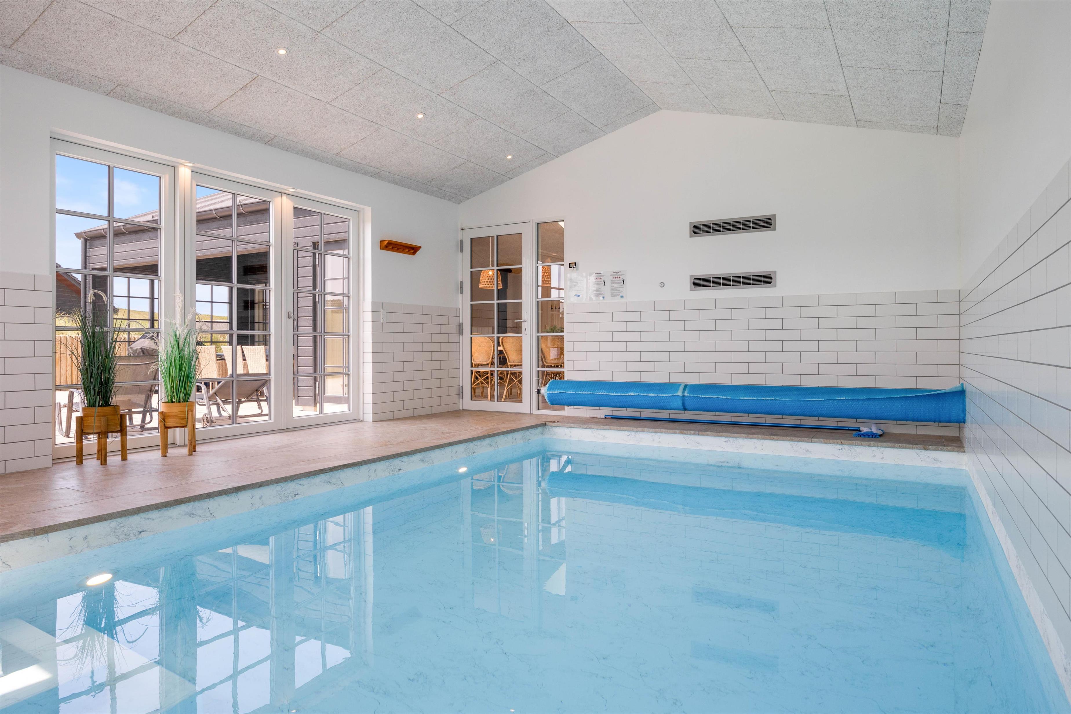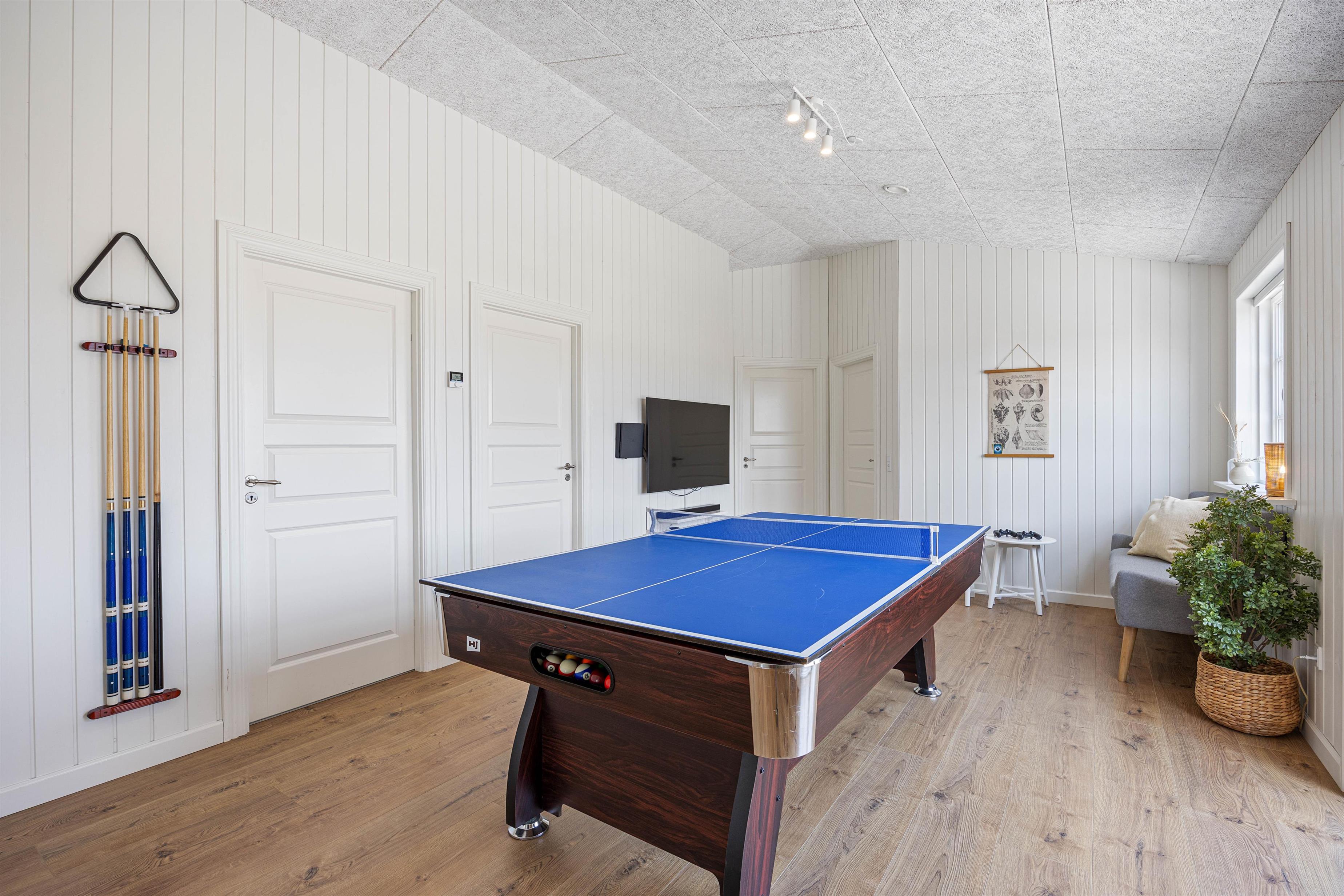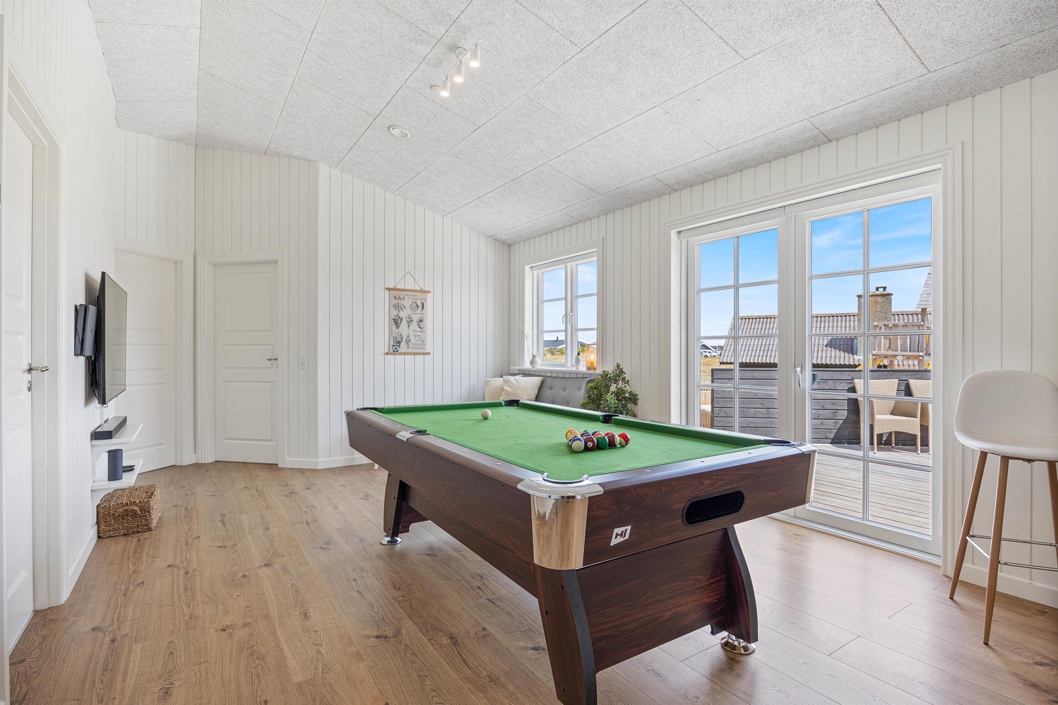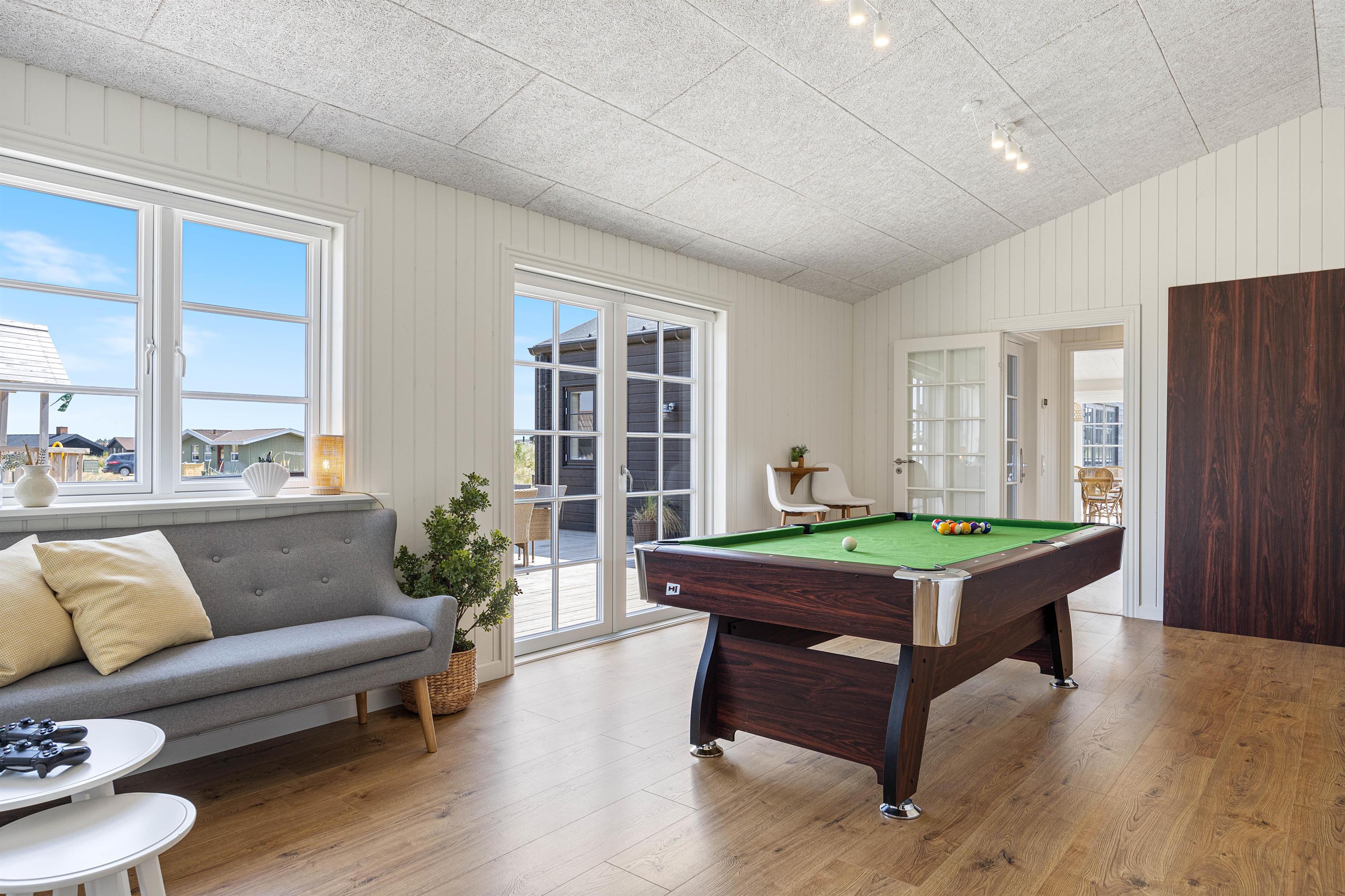 Kan I bruge en dukkert i swimmingpoolen, er den lige ved siden af. Alle aldersgrupper kan i det hele taget være aktive næsten døgnet rundt i dette feriehus, f.eks i det fine aktivitetsrum midt i feriehuset, hvor I kan få gang i energiomsætningen. Afslapning indendørs eller udendørs er også tilgængeligt, enten i de behagelige sofaer og stole eller udendørs i de komfortable møbler. I de fire soveværelser med dobbeltsenge kan I få godt udsovet i den friske vesterhavsluft. De 2 badeværelser gør, at I ikke behøver at stå i kø til morgenbadet.
