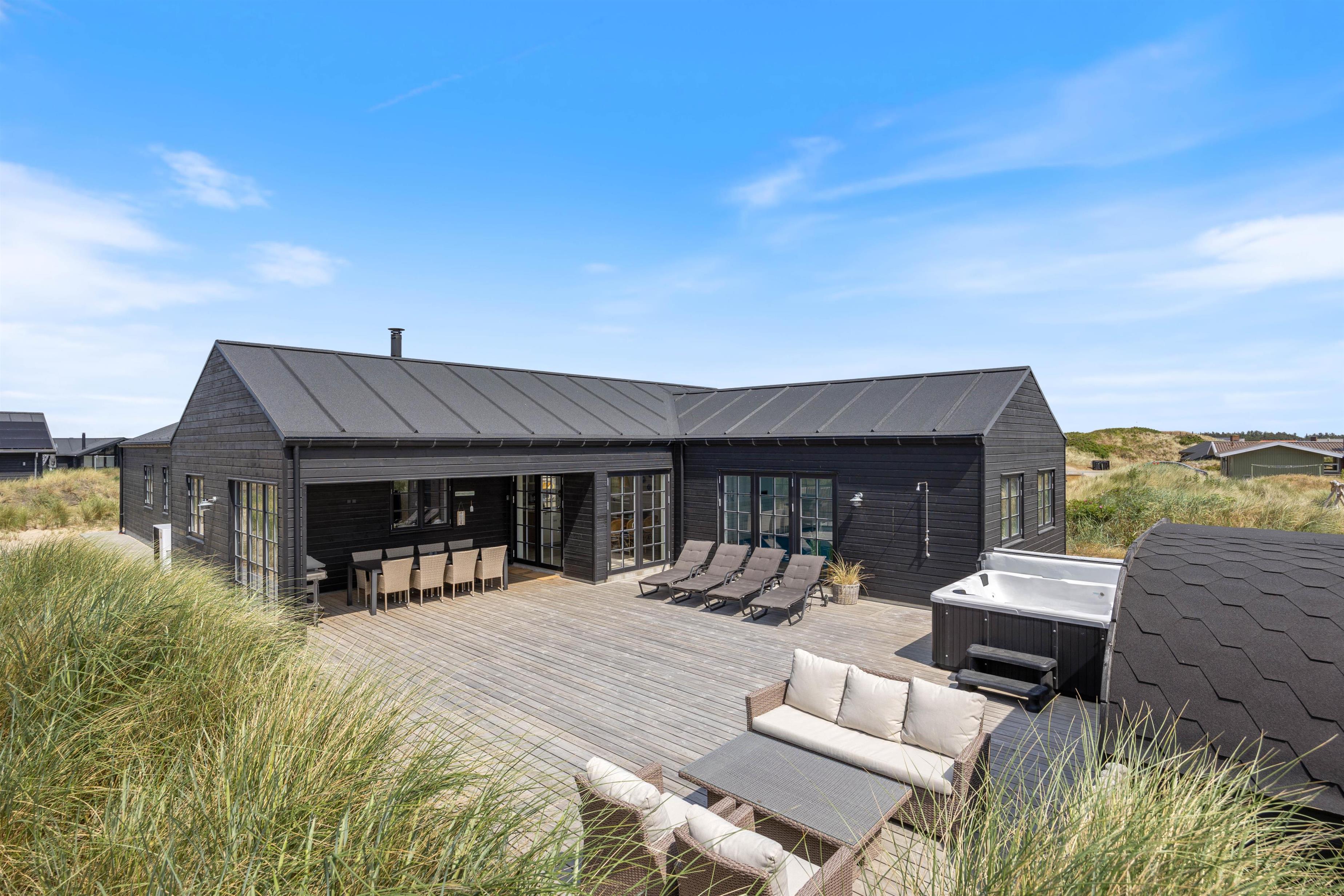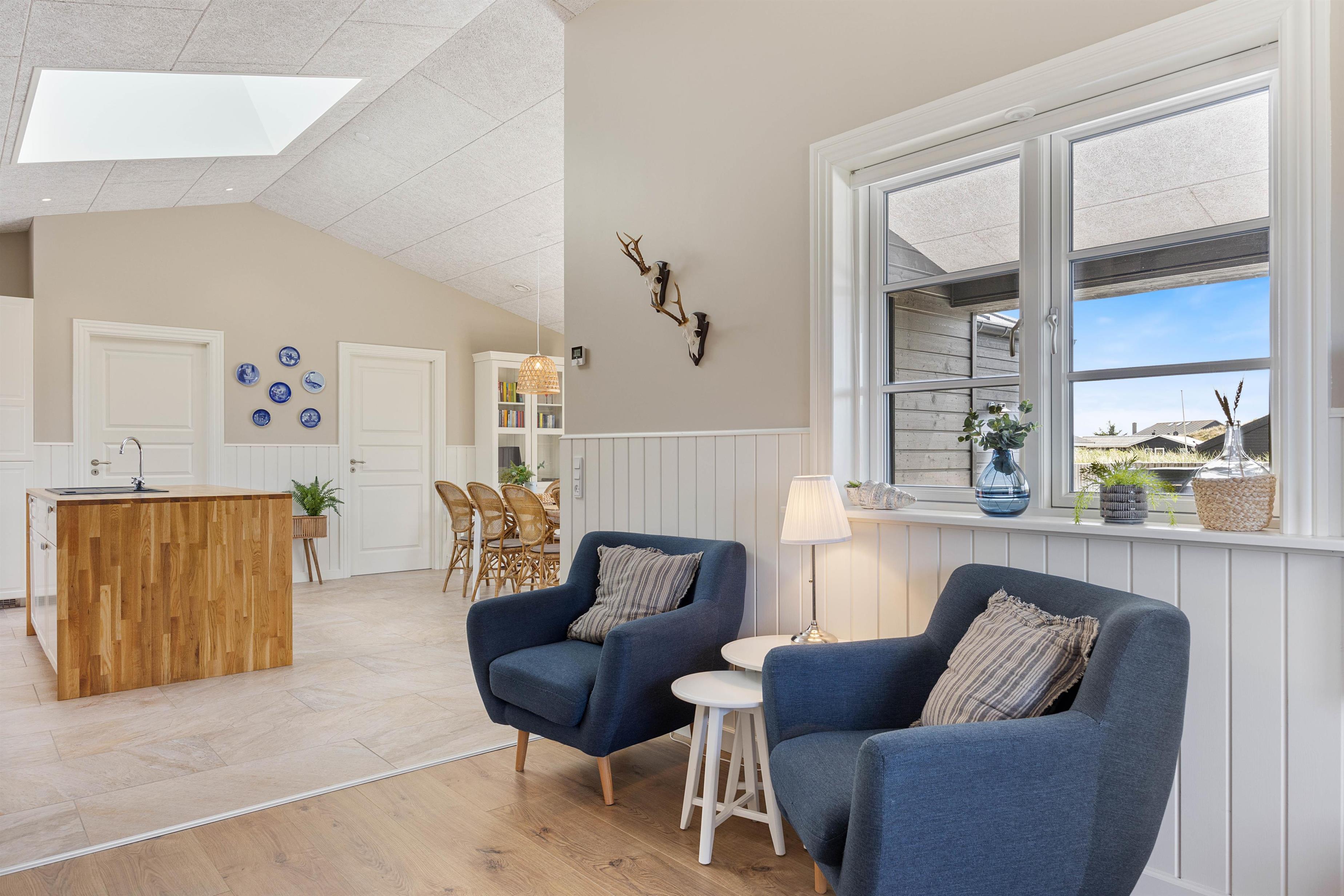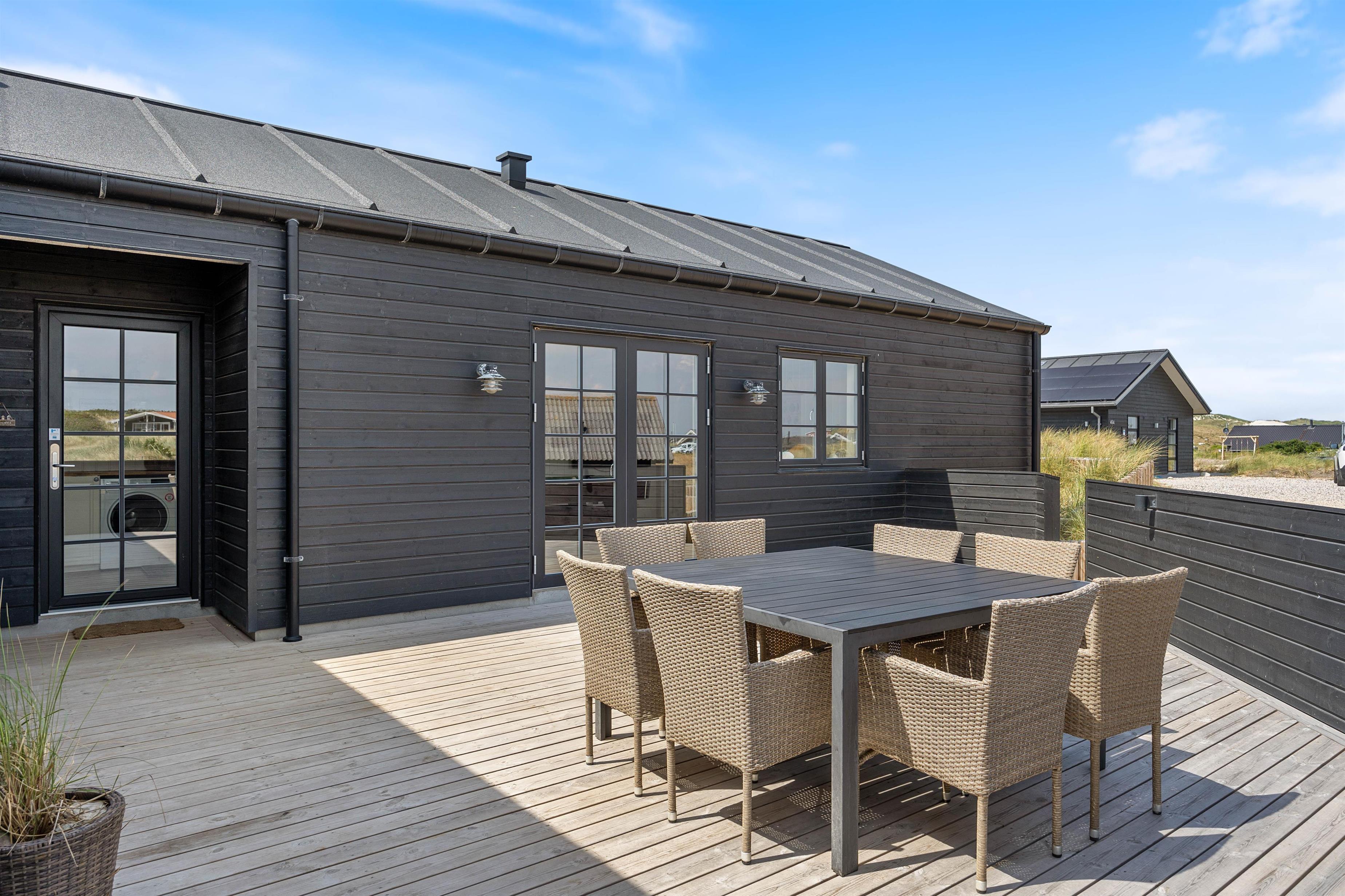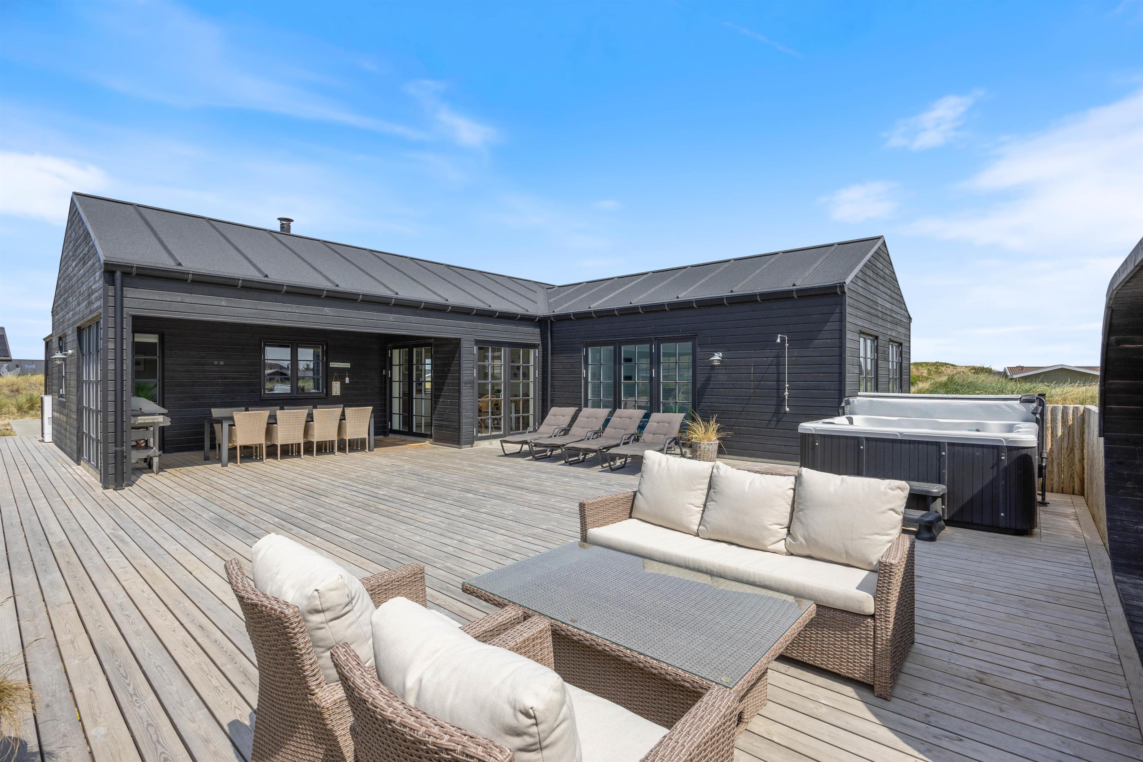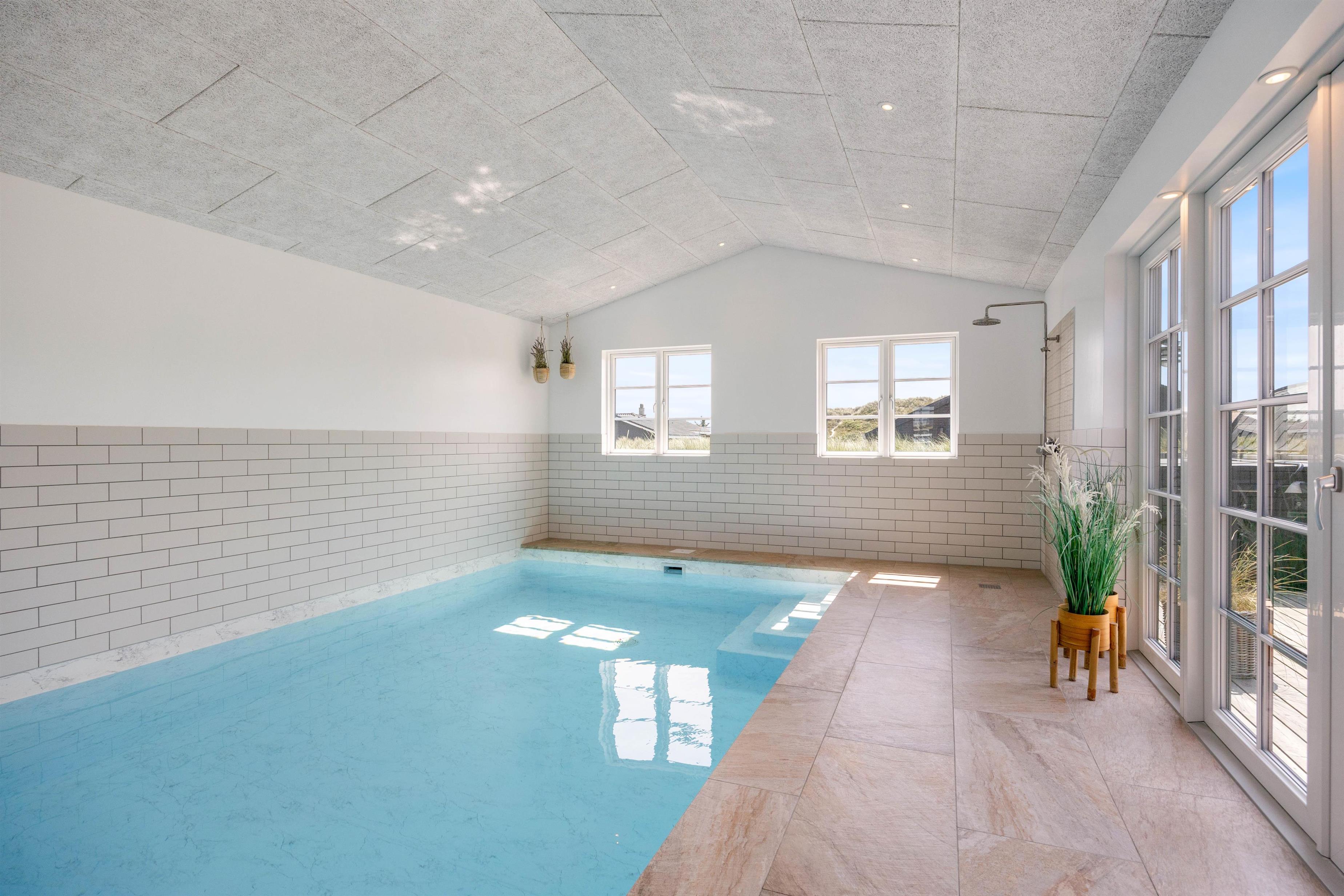 Kan I bruge en dukkert i swimmingpoolen, er den lige ved siden af. Alle aldersgrupper kan i det hele taget være aktive næsten døgnet rundt i dette feriehus, f.eks i det fine aktivitetsrum midt i feriehuset, hvor I kan få gang i energiomsætningen. Afslapning indendørs eller udendørs er også tilgængeligt, enten i de behagelige sofaer og stole eller udendørs i de komfortable møbler. I de fire soveværelser med dobbeltsenge kan I få godt udsovet i den friske vesterhavsluft. De 2 badeværelser gør, at I ikke behøver at stå i kø til morgenbadet.
